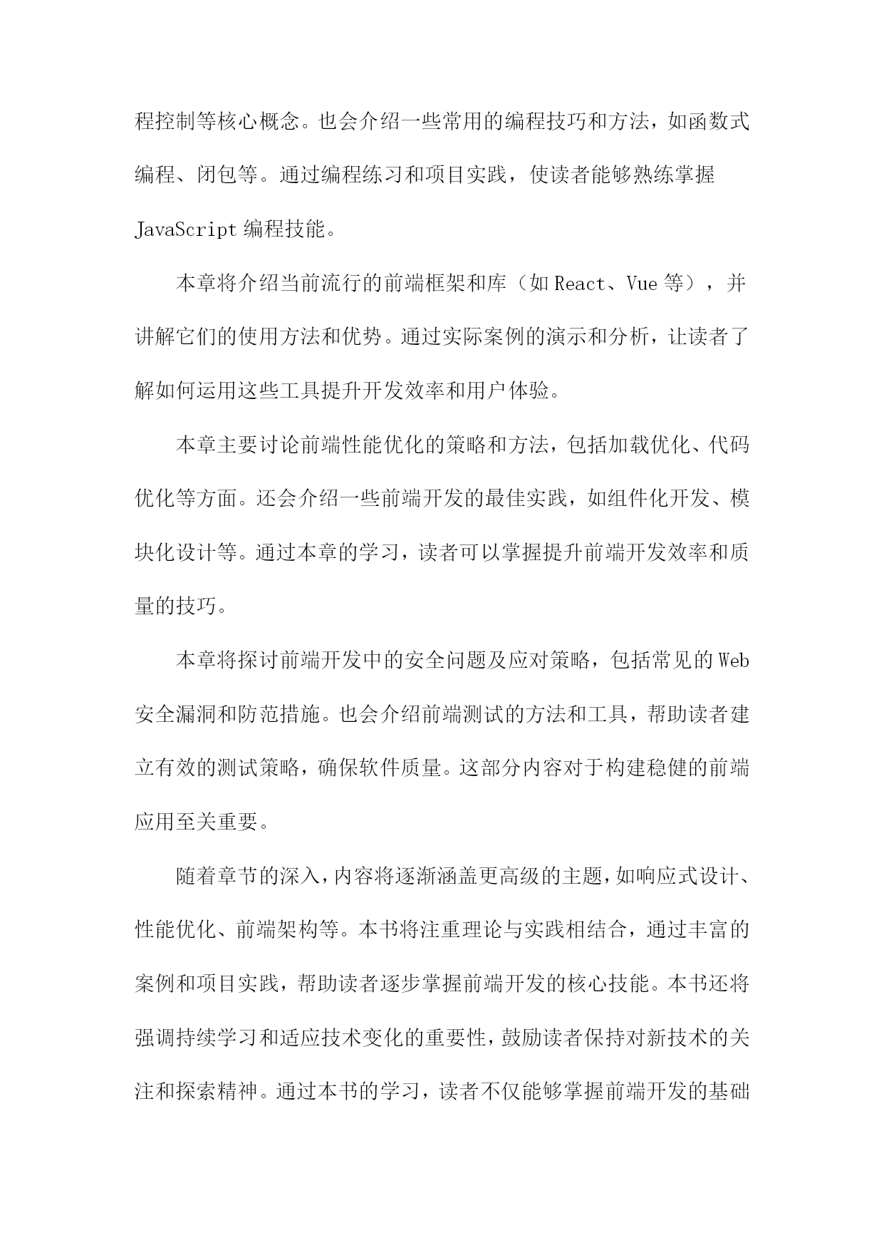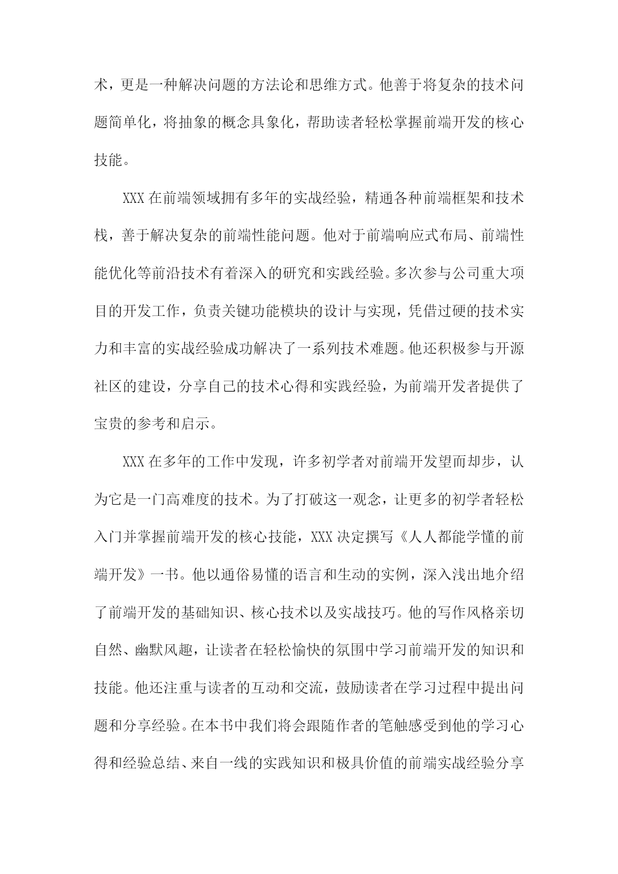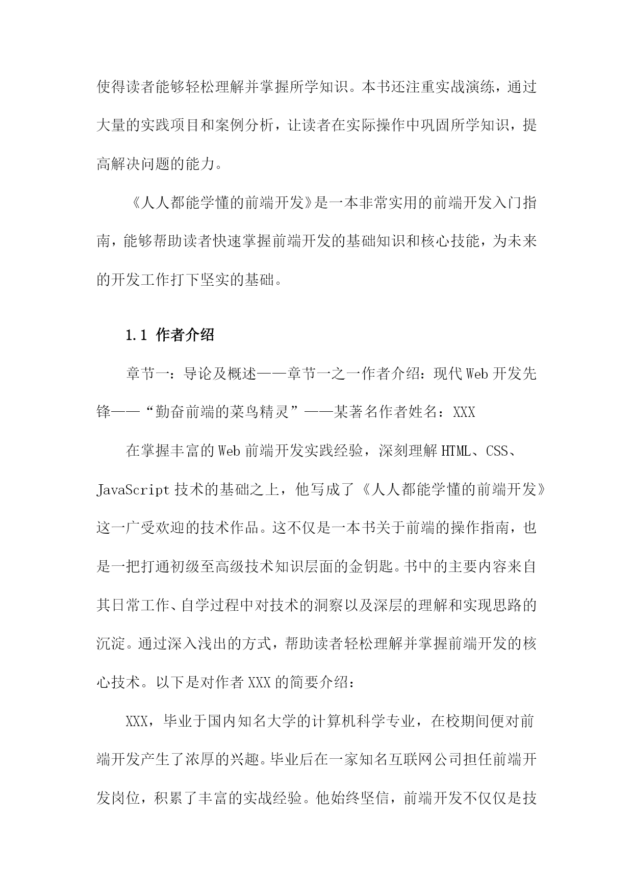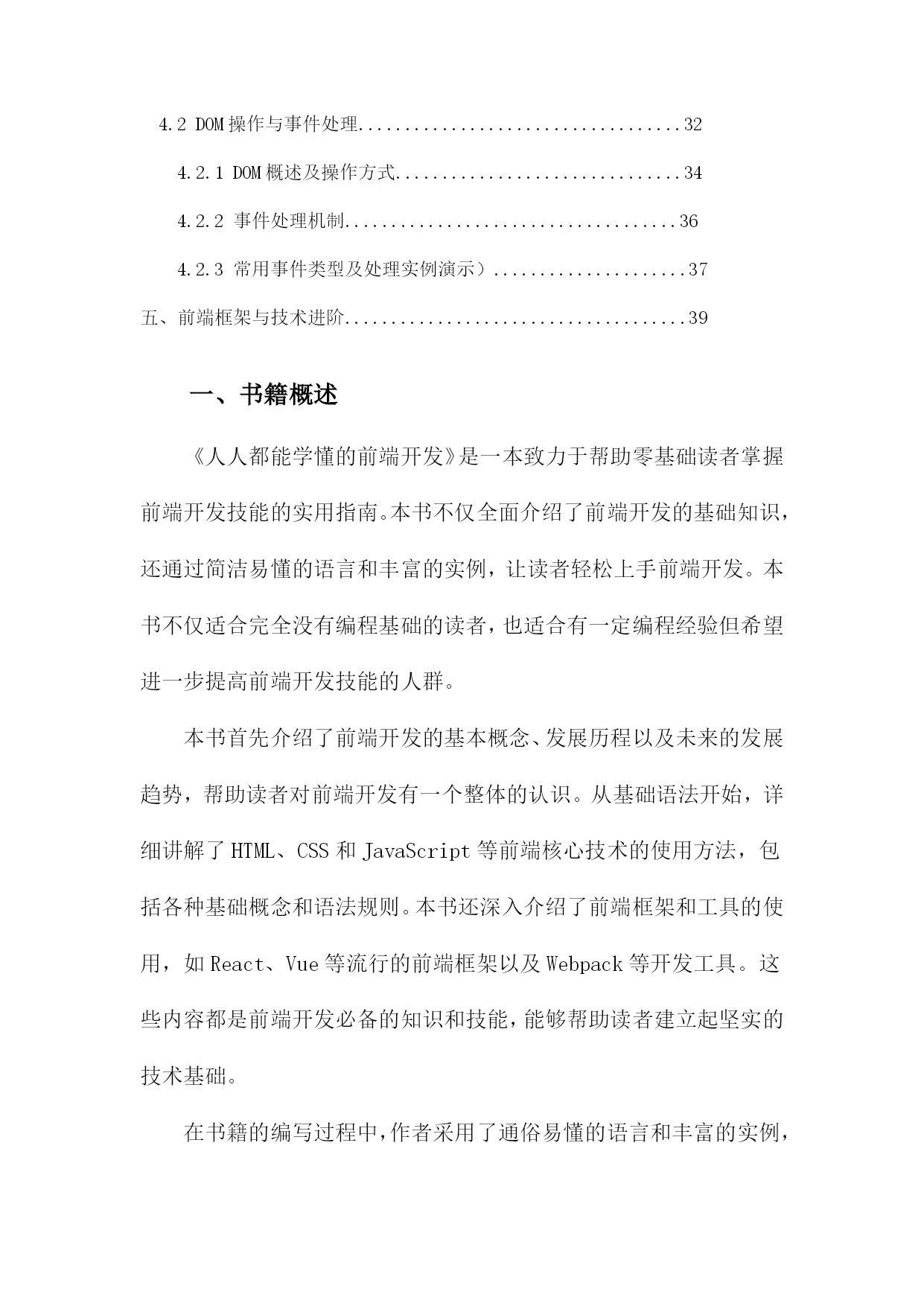 《人人都能学懂的前端开发》读书札记目录一、书籍概述................................................21.1作者介绍.............................................31.2书籍内容概述.........................................51.3书籍特色.............................................7二、前端基础知识............................................8三、CSS样式设计............................................103.1CSS概述与基础语法...................................123.1.1CSS定义与功能...................................133.1.2CSS语法规则.....................................153.1.3CSS选择器.......................................163.2布局与定位..........................................183.2.1盒模型介绍......................................203.2.2布局方式选择....................................213.2.3定位技巧与实战演练..............................23四、JavaScript交互设计.....................................244.1JavaScript基础语法..................................264.1.1变量与数据类型..................................284.1.2运算符与表达式..................................294.1.3控制结构........................................314.2DOM操作与事件处理...................................324.2.1DOM概述及操作方式...............................344.2.2事件处理机制....................................364.2.3常用事件类型及处理实例演示).....................37五、前端框架与技术进阶.....................................39一、书籍概述《人人都能学懂的前端开发》是一本致力于帮助零基础读者掌握前端开发技能的实用指南。本书不仅全面介绍了前端开发的基础知识,还通过简洁易懂的语言和丰富的实例,让读者轻松上手前端开发。本书不仅适合完全没有编程基础的读者,也适合有一定编程经验但希望进一步提高前端开发技能的人群。本书首先介绍了前端开发的基本概念、发展历程以及未来的发展趋势,帮助读者对前端开发有一个整体的认识。从基础语法开始,详细讲解了HTML、CSS和JavaScript等前端核心技术的使用方法,包括各种基础概念和语法规则。本书还深入介绍了前端框架和工具的使用,如React、Vue等流行的前端框架以及Webpack等开发工具。这些内容都是前端开发必备的知识和技能,能够帮助读者建立起坚实的技术基础。在书籍的编写过程中,作者采用了通俗易懂的语言和丰富的实例,使得读者能够轻松理解并掌握所学知识。本书还注重实战演练,通过大量的实践项目和案例分析,让读者在实际操作中巩固所学知识,提高解决问题的能力。《人人都能学懂的前端开发》是一本非常实用的前端开发入门指南,能够帮助读者快速掌握前端开发的基础知识和核心技能,为未来的开发工作打下坚实的基础。1.1作者介绍章节一:导论及概述——章节一之一作者介绍:现代Web开发先锋——“勤奋前端的菜鸟精灵”——某著名作者姓名:XXX在掌握丰富的Web前端开发实践经验,深刻理解HTML、CSS、JavaScript技术的基础之上,他写成了《人人都能学懂的前端开发》这一广受欢迎的技术作品。这不仅是一本书关于前端的操作指南,也是一把打通初级至高级技术知识层面的金钥匙。书中的主要内容来自其日常工作、自学过程中对技术的洞察以及深层的理解和实现思路的沉淀。通过深入浅出的