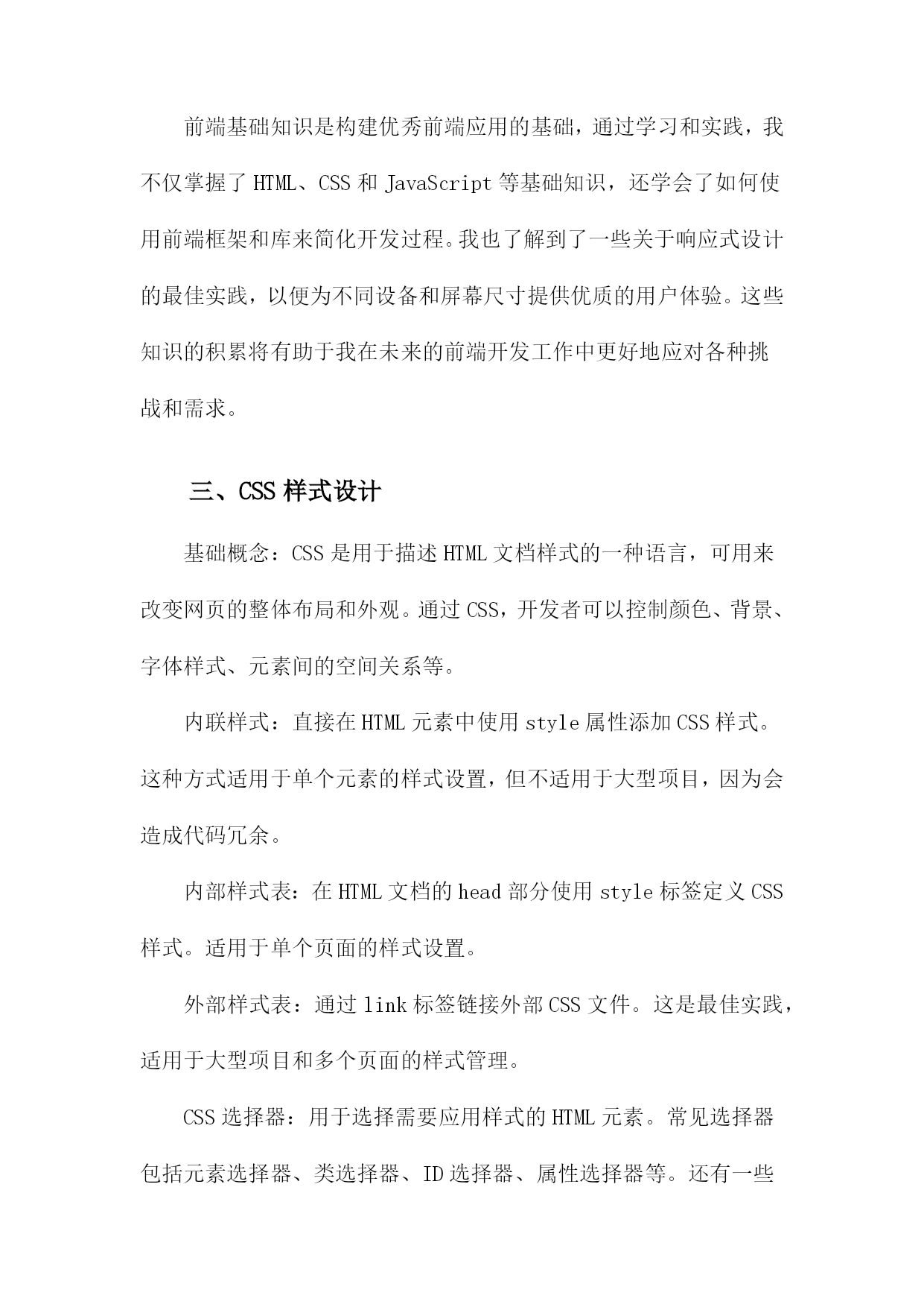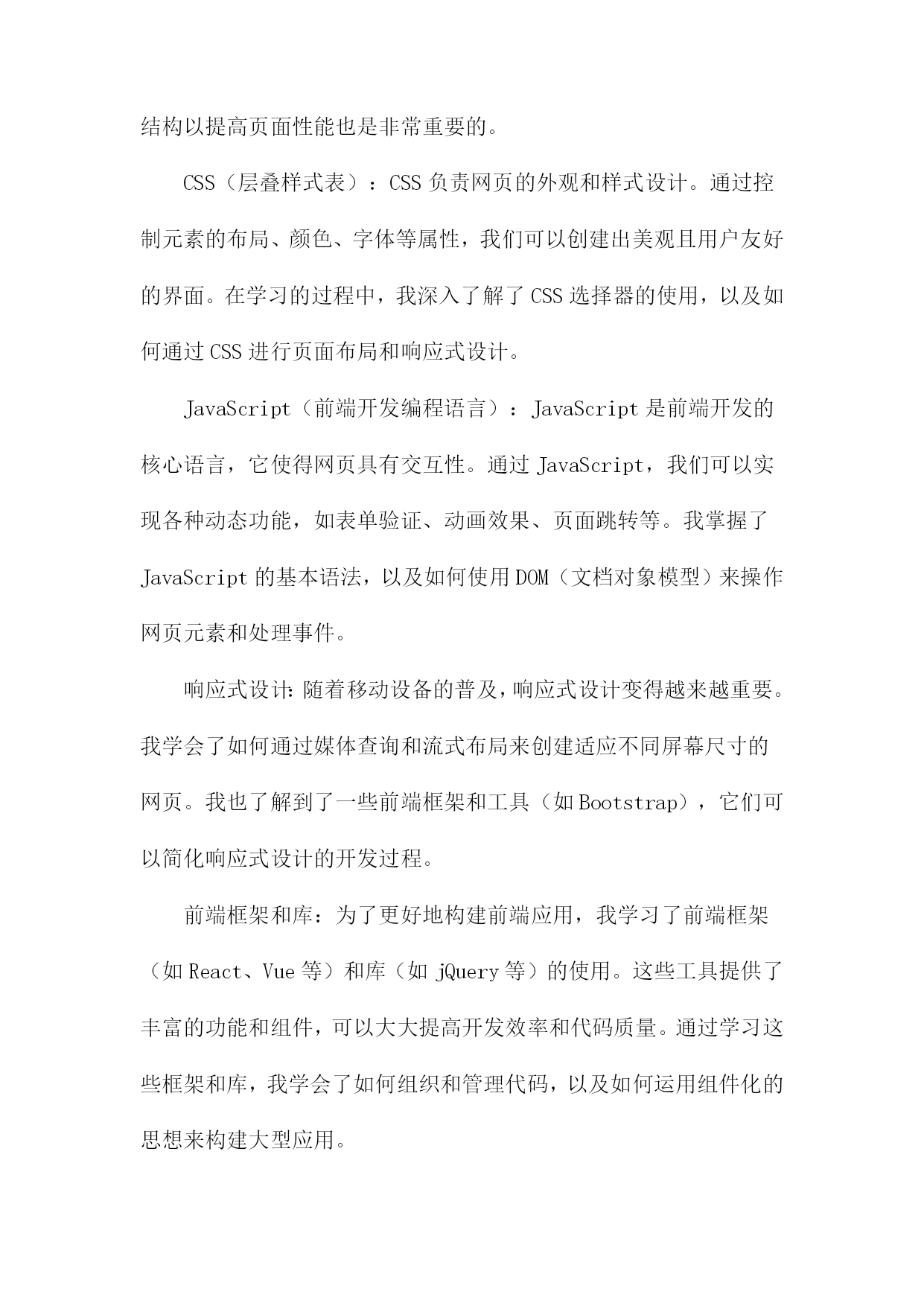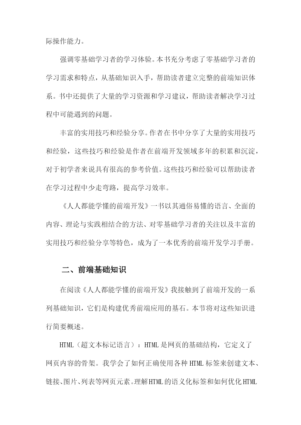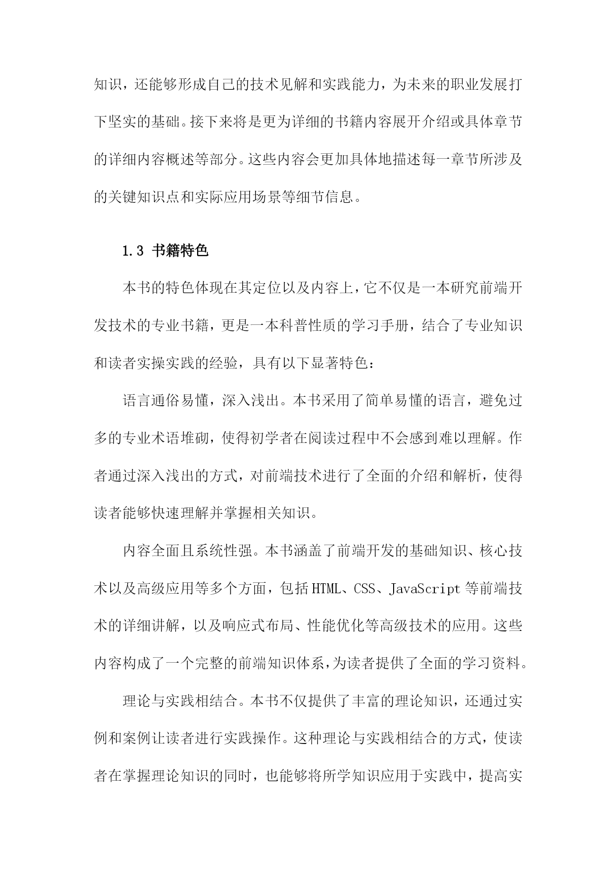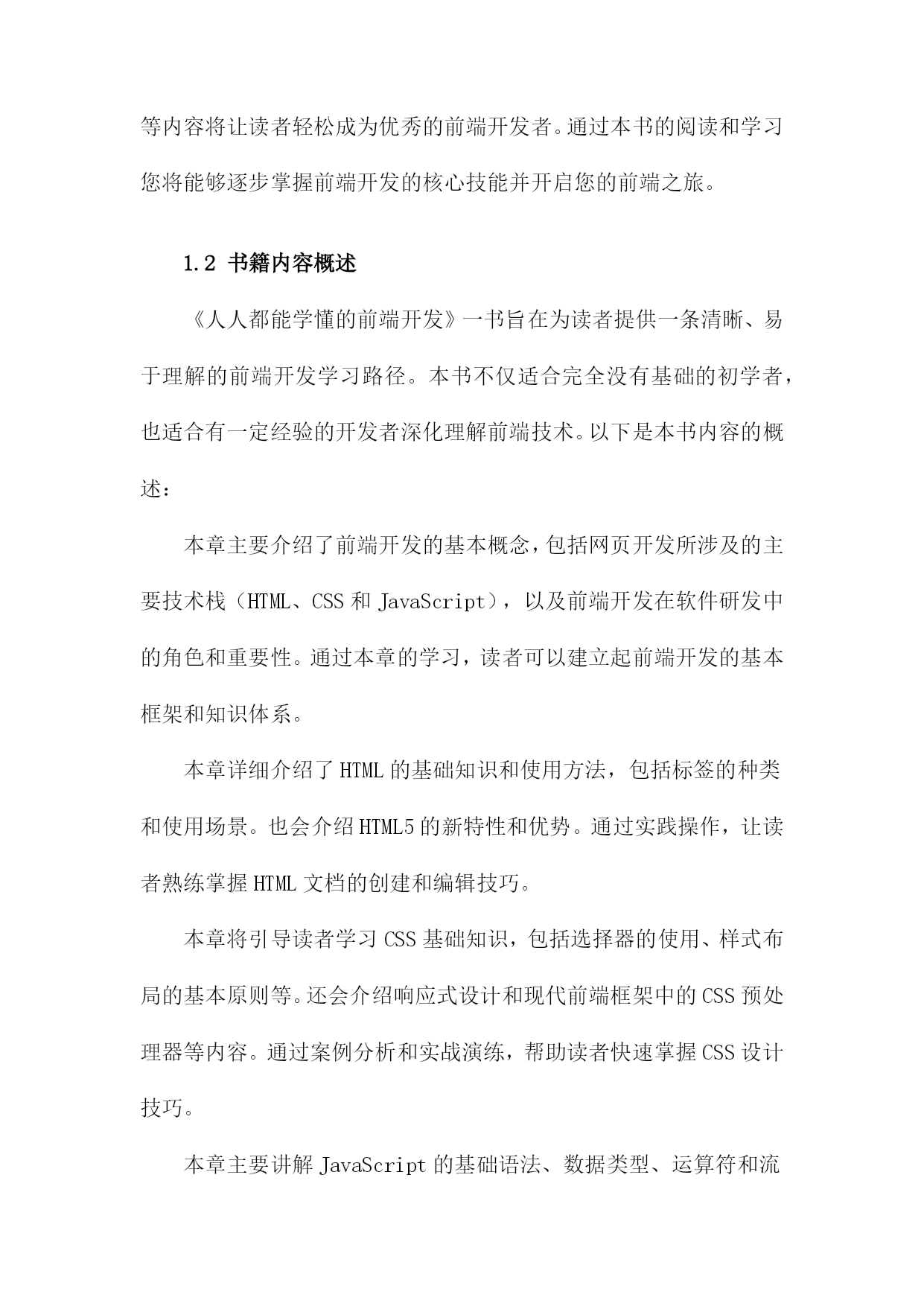 《人人都能学懂的前端开发》读书札记目录一、书籍概述................................................21.1作者介绍.............................................31.2书籍内容概述.........................................51.3书籍特色.............................................7二、前端基础知识............................................8三、CSS样式设计............................................103.1CSS概述与基础语法...................................123.1.1CSS定义与功能...................................133.1.2CSS语法规则.....................................153.1.3CSS选择器.......................................163.2布局与定位..........................................183.2.1盒模型介绍......................................203.2.2布局方式选择....................................213.2.3定位技巧与实战演练..............................23四、JavaScript交互设计.....................................244.1JavaScript基础语法..................................264.1.1变量与数据类型..................................284.1.2运算符与表达式..................................294.1.3控制结构........................................314.2DOM操作与事件处理...................................324.2.1DOM概述及操作方式...............................344.2.2事件处理机制....................................364.2.3常用事件类型及处理实例演示).....................37五、前端框架与技术进阶.....................................39一、书籍概述《人人都能学懂的前端开发》是一本致力于帮助零基础读者掌握前端开发技能的实用指南。本书不仅全面介绍了前端开发的基础知识,还通过简洁易懂的语言和丰富的实例,让读者轻松上手前端开发。本书不仅适合完全没有编程基础的读者,也适合有一定编程经验但希望进一步提高前端开发技能的人群。本书首先介绍了前端开发的基本概念、发展历程以及未来的发展趋势,帮助读者对前端开发有一个整体的认识。从基础语法开始,详细讲解了HTML、CSS和JavaScript等前端核心技术的使用方法,包括各种基础概念和语法规则。本书还深入介绍了前端框架和工具的使用,如React、Vue等流行的前端框架以及Webpack等开发工具。这些内容都是前端开发必备的知识和技能,能够帮助读者建立起坚实的技术基础。在书籍的编写过程中,作者采用了通俗易懂的语言和丰富的实例,使得读者能够轻松理解并掌握所学知识。本书还注重实战演练,通过大量的实践项目和案例分析,让读者在实际操作中巩固所学知识,提高解决问题的能力。《人人都能学懂的前端开发》是一本非常实用的前端开发入门指南,能够帮助读者快速掌握前端开发的基础知识和核心技能,为未来的开发工作打下坚实的基础。1.1作者介绍章节一:导论及概述——章节一之一作者介绍:现代Web开发先锋——“勤奋前端的菜鸟精灵”——某著名作者姓名:XXX在掌握丰富的Web前端开发实践经验,深刻理解HTML、CSS、JavaScript技术的基础之上,他写成了《人人都能学懂的前端开发》这一广受欢迎的技术作品。这不仅是一本书关于前端的操作指南,也是一把打通初级至高级技术知识层面的金钥匙。书中的主要内容来自其日常工作、自学过程中对技术的洞察以及深层的理解和实现思路的沉淀。通过深入浅出的