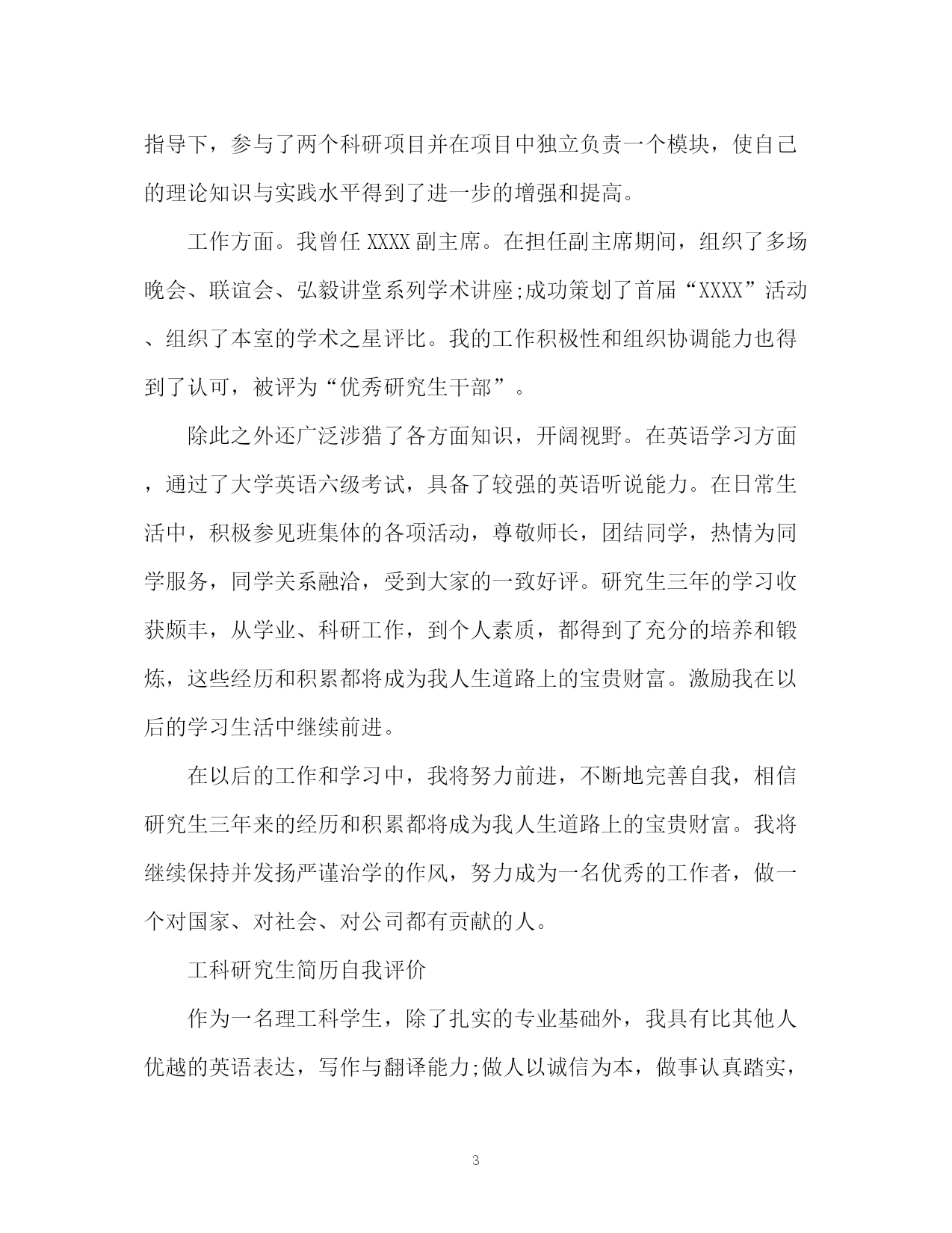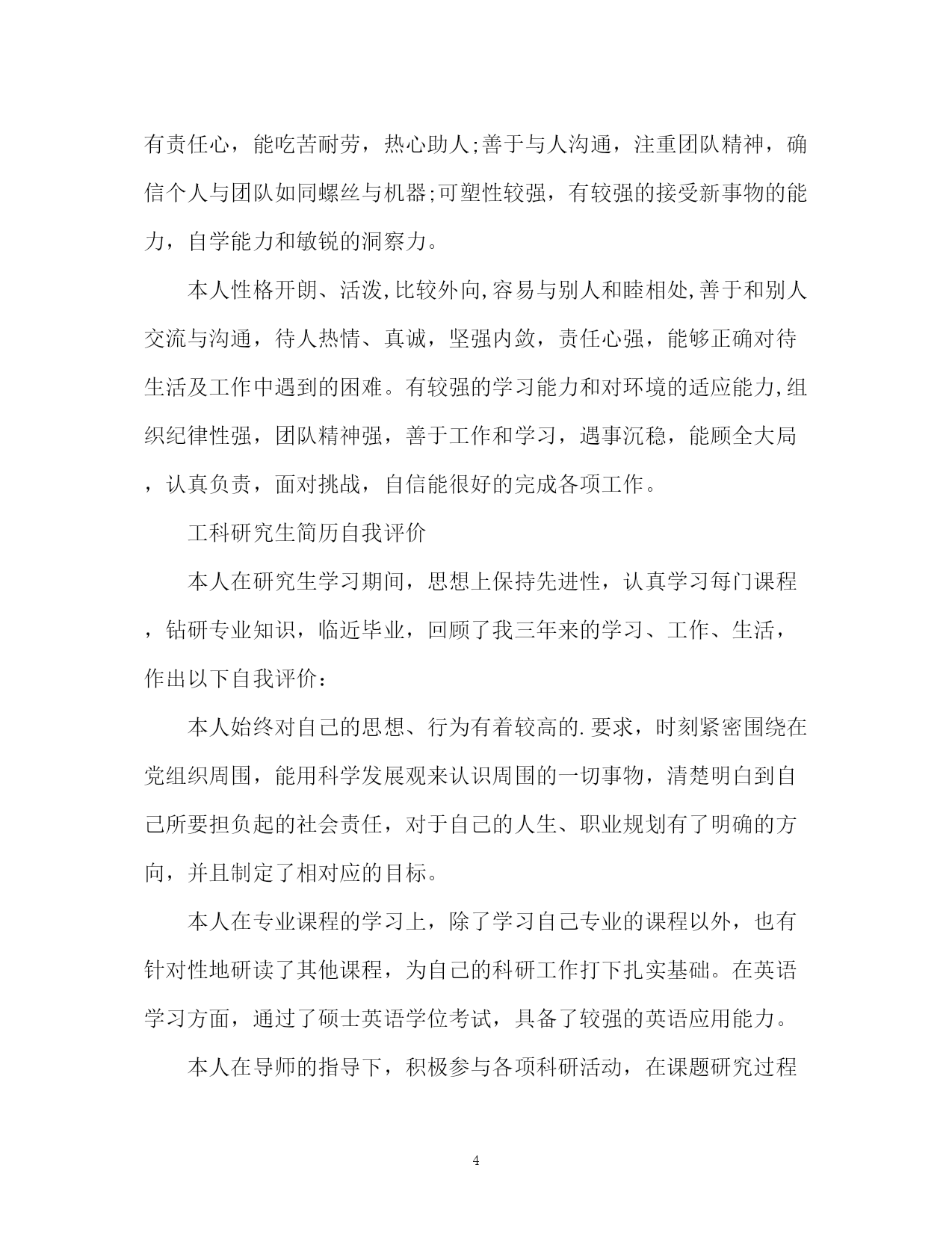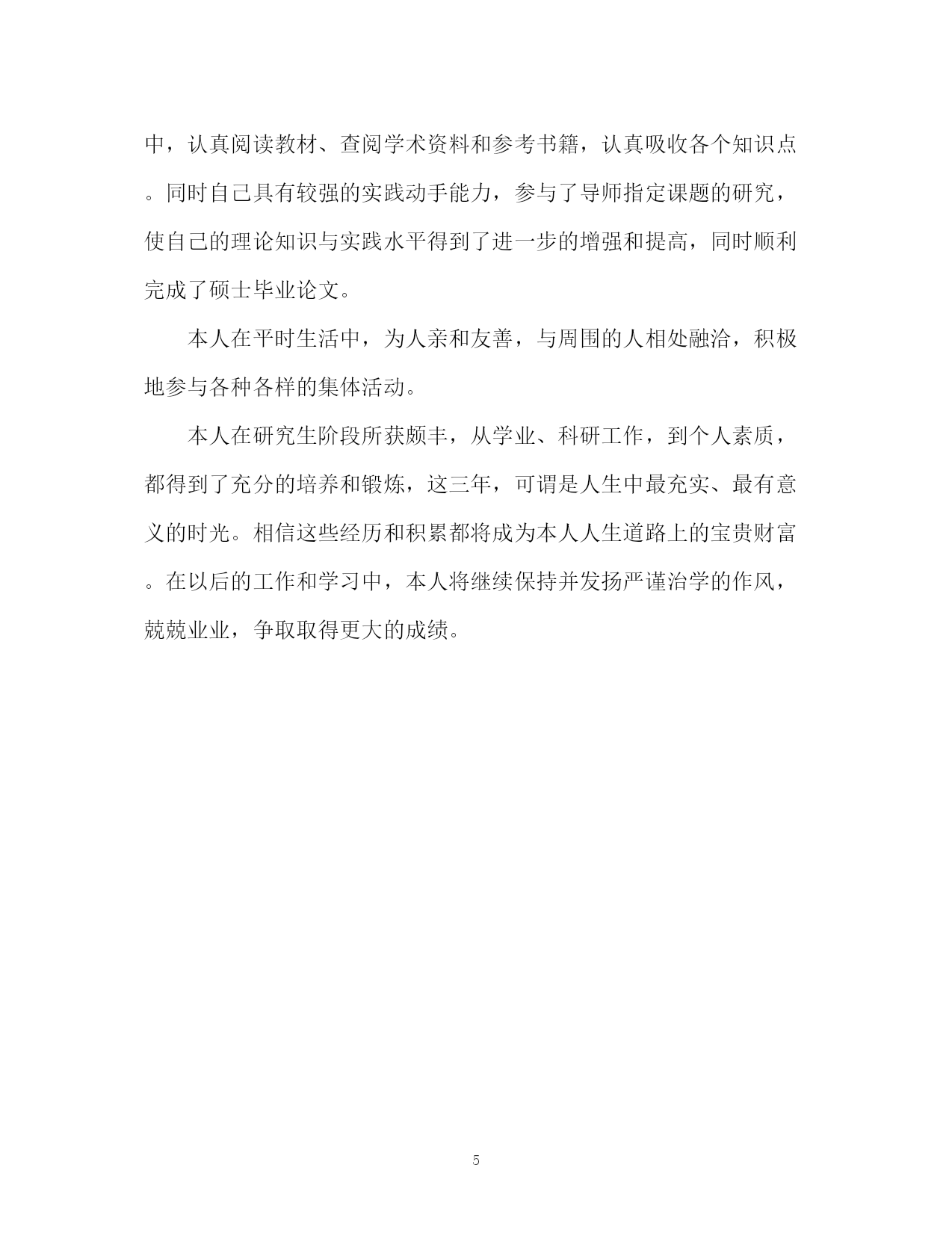 此资料由网络收集而来,如有侵权请告知上传者立即删除。资料共分享,我们负责传递知识。PAGEPAGE5工科研究生简历自我评价工科研究生简历自我评价众所周知,在求职找工作中简历是必不可少的,一份好的简历中的自我评价一定是出色的,那么,怎么把自我评价写的好呢?来看看范文吧。以下是小编搜集整理的工科研究生简历自我评价,欢迎阅读,供大家参考和借鉴!更多资讯尽在自我评价栏目!工科研究生简历自我评价本人在专业课程的学习上,根据自身研究方向的要求,有针对性的认真学习了有关课程,为自己的科研工作打下扎实基础;并涉猎了一部分其他课程,开阔视野,不断完善知识结构,选修控制科学与工程系的《工程矩阵论》、数学系的《数值代数》和信息管理系的《知识管理》等课程,对本人研究方向的应用背景以及整个学科的结构有了宏观的认识;学习matlab、mathematica、spss、eviews、lingo、visio和origin等软件;研读一定量的中英文文献,阅读了十多本英文专著,具备了较强的英语听说读写译能力;不断向老师、师兄师姐和同学请教,成绩有很大进步。工科研究生简历自我评价本人非常珍惜读研的机会,在读研期间,我一直不忘让自己变得更加出色,我在研究生阶段所获颇丰,从学业、科研工作,到个人素质,都得到了充分的培养和锻炼,这三年是最充实、有意义的三年。三年来本人思想上要求上进,认真学习,努力钻研专业知识,毕业之际,回望过去的日子,不禁让我感慨万千:这一段时光不但让充实了自我,而且也让我结交了许多良师益友;这段岁月不仅仅只是难忘,而是让我刻苦铭心。年华虽逝坚,带不走的记忆却历历在目。思想方面。我认真学习马克思列宁主义、毛泽东思想、xxx理论和“三个代表”重要思想;留意时事政治,关心学校的改革与发展;拥护党的路线、方针和政策,能认真执行学校、实验室的决议;尊敬导师、团结同学、乐于助人、勇于奉献,具有良好的道德品质和思想修养;能遵守国家法律、法令和学校各项规章制度。作为一名中共党员和一名学生干部,我始终努力学习、积极工作,在自己进步的同时还不忘帮助别人进步,先后担任了几位同志的入党介绍人、充分发挥党员学生干部的模范带头作用。学业方面。我的研究方向为虚拟现实和仿真技术,主要研究兴趣为三维模型的简化与网络传输。学术思想活跃、学习目的明确,态度端正、学风良好,勤奋学习,刻苦钻研,成绩优秀。在所选的研究生课程中,成绩全部为优良;在国际会议发表了学术论文两篇;在导师的指导下,参与了两个科研项目并在项目中独立负责一个模块,使自己的理论知识与实践水平得到了进一步的增强和提高。工作方面。我曾任XXXX副主席。在担任副主席期间,组织了多场晚会、联谊会、弘毅讲堂系列学术讲座;成功策划了首届“XXXX”活动、组织了本室的学术之星评比。我的工作积极性和组织协调能力也得到了认可,被评为“优秀研究生干部”。除此之外还广泛涉猎了各方面知识,开阔视野。在英语学习方面,通过了大学英语六级考试,具备了较强的英语听说能力。在日常生活中,积极参见班集体的各项活动,尊敬师长,团结同学,热情为同学服务,同学关系融洽,受到大家的一致好评。研究生三年的学习收获颇丰,从学业、科研工作,到个人素质,都得到了充分的培养和锻炼,这些经历和积累都将成为我人生道路上的宝贵财富。激励我在以后的学习生活中继续前进。在以后的工作和学习中,我将努力前进,不断地完善自我,相信研究生三年来的经历和积累都将成为我人生道路上的宝贵财富。我将继续保持并发扬严谨治学的作风,努力成为一名优秀的工作者,做一个对国家、对社会、对公司都有贡献的人。工科研究生简历自我评价作为一名理工科学生,除了扎实的专业基础外,我具有比其他人优越的英语表达,写作与翻译能力;做人以诚信为本,做事认真踏实,有责任心,能吃苦耐劳,热心助人;善于与人沟通,注重团队精神,确信个人与团队如同螺丝与机器;可塑性较强,有较强的接受新事物的能力,自学能力和敏锐的洞察力。本人性格开朗、活泼,比较外向,容易与别人和睦相处,善于和别人交流与沟通,待人热情、真诚,坚强内敛,责任心强,能够正确对待生活及工作中遇到的困难。有较强的学习能力和对环境的适应能力,组织纪律性强,团队精神强,善于工作和学习,遇事沉稳,能顾全大局,认真负责,面对挑战,自信能很好的完成各项工作。工科研究生简历自我评价本人在研究生学习期间,思想上保持先进性,认真学习每门课程,钻研专业知识,临近毕业,回顾了我三年来的学习、工作、生活,作出以下自我评价:本人始终对自己的思想、行为有着较高的.要求,时刻紧密围绕在党组织周围,能用科学发展观来认识周围的一切事物,清楚明白到自己所要担负起的社会责任,对于自己的人生、职业规划有了明确的方向,并且制定了相对应的目标。本人在专业课程的学习
