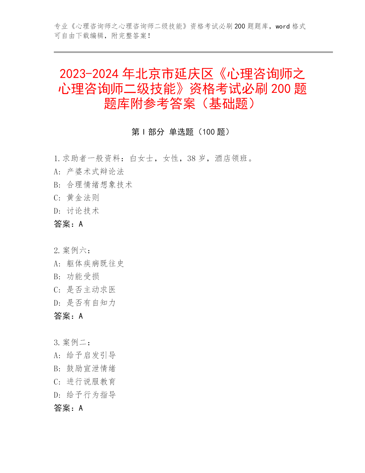 2023-2024年北京市延庆区《心理咨询师之心理咨询师二级技能》资格考试必刷200题题库附参考答案(基础题)