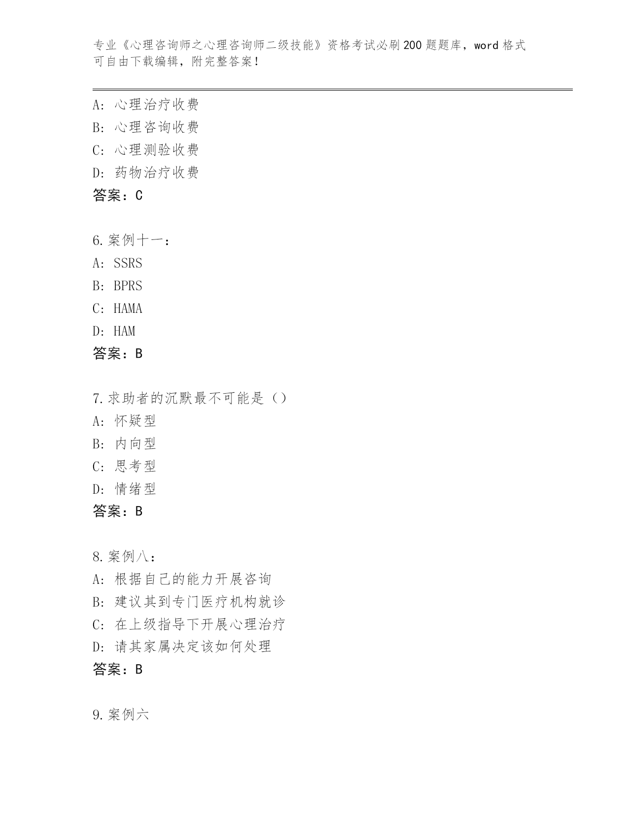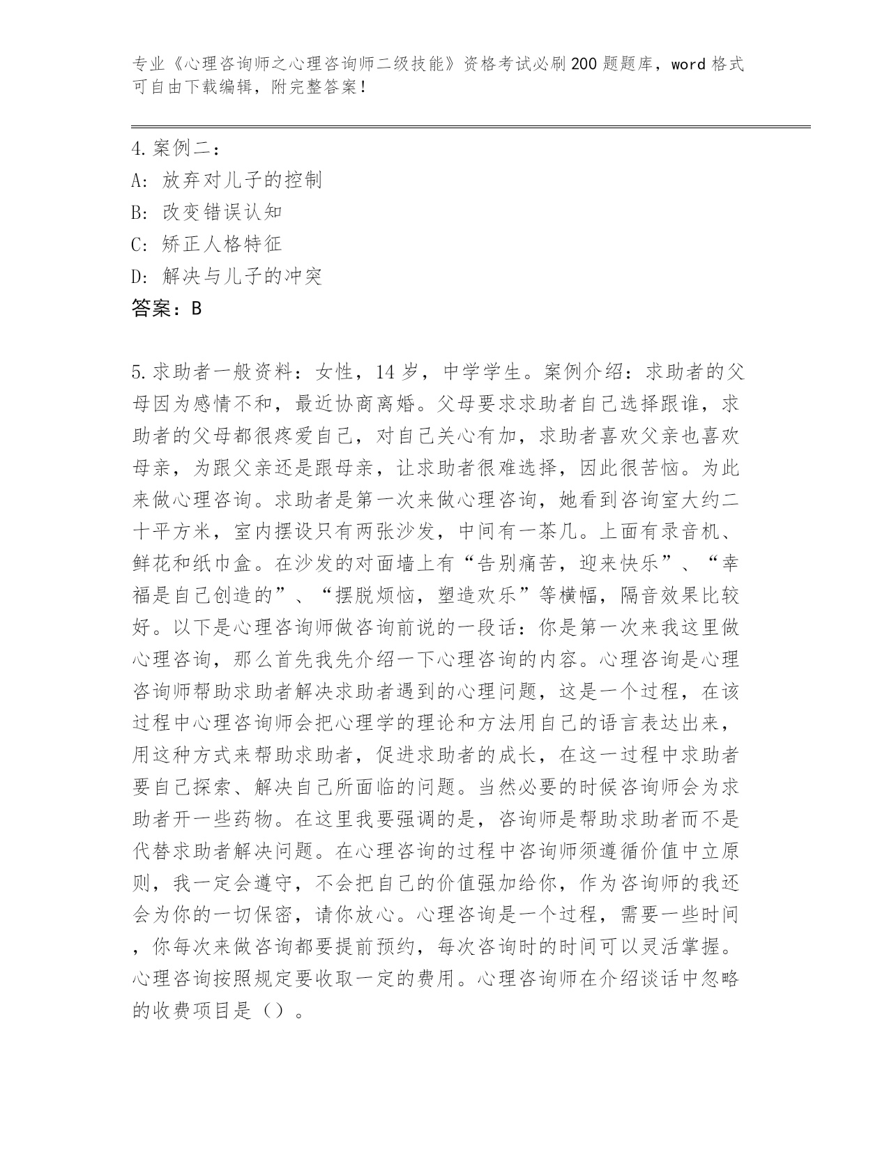 北京市延庆区2024年《心理咨询师之心理咨询师二级技能》资格考试必刷200题内部题库附答案【综合题】