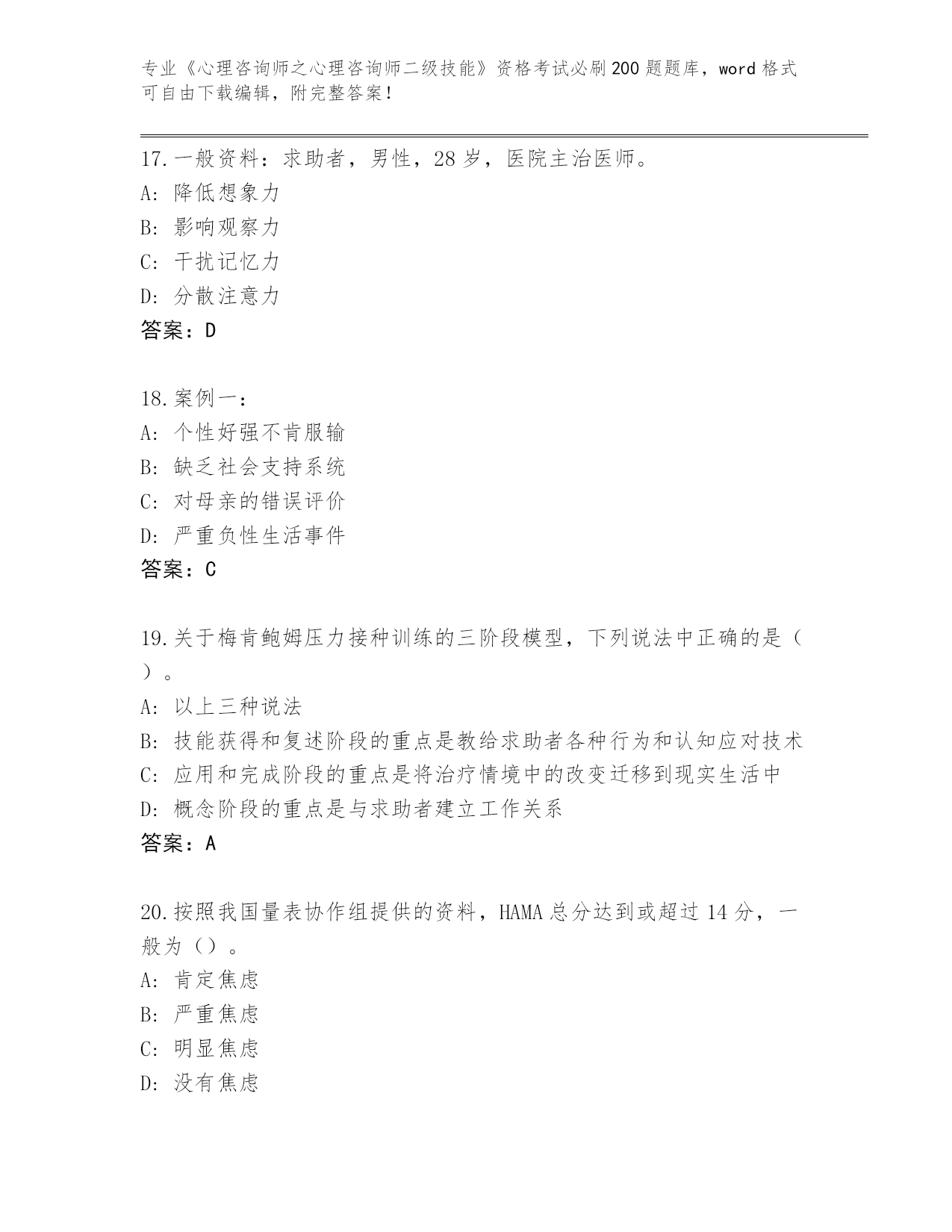 北京市延庆区2024《心理咨询师之心理咨询师二级技能》资格考试必背200题王牌题库(培优)