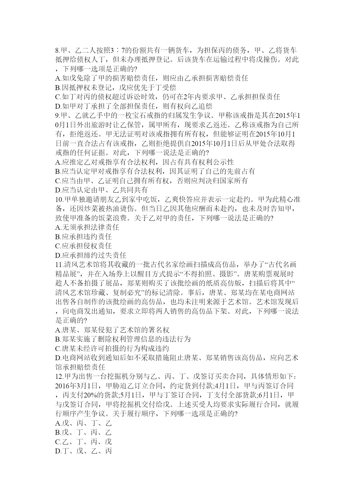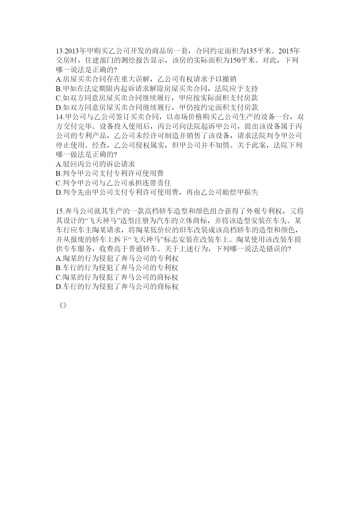 上海国家司法考试信息网篇一:2015年国家司法成绩公布带解析1、近年来,我国部分地区基层法院在民事审判中试点“小额速裁”,对法律关系单一、事实清楚、争议标的额不足1万元的民事案件,实行一审终审制度。关于该审判方式改革体现出的价值取向,下列哪些说法是正确的?A.节约司法成本B.促进司法民主C.提高司法效率D.推行司法公开2、根据《宪法》和《监督法》的规定,下列选项正确的是:A.县级以上地方各级政府应当在每年6月至9月期间,将上一年度的本级决算草案提请本级人大常委会审查和批准B.人大常委会认为必要时,可以对审计工作报告作出决议;本级政府应在决议规定的期限内,将执行决议的情况向常委会报告C.最高法院作出的属于审判工作中具体应用法律的解释,应当在公布之日起30日内报全国人大常委会备案D.撤职案的表决采取记名投票的方式,由常委会全体组成人员的过半数通过3、根据国际法相关规则,关于国际争端解决方式,下列哪些表述是正确的?A.甲乙两国就界河使用发生纠纷,丙国为支持甲国可出面进行武装干涉B.甲乙两国发生边界争端,丙国总统可出面进行调停C.甲乙两国可书面协议将两国的专属经济区争端提交联合国国际法院,国际法院对此争端拥有管辖权D.国际法院可就国际争端解决提出咨询意见,该意见具有法律拘束力4、关于中国在世贸组织中的权利义务,下列哪一表述是正确的?A.承诺入世后所有中国企业都有权进行货物进出口,包括国家专营商品B.对中国产品的出口,进口成员在进行反倾销调查时选择替代国价格的做法,在《中国加入世界贸易组织议定书》生效15年后终止C.非专向补贴不受世界贸易组织多边贸易体制的约束,包括中国对所有国有企业的补贴D.针对中国产品的过渡性保障措施,在实施条件上与保障措施的要求基本相同,在实施程序上相对简便5、甲河是多国河流,乙河是国际河流。根据国际法相关规则,下列哪些选项是正确的?A.甲河沿岸国对甲河流经本国的河段拥有主权B.甲河上游国家可对自己享有主权的河段进行改道工程,以解决自身缺水问题C.乙河对非沿岸国商船也开放D.乙河的国际河流性质决定了其属于人类共同的财产6、马克思主义关于“人民主权”的论述是社会主义法治理念的理论渊源之一。下列哪一宪法原则准确体现了人民主权思想?A.国家尊重和保障****B.中华人民共和国的一切权力属于人民C.中华人民共和国公民在法律面前一律平等D.中华人民共和国实行依法治国,建设社会主义法治国家7、甲法官处理一起伤害赔偿案件,耐心向被告乙解释计算赔偿数额的法律依据,并将最高法院公报发布的已生效同类判决提供乙参考。乙接受甲法官建议,在民事调解书上签字赔偿了原告损失。关于本案,下列哪一判断是正确的?A.法院已生效同类判决具有普遍约束力B.甲法官在该案调解时适用了判例法C.甲法官提供的指导性案例具有说服力D.民事调解书经乙签署后即具有行政强制执行力8、甲、乙分别为某有限责任公司的自然人股东,后甲在乙知情但不同意的情况下,为帮助妹妹获取贷款,将自有股份质押给银行,乙以甲侵犯其股东权利为由向法院提起诉讼。关于本案,下列哪一判断是正确的?A.担保关系是债权关系的保护性法律关系B.债权关系是质押关系的第一性法律关系C.诉讼关系是股权关系的隶属性法律关系D.债权关系是质押关系的调整性法律关系9、关于李大伟在此项贷款交易中的行为,下列判断正确的是:A.李大伟强令下属机构发放贷款,是《商业银行法》禁止的行为B.该贷款合同无效,李大伟应当承担由合同无效引起的一切损失C.该贷款合同有效,李大伟应当承担因不正当优惠条件给银行造成的包括利息差额在内的损失D.分行负责人谢二宝也应当承担相应的赔偿责任10、关于明代法律制度,下列哪一选项是错误的?A.明朱元璋认为,“夫法度者,朝廷所以治天下也”B.明律确立“重其所重,轻其所轻”刑罚原则C.《大明会典》仿《元六典》,以六部官制为纲D.明会审制度为九卿会审、朝审、大审11、马克思主义关于“人民主权”的论述是社会主义法治理念的理论渊源之一。下列哪一宪法原则准确体现了人民主权思想?A.国家尊重和保障****B.中华人民共和国的一切权力属于人民C.中华人民共和国公民在法律面前一律平等D.中华人民共和国实行依法治国,建设社会主义法治国家12、台湾地区甲公司因合同纠纷起诉大陆乙公司,台湾地区法院判决乙公司败诉。乙公司在上海和北京均有财产,但未执行该判决。关于该判决的执行,下列哪一选项是正确的?A.甲公司向上海和北京的中级人民法院申请认可该判决的,由最先立案的中级人民法院管辖B.该判决效力低于人民法院作出的生效判决C.甲公司申请财产保全的,人民法院可以要求其提供有效的担保;不提供担保的,视情况决定是否准予财产保