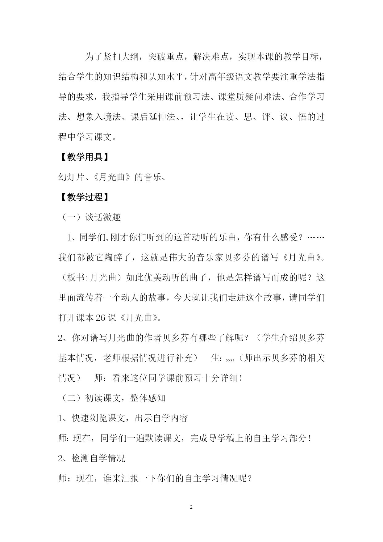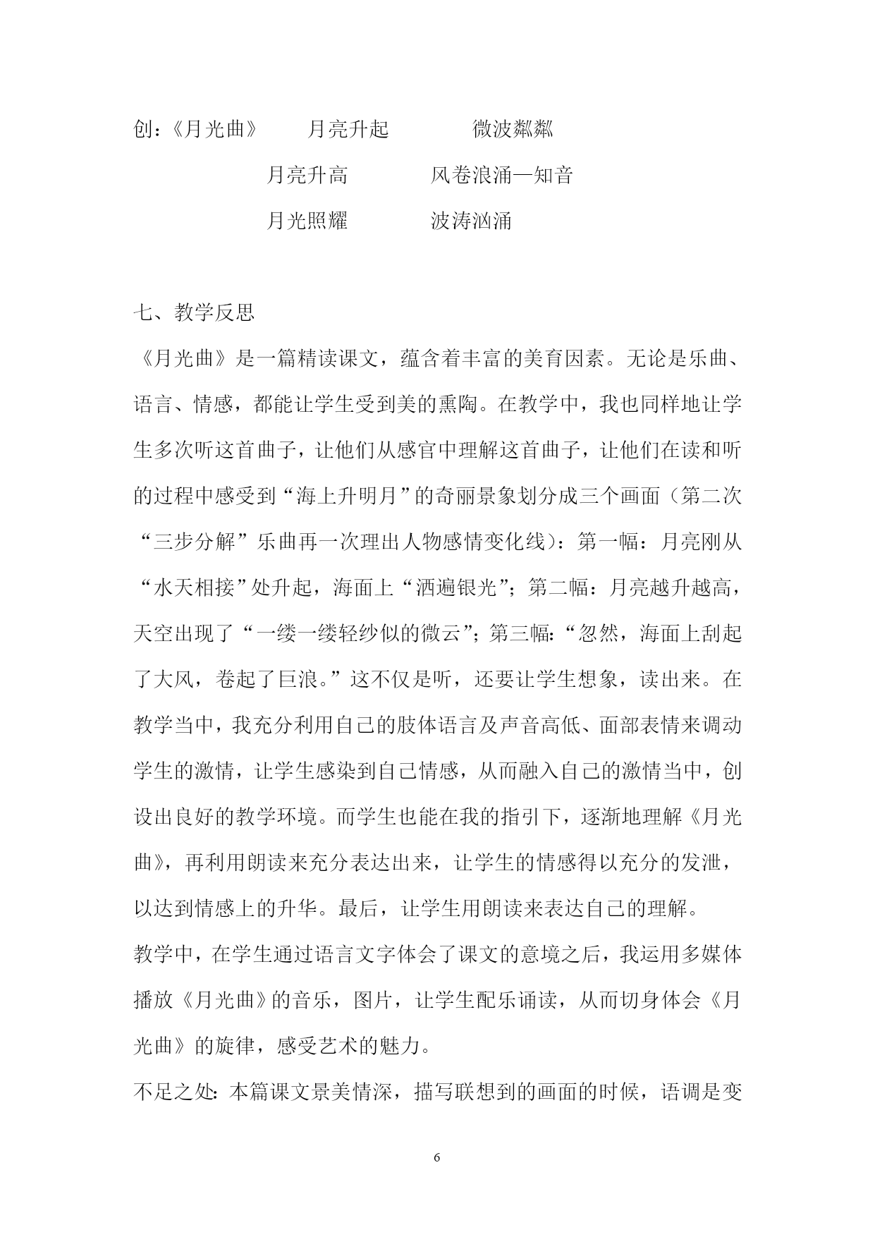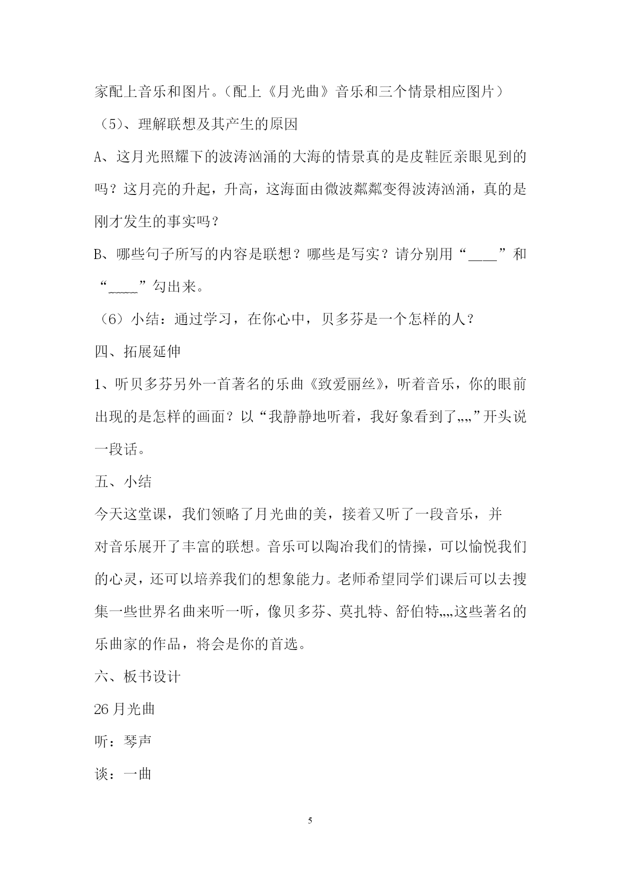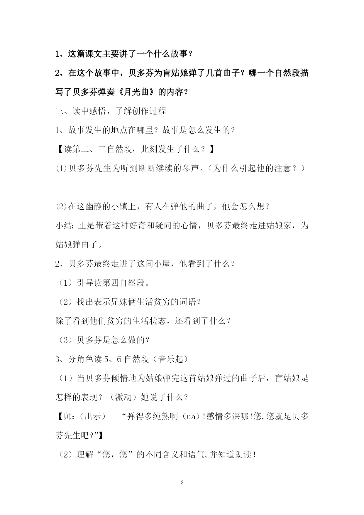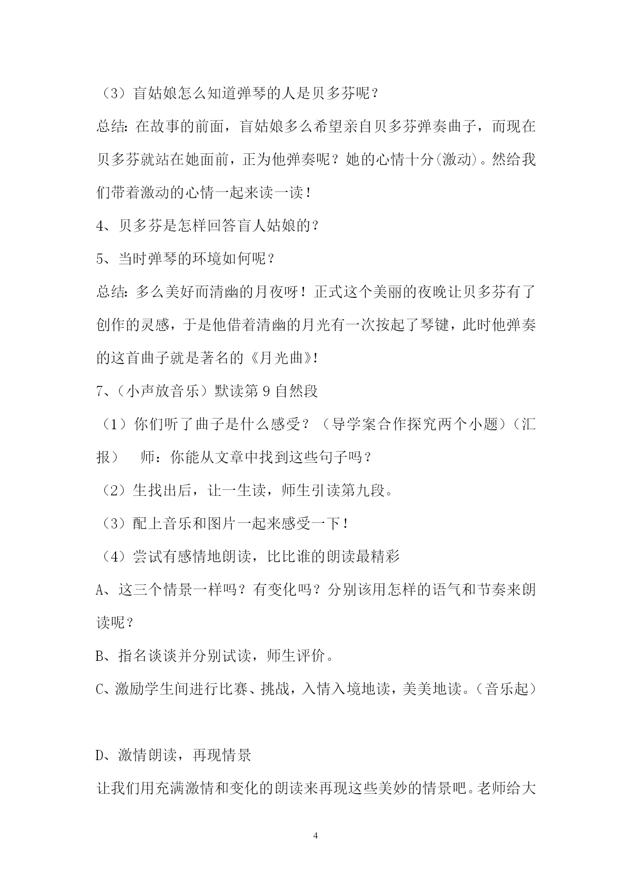 PAGEPAGE12月光曲教学设计【教学目标】知识与技能:1.学会本课生字,正确读写"幽静、纯熟、清幽、陶醉、霎时间、微波粼粼"等词语。2.有感情地朗读课文。3.体会写实和联想相结合的写法,初步学习在写实的过程中,展开适当的联想,发展学生的想象力和逻辑思维的能力。过程与方法:由音乐导入激发学生兴趣,发挥学生的主观能动性。导入设计——解题——整体感知——具体研习——课堂小结——当堂检测情感态度价值观:了解贝多芬创作《月光曲》的经过,体会音乐的魅力,体会贝多芬对劳苦人民的同情和爱,从而培养学生热爱人民的思想感情,并对学生进行美的教育。【教学重点】了解贝多芬是怎样创作《月光曲》的,感受乐曲所表现的意境,体会他所具有的卓越才华和对劳动人民的同情心。【教学难点】贝多芬感情变化的原因。初步学习分辨写实和联想相结合的写法,初步学习在写实的过程中,展开适当的联想。【教学方法】为了紧扣大纲,突破重点,解决难点,实现本课的教学目标,结合学生的知识结构和认知水平,针对高年级语文教学要注重学法指导的要求,我指导学生采用课前预习法、课堂质疑问难法、合作学习法、想象入境法、课后延伸法、,让学生在读、思、评、议、悟的过程中学习课文。【教学用具】幻灯片、《月光曲》的音乐、【教学过程】(一)谈话激趣1、同学们,刚才你们听到的这首动听的乐曲,你有什么感受?……我们都被它陶醉了,这就是伟大的音乐家贝多芬的谱写《月光曲》。(板书:月光曲)如此优美动听的曲子,他是怎样谱写而成的呢?这里面流传着一个动人的故事,今天就让我们走进这个故事,请同学们打开课本26课《月光曲》。2、你对谱写月光曲的作者贝多芬有哪些了解呢?(学生介绍贝多芬基本情况,老师根据情况进行补充)生:„„(师出示贝多芬的相关情况)师:看来这位同学课前预习十分详细!(二)初读课文,整体感知1、快速浏览课文,出示自学内容师:现在,同学们一遍默读课文,完成导学稿上的自主学习部分!2、检测自学情况师:现在,谁来汇报一下你们的自主学习情况呢?1、这篇课文主要讲了一个什么故事?2、在这个故事中,贝多芬为盲姑娘弹了几首曲子?哪一个自然段描写了贝多芬弹奏《月光曲》的内容?三、读中感悟,了解创作过程1、故事发生的地点在哪里?故事是怎么发生的?【读第二、三自然段,此刻发生了什么?】(1)贝多芬先生为听到断断续续的琴声。(为什么引起他的注意?)(2)在这幽静的小镇上,有人在弹他的曲子,他会怎么想?小结:正是带着这种好奇和疑问的心情,贝多芬最终走进姑娘家,为姑娘弹曲子。2、贝多芬最终走进了这间小屋,他看到了什么?(1)引导读第四自然段。(2)找出表示兄妹俩生活贫穷的词语?除了看到他们贫穷的生活状态,还看到了什么?(3)贝多芬是怎么做的?3、分角色读5、6自然段(音乐起)(1)当贝多芬倾情地为姑娘弹完这首姑娘弹过的曲子后,盲姑娘是怎样的表现?(激动)她说了什么?【师:(出示)“弹得多纯熟啊(ua)!感情多深哪!您,您就是贝多芬先生吧?”】(2)理解“您,您”的不同含义和语气,并知道朗读!(3)盲姑娘怎么知道弹琴的人是贝多芬呢?总结:在故事的前面,盲姑娘多么希望亲自贝多芬弹奏曲子,而现在贝多芬就站在她面前,正为他弹奏呢?她的心情十分(激动)。然给我们带着激动的心情一起来读一读!4、贝多芬是怎样回答盲人姑娘的?5、当时弹琴的环境如何呢?总结:多么美好而清幽的月夜呀!正式这个美丽的夜晚让贝多芬有了创作的灵感,于是他借着清幽的月光有一次按起了琴键,此时他弹奏的这首曲子就是著名的《月光曲》!7、(小声放音乐)默读第9自然段(1)你们听了曲子是什么感受?(导学案合作探究两个小题)(汇报)师:你能从文章中找到这些句子吗?(2)生找出后,让一生读,师生引读第九段。(3)配上音乐和图片一起来感受一下!(4)尝试有感情地朗读,比比谁的朗读最精彩A、这三个情景一样吗?有变化吗?分别该用怎样的语气和节奏来朗读呢?B、指名谈谈并分别试读,师生评价。C、激励学生间进行比赛、挑战,入情入境地读,美美地读。(音乐起)D、激情朗读,再现情景让我们用充满激情和变化的朗读来再现这些美妙的情景吧。老师给大家配上音乐和图片。(配上《月光曲》音乐和三个情景相应图片)(5)、理解联想及其产生的原因A、这月光照耀下的波涛汹涌的大海的情景真的是皮鞋匠亲眼见到的吗?这月亮的升起,升高,这海面由微波粼粼变得波涛汹涌,真的是刚才发生的事实吗?B、哪些句子所写的内容是联想?哪些是写实?请分别用“____”和“﹏﹏”勾出来。(6)小结:通过学习,在你心中,贝多芬是一个怎样的人?四、拓展延伸1、听贝多芬另外一首著名的乐曲《致爱丽丝》,听着音乐,你