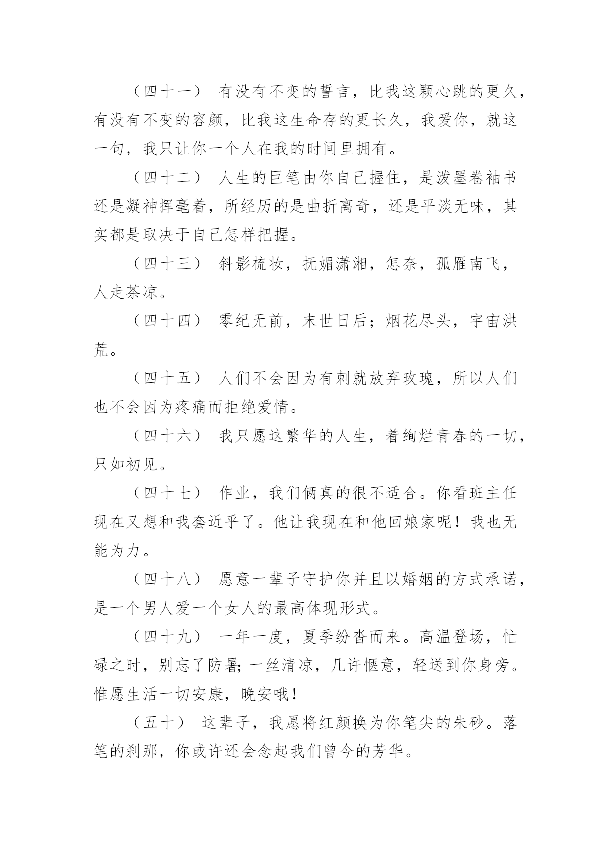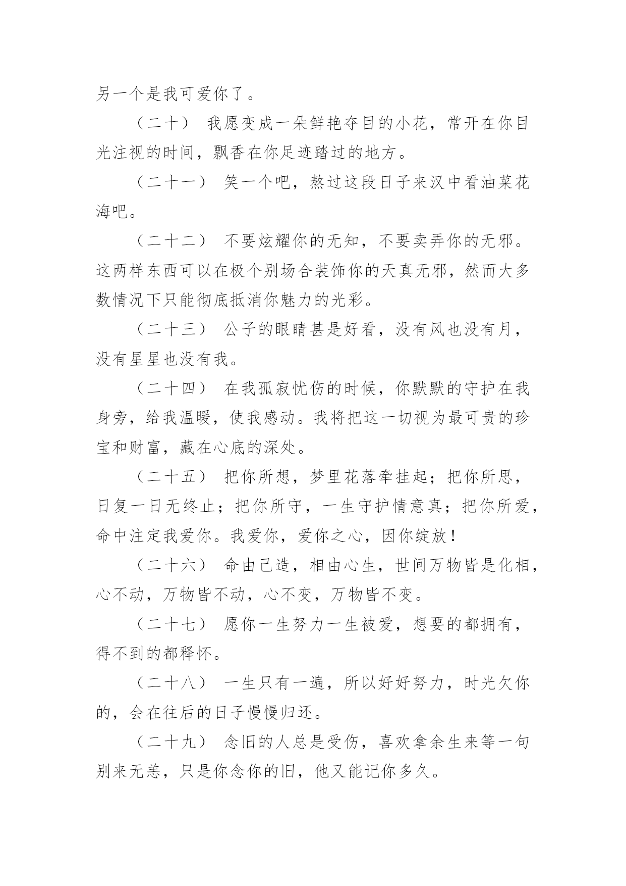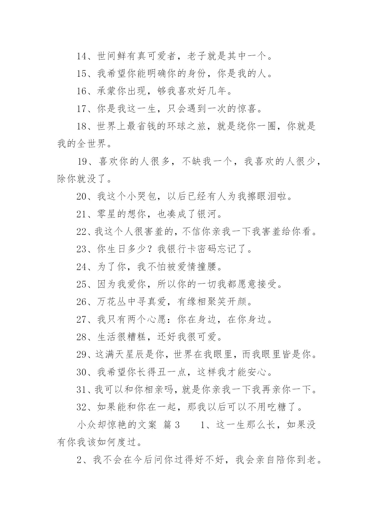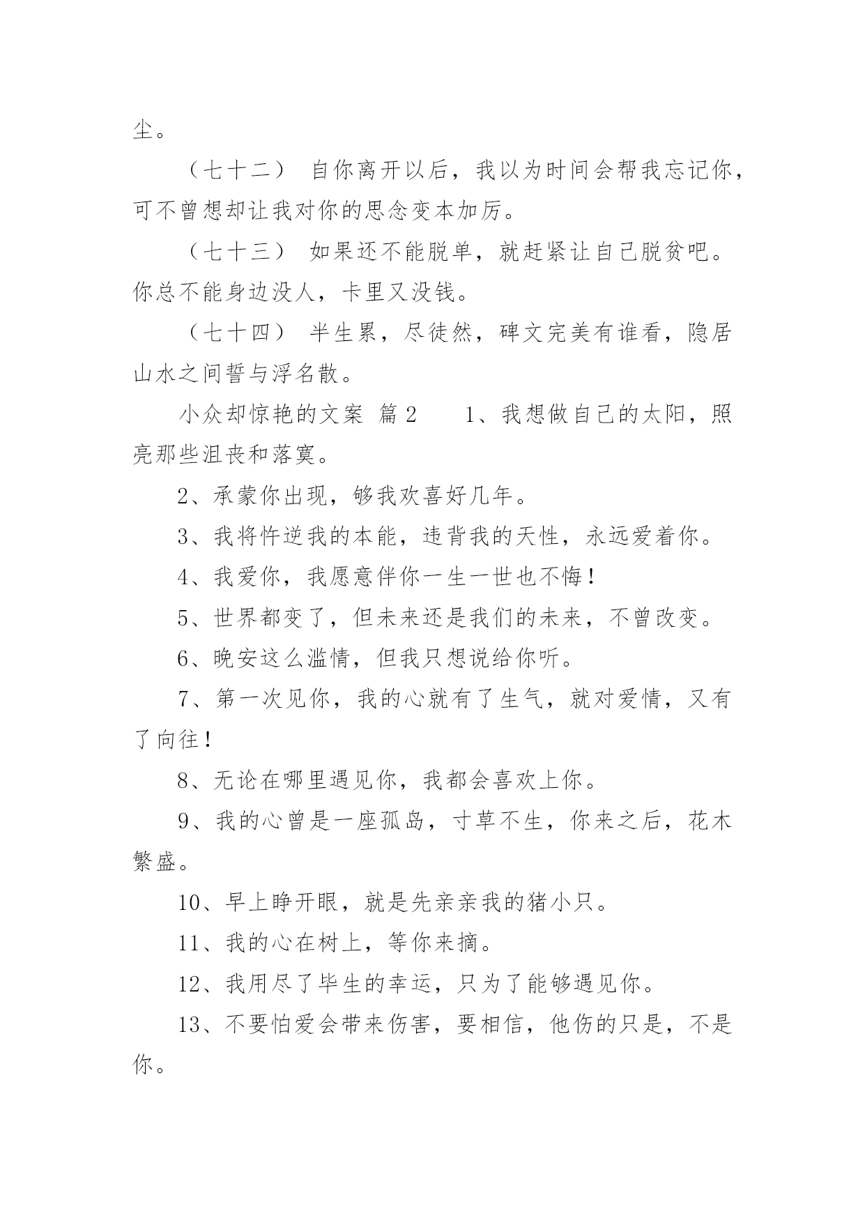 小众却惊艳的文案小众却惊艳的文案随着社交网络和信息技术的迅猛发展,大家对文案都再熟悉不过了吧,文案对人们的思维是有一定的感性作用的。那么什么样的文案才不会千篇一律呢?以下是小编帮大家整理的小众却惊艳的文案,仅供参考,希望能够帮助到大家。小众却惊艳的文案篇1(一)君生我未生,我生君已老,恨不生同时,日日与君好。(二)有人说,林深时见鹿,海蓝时见鲸,梦醒时见你。可我,树深时雾起,海深时浪涌,梦醒时夜续,不见鹿,不见鲸,也不见你。(三)至近至远东西,至深至浅清溪。至高至远明月,至亲至疏夫妻。(四)错过也是一种缘分,即使那个人不可能记住一辈子,可至少他曾在你最美的年华出现过,陪伴过,便已是最好。(五)打开心灵的窗子,让阳光驻到心里,让风儿在耳边歌唱,生命就不会孤单与寒冷。(六)愿你安然羽翼丰满,我等你等至,你我成婚的夏天。(七)无论生活怎样,都不要忘记微笑。愿你成为自己的太阳,无需凭借谁的光。(八)所谓心事,不过是不如己意,那就是我,执着于自己描画的理想,一有落差,即生烦恼。(九)专家说第一胎生的是男孩,说明母亲智商高,是女孩说明父亲智商高,那么你敢不敢和我拼一回智商?(十)幸福,不过是一种妥协。懒惰和迟钝的人,是比较幸福的,他们不愿意努力去寻觅,不会想得太多,少了痛苦和失望,却赢回了轻松和快乐。(十一)喜欢一个人,始于颜值,陷于才华,忠于人品。(十二)有些机会,因瞬间的犹豫,插肩而过;有些缘分,因一时的任性,滑落指间;有些感情,因一时的冲动,遗憾一生;有些人,一转身就是一辈子。(十三)以前我是个恐婚族,我是个单身族,自从遇到了你,我成了所谓的暖男、宠妻狂魔。(十四)人海茫茫,凭着你的芳香导航;寒夜凄凄,想着你的漂亮取暖;人生漫漫,携着你的真尝爱同游;岁月悠悠,陪着你的贤淑共老。亲爱的,到死爱你!(十五)万里山河,你是山河的星星点点,我是保护山河寸土的铁骑。(十六)渺小的日子也要有一点想念,像个灵魂失落在街边。(十七)我的世界有你才会完美。所以我不能失去你。(十八)成人,成仙,成魔又如何!只要对你固执,我便不是我了。(十九)我有两个可爱之处你知道吗?一个是我可爱;另一个是我可爱你了。(二十)我愿变成一朵鲜艳夺目的小花,常开在你目光注视的时间,飘香在你足迹踏过的地方。(二十一)笑一个吧,熬过这段日子来汉中看油菜花海吧。(二十二)不要炫耀你的无知,不要卖弄你的无邪。这两样东西可以在极个别场合装饰你的天真无邪,然而大多数情况下只能彻底抵消你魅力的光彩。(二十三)公子的眼睛甚是好看,没有风也没有月,没有星星也没有我。(二十四)在我孤寂忧伤的时候,你默默的守护在我身旁,给我温暖,使我感动。我将把这一切视为最可贵的珍宝和财富,藏在心底的深处。(二十五)把你所想,梦里花落牵挂起;把你所思,日复一日无终止;把你所守,一生守护情意真;把你所爱,命中注定我爱你。我爱你,爱你之心,因你绽放!(二十六)命由己造,相由心生,世间万物皆是化相,心不动,万物皆不动,心不变,万物皆不变。(二十七)愿你一生努力一生被爱,想要的都拥有,得不到的都释怀。(二十八)一生只有一遍,所以好好努力,时光欠你的,会在往后的日子慢慢归还。(二十九)念旧的人总是受伤,喜欢拿余生来等一句别来无恙,只是你念你的旧,他又能记你多久。(三十)如果我原谅了你,不是因为我听了你的解释,而是我仍然爱你,被你急于解释的样子感动了。(三十一)请你原谅我的太贪心,既想陪你情窦初开,还想陪你两鬓斑白。(三十二)不管什么天气,记得随时带上自己的阳光;不管什么遭遇,记得内心装满开心的童话。(三十三)或许月亮代表不了我的心,但是却代表了我对你的爱,我可以爱你日日复月月,月月复年年,年年复此生。(三十四)世界上有两种东西是怎样都无法挽回的,一种是过去的时间;另一种就是说过的话。(三十五)有些路,你和某人一起走,会长的离谱,和另外的人一起走,却短的舍不得迈开脚步。(三十六)为了你快乐,我宁可放弃微笑的权利;为了你幸福,我宁可陷入苦难的境地;为了你甜蜜,我宁可失去活着的意义,这就是伟大的爱情魔力。(三十七)最好的感情是你是爱我的,我是自由的,我俩是相互信任的,我俩成天腻歪着。(三十八)转身的那一秒开始,我的幸福,便与你无关。(三十九)青春是一场华丽的狂欢,即时我们能看到的青春狂舞,也不过是盛极而衰时的挽歌。(四十)这一生真假,不过是水中月雾里花,看不清,已是落地成沙。(四十一)有没有不变的誓言,比我这颗心跳的更久,有没有不变的容颜,比我这生命存的更长久,我爱你,就这一句,我只让你一个人在我的时间里拥有。(四十二)人生的巨笔由你自己握住,是泼墨卷袖书还是凝神挥毫着,所经历的是曲折离奇,还是平淡无味,其实都是取决于自己怎样把握。(四十三)斜影梳妆,抚媚潇湘,怎奈,孤雁南飞,人走茶凉。(四十四)零纪无前,末世日后;烟花尽