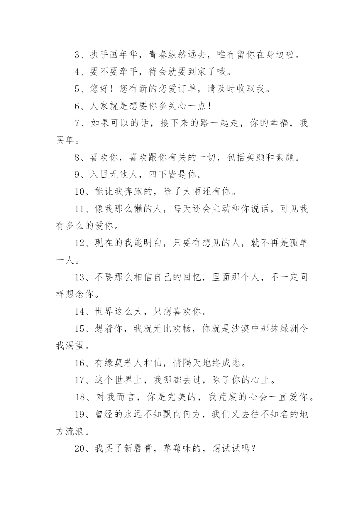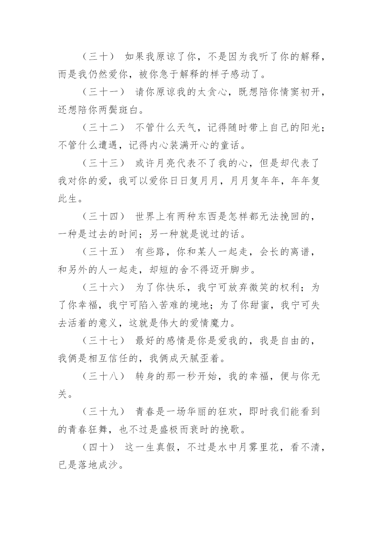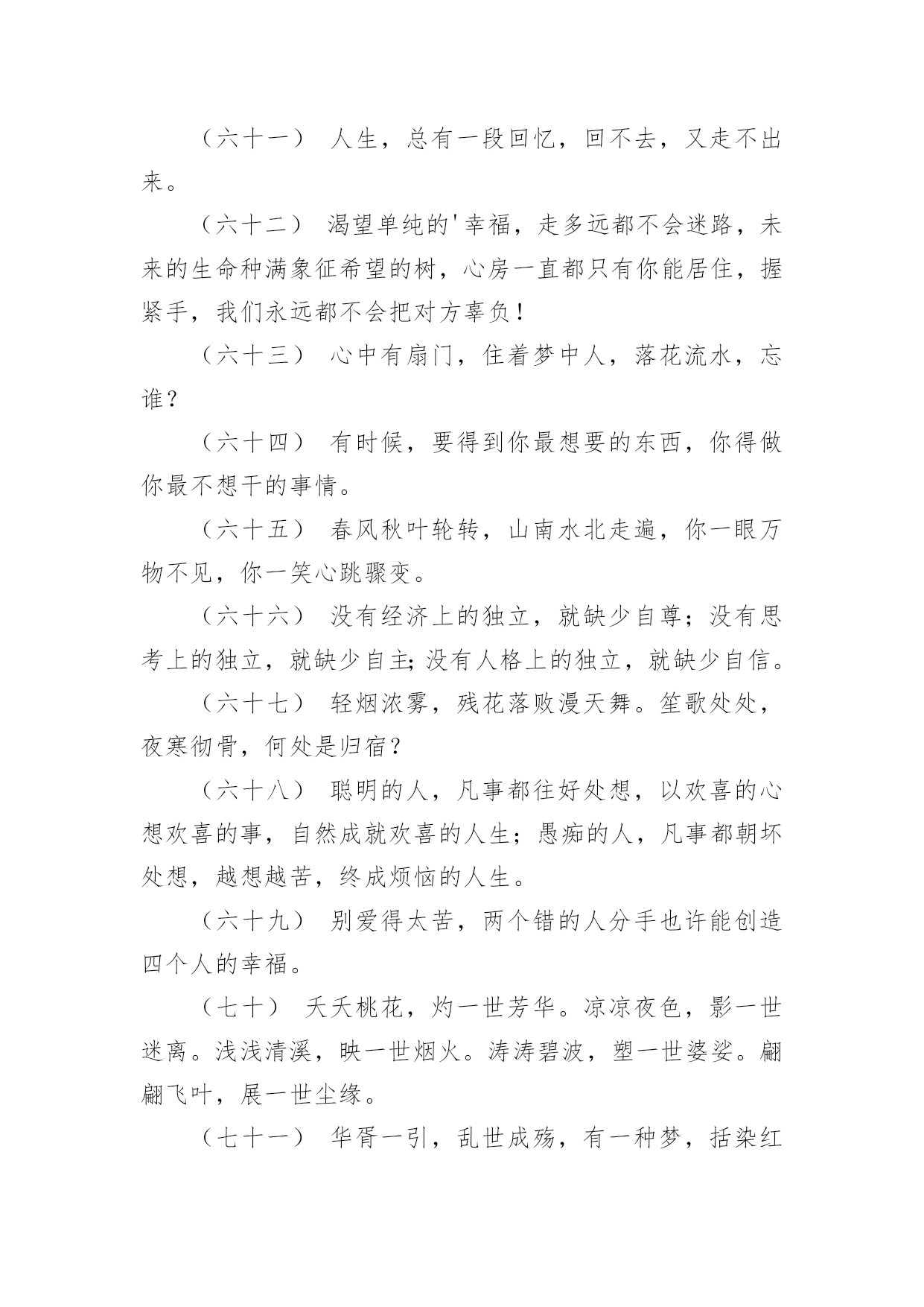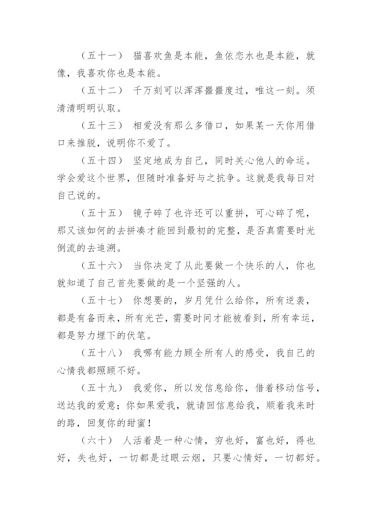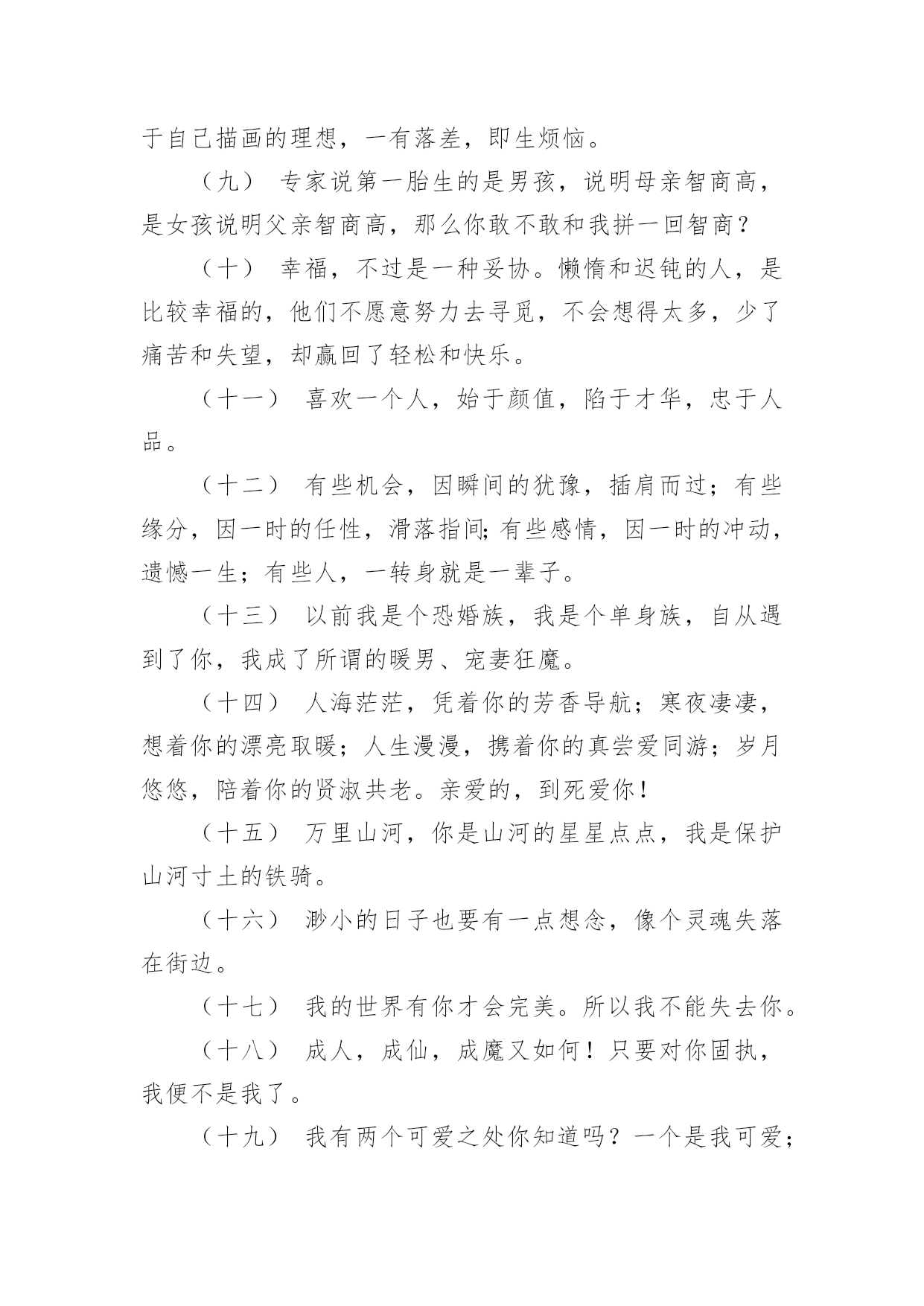 小众却惊艳的文案小众却惊艳的文案随着社交网络和信息技术的迅猛发展,大家对文案都再熟悉不过了吧,文案对人们的思维是有一定的感性作用的。那么什么样的文案才不会千篇一律呢?以下是小编帮大家整理的小众却惊艳的文案,仅供参考,希望能够帮助到大家。小众却惊艳的文案篇1(一)君生我未生,我生君已老,恨不生同时,日日与君好。(二)有人说,林深时见鹿,海蓝时见鲸,梦醒时见你。可我,树深时雾起,海深时浪涌,梦醒时夜续,不见鹿,不见鲸,也不见你。(三)至近至远东西,至深至浅清溪。至高至远明月,至亲至疏夫妻。(四)错过也是一种缘分,即使那个人不可能记住一辈子,可至少他曾在你最美的年华出现过,陪伴过,便已是最好。(五)打开心灵的窗子,让阳光驻到心里,让风儿在耳边歌唱,生命就不会孤单与寒冷。(六)愿你安然羽翼丰满,我等你等至,你我成婚的夏天。(七)无论生活怎样,都不要忘记微笑。愿你成为自己的太阳,无需凭借谁的光。(八)所谓心事,不过是不如己意,那就是我,执着于自己描画的理想,一有落差,即生烦恼。(九)专家说第一胎生的是男孩,说明母亲智商高,是女孩说明父亲智商高,那么你敢不敢和我拼一回智商?(十)幸福,不过是一种妥协。懒惰和迟钝的人,是比较幸福的,他们不愿意努力去寻觅,不会想得太多,少了痛苦和失望,却赢回了轻松和快乐。(十一)喜欢一个人,始于颜值,陷于才华,忠于人品。(十二)有些机会,因瞬间的犹豫,插肩而过;有些缘分,因一时的任性,滑落指间;有些感情,因一时的冲动,遗憾一生;有些人,一转身就是一辈子。(十三)以前我是个恐婚族,我是个单身族,自从遇到了你,我成了所谓的暖男、宠妻狂魔。(十四)人海茫茫,凭着你的芳香导航;寒夜凄凄,想着你的漂亮取暖;人生漫漫,携着你的真尝爱同游;岁月悠悠,陪着你的贤淑共老。亲爱的,到死爱你!(十五)万里山河,你是山河的星星点点,我是保护山河寸土的铁骑。(十六)渺小的日子也要有一点想念,像个灵魂失落在街边。(十七)我的世界有你才会完美。所以我不能失去你。(十八)成人,成仙,成魔又如何!只要对你固执,我便不是我了。(十九)我有两个可爱之处你知道吗?一个是我可爱;另一个是我可爱你了。(二十)我愿变成一朵鲜艳夺目的小花,常开在你目光注视的时间,飘香在你足迹踏过的地方。(二十一)笑一个吧,熬过这段日子来汉中看油菜花海吧。(二十二)不要炫耀你的无知,不要卖弄你的无邪。这两样东西可以在极个别场合装饰你的天真无邪,然而大多数情况下只能彻底抵消你魅力的光彩。(二十三)公子的眼睛甚是好看,没有风也没有月,没有星星也没有我。(二十四)在我孤寂忧伤的时候,你默默的守护在我身旁,给我温暖,使我感动。我将把这一切视为最可贵的珍宝和财富,藏在心底的深处。(二十五)把你所想,梦里花落牵挂起;把你所思,日复一日无终止;把你所守,一生守护情意真;把你所爱,命中注定我爱你。我爱你,爱你之心,因你绽放!(二十六)命由己造,相由心生,世间万物皆是化相,心不动,万物皆不动,心不变,万物皆不变。(二十七)愿你一生努力一生被爱,想要的都拥有,得不到的都释怀。(二十八)一生只有一遍,所以好好努力,时光欠你的,会在往后的日子慢慢归还。(二十九)念旧的人总是受伤,喜欢拿余生来等一句别来无恙,只是你念你的旧,他又能记你多久。(三十)如果我原谅了你,不是因为我听了你的解释,而是我仍然爱你,被你急于解释的样子感动了。(三十一)请你原谅我的太贪心,既想陪你情窦初开,还想陪你两鬓斑白。(三十二)不管什么天气,记得随时带上自己的阳光;不管什么遭遇,记得内心装满开心的童话。(三十三)或许月亮代表不了我的心,但是却代表了我对你的爱,我可以爱你日日复月月,月月复年年,年年复此生。(三十四)世界上有两种东西是怎样都无法挽回的,一种是过去的时间;另一种就是说过的话。(三十五)有些路,你和某人一起走,会长的离谱,和另外的人一起走,却短的舍不得迈开脚步。(三十六)为了你快乐,我宁可放弃微笑的权利;为了你幸福,我宁可陷入苦难的境地;为了你甜蜜,我宁可失去活着的意义,这就是伟大的爱情魔力。(三十七)最好的感情是你是爱我的,我是自由的,我俩是相互信任的,我俩成天腻歪着。(三十八)转身的那一秒开始,我的幸福,便与你无关。(三十九)青春是一场华丽的狂欢,即时我们能看到的青春狂舞,也不过是盛极而衰时的挽歌。(四十)这一生真假,不过是水中月雾里花,看不清,已是落地成沙。(四十一)有没有不变的誓言,比我这颗心跳的更久,有没有不变的容颜,比我这生命存的更长久,我爱你,就这一句,我只让你一个人在我的时间里拥有。(四十二)人生的巨笔由你自己握住,是泼墨卷袖书还是凝神挥毫着,所经历的是曲折离奇,还是平淡无味,其实都是取决于自己怎样把握。(四十三)斜影梳妆,抚媚潇湘,怎奈,孤雁南飞,人走茶凉。(四十四)零纪无前,末世日后;烟花尽