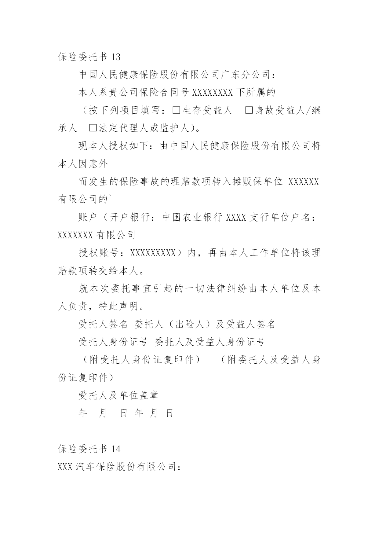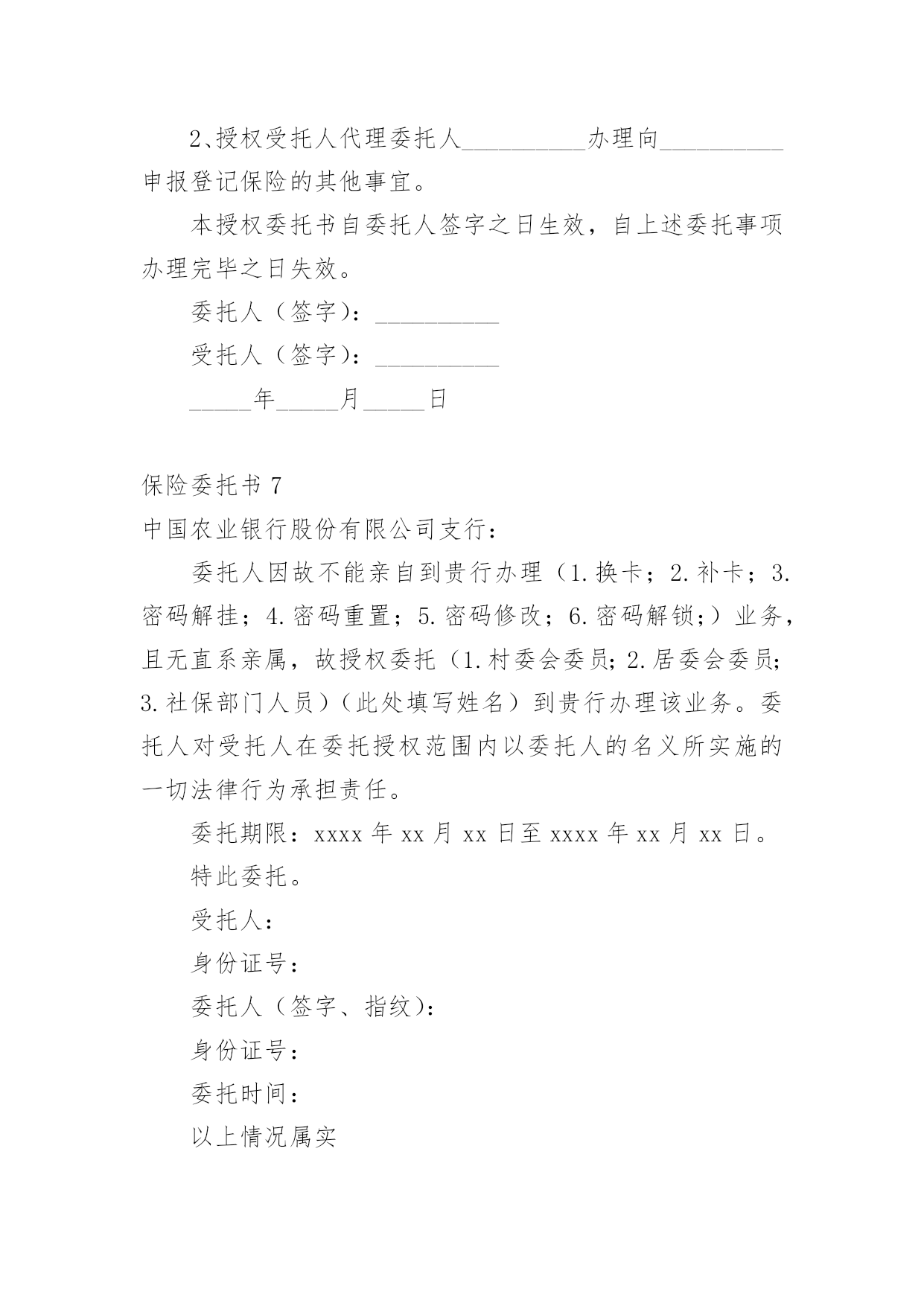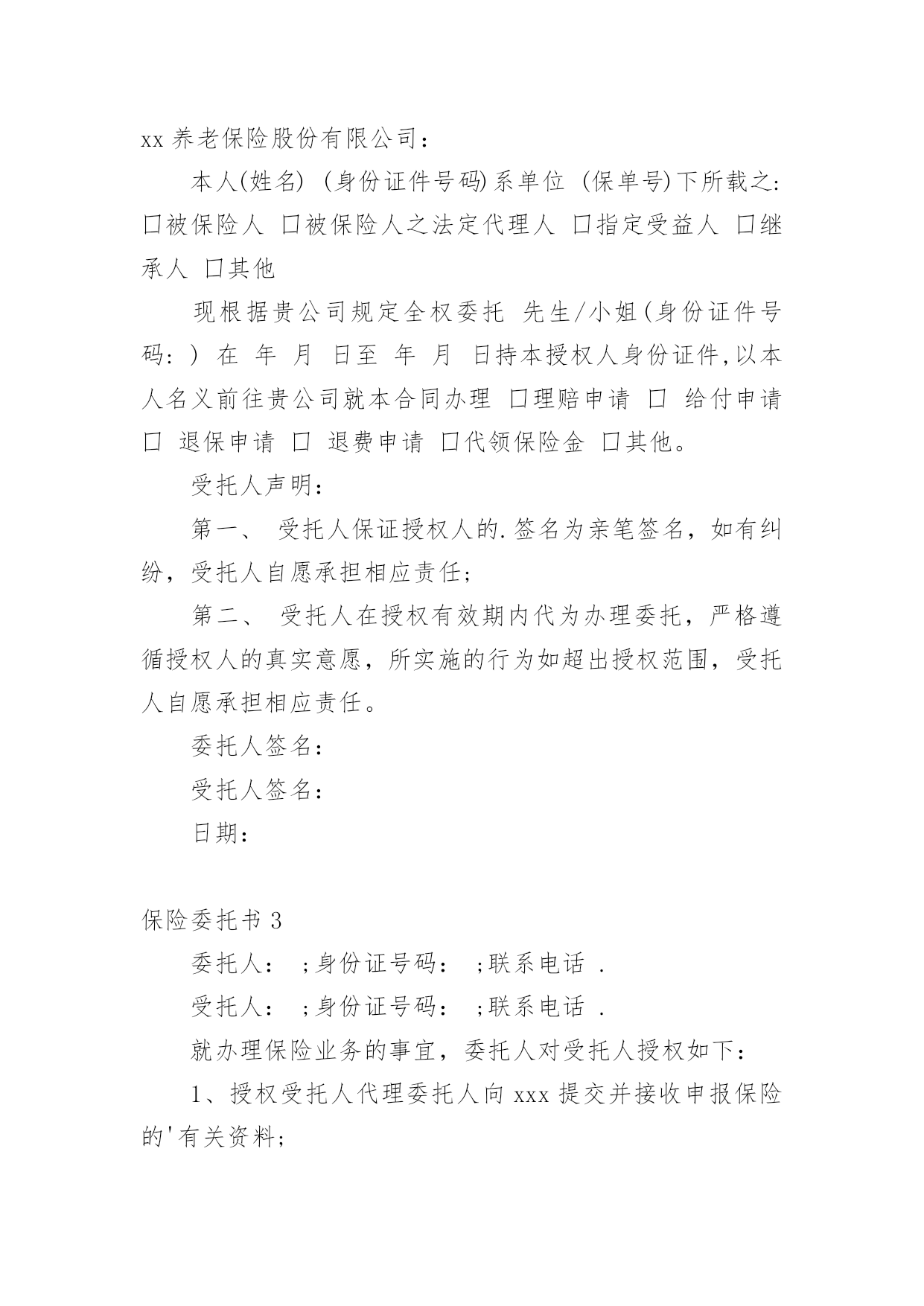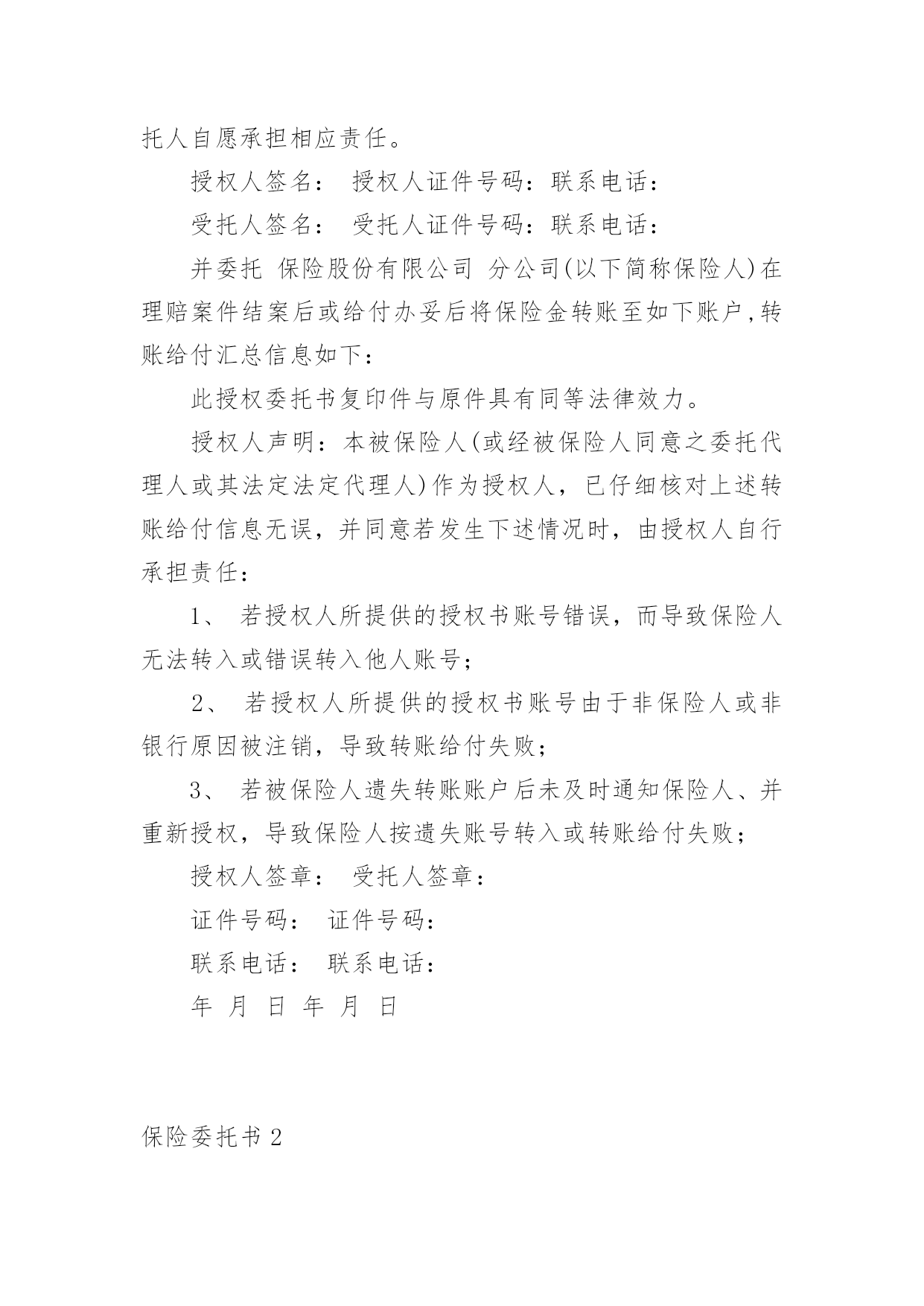 保险委托书保险委托书(15篇)委托书具有不可撤销性,委托人不得以任何理由反悔委托事项。在现在社会,委托书应用范围愈来愈广泛,大家知道委托书的格式吗?以下是小编整理的保险委托书,仅供参考,希望能够帮助到大家。保险委托书1保险理赔授权委托书保险股份有限公司:本人(姓名)(身份证件号码)系(保单号)下所载之:■被保险人囗被保险人之法定代理人囗指定受益人囗继承人囗其他现根据法律规定全权委托先生/小姐(身份证件号码:)在年月日至年月日持本授权人身份证件复印件,以本人名义前往贵公司就本合同办理■理赔■给付申请囗退保申请囗退费申请囗代领保险金囗其他受托人声明:第一、受托人保证授权人的签名为亲笔签名,如有纠纷,受托人自愿承担相应责任;第二、受托人在授权有效期内代为办理委托,严格遵循授权人的真实意愿,所实施的`行为如超出授权范围,受托人自愿承担相应责任。授权人签名:授权人证件号码:联系电话:受托人签名:受托人证件号码:联系电话:并委托保险股份有限公司分公司(以下简称保险人)在理赔案件结案后或给付办妥后将保险金转账至如下账户,转账给付汇总信息如下:此授权委托书复印件与原件具有同等法律效力。授权人声明:本被保险人(或经被保险人同意之委托代理人或其法定法定代理人)作为授权人,已仔细核对上述转账给付信息无误,并同意若发生下述情况时,由授权人自行承担责任:1、若授权人所提供的授权书账号错误,而导致保险人无法转入或错误转入他人账号;2、若授权人所提供的授权书账号由于非保险人或非银行原因被注销,导致转账给付失败;3、若被保险人遗失转账账户后未及时通知保险人、并重新授权,导致保险人按遗失账号转入或转账给付失败;授权人签章:受托人签章:证件号码:证件号码:联系电话:联系电话:年月日年月日保险委托书2xx养老保险股份有限公司:本人(姓名)(身份证件号码)系单位(保单号)下所载之:囗被保险人囗被保险人之法定代理人囗指定受益人囗继承人囗其他现根据贵公司规定全权委托先生/小姐(身份证件号码:)在年月日至年月日持本授权人身份证件,以本人名义前往贵公司就本合同办理囗理赔申请囗给付申请囗退保申请囗退费申请囗代领保险金囗其他。受托人声明:第一、受托人保证授权人的.签名为亲笔签名,如有纠纷,受托人自愿承担相应责任;第二、受托人在授权有效期内代为办理委托,严格遵循授权人的真实意愿,所实施的行为如超出授权范围,受托人自愿承担相应责任。委托人签名:受托人签名:日期:保险委托书3委托人:;身份证号码:;联系电话.受托人:;身份证号码:;联系电话.就办理保险业务的事宜,委托人对受托人授权如下:1、授权受托人代理委托人向xxx提交并接收申报保险的'有关资料;2、授权受托人代理委托人xxx办理向xxxx申报登记保险的其他事宜。本授权委托书自委托人签之日生效,自上述委托事项办理完毕之日失效。委托人(签):受托人(签):20xx年xx月xx日保险委托书4(法人或其他组织当事人的委托代理人用)委托单位名称:所在地址:法定代表人或代表人姓名:*****职务:*****受委托人姓名:*****性别:**工作单位:*****物流有限公司电话:12345678910现派我公司xxx同志前往你处办理鲁LC****车辆违法超载处罚事项,作为我公司委托代理人。委托单位:保险委托书5从年月日起,我司委托保险经纪有限公司为我司唯一的保险经纪人,代表我们处理所有保险相关事宜。除非另行下达了取消该委托书的书面通知,本委托书将持续有效。同时,所有以前有关这方面的委托全部作废。保险经纪有限公司被授权审核我司的'保险计划及安排,并按照其营业执照所规定的营业范围提供风险管理及保险服务。主要服务范围如下:1、协助我司安排相关保险;2、帮助我司识别未投保风险;3、帮助我司检查并核对各种保险文件及其他有关风险转移安排的文件,包括保险单和批单;4、准备保险安排概要;5、就风险/保险及赔偿等问题向我司提供建议、帮助及指导;6、与我司举行保险工作会议;7、检测保险公司的财务稳定性;协助我司进行索赔,帮助并指导我司准备索赔文件。年月日保险委托书6委托人:__________;身份证号码:____________________;联系电话____________________。受托人:__________;身份证号码:____________________;联系电话____________________。就办理保险业务的事宜,委托人对受托人授权如下:1、授权受托人代理委托人向__________提交并接收申报保险的.有关资料;2、授权受托人代理委托人__________办理向__________申报登记保险的其他事宜。本授权委托书自委托人签字之日生效,自上述委托事项办理完毕之日失效。委托人(签字):__________受托人(签字):
