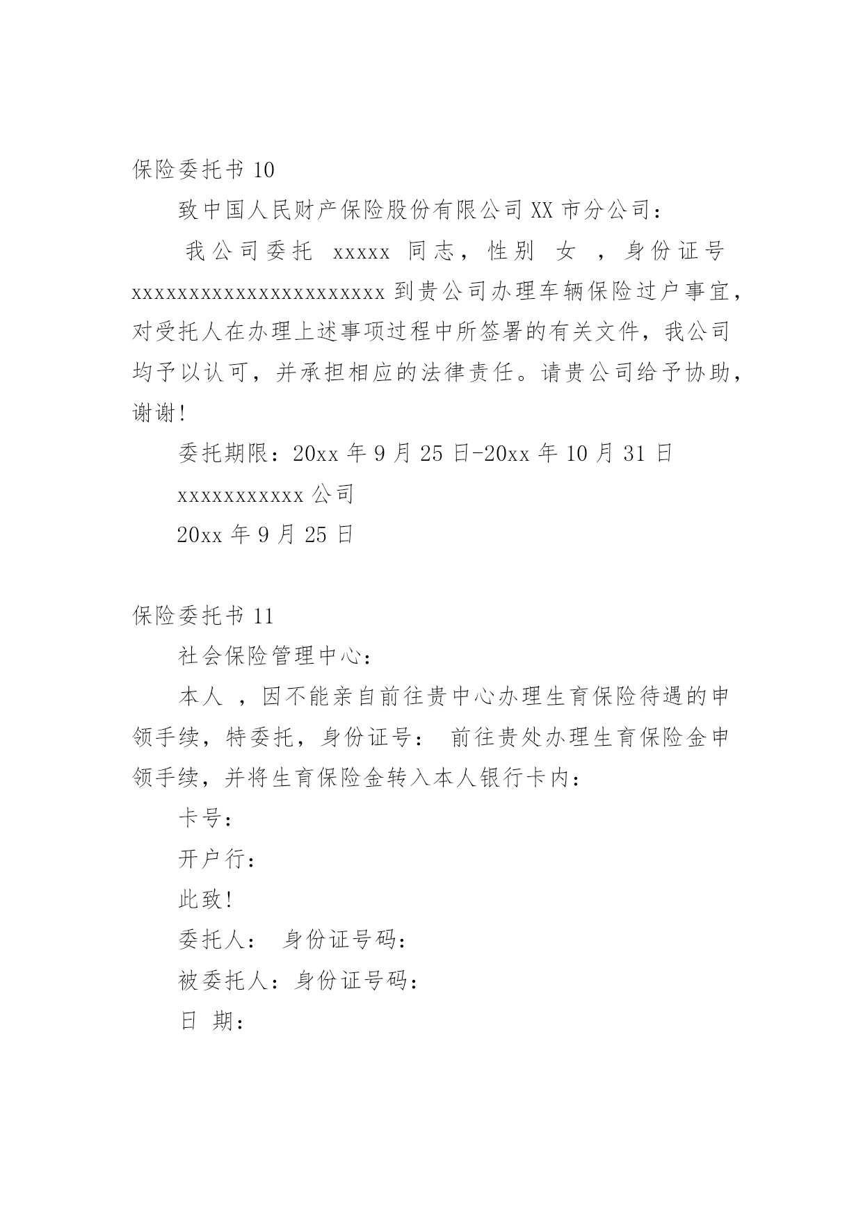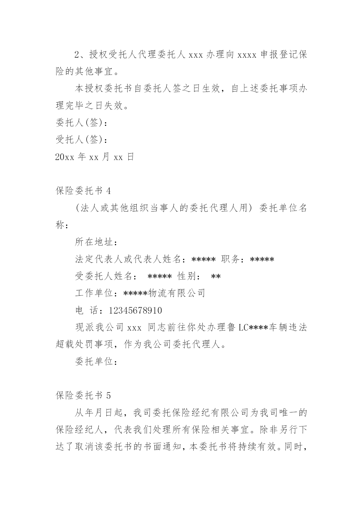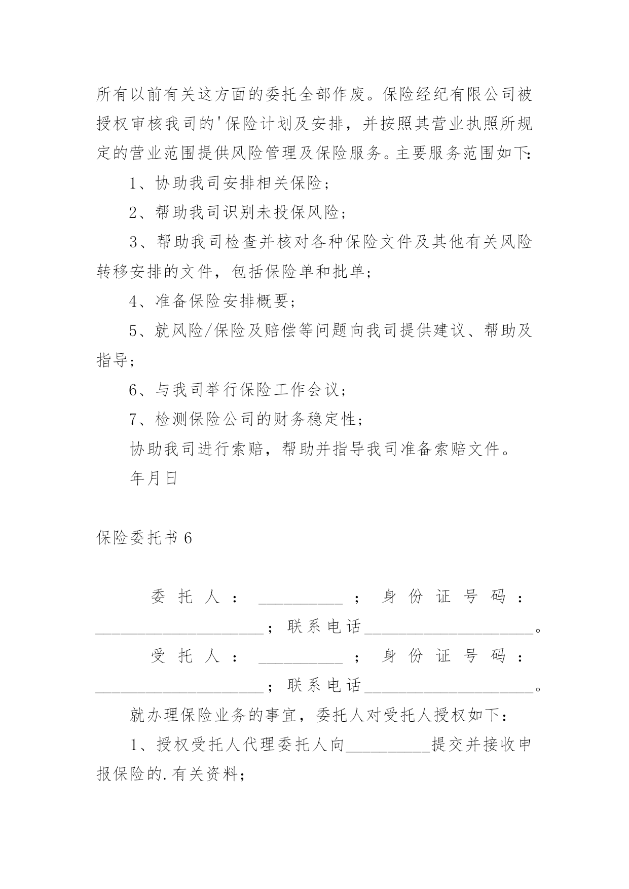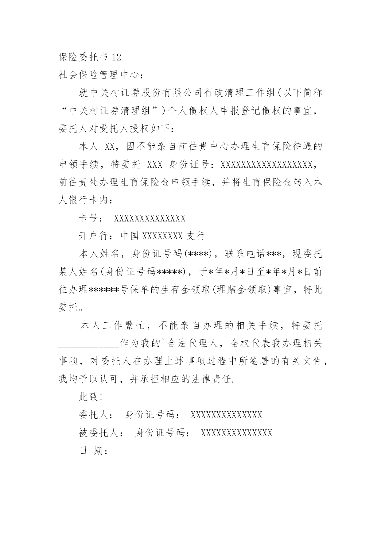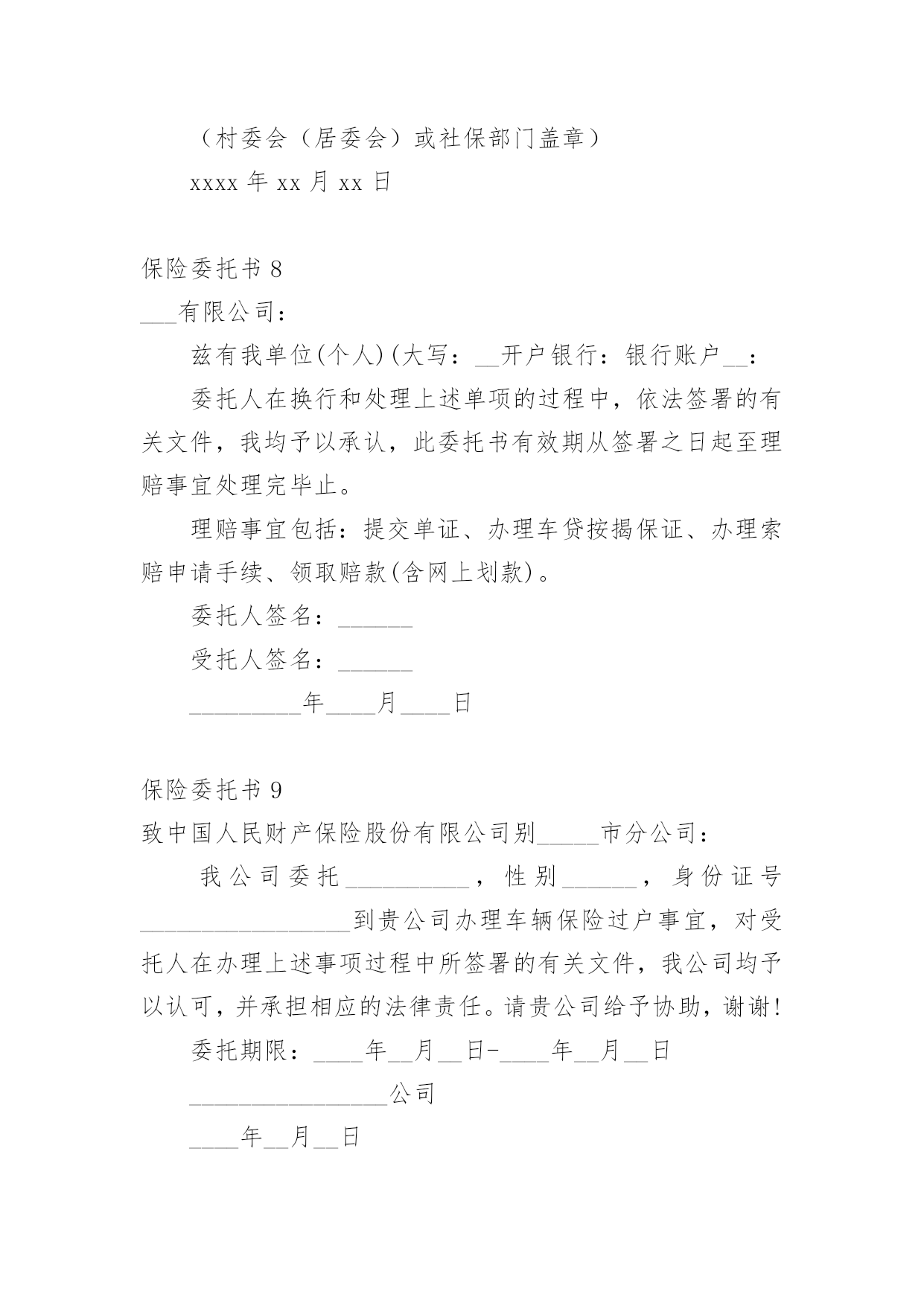 保险委托书保险委托书(15篇)委托书具有不可撤销性,委托人不得以任何理由反悔委托事项。在现在社会,委托书应用范围愈来愈广泛,大家知道委托书的格式吗?以下是小编整理的保险委托书,仅供参考,希望能够帮助到大家。保险委托书1保险理赔授权委托书保险股份有限公司:本人(姓名)(身份证件号码)系(保单号)下所载之:■被保险人囗被保险人之法定代理人囗指定受益人囗继承人囗其他现根据法律规定全权委托先生/小姐(身份证件号码:)在年月日至年月日持本授权人身份证件复印件,以本人名义前往贵公司就本合同办理■理赔■给付申请囗退保申请囗退费申请囗代领保险金囗其他受托人声明:第一、受托人保证授权人的签名为亲笔签名,如有纠纷,受托人自愿承担相应责任;第二、受托人在授权有效期内代为办理委托,严格遵循授权人的真实意愿,所实施的`行为如超出授权范围,受托人自愿承担相应责任。授权人签名:授权人证件号码:联系电话:受托人签名:受托人证件号码:联系电话:并委托保险股份有限公司分公司(以下简称保险人)在理赔案件结案后或给付办妥后将保险金转账至如下账户,转账给付汇总信息如下:此授权委托书复印件与原件具有同等法律效力。授权人声明:本被保险人(或经被保险人同意之委托代理人或其法定法定代理人)作为授权人,已仔细核对上述转账给付信息无误,并同意若发生下述情况时,由授权人自行承担责任:1、若授权人所提供的授权书账号错误,而导致保险人无法转入或错误转入他人账号;2、若授权人所提供的授权书账号由于非保险人或非银行原因被注销,导致转账给付失败;3、若被保险人遗失转账账户后未及时通知保险人、并重新授权,导致保险人按遗失账号转入或转账给付失败;授权人签章:受托人签章:证件号码:证件号码:联系电话:联系电话:年月日年月日保险委托书2xx养老保险股份有限公司:本人(姓名)(身份证件号码)系单位(保单号)下所载之:囗被保险人囗被保险人之法定代理人囗指定受益人囗继承人囗其他现根据贵公司规定全权委托先生/小姐(身份证件号码:)在年月日至年月日持本授权人身份证件,以本人名义前往贵公司就本合同办理囗理赔申请囗给付申请囗退保申请囗退费申请囗代领保险金囗其他。受托人声明:第一、受托人保证授权人的.签名为亲笔签名,如有纠纷,受托人自愿承担相应责任;第二、受托人在授权有效期内代为办理委托,严格遵循授权人的真实意愿,所实施的行为如超出授权范围,受托人自愿承担相应责任。委托人签名:受托人签名:日期:保险委托书3委托人:;身份证号码:;联系电话.受托人:;身份证号码:;联系电话.就办理保险业务的事宜,委托人对受托人授权如下:1、授权受托人代理委托人向xxx提交并接收申报保险的'有关资料;2、授权受托人代理委托人xxx办理向xxxx申报登记保险的其他事宜。本授权委托书自委托人签之日生效,自上述委托事项办理完毕之日失效。委托人(签):受托人(签):20xx年xx月xx日保险委托书4(法人或其他组织当事人的委托代理人用)委托单位名称:所在地址:法定代表人或代表人姓名:*****职务:*****受委托人姓名:*****性别:**工作单位:*****物流有限公司电话:12345678910现派我公司xxx同志前往你处办理鲁LC****车辆违法超载处罚事项,作为我公司委托代理人。委托单位:保险委托书5从年月日起,我司委托保险经纪有限公司为我司唯一的保险经纪人,代表我们处理所有保险相关事宜。除非另行下达了取消该委托书的书面通知,本委托书将持续有效。同时,所有以前有关这方面的委托全部作废。保险经纪有限公司被授权审核我司的'保险计划及安排,并按照其营业执照所规定的营业范围提供风险管理及保险服务。主要服务范围如下:1、协助我司安排相关保险;2、帮助我司识别未投保风险;3、帮助我司检查并核对各种保险文件及其他有关风险转移安排的文件,包括保险单和批单;4、准备保险安排概要;5、就风险/保险及赔偿等问题向我司提供建议、帮助及指导;6、与我司举行保险工作会议;7、检测保险公司的财务稳定性;协助我司进行索赔,帮助并指导我司准备索赔文件。年月日保险委托书6委托人:__________;身份证号码:____________________;联系电话____________________。受托人:__________;身份证号码:____________________;联系电话____________________。就办理保险业务的事宜,委托人对受托人授权如下:1、授权受托人代理委托人向__________提交并接收申报保险的.有关资料;2、授权受托人代理委托人__________办理向__________申报登记保险的其他事宜。本授权委托书自委托人签字之日生效,自上述委托事项办理完毕之日失效。委托人(签字):__________受托人(签字):