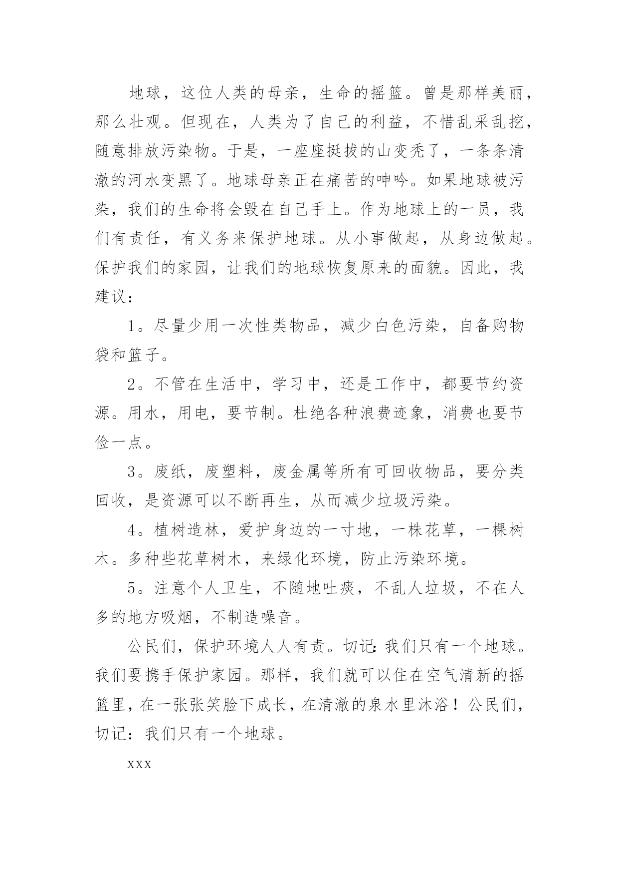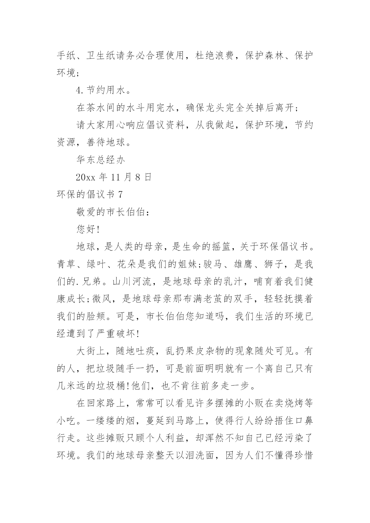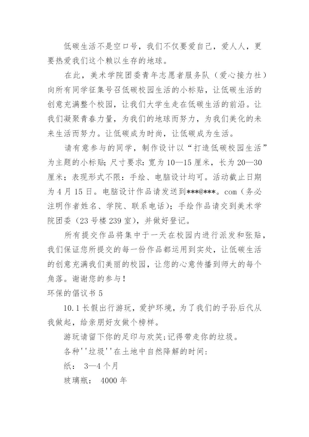 环保的倡议书环保的倡议书15篇随着社会一步步向前发展,倡议书对我们的作用越来越大,倡议书不是对某个人或某一小集体而发的,它的受众往往是广大群众,或是部门的所有人,或是一个地区的所有人,甚至是全国人民。还是对倡议书一筹莫展吗?下面是小编为大家整理的环保的倡议书,希望对大家有所帮助。环保的倡议书1市民朋友们:当极端天气逐渐增多的时候,当我国各地自然灾害频发的时候,当可用资源逐渐减少的时候,亲爱的朋友们,你可曾想过,用自己的微薄之力为我们脆弱的地球做点什么?地球是人类赖以生存的家园,生态环境是人类发展的基础。随着全球经济现代化程度的加深和工业文明的不断推进,环境问题也越来越严重,各种能耗和污染排放日益危及到地球生态平衡和人类生存的根基。珍爱地球,保护地球生态环境成为了我们每一位地球村成员义不容辞的责任。“地球一小时”作为世界自然基金会(WWF)为应对全球气候变化于20xx年发起的一项全球活动,四年来取得了巨大的成功。20xx年,全球已有126个国家和地区、4616个城市通过实际行动参与到这一活动当中。而中国在短短两年的活动时间内,已有33个城市的上千万民众参与到“地球一小时”活动中。20xx年的“地球一小时”活动将不仅仅局限于熄灯一小时和应对全球变暖的行动。在倡导家庭、办公室、标志性景观熄灯一小时的同时,“地球一小时”还将倡导大家在未来的一年中采取可持续的环保行动。为展现霸州人民与世界一道携手保护生态环境的信心和决心,实现建设“品质霸州”的目标,我们向全社会倡议:第一,积极参与“地球一小时”行动。在3月26日20:30-21:30期间,熄灭景观、办公、家庭照明灯光,关闭电脑、手机充电器等一切不必要的电源。第二,将本次“地球一小时”活动信息传达给家人、同学、朋友等身边的所有人,鼓励邀请更多的人共同参与到“地球一小时”活动中来。第三,以此活动为契机,将节能减排理念贯穿到每个人的工作、学习、生活的方方面面,并尽可能地带动身边人实践环保。朋友们,每节约1度电,就会减少1千克二氧化碳和0.03千克二氧化硫的排放,在不可再生能源越来越少的今天,让我们每个人都承担起应尽的责任,为了我们共同的地球,为了我们子孙后代的未来,请大家一起来创造这个美丽的“黑暗时刻”,“地球一小时”是带来希望和变革的契机。行动起来吧,世界将因你而改变。署名20xx年x月x日环保的倡议书2亲爱的同学们:你们好!小鸟依旧啼叫,花朵依旧绽放,地球母亲带给我们一个美丽的世界,她是那么的仁慈和宽容,面对母亲无私的仁慈与宽容,我们人类——地球母亲的宠儿,却伤害她最深。生机盎然的森林,倾刻间被肆意的砍伐了;清澈甜爽的泉水,早已变得乌黑恶臭;肆无忌惮的开采,抽取地球母亲的血液……小鸟的啼叫沙哑了,花朵的颜色黯淡了,曾经仁慈、宽容的地球母亲,终于忍耐不住,要惩罚我们——地球的宠儿人类。于是猖獗的沙尘蒙住了我们的眼睛;恶臭的污水,刺激着我们的鼻孔;突如其来的sars,更是让贪婪的人类措手不及;山体的滑坡,夺去了无辜者的生命;变化无常的“厄尔尼诺”现象,范围和能量都在变大;还有废旧电池的污染一直被我们忽略……朋友们,你们知道吗?一粒小小的纽扣电池弃入了大自然可以污染多少万升水吗?60万升水啊!这可是一个人一生的用水量,而我国每年要消耗这样的电池42亿只啊!一节五号电池可以污染一立方米的土地,一立方米的土地可以使7个人遭到重金属中毒,危害如此大,而中国每年要用各类电池近百亿节,可回收率不足1%。我们可以想了有多少电池被我们随意丢弃入大自然,它们可以污染多少水和土壤啊?朋友们,我们人类永远是最聪明的,我们已经觉悟,我们已开始制止我们的破坏行为,例如:欧美各国在经济上设置“绿色壁垒”抵制一切不合理的以破坏环境来获取利益的产品,从而使一些国家制止继续破坏环境的行为,这无疑是一种积极的行为,可是在我们中国,多数人环保意识很淡薄,泱泱大中国,浩浩礼仪之邦,怎能落后于世界环保浪潮呢?为了保护我们的家园,我们倡议:1、大家行动起来,勇于同破坏环境,破坏生态的行为作斗争!2、少用甚至不用一次性饭盒、方便袋,不用一次性筷子等。3、节约每一滴水,每一度电,用好每一滴水,每一度电。4、大家要把自己身边的每节旧电池回收起来,再处理。重视环保,从你我做起!朋友们,行动起来吧!你我能力有限,但你我的心无限。签名:日期:年月日环保的倡议书3地球村的小公民们:我们赖以生存的地球只有一个,它多么需要我们的保护啊!可是,有些小公民非但不听,你们看,餐桌上被丢弃的食物,堆积如山的一次性筷子,哗哗流淌的自来水。这样的画面真是触目惊心。地球,这位人类的母亲,生命的摇篮。曾是那样美丽,那么壮观。但现在,人类为了自己的利益,不惜乱采乱挖,随意排放污染物。于是,一座座挺拔的山变秃了,一条条清澈的河水变黑了。地球母亲正在痛苦的呻吟。如果地球
