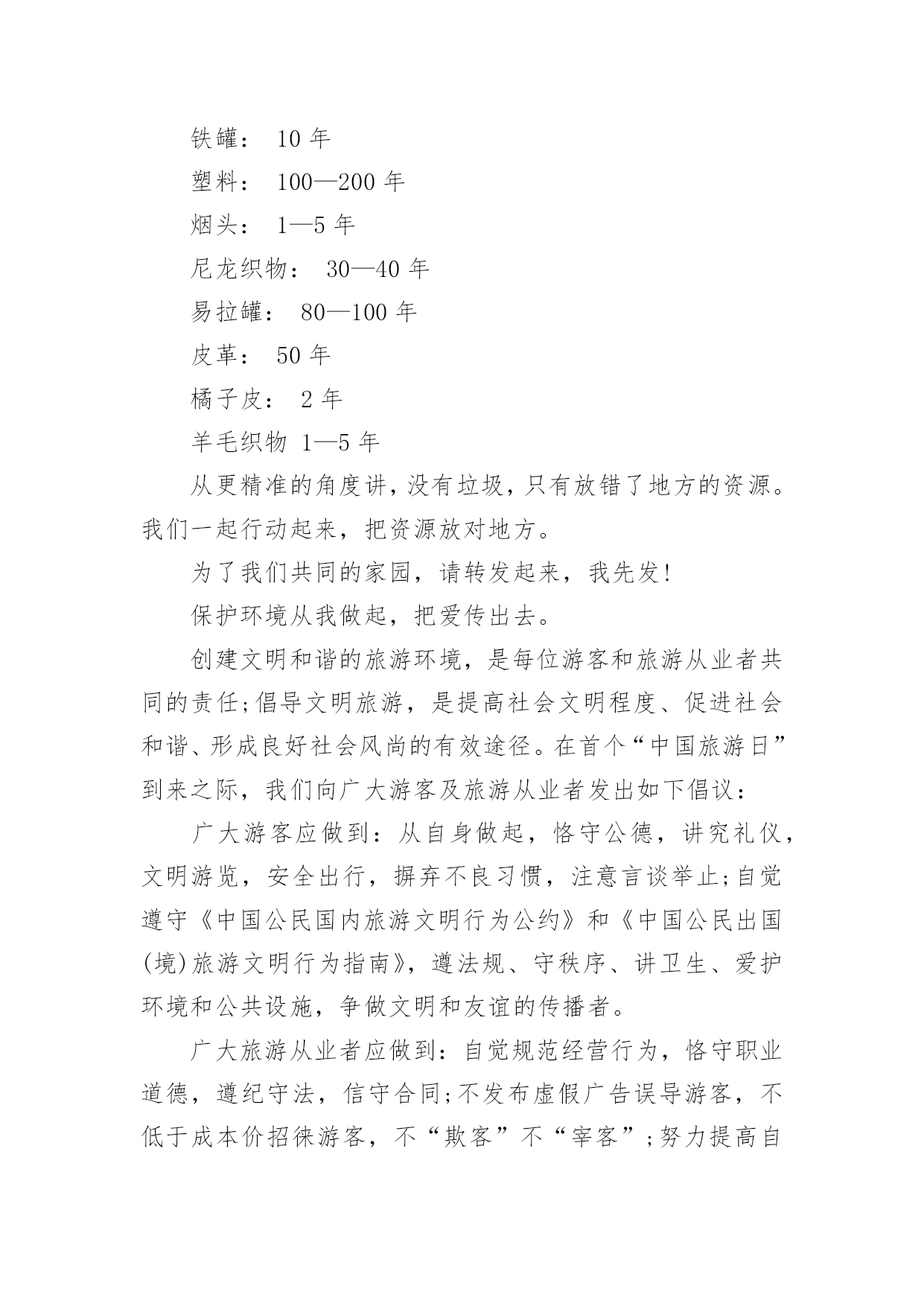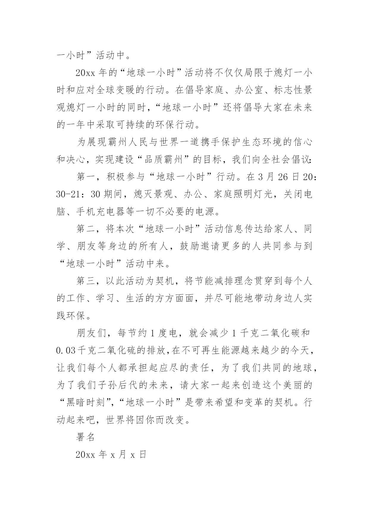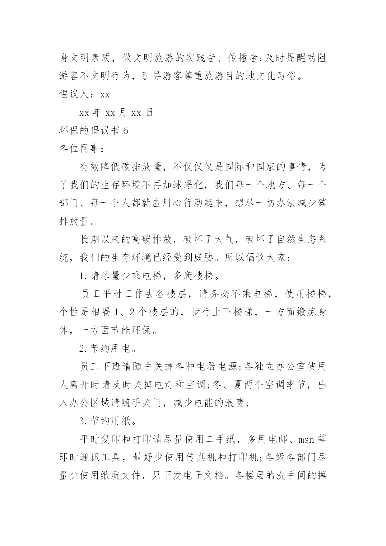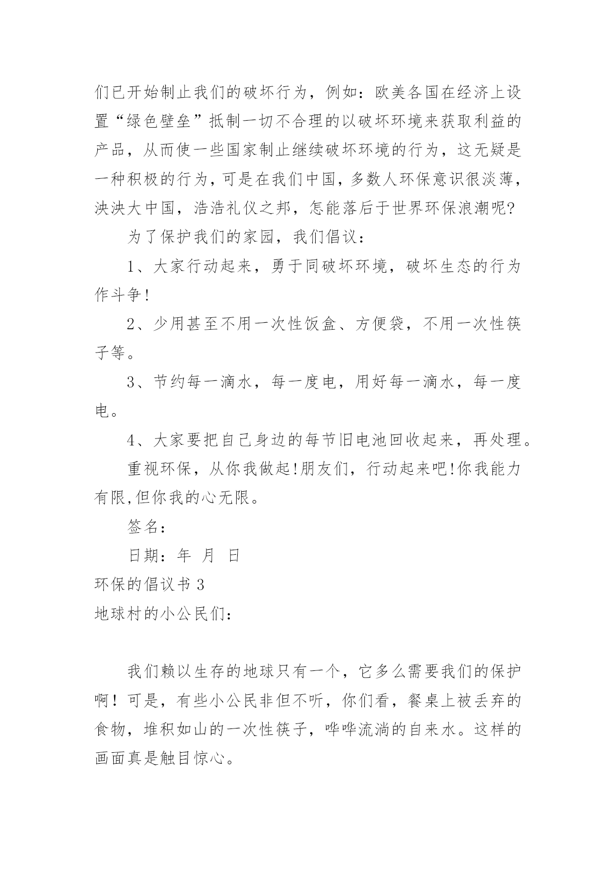 环保的倡议书环保的倡议书15篇随着社会一步步向前发展,倡议书对我们的作用越来越大,倡议书不是对某个人或某一小集体而发的,它的受众往往是广大群众,或是部门的所有人,或是一个地区的所有人,甚至是全国人民。还是对倡议书一筹莫展吗?下面是小编为大家整理的环保的倡议书,希望对大家有所帮助。环保的倡议书1市民朋友们:当极端天气逐渐增多的时候,当我国各地自然灾害频发的时候,当可用资源逐渐减少的时候,亲爱的朋友们,你可曾想过,用自己的微薄之力为我们脆弱的地球做点什么?地球是人类赖以生存的家园,生态环境是人类发展的基础。随着全球经济现代化程度的加深和工业文明的不断推进,环境问题也越来越严重,各种能耗和污染排放日益危及到地球生态平衡和人类生存的根基。珍爱地球,保护地球生态环境成为了我们每一位地球村成员义不容辞的责任。“地球一小时”作为世界自然基金会(WWF)为应对全球气候变化于20xx年发起的一项全球活动,四年来取得了巨大的成功。20xx年,全球已有126个国家和地区、4616个城市通过实际行动参与到这一活动当中。而中国在短短两年的活动时间内,已有33个城市的上千万民众参与到“地球一小时”活动中。20xx年的“地球一小时”活动将不仅仅局限于熄灯一小时和应对全球变暖的行动。在倡导家庭、办公室、标志性景观熄灯一小时的同时,“地球一小时”还将倡导大家在未来的一年中采取可持续的环保行动。为展现霸州人民与世界一道携手保护生态环境的信心和决心,实现建设“品质霸州”的目标,我们向全社会倡议:第一,积极参与“地球一小时”行动。在3月26日20:30-21:30期间,熄灭景观、办公、家庭照明灯光,关闭电脑、手机充电器等一切不必要的电源。第二,将本次“地球一小时”活动信息传达给家人、同学、朋友等身边的所有人,鼓励邀请更多的人共同参与到“地球一小时”活动中来。第三,以此活动为契机,将节能减排理念贯穿到每个人的工作、学习、生活的方方面面,并尽可能地带动身边人实践环保。朋友们,每节约1度电,就会减少1千克二氧化碳和0.03千克二氧化硫的排放,在不可再生能源越来越少的今天,让我们每个人都承担起应尽的责任,为了我们共同的地球,为了我们子孙后代的未来,请大家一起来创造这个美丽的“黑暗时刻”,“地球一小时”是带来希望和变革的契机。行动起来吧,世界将因你而改变。署名20xx年x月x日环保的倡议书2亲爱的同学们:你们好!小鸟依旧啼叫,花朵依旧绽放,地球母亲带给我们一个美丽的世界,她是那么的仁慈和宽容,面对母亲无私的仁慈与宽容,我们人类——地球母亲的宠儿,却伤害她最深。生机盎然的森林,倾刻间被肆意的砍伐了;清澈甜爽的泉水,早已变得乌黑恶臭;肆无忌惮的开采,抽取地球母亲的血液……小鸟的啼叫沙哑了,花朵的颜色黯淡了,曾经仁慈、宽容的地球母亲,终于忍耐不住,要惩罚我们——地球的宠儿人类。于是猖獗的沙尘蒙住了我们的眼睛;恶臭的污水,刺激着我们的鼻孔;突如其来的sars,更是让贪婪的人类措手不及;山体的滑坡,夺去了无辜者的生命;变化无常的“厄尔尼诺”现象,范围和能量都在变大;还有废旧电池的污染一直被我们忽略……朋友们,你们知道吗?一粒小小的纽扣电池弃入了大自然可以污染多少万升水吗?60万升水啊!这可是一个人一生的用水量,而我国每年要消耗这样的电池42亿只啊!一节五号电池可以污染一立方米的土地,一立方米的土地可以使7个人遭到重金属中毒,危害如此大,而中国每年要用各类电池近百亿节,可回收率不足1%。我们可以想了有多少电池被我们随意丢弃入大自然,它们可以污染多少水和土壤啊?朋友们,我们人类永远是最聪明的,我们已经觉悟,我们已开始制止我们的破坏行为,例如:欧美各国在经济上设置“绿色壁垒”抵制一切不合理的以破坏环境来获取利益的产品,从而使一些国家制止继续破坏环境的行为,这无疑是一种积极的行为,可是在我们中国,多数人环保意识很淡薄,泱泱大中国,浩浩礼仪之邦,怎能落后于世界环保浪潮呢?为了保护我们的家园,我们倡议:1、大家行动起来,勇于同破坏环境,破坏生态的行为作斗争!2、少用甚至不用一次性饭盒、方便袋,不用一次性筷子等。3、节约每一滴水,每一度电,用好每一滴水,每一度电。4、大家要把自己身边的每节旧电池回收起来,再处理。重视环保,从你我做起!朋友们,行动起来吧!你我能力有限,但你我的心无限。签名:日期:年月日环保的倡议书3地球村的小公民们:我们赖以生存的地球只有一个,它多么需要我们的保护啊!可是,有些小公民非但不听,你们看,餐桌上被丢弃的食物,堆积如山的一次性筷子,哗哗流淌的自来水。这样的画面真是触目惊心。地球,这位人类的母亲,生命的摇篮。曾是那样美丽,那么壮观。但现在,人类为了自己的利益,不惜乱采乱挖,随意排放污染物。于是,一座座挺拔的山变秃了,一条条清澈的河水变黑了。地球母亲正在痛苦的呻吟。如果地球