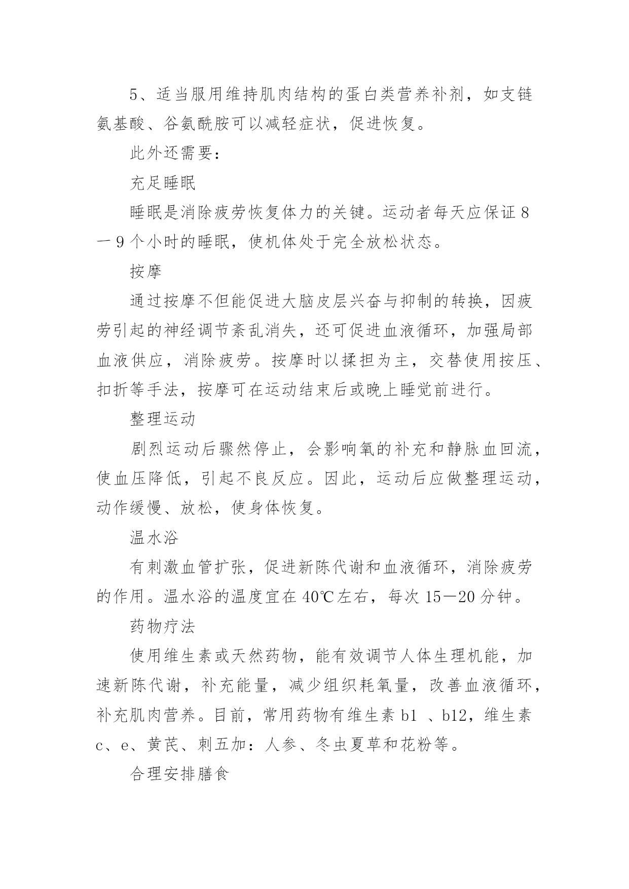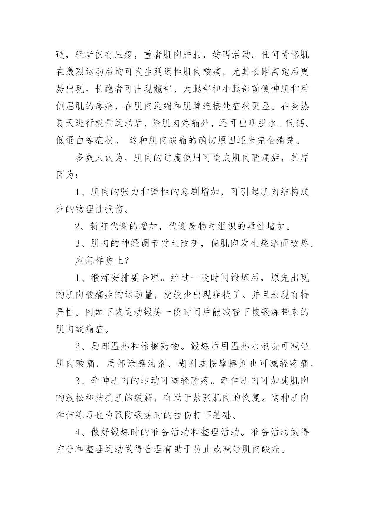 运动后的肌肉酸痛怎样缓解运动后的肌肉酸痛怎样缓解相信有很多朋友,在运动后会出现肌肉酸痛,为什么会这样呢?下面是小编整理的运动后的肌肉酸痛怎样缓解,希望能帮到你!肌肉酸痛的原因:时不经常锻炼的人,参加比较剧烈的运动以后,局部肌肉有时产生酸痛现象,产生这种现象的原因,通常认为与肌肉内部的能量代谢有关系。肌肉酸痛是正常的生理表现。人们往往在力量训练或一个不太适应(运动量偏大或新的运动项目)的练习后,会产生明显的肌肉酸痛和不适。而这些症状在休息一段时间后会自然消失,当再次进行同样的运动时,肌肉酸痛症状会明显减轻或不产生。许多人参加锻炼后发现,肌肉酸痛往往不是锻炼后即刻出现,而是在第二或第三天出现,持续2—3天后才逐渐缓解。如果说,肌肉酸痛是由于运动时乳酸积累所致,那么,应该在运动时或运动后即刻达到高峰,怎么会在第二天以后才出现呢?这种肌肉酸痛是什么原因引起的呢?应怎样减轻或防止呢?这种一般在锻炼后24小时后出现的肌肉酸痛在运动医学上称为“延迟性肌肉酸痛症”。锻炼后24—72小时酸痛达到顶点,5—7天后的疼痛基本消失。除酸痛外,还有肌肉僵硬,轻者仅有压疼,重者肌肉肿胀,妨碍活动。任何骨骼肌在激烈运动后均可发生延迟性肌肉酸痛,尤其长距离跑后更易出现。长跑者可出现髋部、大腿部和小腿部前侧伸肌和后侧屈肌的疼痛,在肌肉远端和肌腱连接处症状更显。在炎热夏天进行极量运动后,除肌肉疼痛外,还可出现脱水、低钙、低蛋白等症状。这种肌肉酸痛的确切原因还未完全清楚。多数人认为,肌肉的过度使用可造成肌肉酸痛症,其原因为:1、肌肉的张力和弹性的急剧增加,可引起肌肉结构成分的物理性损伤。2、新陈代谢的增加,代谢废物对组织的毒性增加。3、肌肉的神经调节发生改变,使肌肉发生痉挛而致疼。应怎样防止?1、锻炼安排要合理。经过一段时间锻炼后,原先出现的肌肉酸痛症的运动量,就较少出现症状了。并且表现有特异性。例如下坡运动锻炼一段时间后能减轻下坡锻炼带来的肌肉酸痛症。2、局部温热和涂擦药物。锻炼后用温热水泡洗可减轻肌肉酸痛。局部涂擦油剂、糊剂或按摩擦剂也可减轻疼痛。3、牵伸肌肉的运动可减轻酸疼。牵伸肌肉可加速肌肉的放松和拮抗肌的缓解,有助于紧张肌肉的恢复。这种肌肉牵伸练习也为预防锻炼时的拉伤打下基础。4、做好锻炼时的准备活动和整理活动。准备活动做得充分和整理运动做得合理有助于防止或减轻肌肉酸痛。5、适当服用维持肌肉结构的蛋白类营养补剂,如支链氨基酸、谷氨酰胺可以减轻症状,促进恢复。此外还需要:充足睡眠睡眠是消除疲劳恢复体力的关键。运动者每天应保证8一9个小时的睡眠,使机体处于完全放松状态。按摩通过按摩不但能促进大脑皮层兴奋与抑制的转换,因疲劳引起的神经调节紊乱消失,还可促进血液循环,加强局部血液供应,消除疲劳。按摩时以揉担为主,交替使用按压、扣折等手法,按摩可在运动结束后或晚上睡觉前进行。整理运动剧烈运动后骤然停止,会影响氧的补充和静脉血回流,使血压降低,引起不良反应。因此,运动后应做整理运动,动作缓慢、放松,使身体恢复。温水浴有刺激血管扩张,促进新陈代谢和血液循环,消除疲劳的作用。温水浴的温度宜在40℃左右,每次15-20分钟。药物疗法使用维生素或天然药物,能有效调节人体生理机能,加速新陈代谢,补充能量,减少组织耗氧量,改善血液循环,补充肌肉营养。目前,常用药物有维生素b1、b12,维生素c、e、黄芪、刺五加:人参、冬虫夏草和花粉等。合理安排膳食疲劳时应注意补充能量和维生素,尤其是糖,维生素c及b1,应选吃富有营养和易于消化的食品,多吃新鲜蔬菜、水果。