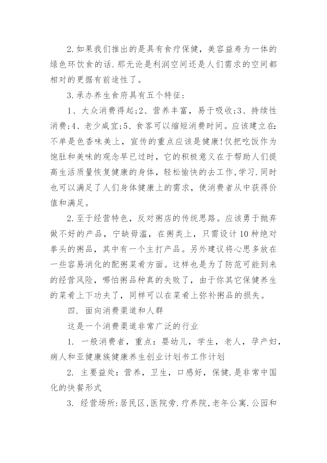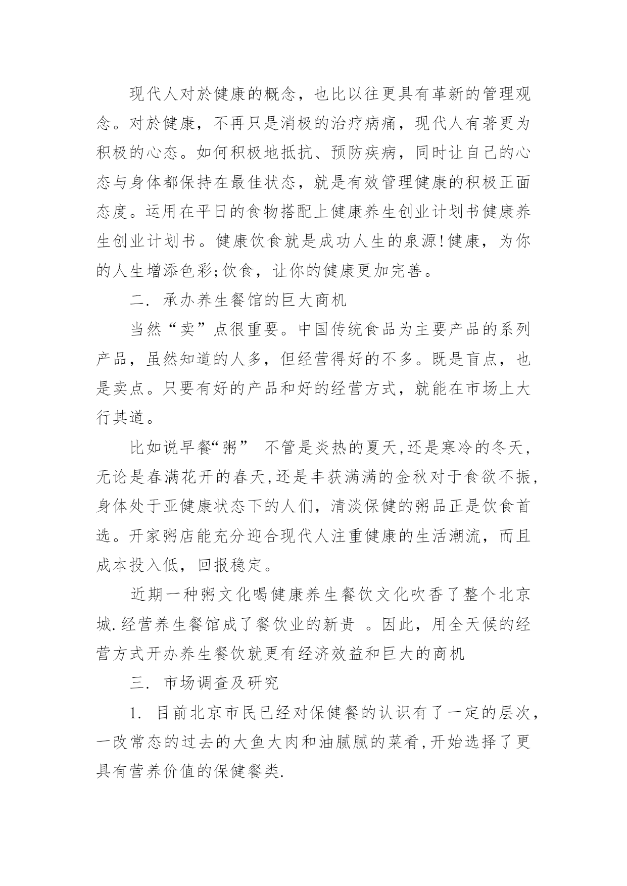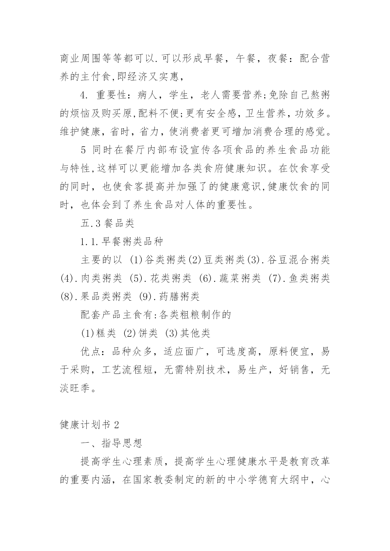 健康计划书健康计划书15篇日子如同白驹过隙,不经意间,相信大家对即将到来的工作生活满心期待吧!现在就让我们好好地规划一下吧。那么计划怎么拟定才能发挥它最大的作用呢?以下是小编为大家收集的健康计划书,希望对大家有所帮助。健康计划书1前言民众就餐饮食存在的几个问题北京市商委对城区住户在1000户以上社区进行调查发现,市民中不吃早餐或在家吃早餐的人数仅占调查人数的1/3,有2/3的人经常要在外面吃早餐,其中有70%的市民对早餐市场不满意。另则,北京流动人口大,白领阶层多形成了巨大的在外就餐游击队.每个人都想用健康的身体来拥抱新的一天,这时你就要有一个健康的饮食方式,,很多人午饭,甚至晚餐都在外面打游击,杂七杂八的饮食长期下来,至少会埋下身体疾病的很多隐患。象胃病,肠道疾病,肝炎,心血管疾病等等1.1早餐:。忙碌的生活环境,让人们忽略了早餐的重要性,目前在外面售卖的早餐通常为了讨好口味而放弃营养,无营养早餐是健康头号敌人,早晨的第一餐也是营养摄取最关键的一餐。均衡的营养可为一天补充体力并带来活力,早餐要吃饱,吃健康,就可以保证身体和大脑活动所需要的能量,都市人们由于工作性质的关系,经常忙或是没时间往往吃不上早餐,空腹感令人没有活力,头脑运作迟缓,对肠胃也会受影响,因而,也会导致身体免疫力的降低。因此,营养丰富,富含高分子碳水化合物和膳食纤维,独特的水溶性纤维Beta葡聚糖延长碳水化合物的消化时间,不仅能持续稳定地提供能量,更能带来一天都充沛的精力1.2.目前早餐尚有很多不利于人体健康的因素针对北京人的饮食习惯,过去老北京的早点都是些油条,抄肝,豆浆,豆脑.大米.小米粥.馅饼包子混沌等为主.象豆浆,豆脑.大米.小米粥,包子等都是不错的早餐,但制作质量和卫生普遍存在很大的问题.还有就是含油脂和含胆固醇很高的油条与抄肝相对来讲也逊色了很多.摄取营养的早餐摆脱妨碍健康的克星,营养健康的早餐要有足够的碳水化合物,膳食纤维及蛋白质,所以怎样慎选营养、快捷、美味、又方便的`早餐成了当今餐饮业的重点.当下,有几百种实用粥谱可供借鉴和选择.例如:向目前北京最叫响的十米粥,无论是对老年的三高,还是对其他人群的保健养生,作为预防疾病,调理疾病,效果都很不错.养生早餐粥,无疑符合人们这种需求。这种强烈的需求同时也开启了巨大商机2.1.午餐:一般来讲人在午餐中所吸收的营养占了每天营养来源的三分之一。现代人对於健康的概念,也比以往更具有革新的管理观念。对於健康,不再只是消极的治疗病痛,现代人有著更为积极的心态。如何积极地抵抗、预防疾病,同时让自己的心态与身体都保持在最佳状态,就是有效管理健康的积极正面态度。运用在平日的食物搭配上健康养生创业计划书健康养生创业计划书。健康饮食就是成功人生的泉源!健康,为你的人生增添色彩;饮食,让你的健康更加完善。二.承办养生餐馆的巨大商机当然“卖”点很重要。中国传统食品为主要产品的系列产品,虽然知道的人多,但经营得好的不多。既是盲点,也是卖点。只要有好的产品和好的经营方式,就能在市场上大行其道。比如说早餐“粥”不管是炎热的夏天,还是寒冷的冬天,无论是春满花开的春天,还是丰获满满的金秋对于食欲不振,身体处于亚健康状态下的人们,清淡保健的粥品正是饮食首选。开家粥店能充分迎合现代人注重健康的生活潮流,而且成本投入低,回报稳定。近期一种粥文化喝健康养生餐饮文化吹香了整个北京城.经营养生餐馆成了餐饮业的新贵。因此,用全天候的经营方式开办养生餐饮就更有经济效益和巨大的商机三.市场调查及研究1.目前北京市民已经对保健餐的认识有了一定的层次,一改常态的过去的大鱼大肉和油腻腻的菜肴,开始选择了更具有营养价值的保健餐类.2.如果我们推出的是具有食疗保健,美容益寿为一体的绿色环饮食的话.那无论是利润空间还是人们需求的空间都相对的更据有前途性了。3.承办养生食府具有五个特征:1、大众消费得起;2、营养丰富,易于吸收;3、持续性消费;4、老少咸宜;5、食客可以缩短消费时间。应该建立在:不单是色香味美上,宣传的重点应该是健康!仅把吃饭作为饱肚和美味的观念早已过时,它的积极意义在于帮助人们提高生活质量恢复健康的身体,轻松愉快的去工作,学习.同时也可以满足了人们身体健康上的需求,使消费者从中获得价值和满足。2.至于经营特色,反对粥店的传统思路。应该勇于抛弃做不好的产品,宁缺毋滥,在粥类上,只需设计10种绝对拳头的粥品,其中有一个主打产品。另外建议将心思多放在一些容易消化的配粥菜肴方面。这样也是为了防范可能到来的经营风险,哪怕粥品种真的失败了,由于你其它保健养生的菜肴上下功夫了,同样可以在菜肴上弥补粥品的损失。四.面向消费渠道和人群这是一个消费渠道非常广泛的行业1.一般消费者,重点:婴幼儿,学生,老人,孕产妇,病人和亚健康族健康养生创业计划书工作计划2.主要益