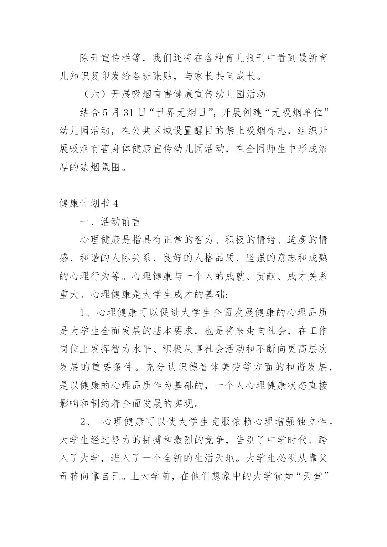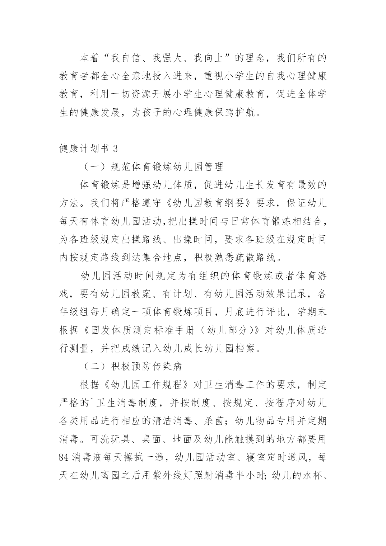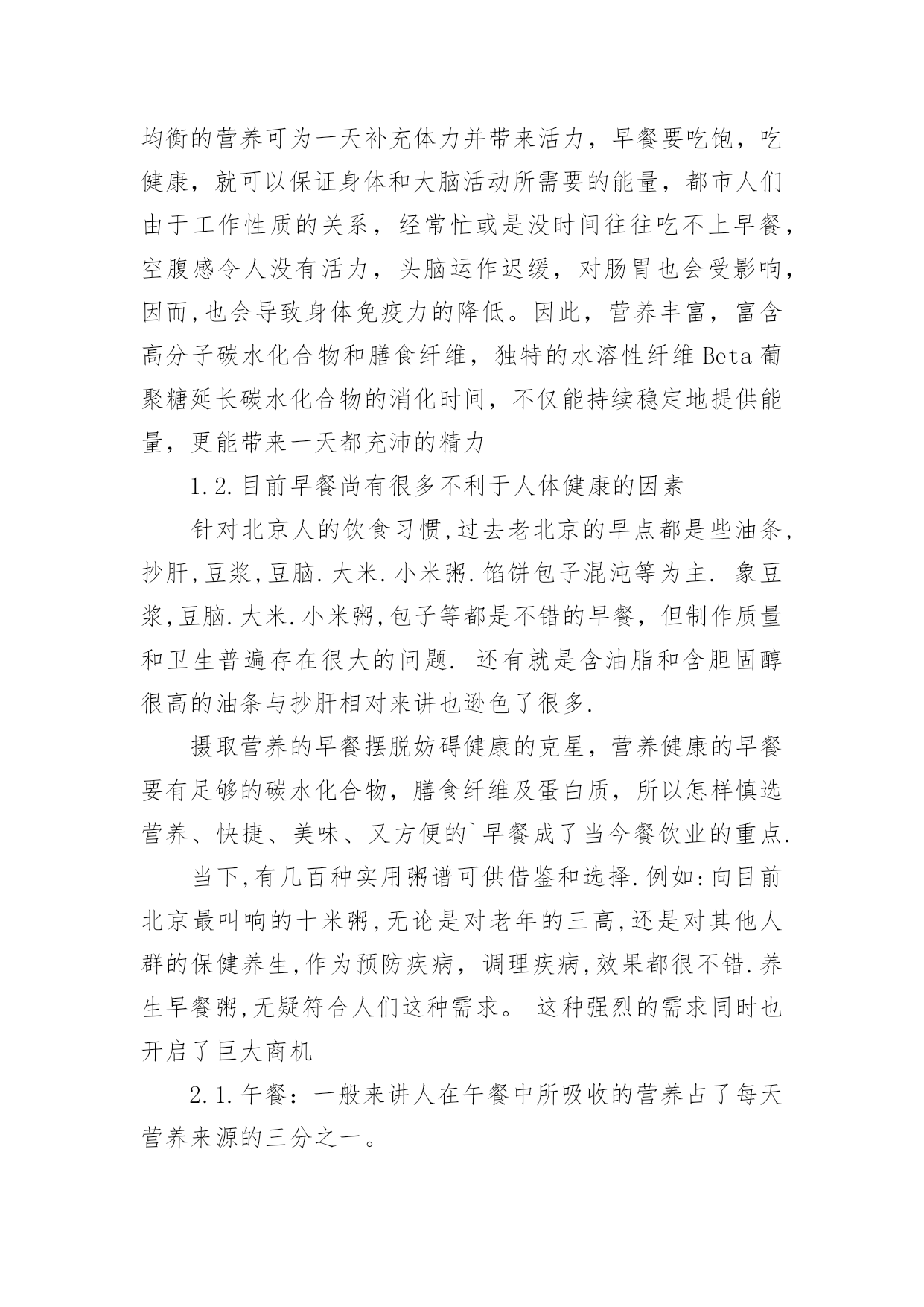 健康计划书健康计划书15篇日子如同白驹过隙,不经意间,相信大家对即将到来的工作生活满心期待吧!现在就让我们好好地规划一下吧。那么计划怎么拟定才能发挥它最大的作用呢?以下是小编为大家收集的健康计划书,希望对大家有所帮助。健康计划书1前言民众就餐饮食存在的几个问题北京市商委对城区住户在1000户以上社区进行调查发现,市民中不吃早餐或在家吃早餐的人数仅占调查人数的1/3,有2/3的人经常要在外面吃早餐,其中有70%的市民对早餐市场不满意。另则,北京流动人口大,白领阶层多形成了巨大的在外就餐游击队.每个人都想用健康的身体来拥抱新的一天,这时你就要有一个健康的饮食方式,,很多人午饭,甚至晚餐都在外面打游击,杂七杂八的饮食长期下来,至少会埋下身体疾病的很多隐患。象胃病,肠道疾病,肝炎,心血管疾病等等1.1早餐:。忙碌的生活环境,让人们忽略了早餐的重要性,目前在外面售卖的早餐通常为了讨好口味而放弃营养,无营养早餐是健康头号敌人,早晨的第一餐也是营养摄取最关键的一餐。均衡的营养可为一天补充体力并带来活力,早餐要吃饱,吃健康,就可以保证身体和大脑活动所需要的能量,都市人们由于工作性质的关系,经常忙或是没时间往往吃不上早餐,空腹感令人没有活力,头脑运作迟缓,对肠胃也会受影响,因而,也会导致身体免疫力的降低。因此,营养丰富,富含高分子碳水化合物和膳食纤维,独特的水溶性纤维Beta葡聚糖延长碳水化合物的消化时间,不仅能持续稳定地提供能量,更能带来一天都充沛的精力1.2.目前早餐尚有很多不利于人体健康的因素针对北京人的饮食习惯,过去老北京的早点都是些油条,抄肝,豆浆,豆脑.大米.小米粥.馅饼包子混沌等为主.象豆浆,豆脑.大米.小米粥,包子等都是不错的早餐,但制作质量和卫生普遍存在很大的问题.还有就是含油脂和含胆固醇很高的油条与抄肝相对来讲也逊色了很多.摄取营养的早餐摆脱妨碍健康的克星,营养健康的早餐要有足够的碳水化合物,膳食纤维及蛋白质,所以怎样慎选营养、快捷、美味、又方便的`早餐成了当今餐饮业的重点.当下,有几百种实用粥谱可供借鉴和选择.例如:向目前北京最叫响的十米粥,无论是对老年的三高,还是对其他人群的保健养生,作为预防疾病,调理疾病,效果都很不错.养生早餐粥,无疑符合人们这种需求。这种强烈的需求同时也开启了巨大商机2.1.午餐:一般来讲人在午餐中所吸收的营养占了每天营养来源的三分之一。现代人对於健康的概念,也比以往更具有革新的管理观念。对於健康,不再只是消极的治疗病痛,现代人有著更为积极的心态。如何积极地抵抗、预防疾病,同时让自己的心态与身体都保持在最佳状态,就是有效管理健康的积极正面态度。运用在平日的食物搭配上健康养生创业计划书健康养生创业计划书。健康饮食就是成功人生的泉源!健康,为你的人生增添色彩;饮食,让你的健康更加完善。二.承办养生餐馆的巨大商机当然“卖”点很重要。中国传统食品为主要产品的系列产品,虽然知道的人多,但经营得好的不多。既是盲点,也是卖点。只要有好的产品和好的经营方式,就能在市场上大行其道。比如说早餐“粥”不管是炎热的夏天,还是寒冷的冬天,无论是春满花开的春天,还是丰获满满的金秋对于食欲不振,身体处于亚健康状态下的人们,清淡保健的粥品正是饮食首选。开家粥店能充分迎合现代人注重健康的生活潮流,而且成本投入低,回报稳定。近期一种粥文化喝健康养生餐饮文化吹香了整个北京城.经营养生餐馆成了餐饮业的新贵。因此,用全天候的经营方式开办养生餐饮就更有经济效益和巨大的商机三.市场调查及研究1.目前北京市民已经对保健餐的认识有了一定的层次,一改常态的过去的大鱼大肉和油腻腻的菜肴,开始选择了更具有营养价值的保健餐类.2.如果我们推出的是具有食疗保健,美容益寿为一体的绿色环饮食的话.那无论是利润空间还是人们需求的空间都相对的更据有前途性了。3.承办养生食府具有五个特征:1、大众消费得起;2、营养丰富,易于吸收;3、持续性消费;4、老少咸宜;5、食客可以缩短消费时间。应该建立在:不单是色香味美上,宣传的重点应该是健康!仅把吃饭作为饱肚和美味的观念早已过时,它的积极意义在于帮助人们提高生活质量恢复健康的身体,轻松愉快的去工作,学习.同时也可以满足了人们身体健康上的需求,使消费者从中获得价值和满足。2.至于经营特色,反对粥店的传统思路。应该勇于抛弃做不好的产品,宁缺毋滥,在粥类上,只需设计10种绝对拳头的粥品,其中有一个主打产品。另外建议将心思多放在一些容易消化的配粥菜肴方面。这样也是为了防范可能到来的经营风险,哪怕粥品种真的失败了,由于你其它保健养生的菜肴上下功夫了,同样可以在菜肴上弥补粥品的损失。四.面向消费渠道和人群这是一个消费渠道非常广泛的行业1.一般消费者,重点:婴幼儿,学生,老人,孕产妇,病人和亚健康族健康养生创业计划书工作计划2.主要益