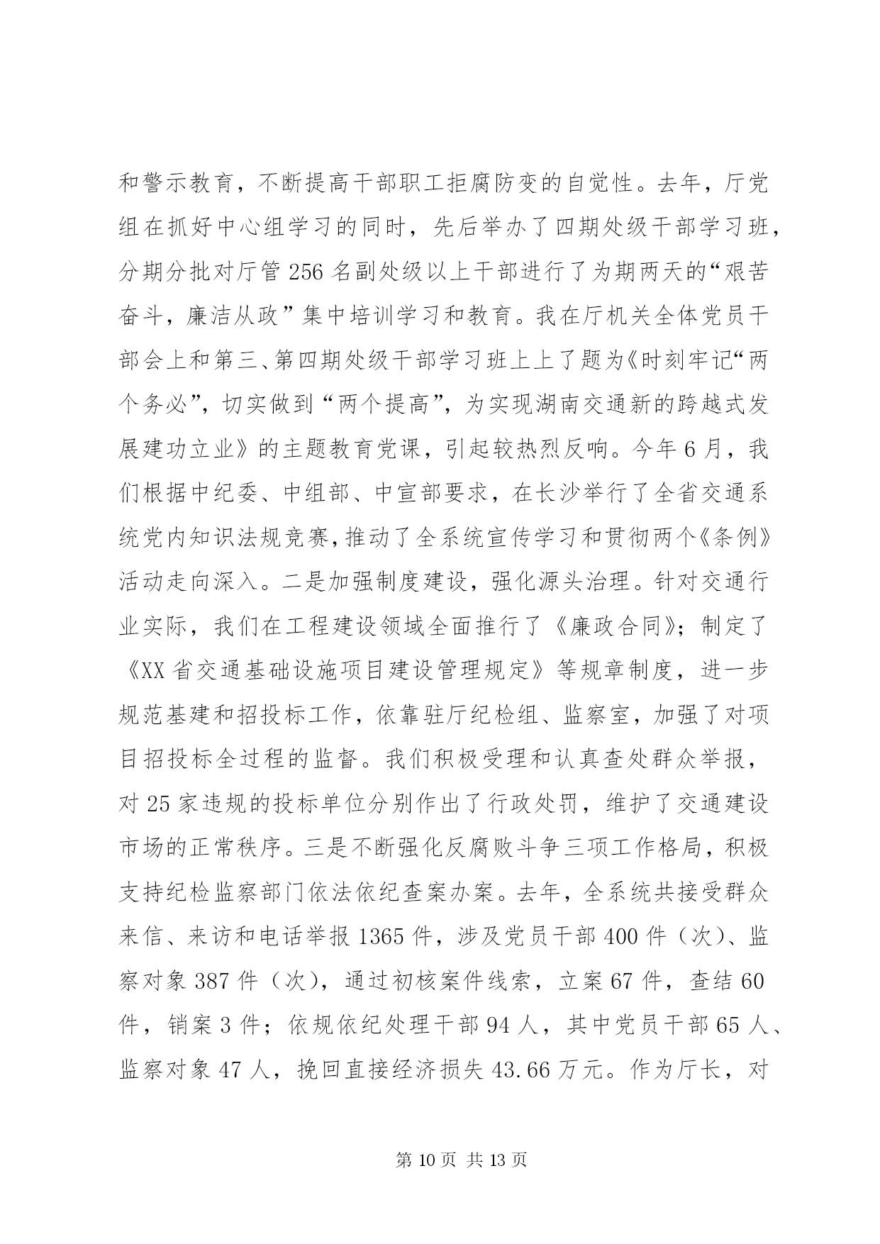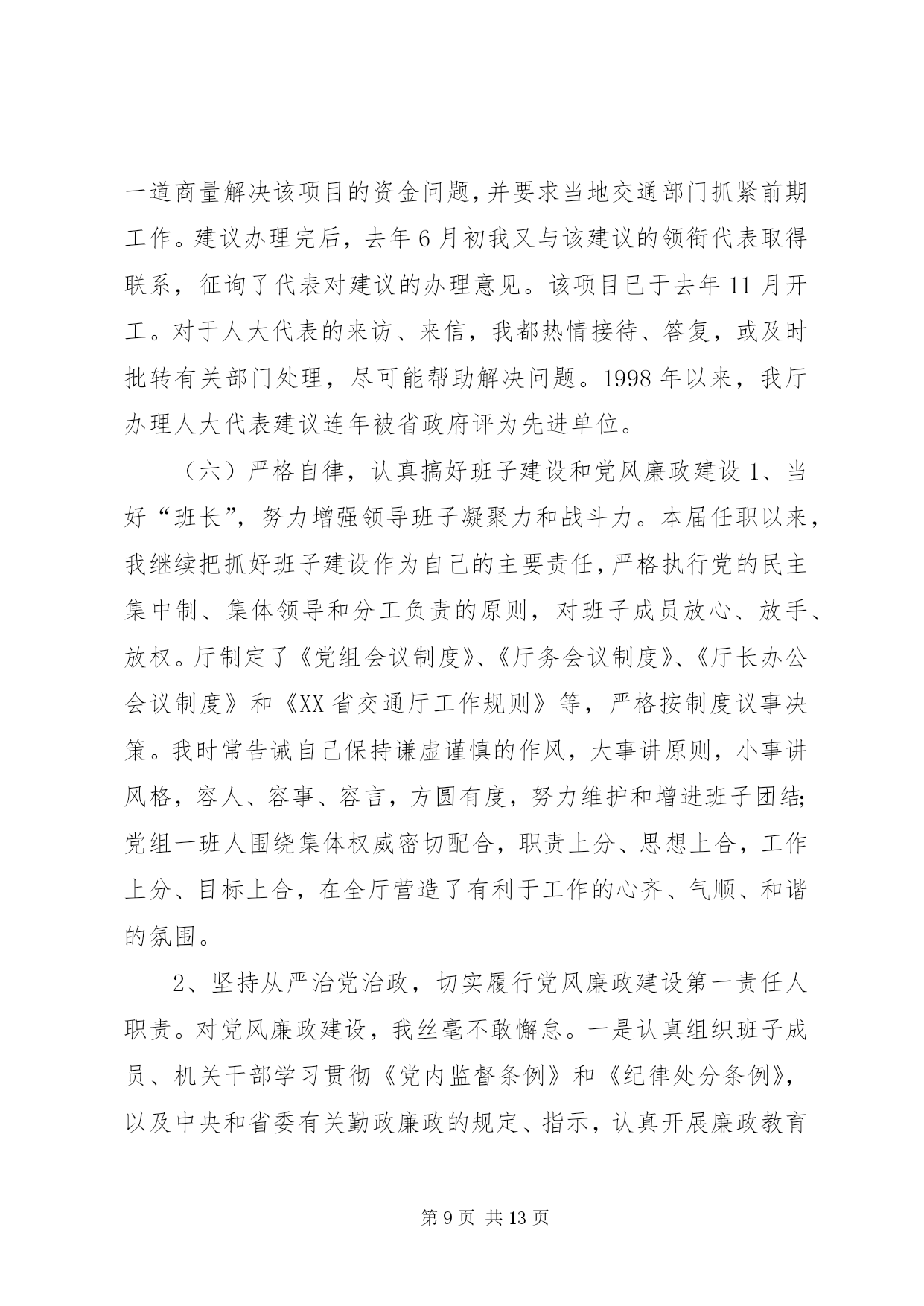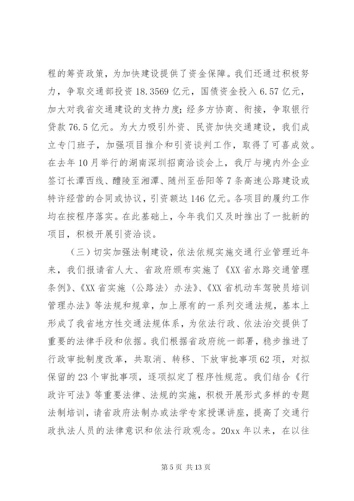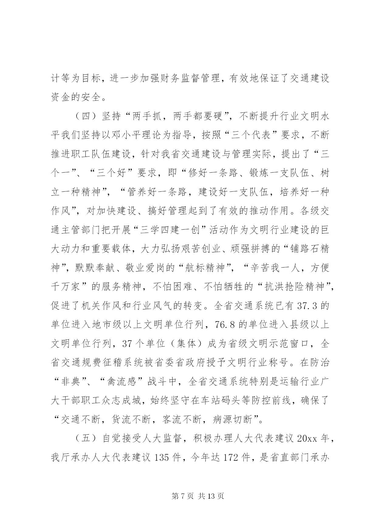 第PAGE\*Arabic\*MERGEFORMAT13页共NUMPAGES\*MERGEFORMAT13页交通厅厅长述职报告述职报告——在厅机关全体干部和厅直单位负责同志会议上各位领导、评议调查组的各位委员和代表、同志们:省十届人大常委会决定对我进行述职评议,既是对交通工作的高度重视与支持,也是对我个人的极大关心和鞭策。按照述职评议的要求,今天我首先向厅机关全体干部、离退休老同志和厅直单位负责同志把我本届任职以来的主要工作述职汇报如下,请大家提出宝贵意见。一、任职以来的主要工作20xx年3月,省十届人大常委会第一次会议任命我继续担任省交通厅厅长,我深感这既是对我的信任,又责任重大。作为一名“老交通”,我在就职时曾郑重表示,要以“结缘交通终不悔,甘为发展勤耕耘”自勉,把握“四心”(即:树立信心,始终保持奋发有为的精神状态;突出中心,切实抓好发展第一要务;凝聚民心,充分调动各种积极因素;强化核心,不断加强各级班子建设),努力把工作做得更好。一年多来,在省委、省人大、省政府、省政协的正确领导和省直各部门的大力支持下,我和党组“一班人”坚持以邓小平理论为指导,认真践行“三个代表”,牢记“两个务必”,坚持“执政为民”,切实履行职责,团结带领全厅和全省交通系统广大干部职工扎实工作,取得了一定的成绩。(一)树立科学发展观,努力推进交通事业新的跨越式发展本届工作,我们是在一个全新的环境、更高的起点上谋求发展。过去五年里,我省交通职工群策群力,用较短时间,使全省高速公路突破了千公里,公路、航道技术等级和整体服务水平提高,水陆运输结构逐步改善,整顿和规范运输市场工作取得阶段性成果,交通“瓶颈”制约初步缓解。这些成绩的取得,是省委、省人大、省政府、省政协和省直有关部门高度重视与支持的结果,是历代交通干部职工特别是老同志辛勤奉献打下的基础,是国家实行积极财政政策提供了机遇。为全面贯彻党的十六大精神,为全面建设小康社会当好先行,去年初,我们在充分调查研究的基础上,确定了本世纪头二十年交通新的跨越式发展目标。按照这一目标,全省交通系统广大干部职工求真务实,一心一意谋发展,20xx年共完成交通固定资产投资139.1亿元,比上年增长17,其中公路124.6亿元,港航5.9亿元,站场2.9亿元。衡枣高速公路、长潭高速公路路面改造、永连公路二期工程、张罗公路湘西段、长沙霞凝港区主体工程等重点项目相继完成;常张高速公路、株洲航电枢纽、常德至鲇鱼口航运工程等在建项目进展良好;衡大、邵怀、怀新和常吉高速公路先后开工;洞庭湖区畅通工程正式启动;造福于全省农村的县际及县到乡镇公路改造工程稳步推进,完成投资19.7亿元,完成路基改造3959公里,完成沥青(水泥)路面2178公里。到年底,全省新增公路426公里,公路总里程为85234公里,高速公路通车里程为1218公里,位列全国第九;二级以上公路为6859公里,比上年新增477公里。我们大力开展运输市场整顿,加快道路水路运输结构调整步伐,努力克服“非典”造成的影响,全年完成公路客运量9.04亿人,旅客周转量384.7亿人公里,分别为上年的98.6和99.90;完成货运量5.11亿吨,货物周转量455.4亿吨公里,分别为上年的118.97和128;完成水运客运量793万人,旅客周转量2.4亿人公里,分别为上年的63.5和75,完成货运量3600万吨,货物周转量121.7亿吨公里,分别为上年的95.7和89.8。交通安全形势保持了基本稳定。今年,我们以党的十六大和十六届三中全会精神为指针,树立科学发展观,把统筹协调好加快发展与量力而行、主骨架建设与路网及农村公路建设、建设质量与建设速度、加快建设与加强养护管理、基础设施建设与运输事业同步发展等关系作为交通工作重要内容。1-7月,全省交通基础设施建设完成投资60.61亿元,占年计划130亿元的46.6,为上年同期的138.4。其中高速公路完成28.3亿元,占年计划的37.5;面上项目完成4.2亿元,占年计划的52.5;被省政府列为“八件实事”之一的县际及县到乡镇公路改造和洞庭湖区桥梁畅通工程分别完成投资15.5亿元和9763万元,占年计划的67.22和58.4。广大建设者克服了物价上涨、洪涝水毁等困难,强化质量管理,狠抓施工进度,各在建重点项目进展顺利;醴陵至湘潭、长沙至湘潭西线高速公路先后开工;长沙至株洲、邵阳至永州、衡阳至炎陵等高速公路前期工作都在抓紧进行,力争年底开工。做好科学规划和前期工作对加快建设举足轻重。几年来,我们对各重点项目早作规划和前期工作安排,明确专门机构和人员负责落实。为加快进度,我多次带队到国家有关部委汇报,争取有关部委和咨询评估机构、银行的支持,力争新上项目按期或提前开工。去年以来,我们组织力量攻关,编制完成了《XX省与“泛珠三