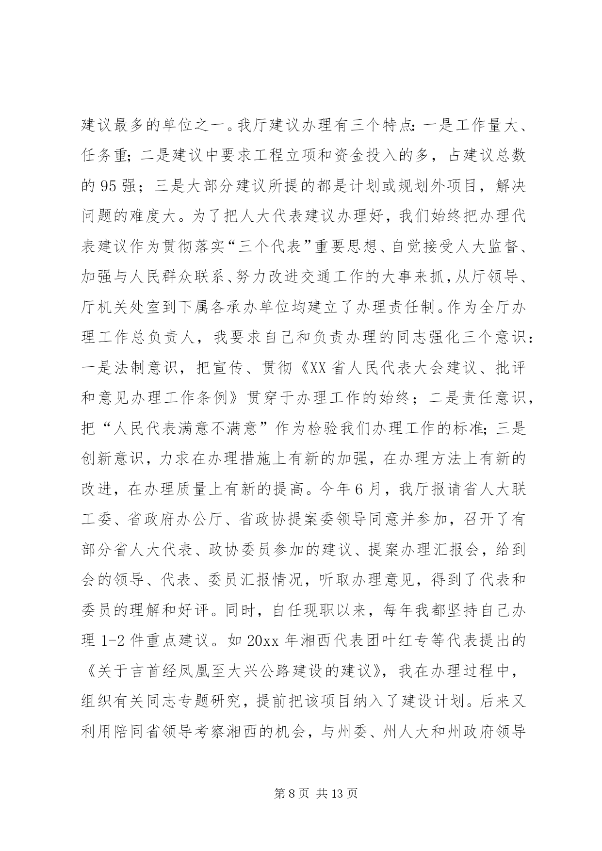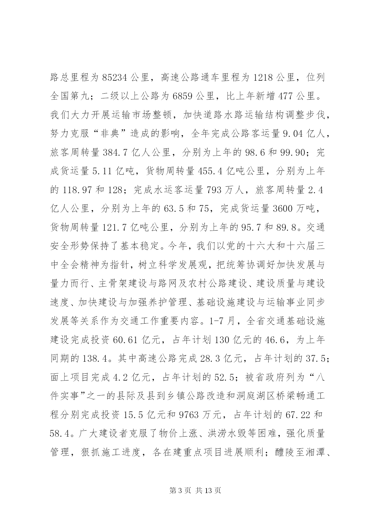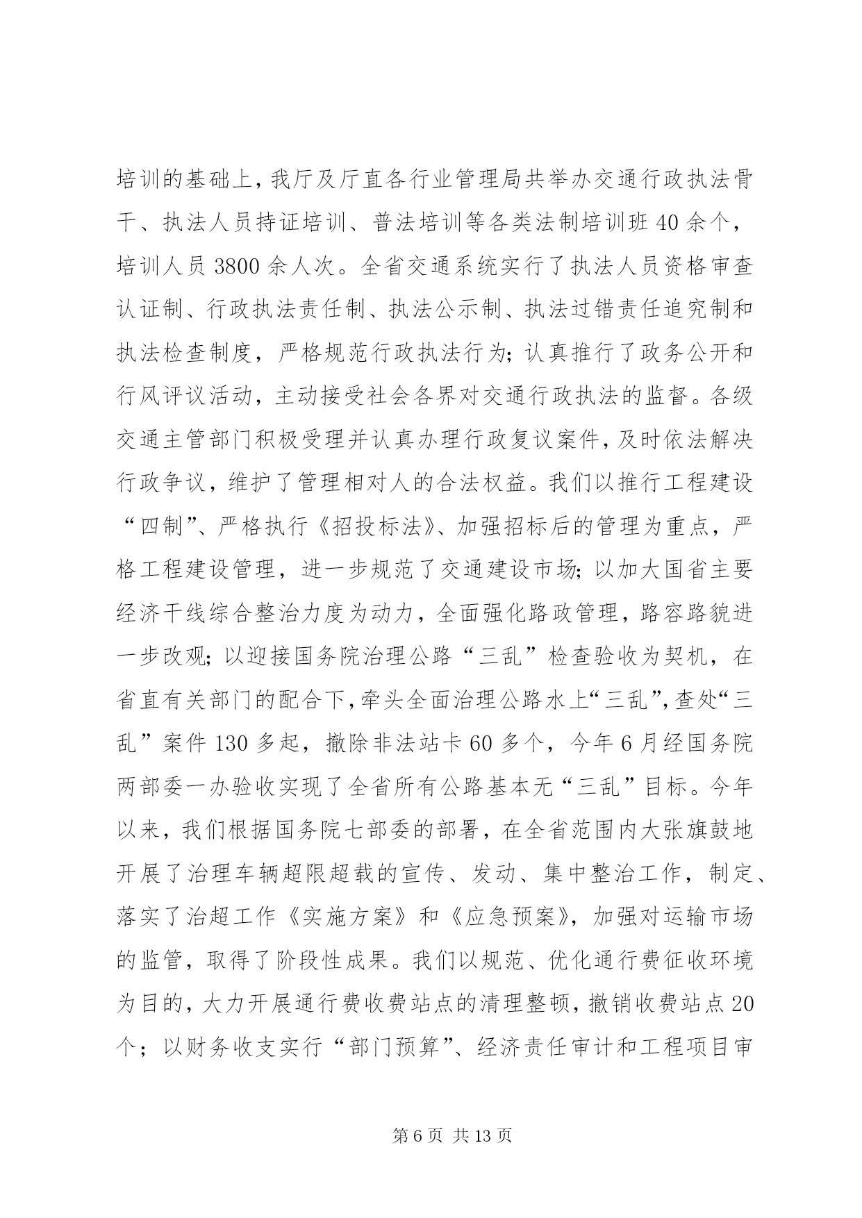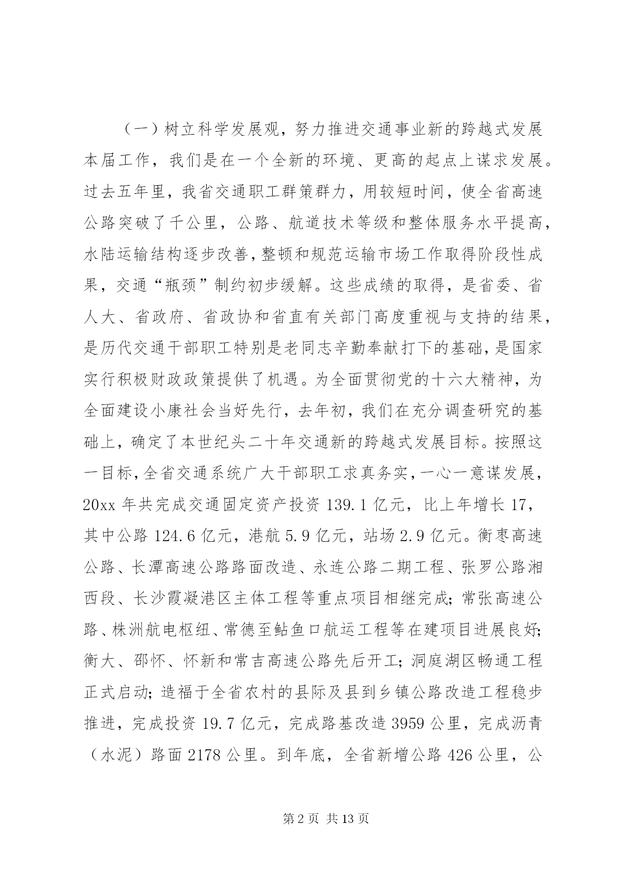 第PAGE\*Arabic\*MERGEFORMAT13页共NUMPAGES\*MERGEFORMAT13页交通厅厅长述职报告述职报告——在厅机关全体干部和厅直单位负责同志会议上各位领导、评议调查组的各位委员和代表、同志们:省十届人大常委会决定对我进行述职评议,既是对交通工作的高度重视与支持,也是对我个人的极大关心和鞭策。按照述职评议的要求,今天我首先向厅机关全体干部、离退休老同志和厅直单位负责同志把我本届任职以来的主要工作述职汇报如下,请大家提出宝贵意见。一、任职以来的主要工作20xx年3月,省十届人大常委会第一次会议任命我继续担任省交通厅厅长,我深感这既是对我的信任,又责任重大。作为一名“老交通”,我在就职时曾郑重表示,要以“结缘交通终不悔,甘为发展勤耕耘”自勉,把握“四心”(即:树立信心,始终保持奋发有为的精神状态;突出中心,切实抓好发展第一要务;凝聚民心,充分调动各种积极因素;强化核心,不断加强各级班子建设),努力把工作做得更好。一年多来,在省委、省人大、省政府、省政协的正确领导和省直各部门的大力支持下,我和党组“一班人”坚持以邓小平理论为指导,认真践行“三个代表”,牢记“两个务必”,坚持“执政为民”,切实履行职责,团结带领全厅和全省交通系统广大干部职工扎实工作,取得了一定的成绩。(一)树立科学发展观,努力推进交通事业新的跨越式发展本届工作,我们是在一个全新的环境、更高的起点上谋求发展。过去五年里,我省交通职工群策群力,用较短时间,使全省高速公路突破了千公里,公路、航道技术等级和整体服务水平提高,水陆运输结构逐步改善,整顿和规范运输市场工作取得阶段性成果,交通“瓶颈”制约初步缓解。这些成绩的取得,是省委、省人大、省政府、省政协和省直有关部门高度重视与支持的结果,是历代交通干部职工特别是老同志辛勤奉献打下的基础,是国家实行积极财政政策提供了机遇。为全面贯彻党的十六大精神,为全面建设小康社会当好先行,去年初,我们在充分调查研究的基础上,确定了本世纪头二十年交通新的跨越式发展目标。按照这一目标,全省交通系统广大干部职工求真务实,一心一意谋发展,20xx年共完成交通固定资产投资139.1亿元,比上年增长17,其中公路124.6亿元,港航5.9亿元,站场2.9亿元。衡枣高速公路、长潭高速公路路面改造、永连公路二期工程、张罗公路湘西段、长沙霞凝港区主体工程等重点项目相继完成;常张高速公路、株洲航电枢纽、常德至鲇鱼口航运工程等在建项目进展良好;衡大、邵怀、怀新和常吉高速公路先后开工;洞庭湖区畅通工程正式启动;造福于全省农村的县际及县到乡镇公路改造工程稳步推进,完成投资19.7亿元,完成路基改造3959公里,完成沥青(水泥)路面2178公里。到年底,全省新增公路426公里,公路总里程为85234公里,高速公路通车里程为1218公里,位列全国第九;二级以上公路为6859公里,比上年新增477公里。我们大力开展运输市场整顿,加快道路水路运输结构调整步伐,努力克服“非典”造成的影响,全年完成公路客运量9.04亿人,旅客周转量384.7亿人公里,分别为上年的98.6和99.90;完成货运量5.11亿吨,货物周转量455.4亿吨公里,分别为上年的118.97和128;完成水运客运量793万人,旅客周转量2.4亿人公里,分别为上年的63.5和75,完成货运量3600万吨,货物周转量121.7亿吨公里,分别为上年的95.7和89.8。交通安全形势保持了基本稳定。今年,我们以党的十六大和十六届三中全会精神为指针,树立科学发展观,把统筹协调好加快发展与量力而行、主骨架建设与路网及农村公路建设、建设质量与建设速度、加快建设与加强养护管理、基础设施建设与运输事业同步发展等关系作为交通工作重要内容。1-7月,全省交通基础设施建设完成投资60.61亿元,占年计划130亿元的46.6,为上年同期的138.4。其中高速公路完成28.3亿元,占年计划的37.5;面上项目完成4.2亿元,占年计划的52.5;被省政府列为“八件实事”之一的县际及县到乡镇公路改造和洞庭湖区桥梁畅通工程分别完成投资15.5亿元和9763万元,占年计划的67.22和58.4。广大建设者克服了物价上涨、洪涝水毁等困难,强化质量管理,狠抓施工进度,各在建重点项目进展顺利;醴陵至湘潭、长沙至湘潭西线高速公路先后开工;长沙至株洲、邵阳至永州、衡阳至炎陵等高速公路前期工作都在抓紧进行,力争年底开工。做好科学规划和前期工作对加快建设举足轻重。几年来,我们对各重点项目早作规划和前期工作安排,明确专门机构和人员负责落实。为加快进度,我多次带队到国家有关部委汇报,争取有关部委和咨询评估机构、银行的支持,力争新上项目按期或提前开工。去年以来,我们组织力量攻关,编制完成了《XX省与“泛珠三
