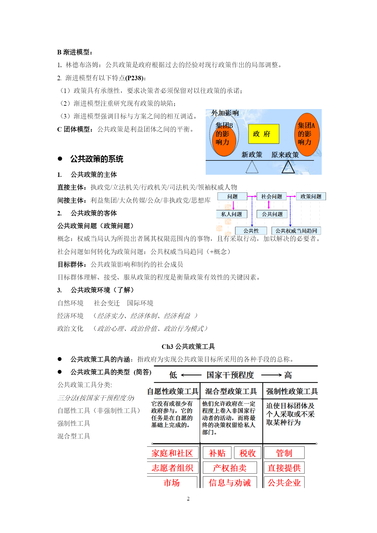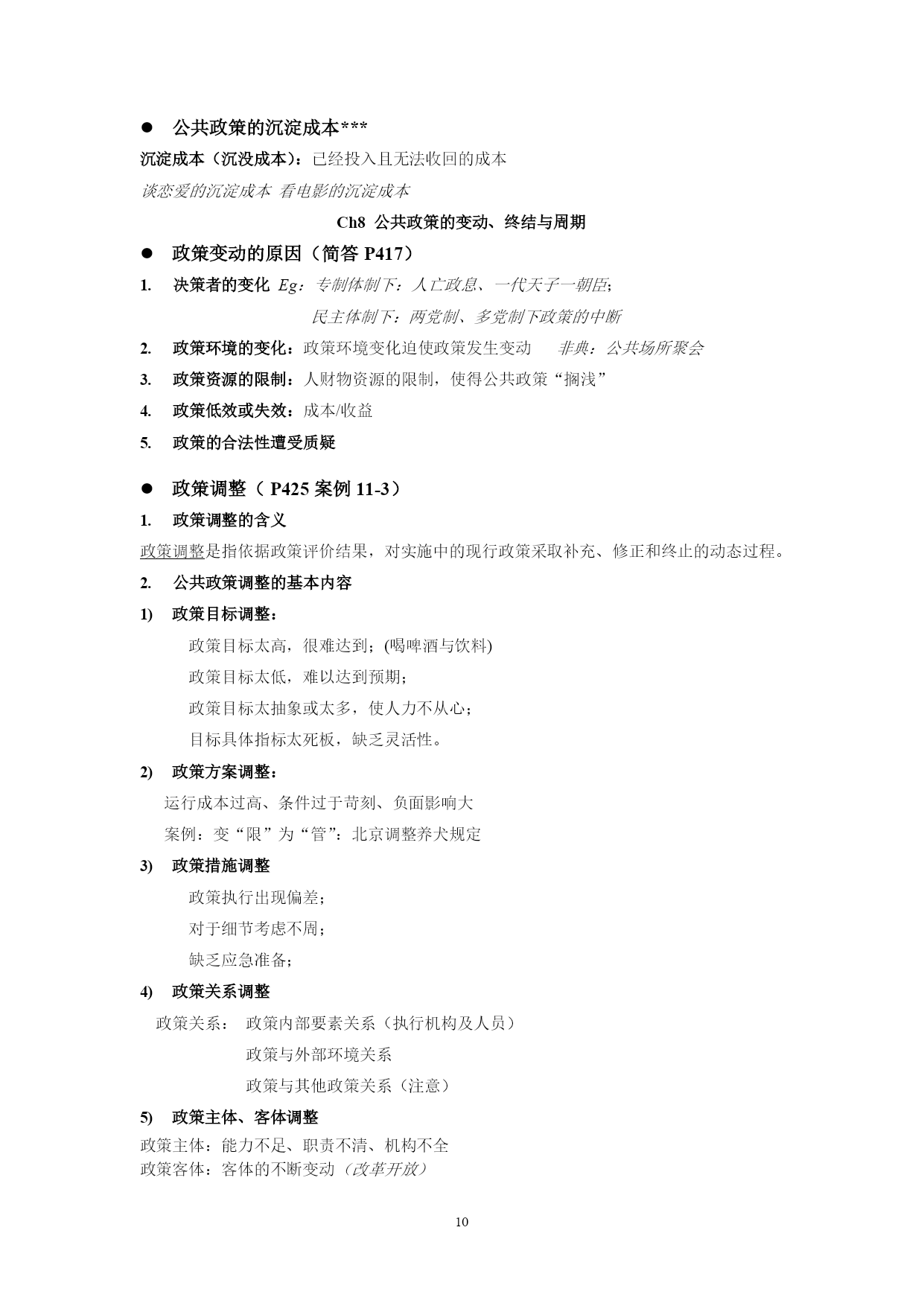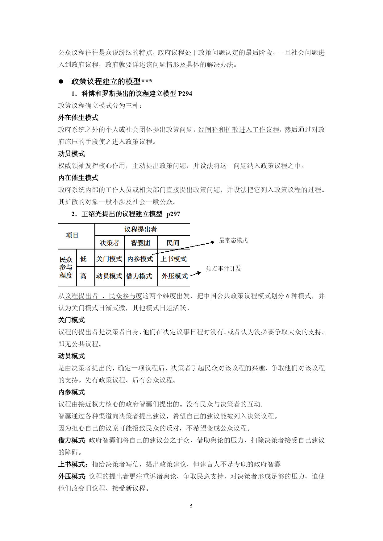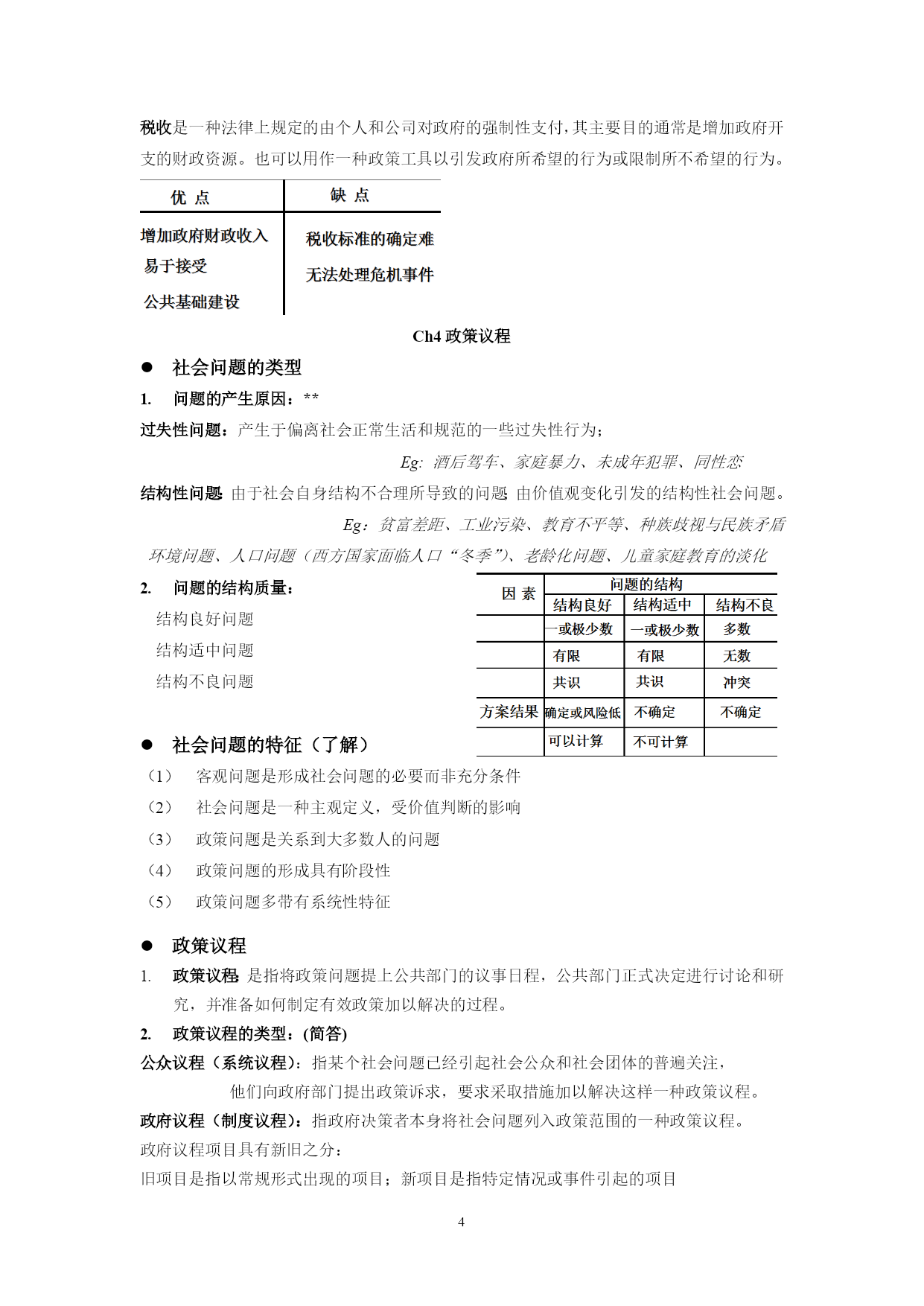 PAGE11Ch1.公共政策学案例1-1(书P4-6)辨析是否属于公共政策公共政策的功能(单选/简答P157)(1)引导功能:正向与负向(2)管制功能:对影响社会良性发展的不利因素进行管制与约束。如《杭州市公共场所控制吸烟条例》为消极性管制,还有突出正激励原则的积极性管制。(3)调控功能公共政策不仅需要指明人民应该做什么和不应该做什么,而且还需指明人民应该先做什么和后做什么。Eg:新农村建设,西部大开发分配功能公共政策分类(了解)1、实质性政策和程序性政策实质性政策与政府将要采取的行动有关;程序性政策只涉及采取行动和由谁来采取行动的问题。2、分配性政策和再分配性政策分配性政策一般只产生得利者,而没有明确的受损者;再分配性政策涉及社会各阶层和团体中财富、收入和权利的转移分配。例如,累进收入税、养老退休金额度的重新分配),美国的“反贫困”计划。3、管制性政策和自我管制性政策如广播、电视、煤炭、电力等特殊行业兼具自我管制政策的性质。4、物质性政策和象征性政策最低工资标准、经济适用房政策、农民收入补贴政策等设立教师节、环境政策5、涉公政策和涉私政策国防是典型的涉公政策而垃圾收集、邮政服务、医疗卫生、养老保障等也带有一些私人物品的特征。Ch.2公共政策的理论模型与公共政策系统公共政策理论模型A**过程模型(P235):1.公共政策的阶段性2,公共政策是一个动态过程B渐进模型:1.林德布洛姆:公共政策是政府根据过去的经验对现行政策作出的局部调整。2.渐进模型有以下特点(P238):(1)政策具有承继性,要求决策者必须保留对以往政策的承诺;(2)渐进模型注重研究现有政策的缺陷;(3)渐进模型强调目标与方案之间的相互调适。C团体模型:公共政策是利益团体之间的平衡。公共政策的系统公共政策的主体直接主体:执政党/立法机关/行政机关/司法机关/领袖权威人物间接主体:利益集团/大众传媒/公众/非执政党/思想库公共政策的客体公共政策问题(政策问题)概念:权威当局认为所提出者属其权限范围内的事物,且有采取行动,加以解决的必要者。社会问题如何转化为政策问题:公共权威当局趋同(+概念)目标群体:公共政策影响和制约的社会成员目标群体理解、接受、服从政策的程度是衡量政策有效性的关键因素。公共政策环境(了解)自然环境社会变迁国际环境经济环境(经济实力、经济体制、经济利益)政治文化(政治心理、政治价值、政治行为模式)Ch3公共政策工具公共政策工具的内涵:指政府为实现公共政策目标所采用的各种手段的总称。公共政策工具的类型(简答)公共政策工具分类:三分法(按国家干预程度分)自愿性工具(非强制性工具)强制性工具混合型工具以下出辨析或选择管制:政府通过制定规则或法令,对个人和组织行为进行限制与调控。大部分管制通过行政法规来进行,并由政府部门或者特别的机构来管理。管制采取了不同的形式,如规章、标准、许可、禁止、法律秩序和执行程序等政府管制有经济的和社会的两种基本类型公共企业(国有企业):公有所有权或政府控股51%以上;政府可以控制企业的经营权和人事权;以营利为目的。直接提供:政府直接履行公共职能,解决公共问题。如:国防、外交、警察、消防、教育、社会保障、公园、道路维修等均采取了这一途径或办法。补贴:是指各种由政府或由政府指导的机构给个人、公司及其社会团体的财政转移形式,目标是让得到资助者采取政府所希望发生的行为。注意:尽管最后的选择权留给受资助者,但采取所期望发生的行为的可能性因补贴而增加。补贴:形式主要有:拨款或补助、税收激励(如减税、免税、优惠等)、低息贷款。产权拍卖基于这样的假定:市场通常是最有效的配置工具,政府通过产权拍卖,在没有市场的公共物品和服务领域建立起市场。产权拍卖:典型的例子:排污权拍卖、机动车牌照拍卖、出租车运营证拍卖。税收是一种法律上规定的由个人和公司对政府的强制性支付,其主要目的通常是增加政府开支的财政资源。也可以用作一种政策工具以引发政府所希望的行为或限制所不希望的行为。Ch4政策议程社会问题的类型问题的产生原因:**过失性问题:产生于偏离社会正常生活和规范的一些过失性行为;Eg:酒后驾车、家庭暴力、未成年犯罪、同性恋结构性问题:由于社会自身结构不合理所导致的问题;由价值观变化引发的结构性社会问题。Eg:贫富差距、工业污染、教育不平等、种族歧视与民族矛盾环境问题、人口问题(西方国家面临人口“冬季”)、老龄化问题、儿童家庭教育的淡化问题的结构质量:结构良好问题结构适中问题结构不良问题社会问题的特征(了解)客观问题是形成社会问题的必要而非充分条