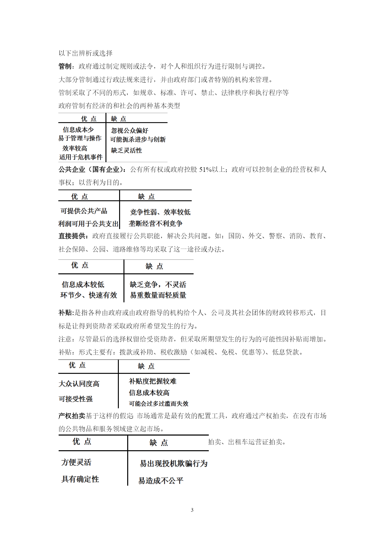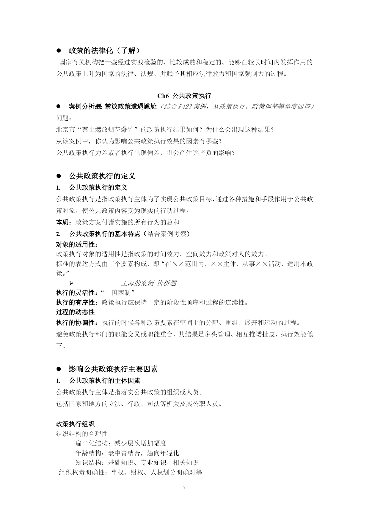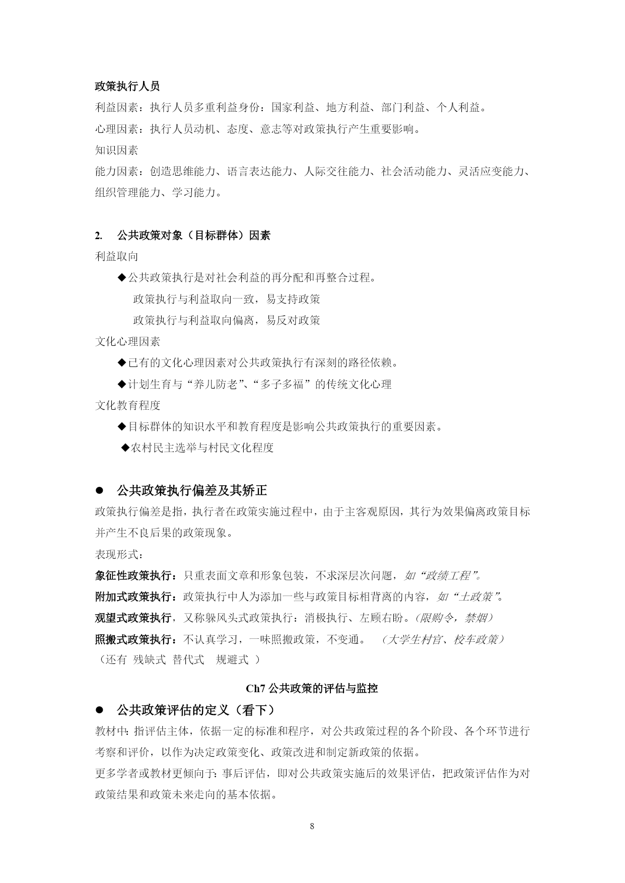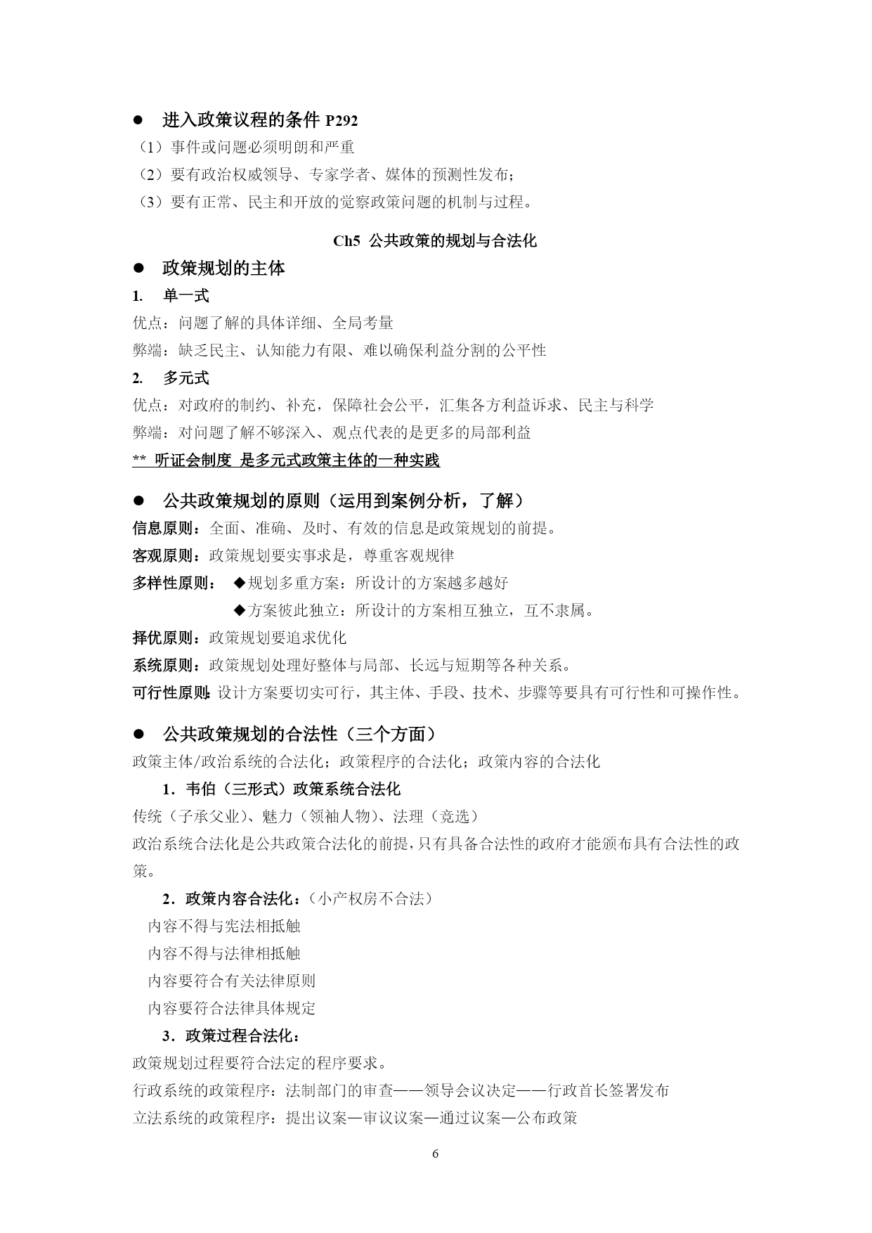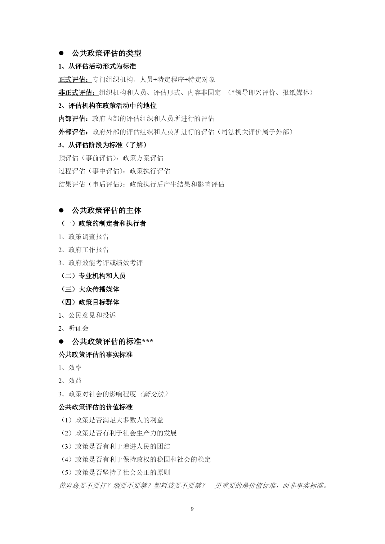 PAGE11Ch1.公共政策学案例1-1(书P4-6)辨析是否属于公共政策公共政策的功能(单选/简答P157)(1)引导功能:正向与负向(2)管制功能:对影响社会良性发展的不利因素进行管制与约束。如《杭州市公共场所控制吸烟条例》为消极性管制,还有突出正激励原则的积极性管制。(3)调控功能公共政策不仅需要指明人民应该做什么和不应该做什么,而且还需指明人民应该先做什么和后做什么。Eg:新农村建设,西部大开发分配功能公共政策分类(了解)1、实质性政策和程序性政策实质性政策与政府将要采取的行动有关;程序性政策只涉及采取行动和由谁来采取行动的问题。2、分配性政策和再分配性政策分配性政策一般只产生得利者,而没有明确的受损者;再分配性政策涉及社会各阶层和团体中财富、收入和权利的转移分配。例如,累进收入税、养老退休金额度的重新分配),美国的“反贫困”计划。3、管制性政策和自我管制性政策如广播、电视、煤炭、电力等特殊行业兼具自我管制政策的性质。4、物质性政策和象征性政策最低工资标准、经济适用房政策、农民收入补贴政策等设立教师节、环境政策5、涉公政策和涉私政策国防是典型的涉公政策而垃圾收集、邮政服务、医疗卫生、养老保障等也带有一些私人物品的特征。Ch.2公共政策的理论模型与公共政策系统公共政策理论模型A**过程模型(P235):1.公共政策的阶段性2,公共政策是一个动态过程B渐进模型:1.林德布洛姆:公共政策是政府根据过去的经验对现行政策作出的局部调整。2.渐进模型有以下特点(P238):(1)政策具有承继性,要求决策者必须保留对以往政策的承诺;(2)渐进模型注重研究现有政策的缺陷;(3)渐进模型强调目标与方案之间的相互调适。C团体模型:公共政策是利益团体之间的平衡。公共政策的系统公共政策的主体直接主体:执政党/立法机关/行政机关/司法机关/领袖权威人物间接主体:利益集团/大众传媒/公众/非执政党/思想库公共政策的客体公共政策问题(政策问题)概念:权威当局认为所提出者属其权限范围内的事物,且有采取行动,加以解决的必要者。社会问题如何转化为政策问题:公共权威当局趋同(+概念)目标群体:公共政策影响和制约的社会成员目标群体理解、接受、服从政策的程度是衡量政策有效性的关键因素。公共政策环境(了解)自然环境社会变迁国际环境经济环境(经济实力、经济体制、经济利益)政治文化(政治心理、政治价值、政治行为模式)Ch3公共政策工具公共政策工具的内涵:指政府为实现公共政策目标所采用的各种手段的总称。公共政策工具的类型(简答)公共政策工具分类:三分法(按国家干预程度分)自愿性工具(非强制性工具)强制性工具混合型工具以下出辨析或选择管制:政府通过制定规则或法令,对个人和组织行为进行限制与调控。大部分管制通过行政法规来进行,并由政府部门或者特别的机构来管理。管制采取了不同的形式,如规章、标准、许可、禁止、法律秩序和执行程序等政府管制有经济的和社会的两种基本类型公共企业(国有企业):公有所有权或政府控股51%以上;政府可以控制企业的经营权和人事权;以营利为目的。直接提供:政府直接履行公共职能,解决公共问题。如:国防、外交、警察、消防、教育、社会保障、公园、道路维修等均采取了这一途径或办法。补贴:是指各种由政府或由政府指导的机构给个人、公司及其社会团体的财政转移形式,目标是让得到资助者采取政府所希望发生的行为。注意:尽管最后的选择权留给受资助者,但采取所期望发生的行为的可能性因补贴而增加。补贴:形式主要有:拨款或补助、税收激励(如减税、免税、优惠等)、低息贷款。产权拍卖基于这样的假定:市场通常是最有效的配置工具,政府通过产权拍卖,在没有市场的公共物品和服务领域建立起市场。产权拍卖:典型的例子:排污权拍卖、机动车牌照拍卖、出租车运营证拍卖。税收是一种法律上规定的由个人和公司对政府的强制性支付,其主要目的通常是增加政府开支的财政资源。也可以用作一种政策工具以引发政府所希望的行为或限制所不希望的行为。Ch4政策议程社会问题的类型问题的产生原因:**过失性问题:产生于偏离社会正常生活和规范的一些过失性行为;Eg:酒后驾车、家庭暴力、未成年犯罪、同性恋结构性问题:由于社会自身结构不合理所导致的问题;由价值观变化引发的结构性社会问题。Eg:贫富差距、工业污染、教育不平等、种族歧视与民族矛盾环境问题、人口问题(西方国家面临人口“冬季”)、老龄化问题、儿童家庭教育的淡化问题的结构质量:结构良好问题结构适中问题结构不良问题社会问题的特征(了解)客观问题是形成社会问题的必要而非充分条