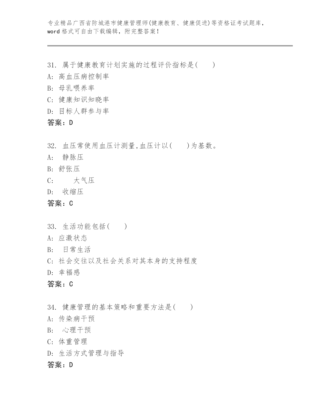 精品广西省防城港市健康管理师(健康教育、健康促进)等资格证考试内部题库【能力提升】