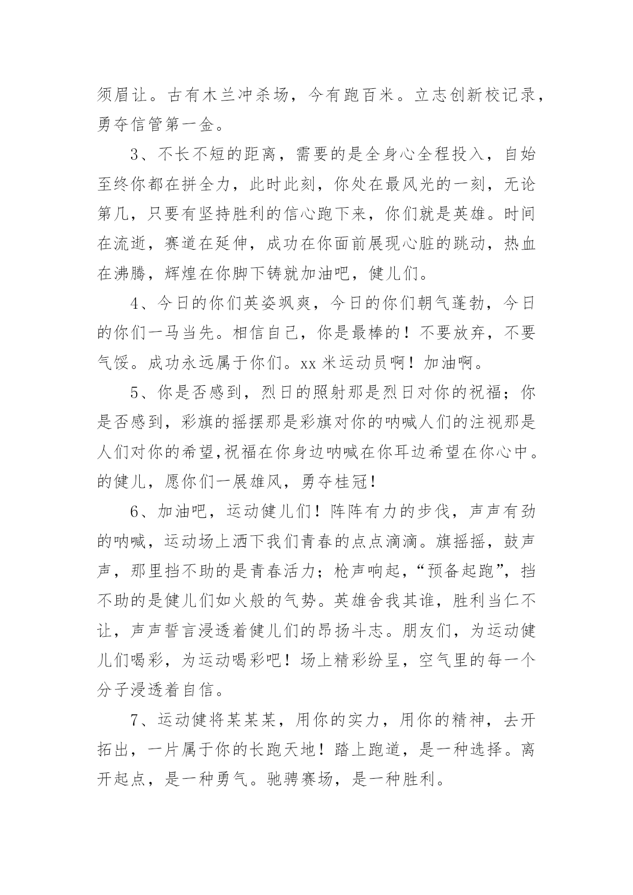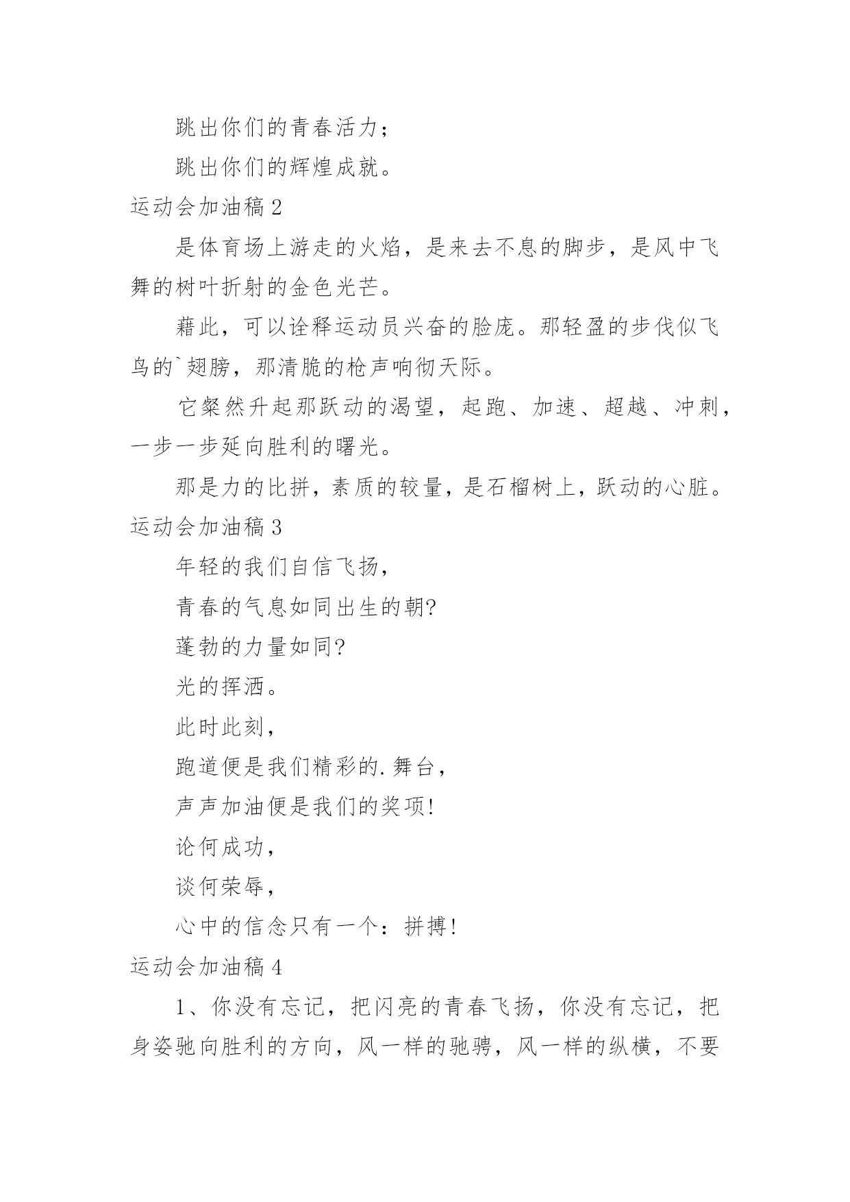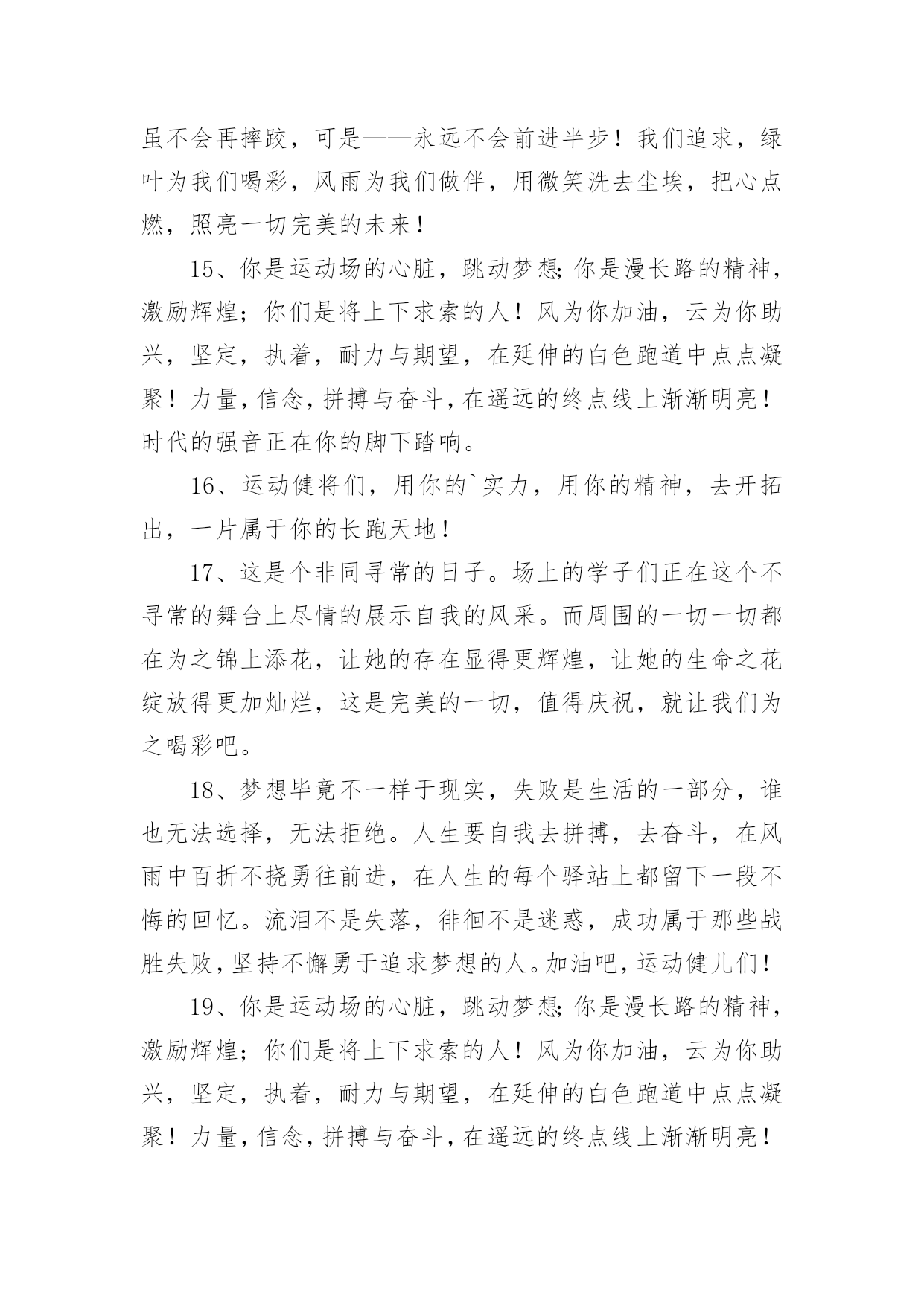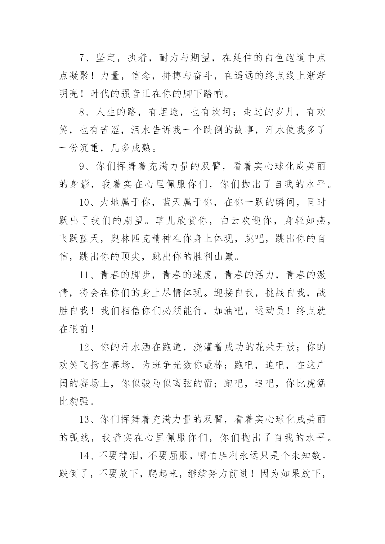 运动会加油稿【热门】运动会加油稿15篇在学习、工作生活中,越来越多地方需要用到加油稿,借助加油稿可以活跃气氛,催人奋进。那么加油稿一般是怎么写的呢?以下是小编整理的运动会加油稿,希望对大家有所帮助。运动会加油稿1大地属于你,蓝天属于你,在你一跃的瞬间,同时跃出了我们的希望。草儿欣赏你,白云欢迎你,身轻如燕,飞跃蓝天,奥林匹克精神在你身上体现,跳吧,跳出你的自信,跳出你的顶尖,跳出你的胜利山颠。跳出你们的`英姿飒爽;跳出你们的活力四射;跳出你们的无限激情;跳出你们的青春活力;跳出你们的辉煌成就。运动会加油稿2是体育场上游走的火焰,是来去不息的脚步,是风中飞舞的树叶折射的金色光芒。藉此,可以诠释运动员兴奋的脸庞。那轻盈的步伐似飞鸟的`翅膀,那清脆的枪声响彻天际。它粲然升起那跃动的渴望,起跑、加速、超越、冲刺,一步一步延向胜利的曙光。那是力的比拼,素质的较量,是石榴树上,跃动的心脏。运动会加油稿3年轻的我们自信飞扬,青春的气息如同出生的朝?蓬勃的力量如同?光的挥洒。此时此刻,跑道便是我们精彩的.舞台,声声加油便是我们的奖项!论何成功,谈何荣辱,心中的信念只有一个:拼搏!运动会加油稿41、你没有忘记,把闪亮的青春飞扬,你没有忘记,把身姿驰向胜利的方向,风一样的驰骋,风一样的纵横,不要轻言放下,因为我们已为青春宣誓——风行天下!2、踏着春天的气息,迈着轻盈的脚步,我们迎来了心仪已久的运动会。那里就是展示自我的舞台。我们向往高山的坚忍不拔,我们渴望大海的博大精深,还有,我们更痴迷于你们的速度激情。来吧,尽情释放你的活力。你的每一次冲刺,都叩动着我们的心弦;你的每一次跨越,都吸引着我们的视线;你的每一次起跳,都绷紧我们的神经。我们为你呐喊,我们为你自豪,我们为你疯狂。3、泰戈尔在诗中说,天空没有翅膀的影子,但我已飞过;艾青对朋友说,也许有人到达不了彼岸,但我们共同拥有大海。也许你们没有显赫的成绩,但运动场上留下了你们的足迹。也许你们没有奖品,但我们心中留下了你们拼搏的身影。所有的努力都是为了迎接这一刹那,所有的拼搏都是为了这一声令下。4、九年级男子xx米预赛来临了,九年级的男同胞们,是否都准备好了?看那xx米,不长也不短,却充满着活力。在满怀竞争的今日,相信你们都已信心满满。那还怕什么,加油冲刺吧!相信自我,你们都是勇敢的Number1!5、超越对手,更要超越自我,追求卓越是我们的目标,是我们的信念,在清爽的秋季,在喧嚣的赛场,你们点燃了似火的热情,无论成败,你们永远是我们的骄傲,我们都为你们感到自豪!6、不为鲜花的围绕,不为刹那的荣耀,仅有执着的信念,化作不停的奔跑,心中燃烧着梦想,脚下不停的步伐!7、坚定,执着,耐力与期望,在延伸的白色跑道中点点凝聚!力量,信念,拼搏与奋斗,在遥远的终点线上渐渐明亮!时代的强音正在你的脚下踏响。8、人生的路,有坦途,也有坎坷;走过的岁月,有欢笑,也有苦涩,泪水告诉我一个跌倒的故事,汗水使我多了一份沉重,几多成熟。9、你们挥舞着充满力量的双臂,看着实心球化成美丽的身影,我着实在心里佩服你们,你们抛出了自我的水平。10、大地属于你,蓝天属于你,在你一跃的瞬间,同时跃出了我们的期望。草儿欣赏你,白云欢迎你,身轻如燕,飞跃蓝天,奥林匹克精神在你身上体现,跳吧,跳出你的自信,跳出你的顶尖,跳出你的胜利山巅。11、青春的脚步,青春的速度,青春的活力,青春的激情,将会在你们的身上尽情体现。迎接自我,挑战自我,战胜自我!我们相信你们必须能行,加油吧,运动员!终点就在眼前!12、你的汗水洒在跑道,浇灌着成功的花朵开放;你的欢笑飞扬在赛场,为班争光数你最棒;跑吧,追吧,在这广阔的赛场上,你似骏马似离弦的箭;跑吧,追吧,你比虎猛比豹强。13、你们挥舞着充满力量的双臂,看着实心球化成美丽的弧线,我着实在心里佩服你们,你们抛出了自我的水平。14、不要掉泪,不要屈服,哪怕胜利永远只是个未知数。跌倒了,不要放下,爬起来,继续努力前进!因为如果放下,虽不会再摔跤,可是——永远不会前进半步!我们追求,绿叶为我们喝彩,风雨为我们做伴,用微笑洗去尘埃,把心点燃,照亮一切完美的未来!15、你是运动场的心脏,跳动梦想;你是漫长路的精神,激励辉煌;你们是将上下求索的人!风为你加油,云为你助兴,坚定,执着,耐力与期望,在延伸的白色跑道中点点凝聚!力量,信念,拼搏与奋斗,在遥远的终点线上渐渐明亮!时代的强音正在你的脚下踏响。16、运动健将们,用你的`实力,用你的精神,去开拓出,一片属于你的长跑天地!17、这是个非同寻常的日子。场上的学子们正在这个不寻常的舞台上尽情的展示自我的风采。而周围的一切一切都在为之锦上添花,让她的存在显得更辉煌,让她的生命之花绽放得更加灿烂,这是完美的一切,值得庆祝,就让我们为之喝彩吧。18、梦想毕竟不一样于现实,失败是生