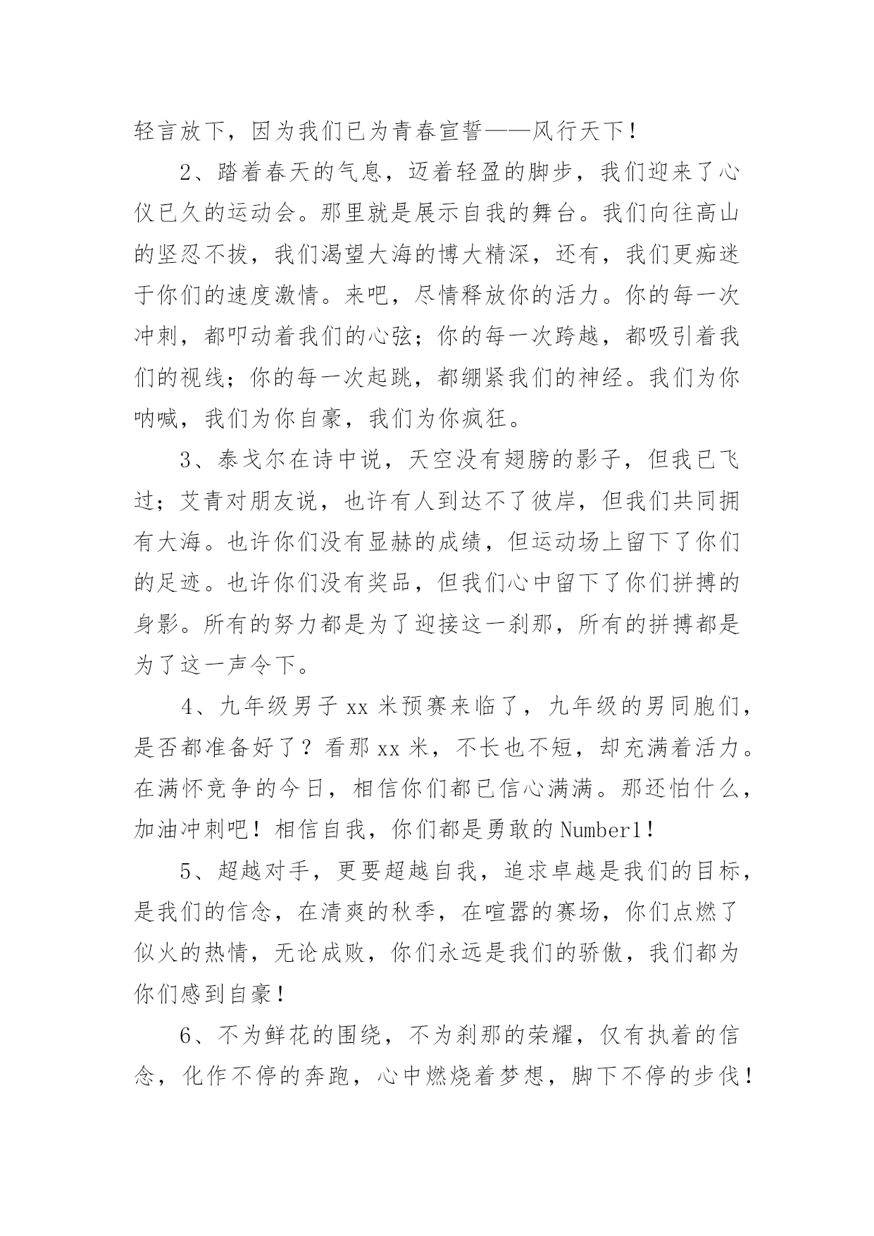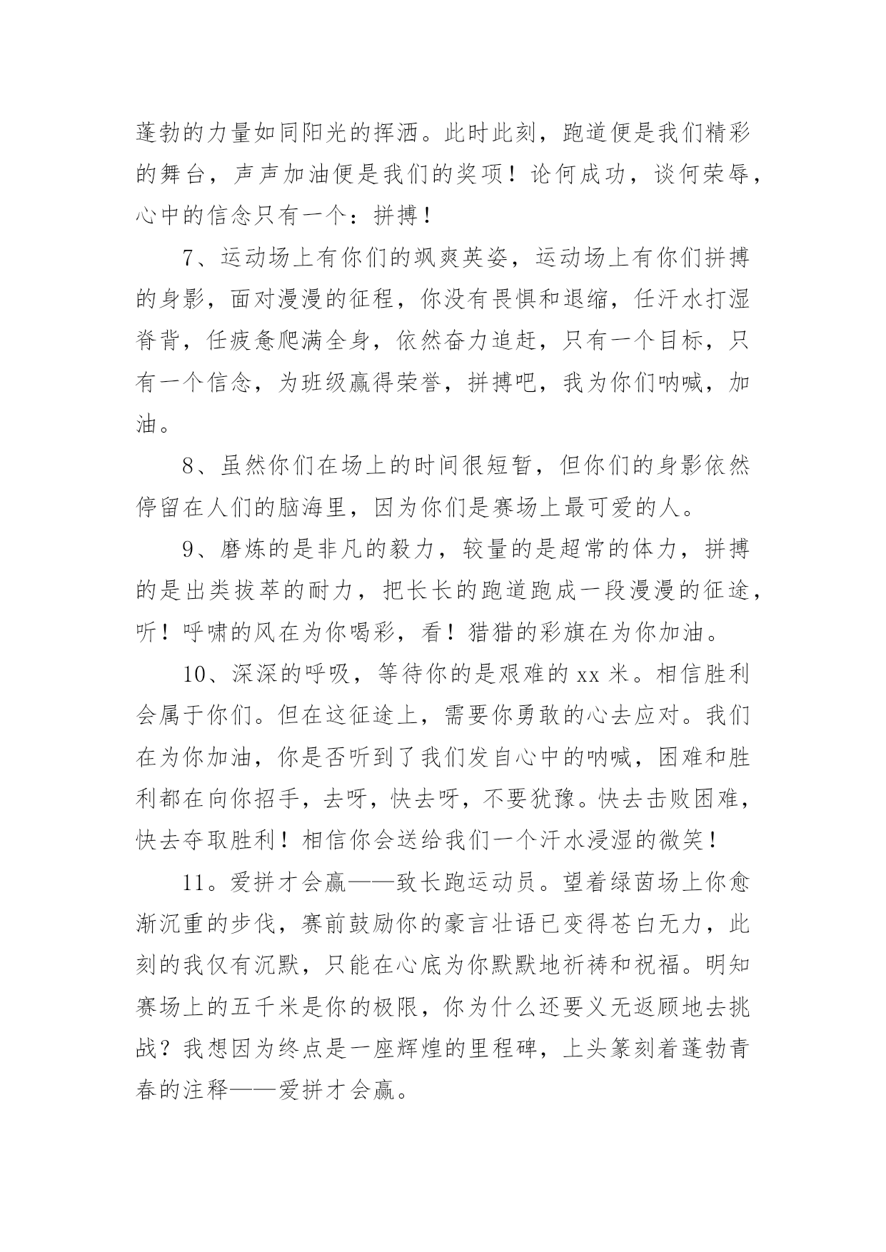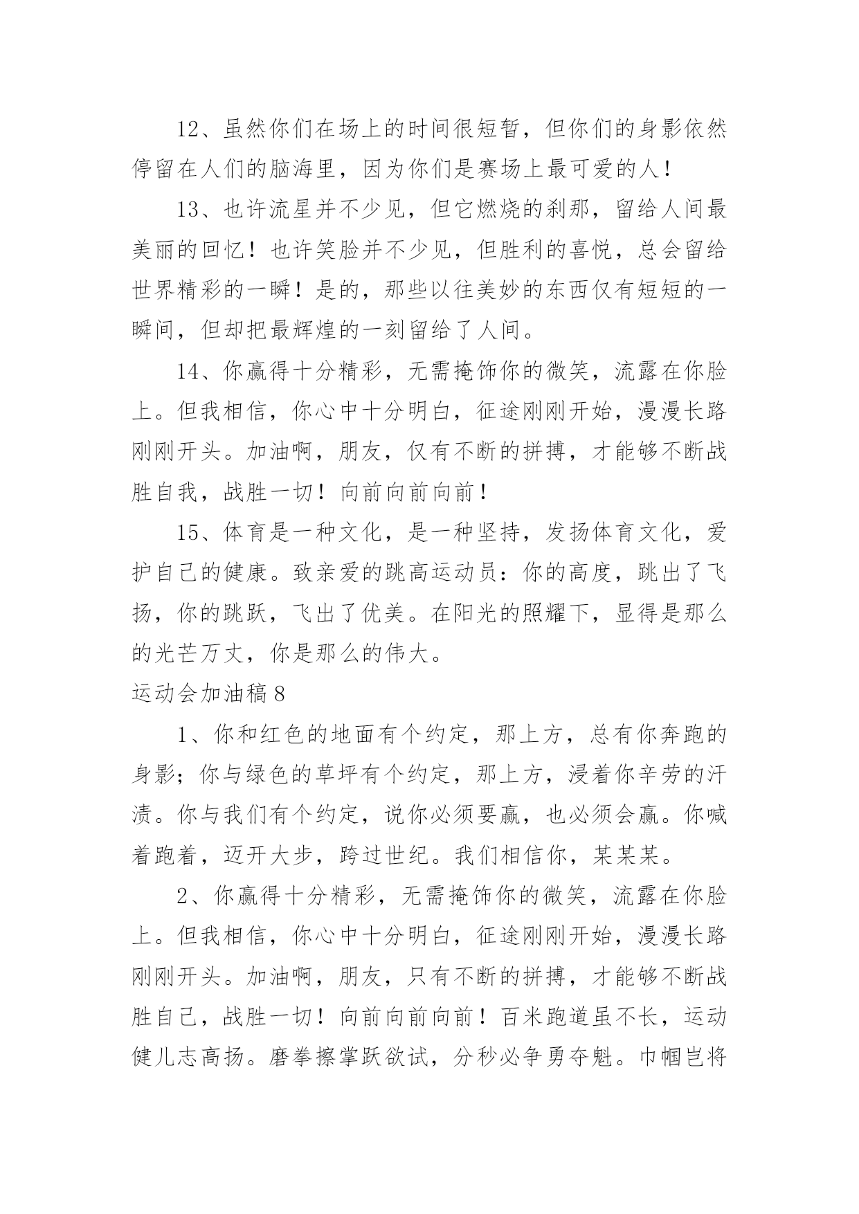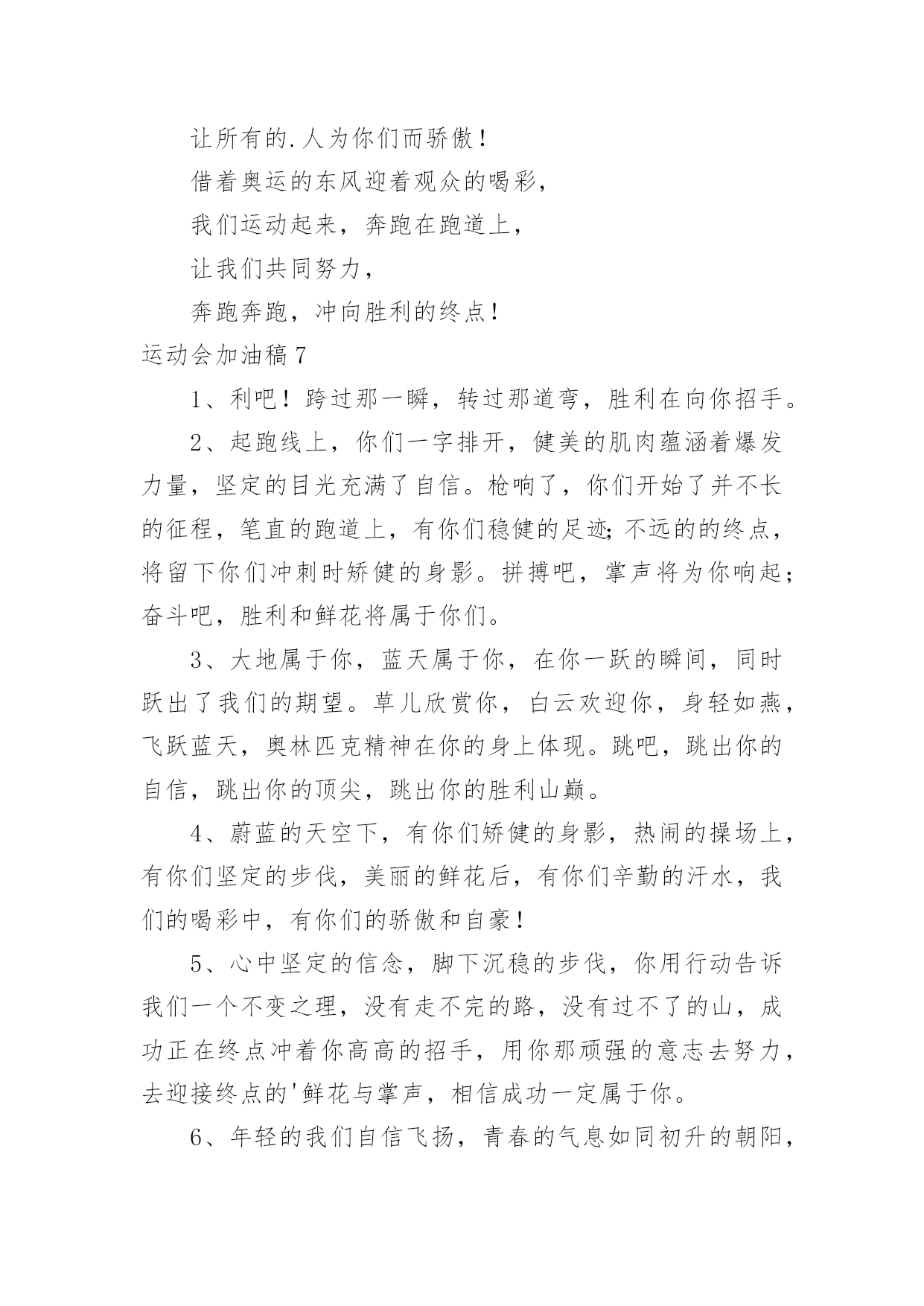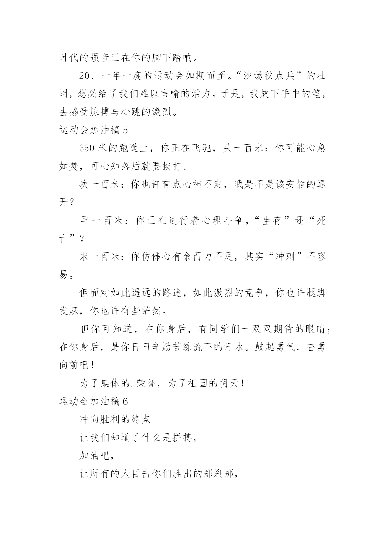 运动会加油稿【热门】运动会加油稿15篇在学习、工作生活中,越来越多地方需要用到加油稿,借助加油稿可以活跃气氛,催人奋进。那么加油稿一般是怎么写的呢?以下是小编整理的运动会加油稿,希望对大家有所帮助。运动会加油稿1大地属于你,蓝天属于你,在你一跃的瞬间,同时跃出了我们的希望。草儿欣赏你,白云欢迎你,身轻如燕,飞跃蓝天,奥林匹克精神在你身上体现,跳吧,跳出你的自信,跳出你的顶尖,跳出你的胜利山颠。跳出你们的`英姿飒爽;跳出你们的活力四射;跳出你们的无限激情;跳出你们的青春活力;跳出你们的辉煌成就。运动会加油稿2是体育场上游走的火焰,是来去不息的脚步,是风中飞舞的树叶折射的金色光芒。藉此,可以诠释运动员兴奋的脸庞。那轻盈的步伐似飞鸟的`翅膀,那清脆的枪声响彻天际。它粲然升起那跃动的渴望,起跑、加速、超越、冲刺,一步一步延向胜利的曙光。那是力的比拼,素质的较量,是石榴树上,跃动的心脏。运动会加油稿3年轻的我们自信飞扬,青春的气息如同出生的朝?蓬勃的力量如同?光的挥洒。此时此刻,跑道便是我们精彩的.舞台,声声加油便是我们的奖项!论何成功,谈何荣辱,心中的信念只有一个:拼搏!运动会加油稿41、你没有忘记,把闪亮的青春飞扬,你没有忘记,把身姿驰向胜利的方向,风一样的驰骋,风一样的纵横,不要轻言放下,因为我们已为青春宣誓——风行天下!2、踏着春天的气息,迈着轻盈的脚步,我们迎来了心仪已久的运动会。那里就是展示自我的舞台。我们向往高山的坚忍不拔,我们渴望大海的博大精深,还有,我们更痴迷于你们的速度激情。来吧,尽情释放你的活力。你的每一次冲刺,都叩动着我们的心弦;你的每一次跨越,都吸引着我们的视线;你的每一次起跳,都绷紧我们的神经。我们为你呐喊,我们为你自豪,我们为你疯狂。3、泰戈尔在诗中说,天空没有翅膀的影子,但我已飞过;艾青对朋友说,也许有人到达不了彼岸,但我们共同拥有大海。也许你们没有显赫的成绩,但运动场上留下了你们的足迹。也许你们没有奖品,但我们心中留下了你们拼搏的身影。所有的努力都是为了迎接这一刹那,所有的拼搏都是为了这一声令下。4、九年级男子xx米预赛来临了,九年级的男同胞们,是否都准备好了?看那xx米,不长也不短,却充满着活力。在满怀竞争的今日,相信你们都已信心满满。那还怕什么,加油冲刺吧!相信自我,你们都是勇敢的Number1!5、超越对手,更要超越自我,追求卓越是我们的目标,是我们的信念,在清爽的秋季,在喧嚣的赛场,你们点燃了似火的热情,无论成败,你们永远是我们的骄傲,我们都为你们感到自豪!6、不为鲜花的围绕,不为刹那的荣耀,仅有执着的信念,化作不停的奔跑,心中燃烧着梦想,脚下不停的步伐!7、坚定,执着,耐力与期望,在延伸的白色跑道中点点凝聚!力量,信念,拼搏与奋斗,在遥远的终点线上渐渐明亮!时代的强音正在你的脚下踏响。8、人生的路,有坦途,也有坎坷;走过的岁月,有欢笑,也有苦涩,泪水告诉我一个跌倒的故事,汗水使我多了一份沉重,几多成熟。9、你们挥舞着充满力量的双臂,看着实心球化成美丽的身影,我着实在心里佩服你们,你们抛出了自我的水平。10、大地属于你,蓝天属于你,在你一跃的瞬间,同时跃出了我们的期望。草儿欣赏你,白云欢迎你,身轻如燕,飞跃蓝天,奥林匹克精神在你身上体现,跳吧,跳出你的自信,跳出你的顶尖,跳出你的胜利山巅。11、青春的脚步,青春的速度,青春的活力,青春的激情,将会在你们的身上尽情体现。迎接自我,挑战自我,战胜自我!我们相信你们必须能行,加油吧,运动员!终点就在眼前!12、你的汗水洒在跑道,浇灌着成功的花朵开放;你的欢笑飞扬在赛场,为班争光数你最棒;跑吧,追吧,在这广阔的赛场上,你似骏马似离弦的箭;跑吧,追吧,你比虎猛比豹强。13、你们挥舞着充满力量的双臂,看着实心球化成美丽的弧线,我着实在心里佩服你们,你们抛出了自我的水平。14、不要掉泪,不要屈服,哪怕胜利永远只是个未知数。跌倒了,不要放下,爬起来,继续努力前进!因为如果放下,虽不会再摔跤,可是——永远不会前进半步!我们追求,绿叶为我们喝彩,风雨为我们做伴,用微笑洗去尘埃,把心点燃,照亮一切完美的未来!15、你是运动场的心脏,跳动梦想;你是漫长路的精神,激励辉煌;你们是将上下求索的人!风为你加油,云为你助兴,坚定,执着,耐力与期望,在延伸的白色跑道中点点凝聚!力量,信念,拼搏与奋斗,在遥远的终点线上渐渐明亮!时代的强音正在你的脚下踏响。16、运动健将们,用你的`实力,用你的精神,去开拓出,一片属于你的长跑天地!17、这是个非同寻常的日子。场上的学子们正在这个不寻常的舞台上尽情的展示自我的风采。而周围的一切一切都在为之锦上添花,让她的存在显得更辉煌,让她的生命之花绽放得更加灿烂,这是完美的一切,值得庆祝,就让我们为之喝彩吧。18、梦想毕竟不一样于现实,失败是生