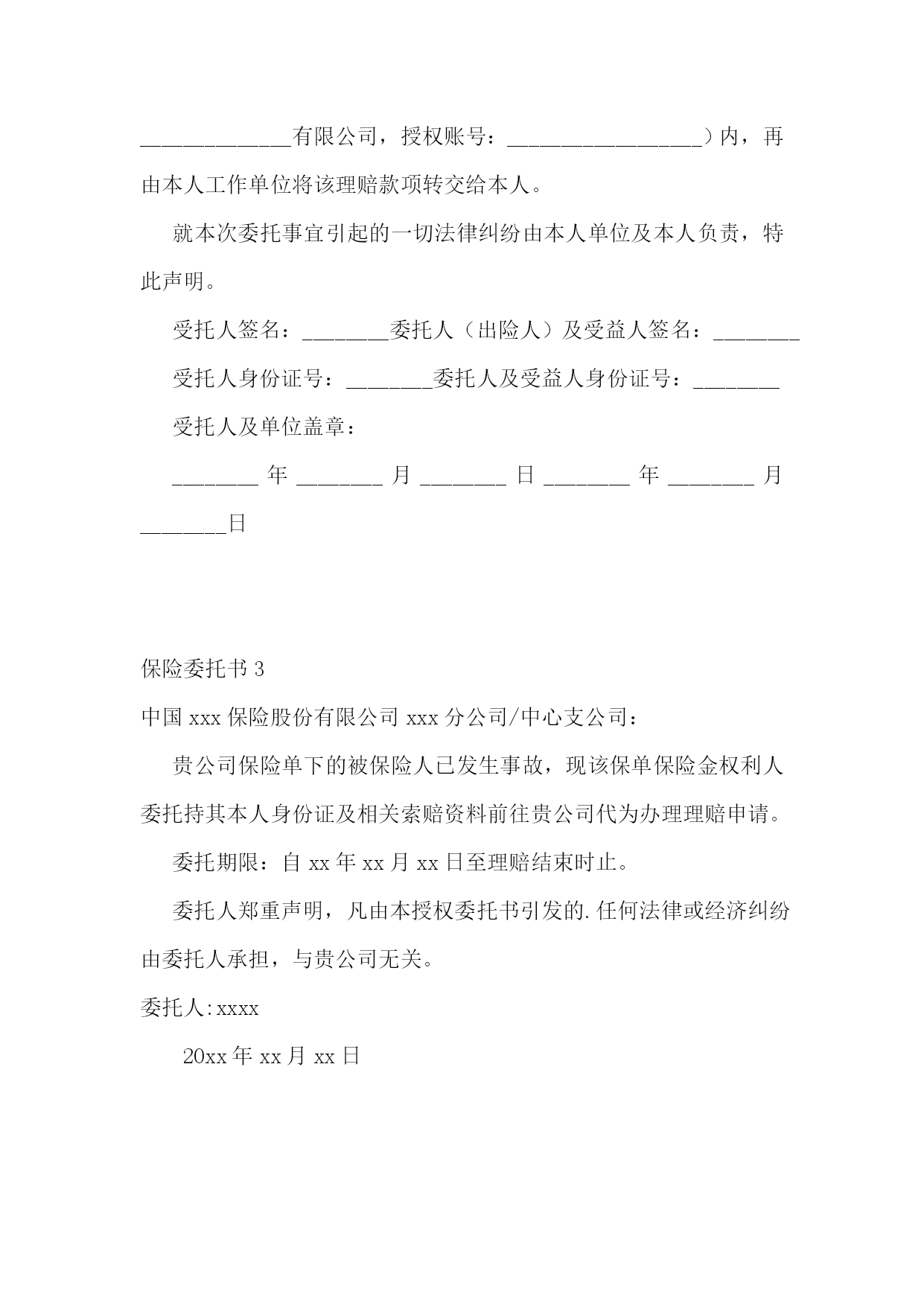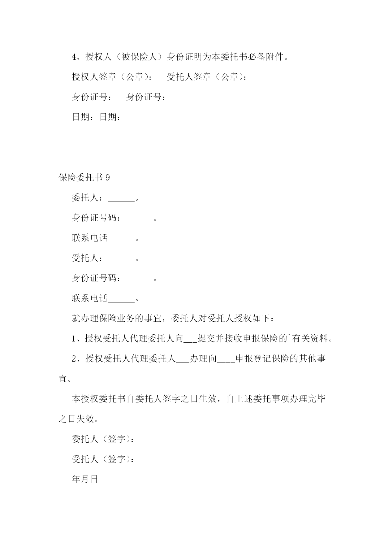 保险委托书(15篇)保险委托书1上海市松江区社会保险管理中心:本人xx,因不能亲自前往贵中心办理生育保险待遇的.申领手续,特委托xx(身份证号:xxxxx),前往贵处办理生育保险金申领手续,并将生育保险金转入本人银行卡内:卡号:xxxxxx开户行:xx此致!委托人(签名):xx身份证号码:xxxxx被委托人(签名):xx身份证号码:xxxxx日期:20xx年x月x日保险委托书2____________股份有限公司广东分公司:本人系贵公司保险合同号________________下所属的(按下列项目填写:□生存受益人□身故受益人/继承人□法定代理人或监护人)。现本人授权如下:由中国人民健康保险股份有限公司将本人因意外而发生的保险事故的理赔款项转入摊贩保单位____________有限公司的`账户(开户银行:中国农业银行________支行单位户名:______________有限公司,授权账号:__________________)内,再由本人工作单位将该理赔款项转交给本人。就本次委托事宜引起的一切法律纠纷由本人单位及本人负责,特此声明。受托人签名:________委托人(出险人)及受益人签名:________受托人身份证号:________委托人及受益人身份证号:________受托人及单位盖章:________年________月________日________年________月________日保险委托书3中国xxx保险股份有限公司xxx分公司/中心支公司:贵公司保险单下的被保险人已发生事故,现该保单保险金权利人委托持其本人身份证及相关索赔资料前往贵公司代为办理理赔申请。委托期限:自xx年xx月xx日至理赔结束时止。委托人郑重声明,凡由本授权委托书引发的.任何法律或经济纠纷由委托人承担,与贵公司无关。委托人:xxxx20xx年xx月xx日保险委托书4xxxxxx股份有限公司(湖北分公司):本人(姓名)xx(身份证件号码)系xx单位xx(保单号)下所载之:囗被保险人xx囗被保险人之法定代理人xx囗指定受益人xx囗继承人xx囗其他现根据贵公司规定全权委托xx先生/小姐(身份证件号码:xx)xx在xx年xx月xx日至xx年xx月xx日持本授权人身份证件,以本人名义前往贵公司就本合同办理xx囗理赔申请xx囗xx给付申请xx囗xx退保申请xx囗xx退费申请xx囗代领保险金xx囗其他受托人声明:第一、xx受托人保证授权人的签名为亲笔签名,如有纠纷,受托人自愿承担相应责任;第二、xx受托人在授权有效期内代为办理委托,严格遵循授权人的真实意愿,所实施的’行为如超出授权范围,受托人自愿承担相应责任。授权人签名:xx授权人证件号码:xx联系电话:受托人签名:xx受托人证件号码:xx联系电话:并委托xx人寿保险股份有限公司/xx养老保险股份有限公司xx分公司(以下简称保险人)在理赔案件结案后或给付办妥后将保险金转账至如下账户,转账给付汇总信息如下:如保险金要求转入非受益人本人账户,请说明原因:xx如保险金经受益人授权要求转账至投保单位账户,请投保单位对以上转账信息进行盖章确认。授权人声明:本被保险人(或经被保险人同意之委托代理人或其法定法定代理人)作为授权人,已仔细核对上述转账给付信息无误,并同意若发生下述情况时,由授权人自行承担责任:1、若授权人所提供的授权书账号错误,而导致保险人无法转入或错误转入他人账号;2、若授权人所提供的授权书账号由于非保险人或非银行原因被注销,导致转账给付失败;3、若被保险人遗失转账账户后未及时通知保险人、并重新授权,导致保险人按遗失账号转入或转账给付失败;授权人签章:投保单位签章:证件号码:单位经办人签章:联系电话:联系电话:xx年xx月xx日xx年xx月xx日保险委托书5(转出**************)**************:因本人工作繁忙,不能亲自办理养老保险关系转移相关手续,特委托**************作为我的’代理人全权代表我办理相关事项。对代理人在办理上述事项过程中所签署的有关文件,委托人均予以认可,并承担相应法律责任。委托期限:自签字之日起至**************提供《养老保险缴费凭证》并返回委托人止。委托人承诺提供相关信息如下:姓名:性别:联系电话:身份证号码:户籍地地址(详细地址):委托人:年月日受托人身份证正反面复印件:(粘贴)(粘贴)保险委托书6平安养老保险有限公司:本人(姓名)(身份证号码)列在单位(保单号):□被保险人□被保险人法定代表人□指定受益人□继承人□其他根据贵公司的规定,我们特此授权/小顾先生(身份证号码:)于___年