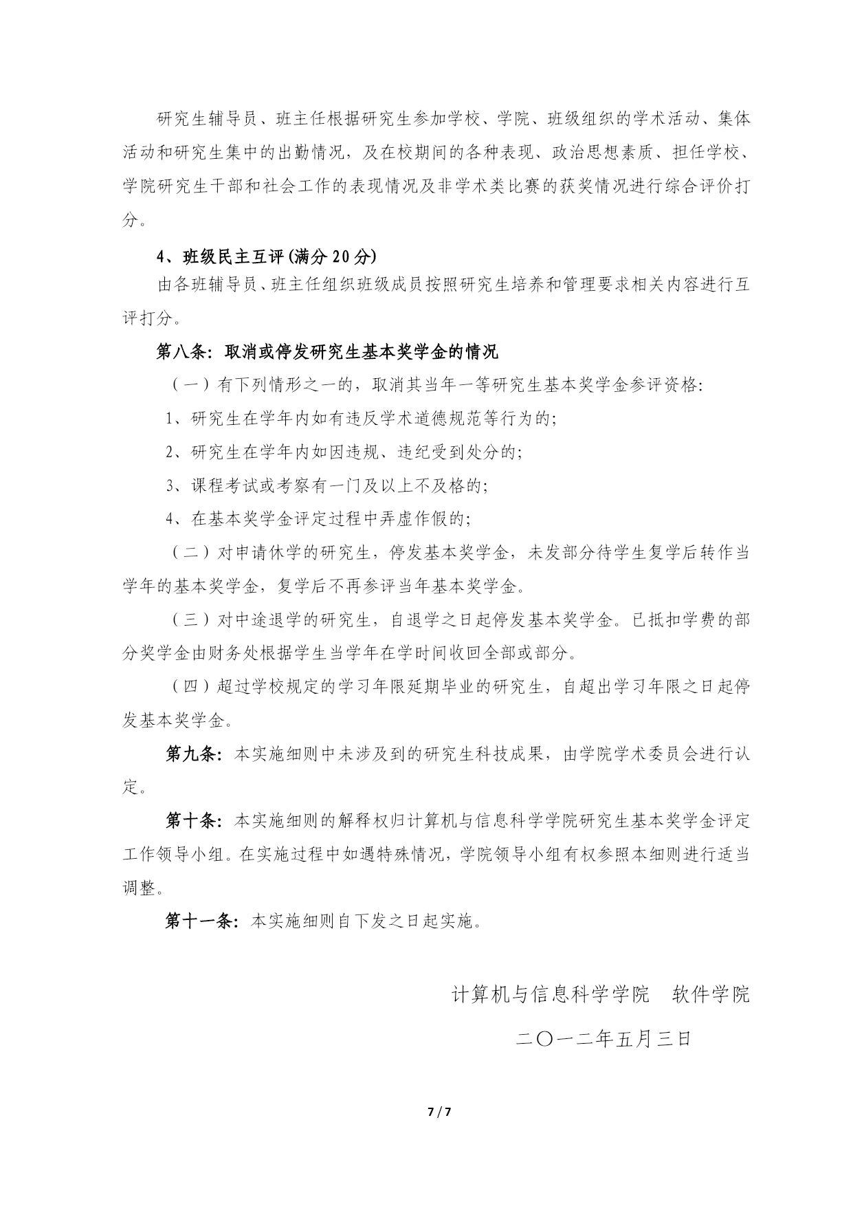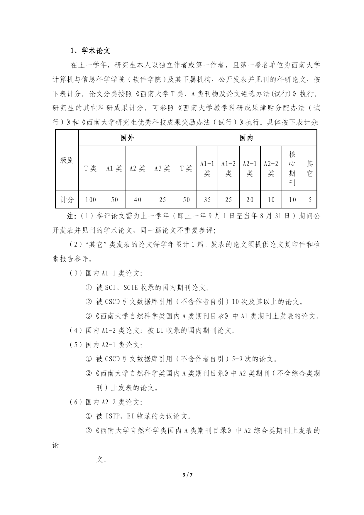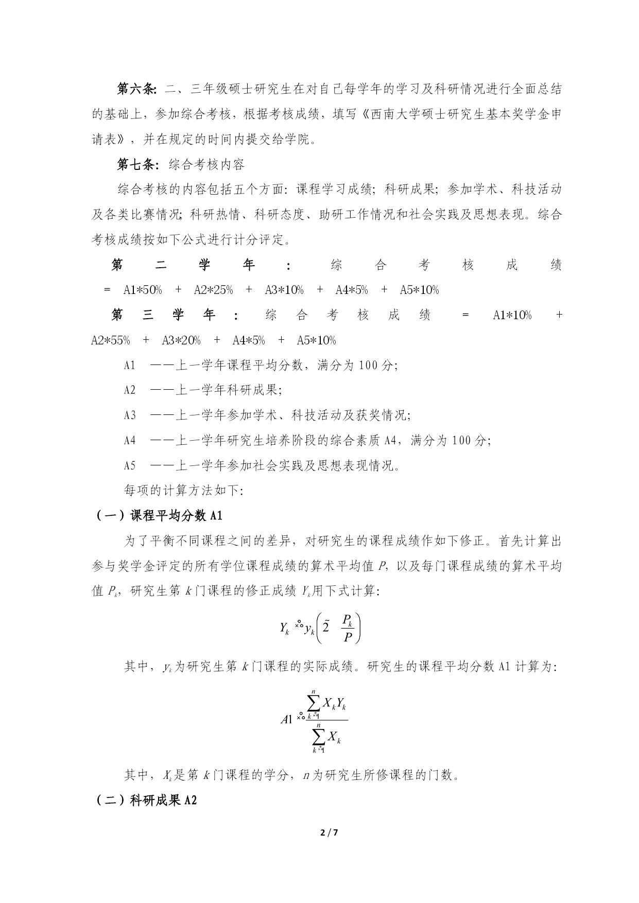 PAGE7/NUMPAGES7西南大学计算机与信息科学学院、软件学院硕士研究生基本奖学金评定实施细则(试行)根据《西南大学研究生培养机制改革方案(试行)》和《西南大学研究生基本奖学金评定实施办法(试行)》的文件精神,为了切实做好我院硕士研究生基本奖学金评定工作,激发研究生的科技创新和形成良好的竞争机制,提高研究生培养质量,特制定本细则。第一条:学院成立由党政一把手为组长,分管研究生学生工作和教学工作的学院领导、导师代表、教学秘书、辅导员、班主任组成院研究生基本奖学金评定工作领导小组,负责组织开展研究生基本奖学金评定工作,讨论决定评定过程中出现的各类问题,审核初评结果。第二条:硕士研究生基本奖学金的评定对象为学院非在职全日制硕士,不包括在职研究生和国家少数民族骨干计划等专项计划招收的研究生,也不包括港澳台研究生、外国来华留学研究生。国家少数民族骨干计划等专项计划招收的研究生按国家有关规定执行。学院硕士研究生基本奖学金的具体评定标准和评定程序按《西南大学研究生基本奖学金评定实施办法(试行)》执行。第三条:硕士研究生基本奖学金每学年通过考核进行评定,实行动态管理。第一学年以考生综合成绩为依据,评定所获基本奖学金的等级。第二、三学年根据硕士研究生每学年的综合考核成绩,由学生提出申请,导师提出建议,然后由学院研究生基本奖学金评定工作组按照程序组织开展基本奖学金评定工作,评定结果报学院审核,并在学院公示评定结果三天,最后报学校审批。第四条:硕士研究生基本奖学金申请基本条件(一)热爱祖国,坚持四项基本原则;(二)遵守国家法律法规和学校规章制度;(三)按学校的规定办理注册手续;(四)个人档案已经调入西南大学;(五)在学校规定的学制内提出申请。第五条:免试推荐的硕士研究生第一学年享受一等基本奖学金,第二、三学年纳入同年级硕士研究生考核评定。第六条:二、三年级硕士研究生在对自己每学年的学习及科研情况进行全面总结的基础上,参加综合考核,根据考核成绩,填写《西南大学硕士研究生基本奖学金申请表》,并在规定的时间内提交给学院。第七条:综合考核内容综合考核的内容包括五个方面:课程学习成绩;科研成果;参加学术、科技活动及各类比赛情况;科研热情、科研态度、助研工作情况和社会实践及思想表现。综合考核成绩按如下公式进行计分评定。第二学年:综合考核成绩=A1*50%+A2*25%+A3*10%+A4*5%+A5*10%第三学年:综合考核成绩=A1*10%+A2*55%+A3*20%+A4*5%+A5*10%A1——上一学年课程平均分数,满分为100分;A2——上一学年科研成果;A3——上一学年参加学术、科技活动及获奖情况;A4——上一学年研究生培养阶段的综合素质A4,满分为100分;A5——上一学年参加社会实践及思想表现情况。每项的计算方法如下:(一)课程平均分数A1为了平衡不同课程之间的差异,对研究生的课程成绩作如下修正。首先计算出参与奖学金评定的所有学位课程成绩的算术平均值P,以及每门课程成绩的算术平均值Pk,研究生第k门课程的修正成绩Yk用下式计算:其中,yk为研究生第k门课程的实际成绩。研究生的课程平均分数A1计算为:其中,Xk是第k门课程的学分,n为研究生所修课程的门数。(二)科研成果A21、学术论文在上一学年,研究生本人以独立作者或第一作者,且第一署名单位为西南大学计算机与信息科学学院(软件学院)及其下属机构,公开发表并见刊的科研论文,按下表计分。论文分类按照《西南大学T类、A类刊物及论文遴选办法(试行)》执行。研究生的其它科研成果计分,可参照《西南大学教学科研成果津贴分配办法(试行)》和《西南大学研究生优秀科技成果奖励办法(试行)》执行。具体按下表计分:级别国外国内T类A1类A2类A3类T类A1-1类A1-2类A2-1类A2-2类核心期刊其它计分1005040255035252010105注:(1)参评论文需为上一学年(即上一年9月1日至当年8月31日)期间公开发表并见刊的学术论文,同一篇论文不重复参评;(2)“其它”类发表的论文每学年限计1篇。发表的论文须提供论文复印件和检索报告参评。(3)国内A1-1类论文:=1\*GB3①被SCI、SCIE收录的国内期刊论文。=2\*GB3②被CSCD引文数据库引用(不含作者自引)10次及其以上的论文。=3\*GB3③《西南大学自然科学类国内A类期刊目录》中A1类期刊上发表的论文。(4)国内A1-2类论文:被EI收录的国内期刊论文。(5)国内A2-1类论文:=1\*GB3①被CSCD引文数据库引用(不含作者自引)5-9次的论文。=2\*GB3②《西南大学自然科学类国内A类期刊目录》中