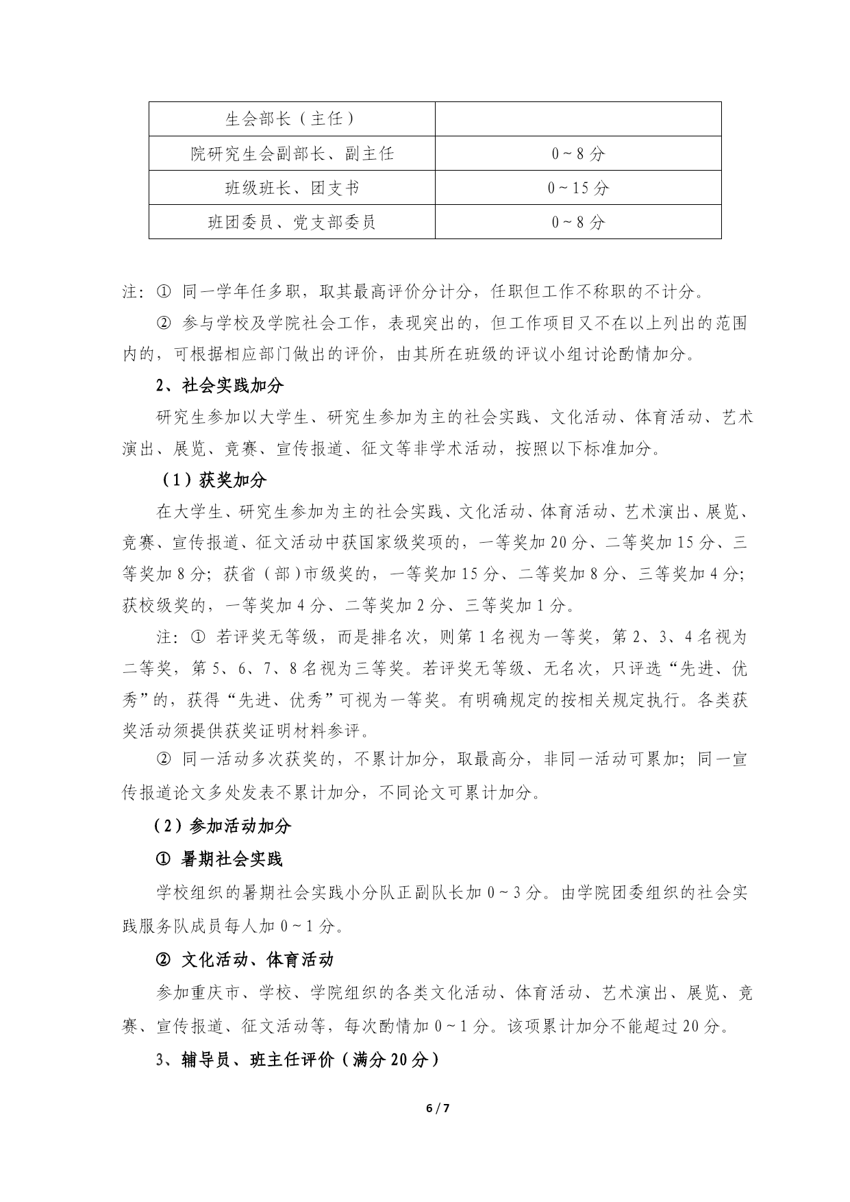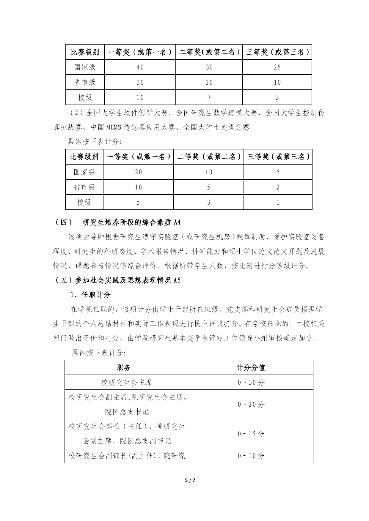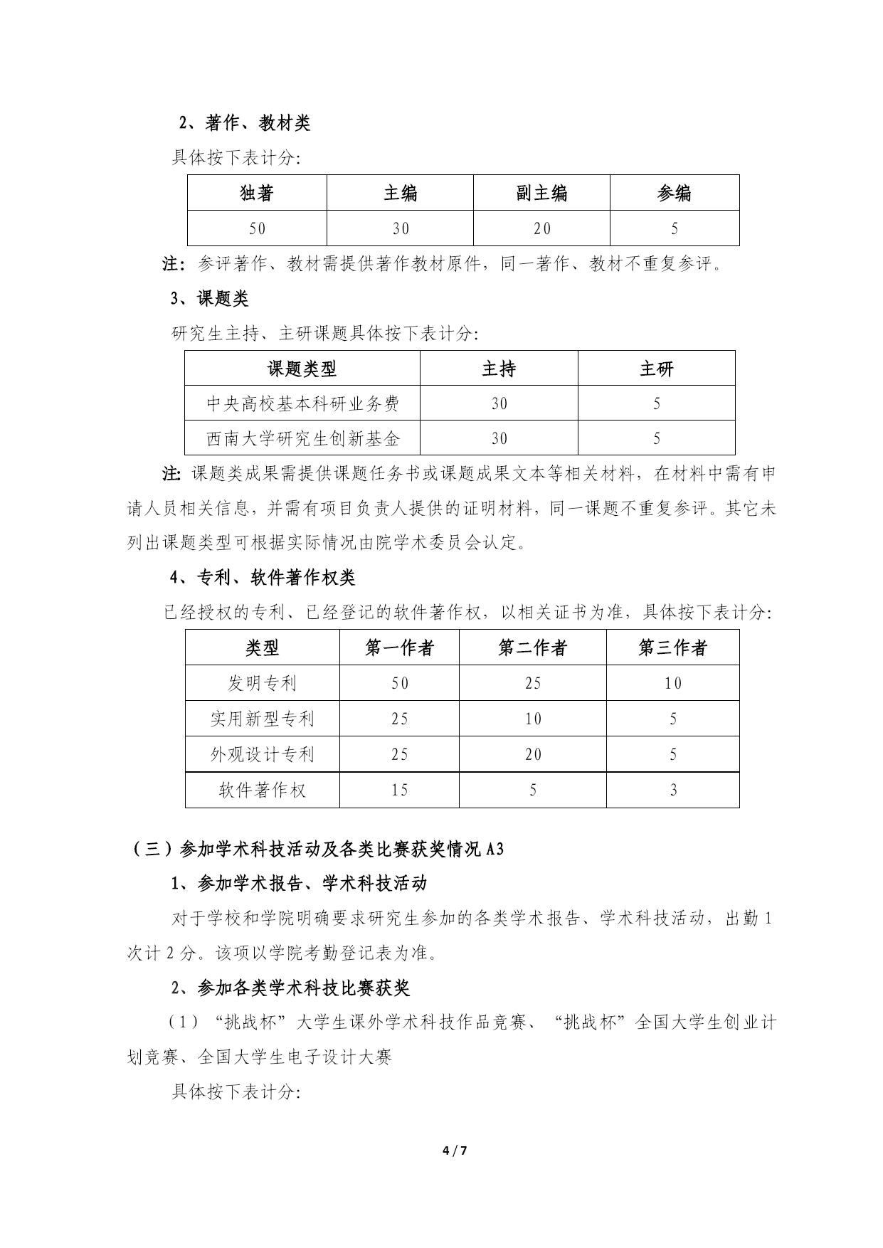 PAGE7/NUMPAGES7西南大学计算机与信息科学学院、软件学院硕士研究生基本奖学金评定实施细则(试行)根据《西南大学研究生培养机制改革方案(试行)》和《西南大学研究生基本奖学金评定实施办法(试行)》的文件精神,为了切实做好我院硕士研究生基本奖学金评定工作,激发研究生的科技创新和形成良好的竞争机制,提高研究生培养质量,特制定本细则。第一条:学院成立由党政一把手为组长,分管研究生学生工作和教学工作的学院领导、导师代表、教学秘书、辅导员、班主任组成院研究生基本奖学金评定工作领导小组,负责组织开展研究生基本奖学金评定工作,讨论决定评定过程中出现的各类问题,审核初评结果。第二条:硕士研究生基本奖学金的评定对象为学院非在职全日制硕士,不包括在职研究生和国家少数民族骨干计划等专项计划招收的研究生,也不包括港澳台研究生、外国来华留学研究生。国家少数民族骨干计划等专项计划招收的研究生按国家有关规定执行。学院硕士研究生基本奖学金的具体评定标准和评定程序按《西南大学研究生基本奖学金评定实施办法(试行)》执行。第三条:硕士研究生基本奖学金每学年通过考核进行评定,实行动态管理。第一学年以考生综合成绩为依据,评定所获基本奖学金的等级。第二、三学年根据硕士研究生每学年的综合考核成绩,由学生提出申请,导师提出建议,然后由学院研究生基本奖学金评定工作组按照程序组织开展基本奖学金评定工作,评定结果报学院审核,并在学院公示评定结果三天,最后报学校审批。第四条:硕士研究生基本奖学金申请基本条件(一)热爱祖国,坚持四项基本原则;(二)遵守国家法律法规和学校规章制度;(三)按学校的规定办理注册手续;(四)个人档案已经调入西南大学;(五)在学校规定的学制内提出申请。第五条:免试推荐的硕士研究生第一学年享受一等基本奖学金,第二、三学年纳入同年级硕士研究生考核评定。第六条:二、三年级硕士研究生在对自己每学年的学习及科研情况进行全面总结的基础上,参加综合考核,根据考核成绩,填写《西南大学硕士研究生基本奖学金申请表》,并在规定的时间内提交给学院。第七条:综合考核内容综合考核的内容包括五个方面:课程学习成绩;科研成果;参加学术、科技活动及各类比赛情况;科研热情、科研态度、助研工作情况和社会实践及思想表现。综合考核成绩按如下公式进行计分评定。第二学年:综合考核成绩=A1*50%+A2*25%+A3*10%+A4*5%+A5*10%第三学年:综合考核成绩=A1*10%+A2*55%+A3*20%+A4*5%+A5*10%A1——上一学年课程平均分数,满分为100分;A2——上一学年科研成果;A3——上一学年参加学术、科技活动及获奖情况;A4——上一学年研究生培养阶段的综合素质A4,满分为100分;A5——上一学年参加社会实践及思想表现情况。每项的计算方法如下:(一)课程平均分数A1为了平衡不同课程之间的差异,对研究生的课程成绩作如下修正。首先计算出参与奖学金评定的所有学位课程成绩的算术平均值P,以及每门课程成绩的算术平均值Pk,研究生第k门课程的修正成绩Yk用下式计算:其中,yk为研究生第k门课程的实际成绩。研究生的课程平均分数A1计算为:其中,Xk是第k门课程的学分,n为研究生所修课程的门数。(二)科研成果A21、学术论文在上一学年,研究生本人以独立作者或第一作者,且第一署名单位为西南大学计算机与信息科学学院(软件学院)及其下属机构,公开发表并见刊的科研论文,按下表计分。论文分类按照《西南大学T类、A类刊物及论文遴选办法(试行)》执行。研究生的其它科研成果计分,可参照《西南大学教学科研成果津贴分配办法(试行)》和《西南大学研究生优秀科技成果奖励办法(试行)》执行。具体按下表计分:级别国外国内T类A1类A2类A3类T类A1-1类A1-2类A2-1类A2-2类核心期刊其它计分1005040255035252010105注:(1)参评论文需为上一学年(即上一年9月1日至当年8月31日)期间公开发表并见刊的学术论文,同一篇论文不重复参评;(2)“其它”类发表的论文每学年限计1篇。发表的论文须提供论文复印件和检索报告参评。(3)国内A1-1类论文:=1\*GB3①被SCI、SCIE收录的国内期刊论文。=2\*GB3②被CSCD引文数据库引用(不含作者自引)10次及其以上的论文。=3\*GB3③《西南大学自然科学类国内A类期刊目录》中A1类期刊上发表的论文。(4)国内A1-2类论文:被EI收录的国内期刊论文。(5)国内A2-1类论文:=1\*GB3①被CSCD引文数据库引用(不含作者自引)5-9次的论文。=2\*GB3②《西南大学自然科学类国内A类期刊目录》中
