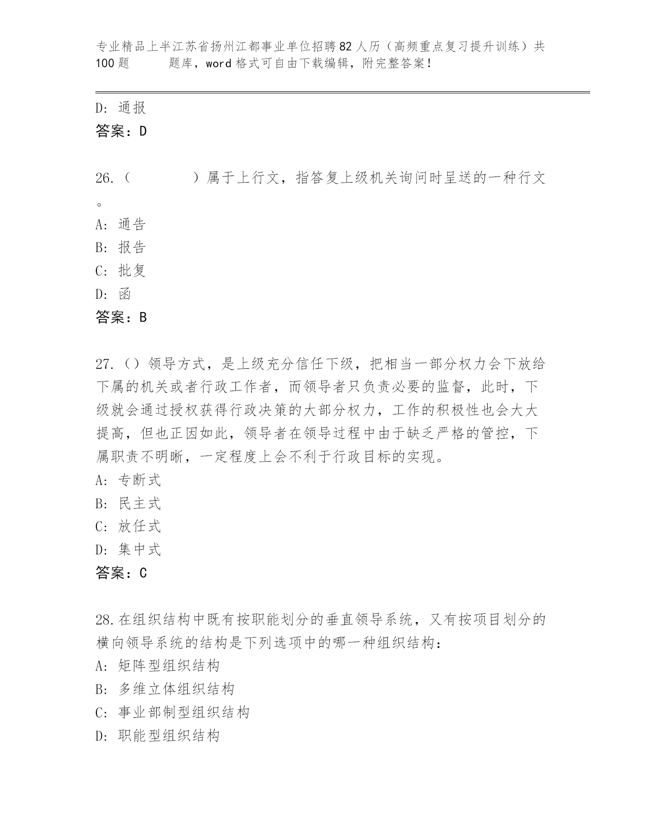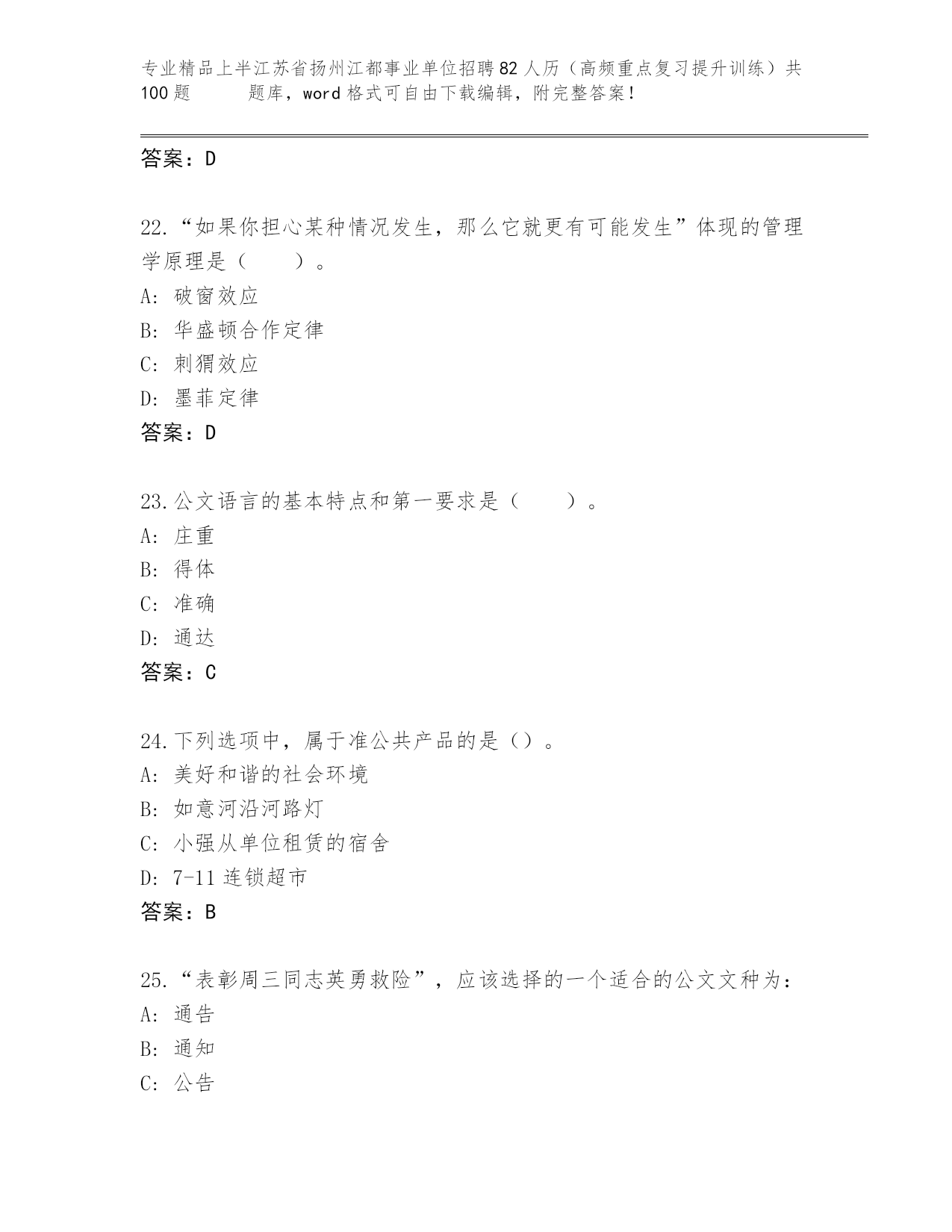 精品上半江苏省扬州江都事业单位招聘82人历(高频重点复习提升训练)共100题 通关秘籍题库含下载答案