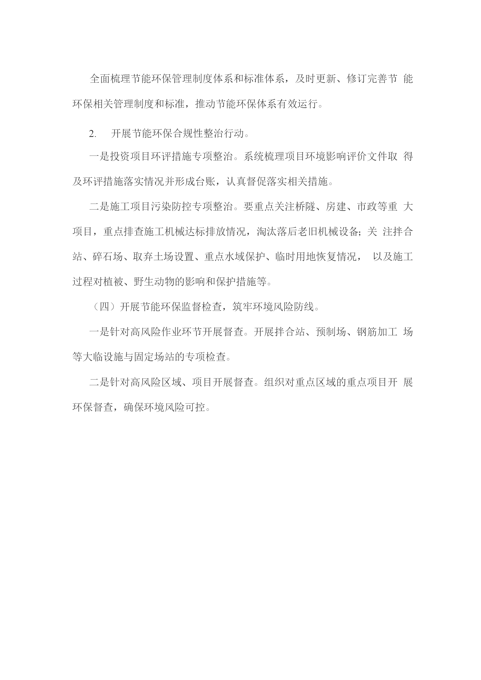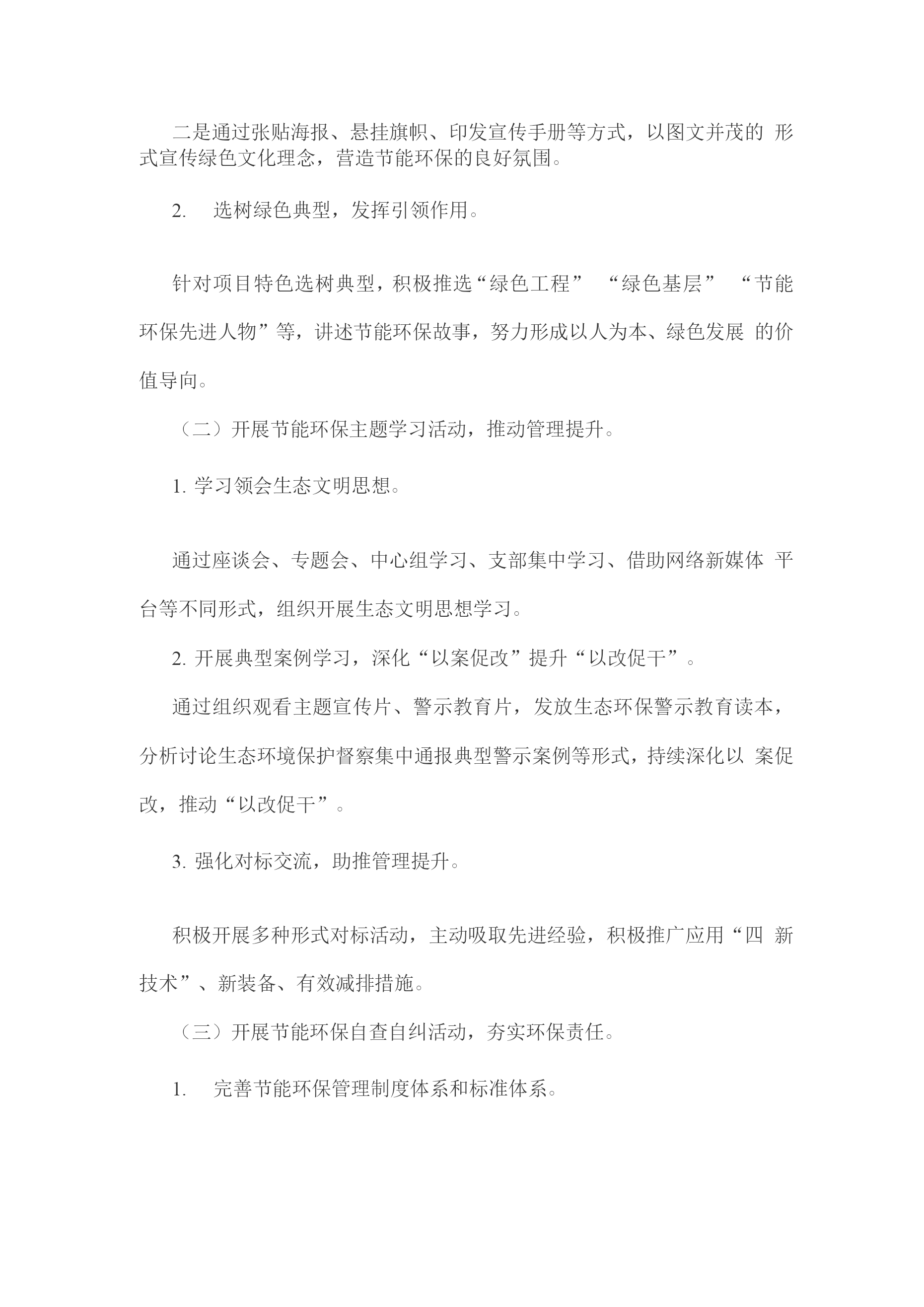 公司“节能环保月”活动方案公司紧跟一级“节能环保”行动步伐,按照上级《“节能环保月”主题活动方案》要求和公司实际,进一步细化部署了六公司“节能环保月”活动方案。一、总体要求以生态文明思想为指导,以“两保一争”为目标,以“交自然为友,建和谐之道”为主题,践行“创新、协调、绿色、开放、共享”的新发展理念,不断强化“绿水青山就是金山银山”文化引领力,持续提升文化软实力,推动公司节能环保管理专业化、标准化、信息化、精细化建设,努力打造“绿色节能环保型企业”,助推公司高质量发展。二、组织机构为扎实开展本次主题活动,确保活动取得实效,公司成立“节能环保月”主题活动领导小组,负责此次活动的组织领导、统一安排、统一部署。三、活动安排(一)开展节能环保特色宣传活动,提升全员环保意识。线上线下相结合,大力宣传绿色文化。一是利用多媒体平台,通过展播“节能环保”主题微视频、文章等多种形式宣传生态文明思想的重要论述、绿色发展理念、要求及做法等;二是通过张贴海报、悬挂旗帜、印发宣传手册等方式,以图文并茂的形式宣传绿色文化理念,营造节能环保的良好氛围。选树绿色典型,发挥引领作用。针对项目特色选树典型,积极推选“绿色工程”“绿色基层”“节能环保先进人物”等,讲述节能环保故事,努力形成以人为本、绿色发展的价值导向。(二)开展节能环保主题学习活动,推动管理提升。学习领会生态文明思想。通过座谈会、专题会、中心组学习、支部集中学习、借助网络新媒体平台等不同形式,组织开展生态文明思想学习。开展典型案例学习,深化“以案促改”提升“以改促干”。通过组织观看主题宣传片、警示教育片,发放生态环保警示教育读本,分析讨论生态环境保护督察集中通报典型警示案例等形式,持续深化以案促改,推动“以改促干”。强化对标交流,助推管理提升。积极开展多种形式对标活动,主动吸取先进经验,积极推广应用“四新技术”、新装备、有效减排措施。(三)开展节能环保自查自纠活动,夯实环保责任。完善节能环保管理制度体系和标准体系。全面梳理节能环保管理制度体系和标准体系,及时更新、修订完善节能环保相关管理制度和标准,推动节能环保体系有效运行。开展节能环保合规性整治行动。一是投资项目环评措施专项整治。系统梳理项目环境影响评价文件取得及环评措施落实情况并形成台账,认真督促落实相关措施。二是施工项目污染防控专项整治。要重点关注桥隧、房建、市政等重大项目,重点排查施工机械达标排放情况,淘汰落后老旧机械设备;关注拌合站、碎石场、取弃土场设置、重点水域保护、临时用地恢复情况,以及施工过程对植被、野生动物的影响和保护措施等。(四)开展节能环保监督检查,筑牢环境风险防线。一是针对高风险作业环节开展督查。开展拌合站、预制场、钢筋加工场等大临设施与固定场站的专项检查。二是针对高风险区域、项目开展督查。组织对重点区域的重点项目开展环保督查,确保环境风险可控。