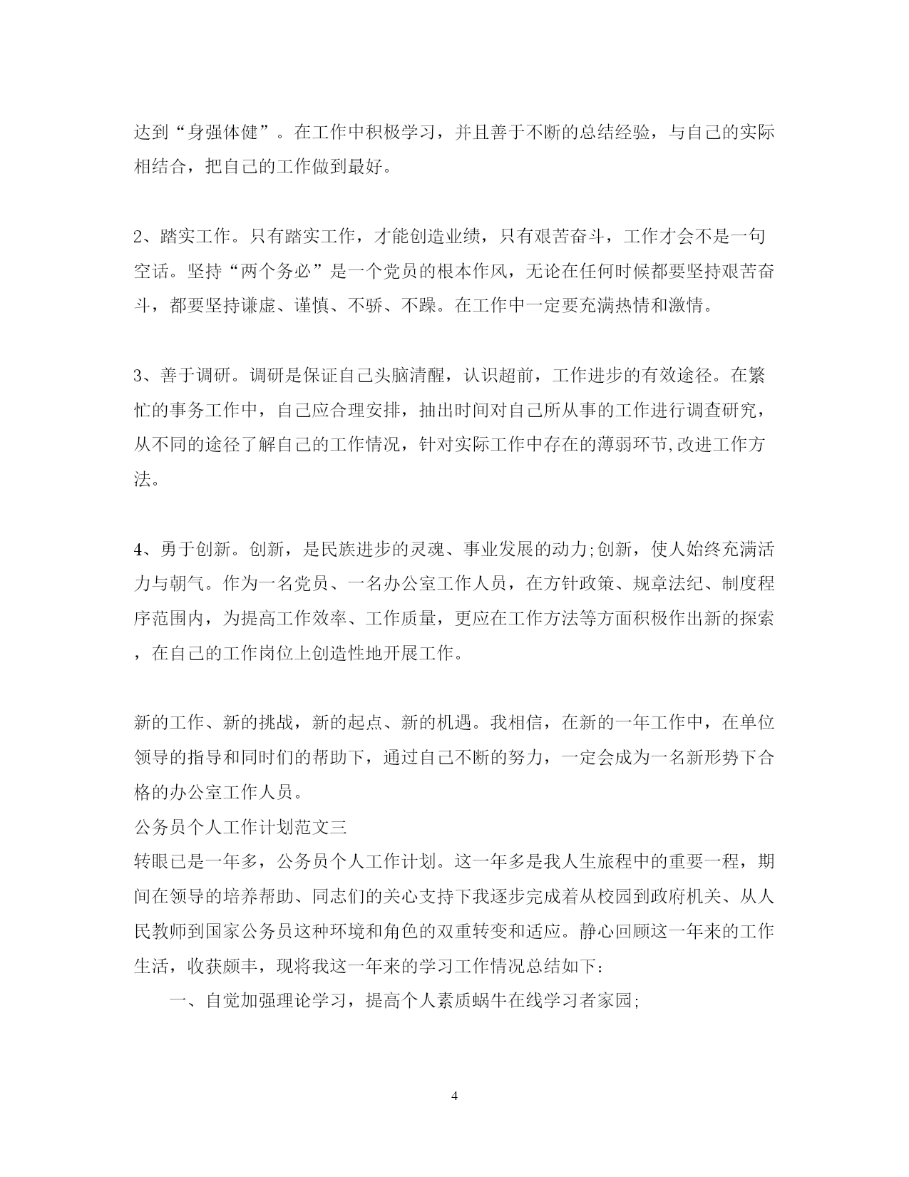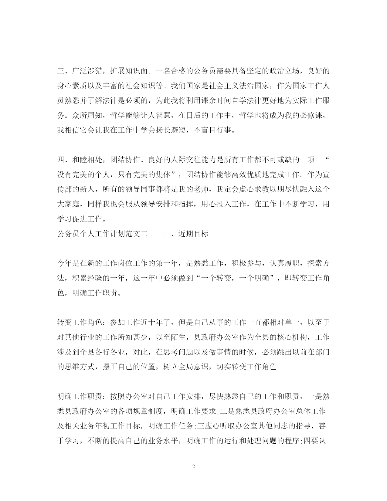 此资料由网络收集而来,如有侵权请告知上传者立即删除。资料共分享,我们负责传递知识。PAGEPAGE7公务员个人工作计划范文工作计划要有切实可行的原则。要从实际情况出发定目标、定任务、定标准,既不要因循守旧,也不要盲目冒进。下面是由范文网小编推荐的公务员个人工作计划范文,欢迎大家阅读。公务员个人工作计划范文一人非生而知之,学而知之也,我现在所掌握的知识都来自于学习,也只有不断的学习,人才能进步。我热爱学习,学习之于我就像是阳光之于植物一般不可缺少,回顾过往的学习,我心存感激,它使我更加了解这个世界。然而,对于一个公务员来说,我深知自己所掌握的知识还远远不够,为了能够尽快地融入宣传部这个大家庭,更好地完成领导和同事交付的事情,我为自己制定了以下学习计划:首先、理论知识的学习对我来说至关重要。从普通人到公务员身份的转变要求我必须掌握足够多的理论知识,为了弥补这一薄弱环节,我准备从以下着手,用心研读xx大报告中关于科学发展观的论述,尽最大努力领悟其内涵,并运用于实际工作中;通过每天观看《新闻联播》,《长安新闻》,阅读人x日报、西安日报、长安开发等报刊杂志以及浏览人x网、长安新闻网最新资讯等方式及时了解国家大政方针,时刻关注时政要闻,以达到提高政治素养和理论水平的目的。二、巩固专业知识,提升工作技能。为了日后工作的顺利开展,夯实并进一步地提高写作功底是当务之急。因此我决定,每周背诵一首唐诗或宋词,提升文学素养;每月至少消化一本理论书籍,并写出学习心得;每年阅读不少于五本名著。我坚信勤能补拙,只要坚持不懈地努力,我的写作水准会一步一步得到提高。21世纪是信息化时代,宣传方式也由原来的单一模式转变为形式多样的多媒体宣传,对此我会要求自己不断充电,学习摄影、视频制作等技术以适应新的宣传方式。三、广泛涉猎,扩展知识面。一名合格的公务员需要具备坚定的政治立场,良好的身心素质以及丰富的社会知识等。我们国家是社会主义法治国家,作为国家工作人员熟悉并了解法律是必须的,为此我将利用课余时间自学法律更好地为实际工作服务。众所周知,哲学能够让人智慧,在日后的工作中,哲学也将成为我的必修课,我相信它会让我在工作中学会扬长避短,不盲目行事。四、和睦相处,团结协作。良好的人际交往能力是所有工作都不可或缺的一项。“没有完美的个人,只有完美的集体”,团结协作能够高效优质地完成工作。作为宣传部的新人,所有的领导同事都将是我的老师,我定会虚心求教以期尽快融入这个大家庭,同样我也会服从领导安排和指挥,用心投入工作,在工作中不断学习,用学习促进工作。公务员个人工作计划范文二一、近期目标今年是在新的工作岗位工作的第一年,是熟悉工作,积极参与,认真履职,探索方法,积累经验的一年,这一年中必须做到“一个转变,一个明确”,即转变工作角色,明确工作职责。转变工作角色:参加工作近十年了,但是自己从事的工作一直都相对单一,以至于对其他行业的工作所知甚少,以至陌生,县政府办公室作为全县的核心机构,工作涉及到全县各行各业,对此,在思考问题以及做事情的时候,必须跳出以前在部门的思维方式,摆正自己的位置,树立全局意识,切实转变工作角色。明确工作职责:按照办公室对自己工作安排,尽快熟悉自己的工作和职责,一是熟悉县政府办公室的各项规章制度,明确工作要求;二是熟悉县政府办公室总体工作及相关业务年初工作目标,明确工作任务;三虚心听取办公室其他同志的指导,善于学习,不断的提高自己的业务水平,明确工作的运行和处理问题的程序;四要认真与科室其他同志总结前期工作,明确工作努力方向。二、中期目标在明确工作职责、工作任务,熟悉工作方的前提下,明年,必须进一步加强自身锤炼,做到政治素质、业务能力、工作绩效“三个提升”。提升政治素质:一是要善于从政治角度看问题。无论面临的情况多么复杂,要坚持从政治角度分析判断问题,保持清醒头脑。二要保持政治敏锐性。密切关注时事、了解时事,通过网络、报刊、电视等,敏锐把握各项方针政策动向,保持工作的主动性。提升业务能力:一是提升写作能力。加强理论学习,注重平时公文写作中的锻炼,注意办公室其他同志撰写材料的学习,能较好完成交办的新文件拟稿任务。二是提升语言表达能力。加强说话训练,做到汇报工作准确、简洁、清楚。提升工作绩效:虚心听取领导、同志、部门等对自己工作的意见和建议,总结经验教训,提高工作效率,优质的完成各项工作。认真做好调研、信息报送等工作,能超额完成办公室下达的工作目标。三、远期目标加强学习,确保思想上的先进和作风上的优良;加强锻炼,促进服务意识和业务水平进一步的提高。服从组织、领导安排,善于思考、积极创新,能独立且出色完成各项工作。四、工作措施1、加强学习。学习是历史使命,选择学习就是选择进步,忽视学习就是忽视进步,放弃