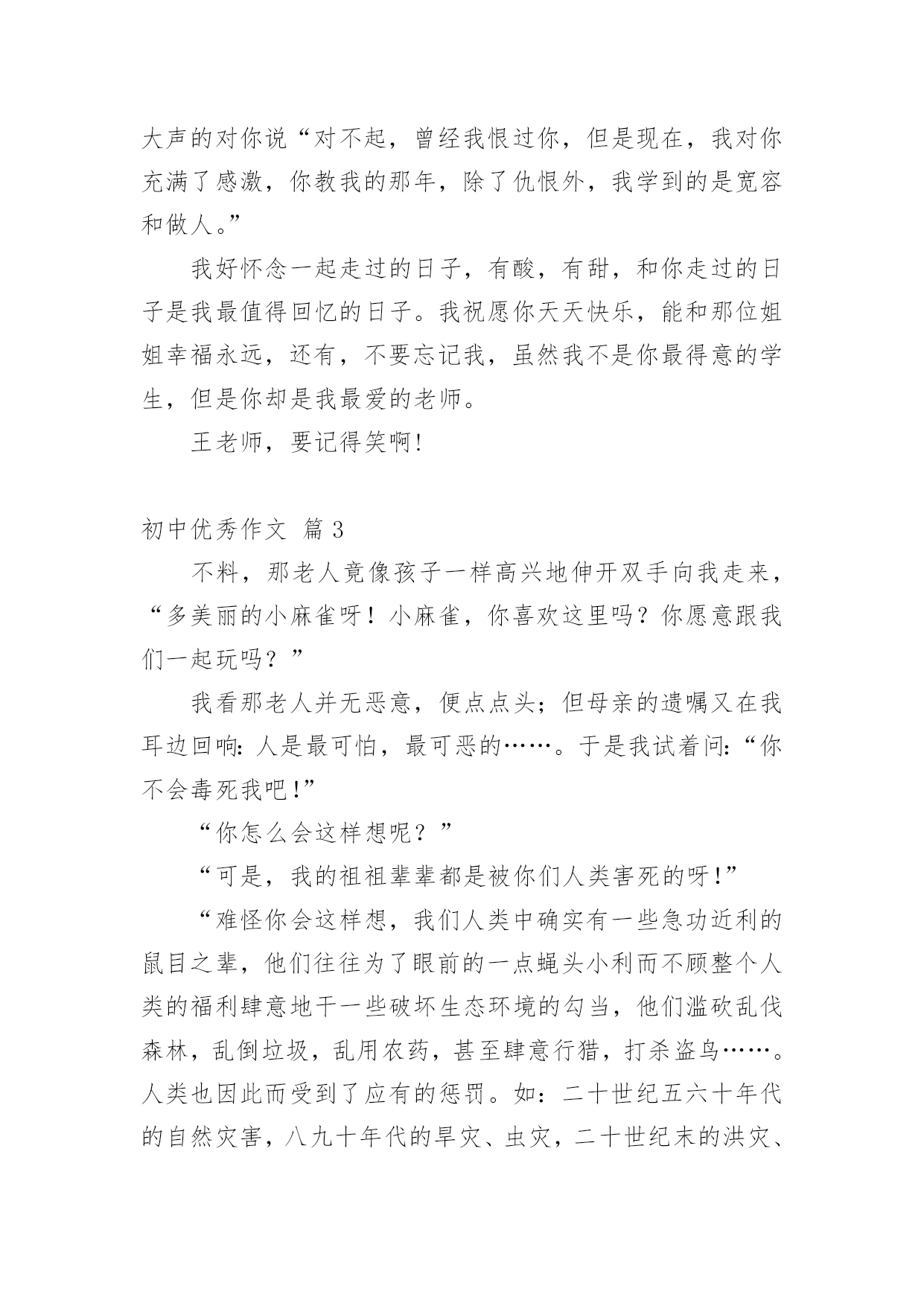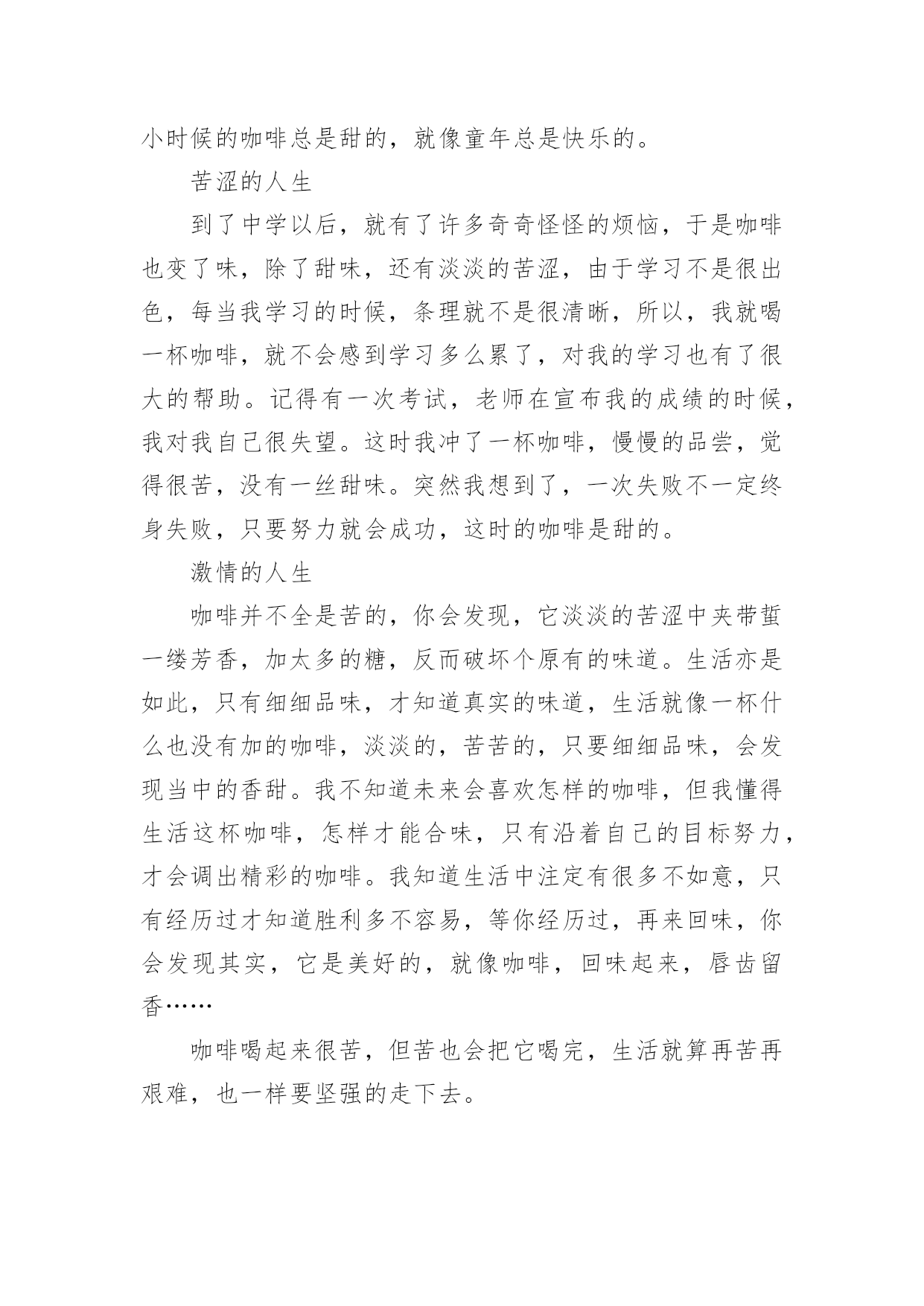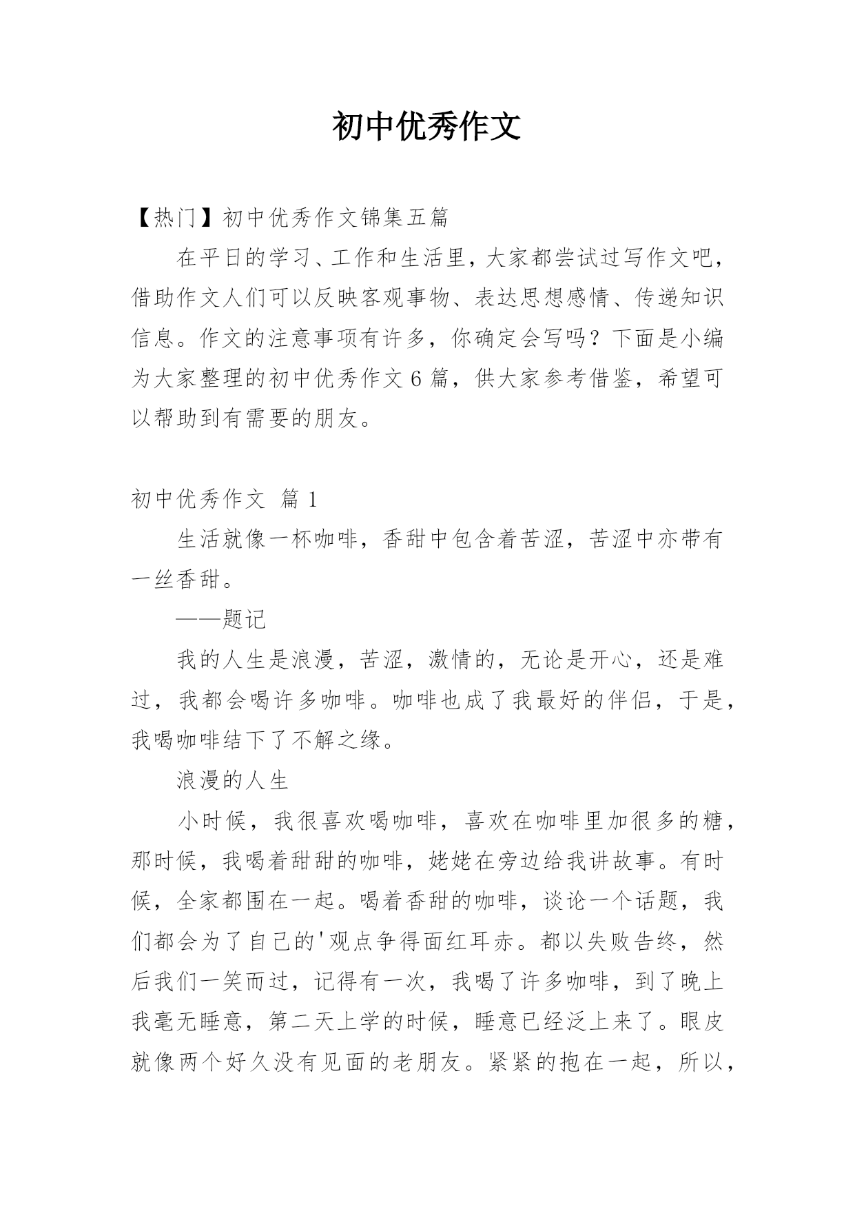 初中优秀作文【热门】初中优秀作文锦集五篇在平日的学习、工作和生活里,大家都尝试过写作文吧,借助作文人们可以反映客观事物、表达思想感情、传递知识信息。作文的注意事项有许多,你确定会写吗?下面是小编为大家整理的初中优秀作文6篇,供大家参考借鉴,希望可以帮助到有需要的朋友。初中优秀作文篇1生活就像一杯咖啡,香甜中包含着苦涩,苦涩中亦带有一丝香甜。——题记我的人生是浪漫,苦涩,激情的,无论是开心,还是难过,我都会喝许多咖啡。咖啡也成了我最好的伴侣,于是,我喝咖啡结下了不解之缘。浪漫的人生小时候,我很喜欢喝咖啡,喜欢在咖啡里加很多的糖,那时候,我喝着甜甜的咖啡,姥姥在旁边给我讲故事。有时候,全家都围在一起。喝着香甜的咖啡,谈论一个话题,我们都会为了自己的'观点争得面红耳赤。都以失败告终,然后我们一笑而过,记得有一次,我喝了许多咖啡,到了晚上我毫无睡意,第二天上学的时候,睡意已经泛上来了。眼皮就像两个好久没有见面的老朋友。紧紧的抱在一起,所以,小时候的咖啡总是甜的,就像童年总是快乐的。苦涩的人生到了中学以后,就有了许多奇奇怪怪的烦恼,于是咖啡也变了味,除了甜味,还有淡淡的苦涩,由于学习不是很出色,每当我学习的时候,条理就不是很清晰,所以,我就喝一杯咖啡,就不会感到学习多么累了,对我的学习也有了很大的帮助。记得有一次考试,老师在宣布我的成绩的时候,我对我自己很失望。这时我冲了一杯咖啡,慢慢的品尝,觉得很苦,没有一丝甜味。突然我想到了,一次失败不一定终身失败,只要努力就会成功,这时的咖啡是甜的。激情的人生咖啡并不全是苦的,你会发现,它淡淡的苦涩中夹带蜇一缕芳香,加太多的糖,反而破坏个原有的味道。生活亦是如此,只有细细品味,才知道真实的味道,生活就像一杯什么也没有加的咖啡,淡淡的,苦苦的,只要细细品味,会发现当中的香甜。我不知道未来会喜欢怎样的咖啡,但我懂得生活这杯咖啡,怎样才能合味,只有沿着自己的目标努力,才会调出精彩的咖啡。我知道生活中注定有很多不如意,只有经历过才知道胜利多不容易,等你经历过,再来回味,你会发现其实,它是美好的,就像咖啡,回味起来,唇齿留香……咖啡喝起来很苦,但苦也会把它喝完,生活就算再苦再艰难,也一样要坚强的走下去。初中优秀作文篇2那年我曾凶狠的诅咒过你,我做梦也想不到我竟会为你的离去而伤心,离去后我才发现我们都是很在乎彼此的。在你教我的那一年中,我学到的是怎样做人。虽然你只大我10岁。对于你的回忆,太多,太复杂,直到现在,我还没有完全了解你。只是,我对你的印象很深刻,以至于想忘都忘不了。刚开学时,你很温和,总是笑,我们看着站在讲台上困窘的你,说笑得更欢了。那时我们班在全校都很有名。(当然不是好名声了!)打架骂人是家常便饭,每个礼拜都有一两起打架事件,说起我们班来,校长的头都胀了。对此,我们当学生的还很自豪。忽然有一天,我无意中发现你有了几根白发,明晃晃的刺进了我的内心,你才24岁啊!军训时,我们很想家,你从不安慰我们,对于我们的眼泪,你假装没看见。只是在我们叫疼喊累时,到打靶场上陪我们跑步,你穿的是皮鞋啊!你看见男生感动得哭了,还是坚持的跑着,仿佛你的终极目的就是要刺痛我们的心,让我们坚持下去。军训很艰苦,你总是带头吃苦,从不抱怨,也不让我们抱怨,每天总是板着一副铁面孔。后来,你打电话给我爸爸妈妈,告诉他们我现在很好,一天比一天有进步,请家长放心。此后,我开始对你有了一些敬意,因为你是关心我们的。那天下午你拖堂到6点半,因为要赶班车,我向你请假不做值日,你不同意,离班车发动的时间只有10分钟了,我非常着急。对于我的乞求,你冰冷的说:“不做完值日不许回家。”说罢,便扭头走了。那一刻,我好恨你的铁石心肠!后来,你曾经暗示过我他的无奈,站在我身后足足有5分钟,我一直低着头,你很尴尬,便走了。第一次月考成绩出来了,我年级699名,望着你不屑的眼神我痛苦极了。你好像是故意伤害刺激我,把前699名的同学叫到办公室进行勉励。我立志期中考试叫你刮目相看,可事与愿违,期中考试我652名,那一刻一种受歧视感遍布我的全身,我要把你当作敌人,我会不惜一切的战胜你,即使牺牲一切!你是我人生中第一个对我不屑一顾的人。恨的力量是伟大的,月考中,我年级377名。你的表情依然平淡。期末考试,我125名。你终于露出了一丝笑意,是对我的笑,对我一个人的笑。我骄傲的望着你。因为,我赢了,你的笑,意味着你输了。你太低估我了,虽然我还会更好。“你总是仇视我吗?”有一次你把我叫到办公室问我。我挑战的注视着你“怎么,不可以吗?总有一天我会叫你屈服,因为你曾经伤害过我的自尊,当然,不只是学习。”我的声音冰冷到极点,你的嘴角动了动,但最终没有说一句话。连我自己也不敢相信我会对老师那样说话,其实我一直很乖,我是一个连蚂蚁也不舍得踩死的人。更重要的是,我是一个阳光女孩。