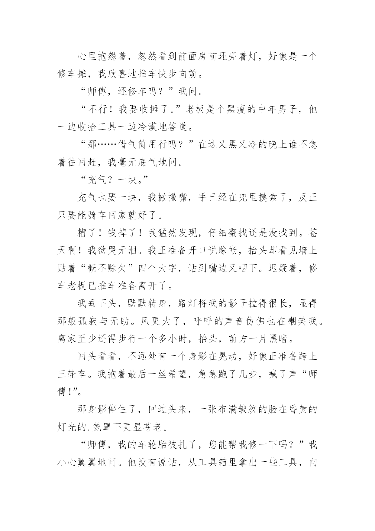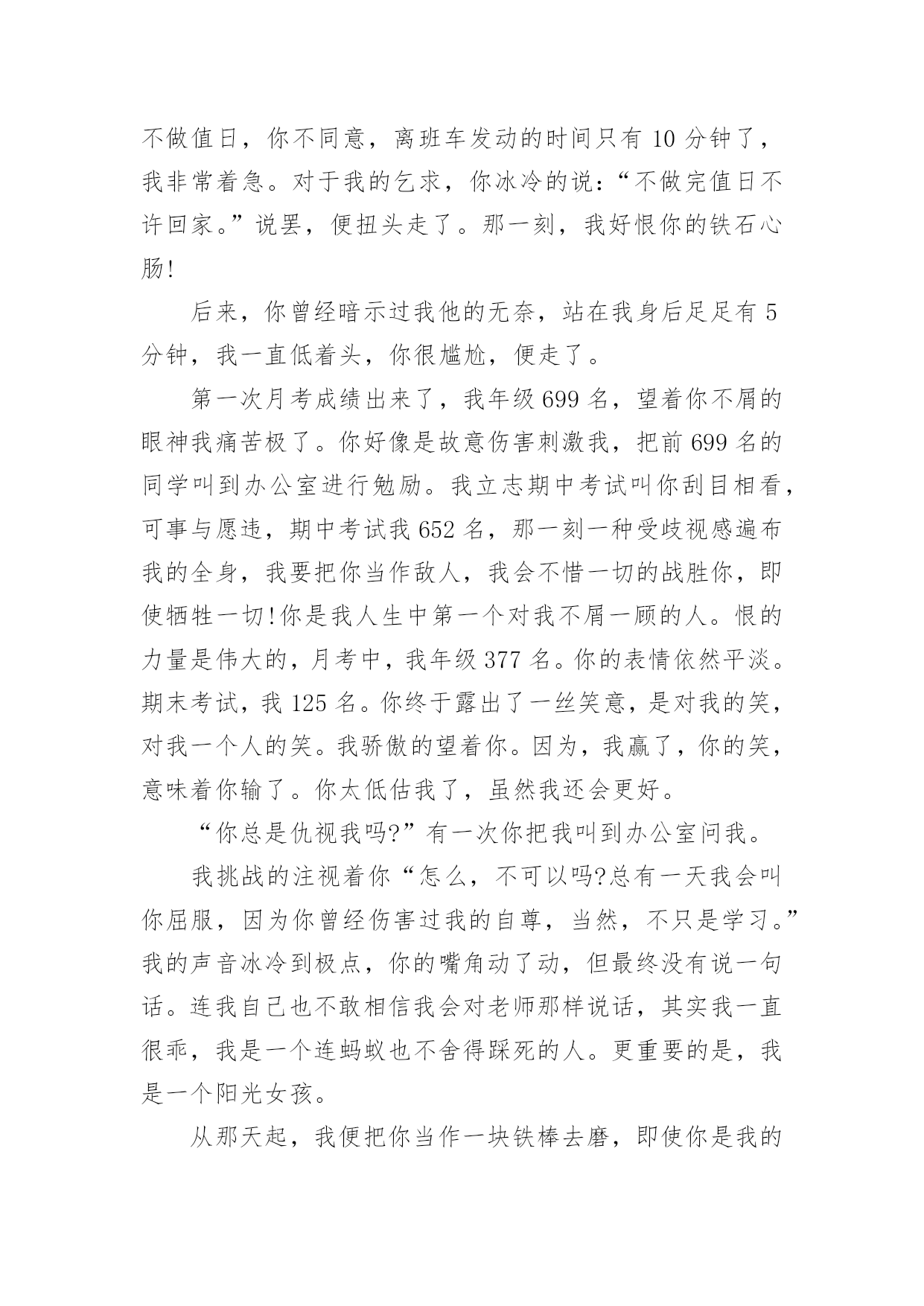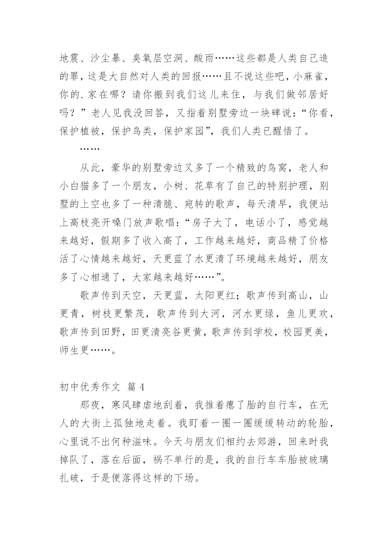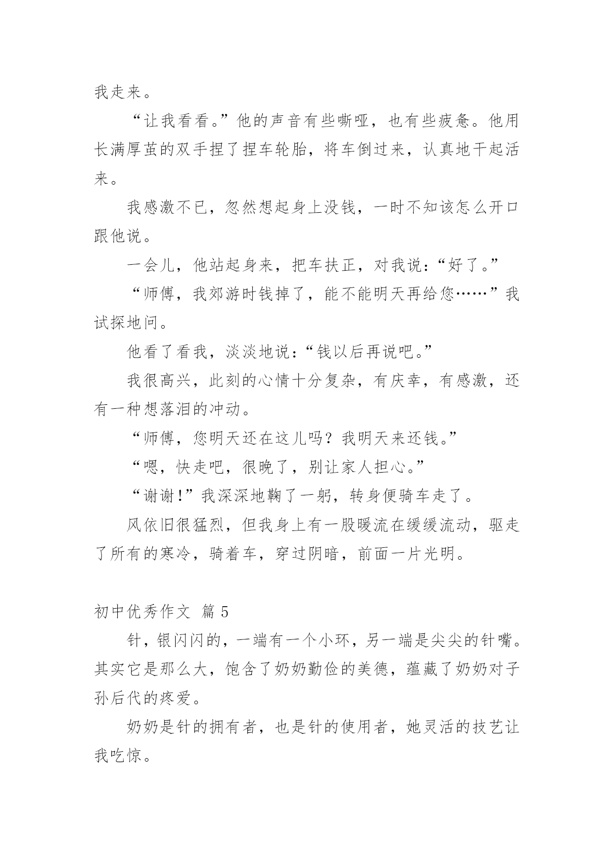 初中优秀作文【热门】初中优秀作文锦集五篇在平日的学习、工作和生活里,大家都尝试过写作文吧,借助作文人们可以反映客观事物、表达思想感情、传递知识信息。作文的注意事项有许多,你确定会写吗?下面是小编为大家整理的初中优秀作文6篇,供大家参考借鉴,希望可以帮助到有需要的朋友。初中优秀作文篇1生活就像一杯咖啡,香甜中包含着苦涩,苦涩中亦带有一丝香甜。——题记我的人生是浪漫,苦涩,激情的,无论是开心,还是难过,我都会喝许多咖啡。咖啡也成了我最好的伴侣,于是,我喝咖啡结下了不解之缘。浪漫的人生小时候,我很喜欢喝咖啡,喜欢在咖啡里加很多的糖,那时候,我喝着甜甜的咖啡,姥姥在旁边给我讲故事。有时候,全家都围在一起。喝着香甜的咖啡,谈论一个话题,我们都会为了自己的'观点争得面红耳赤。都以失败告终,然后我们一笑而过,记得有一次,我喝了许多咖啡,到了晚上我毫无睡意,第二天上学的时候,睡意已经泛上来了。眼皮就像两个好久没有见面的老朋友。紧紧的抱在一起,所以,小时候的咖啡总是甜的,就像童年总是快乐的。苦涩的人生到了中学以后,就有了许多奇奇怪怪的烦恼,于是咖啡也变了味,除了甜味,还有淡淡的苦涩,由于学习不是很出色,每当我学习的时候,条理就不是很清晰,所以,我就喝一杯咖啡,就不会感到学习多么累了,对我的学习也有了很大的帮助。记得有一次考试,老师在宣布我的成绩的时候,我对我自己很失望。这时我冲了一杯咖啡,慢慢的品尝,觉得很苦,没有一丝甜味。突然我想到了,一次失败不一定终身失败,只要努力就会成功,这时的咖啡是甜的。激情的人生咖啡并不全是苦的,你会发现,它淡淡的苦涩中夹带蜇一缕芳香,加太多的糖,反而破坏个原有的味道。生活亦是如此,只有细细品味,才知道真实的味道,生活就像一杯什么也没有加的咖啡,淡淡的,苦苦的,只要细细品味,会发现当中的香甜。我不知道未来会喜欢怎样的咖啡,但我懂得生活这杯咖啡,怎样才能合味,只有沿着自己的目标努力,才会调出精彩的咖啡。我知道生活中注定有很多不如意,只有经历过才知道胜利多不容易,等你经历过,再来回味,你会发现其实,它是美好的,就像咖啡,回味起来,唇齿留香……咖啡喝起来很苦,但苦也会把它喝完,生活就算再苦再艰难,也一样要坚强的走下去。初中优秀作文篇2那年我曾凶狠的诅咒过你,我做梦也想不到我竟会为你的离去而伤心,离去后我才发现我们都是很在乎彼此的。在你教我的那一年中,我学到的是怎样做人。虽然你只大我10岁。对于你的回忆,太多,太复杂,直到现在,我还没有完全了解你。只是,我对你的印象很深刻,以至于想忘都忘不了。刚开学时,你很温和,总是笑,我们看着站在讲台上困窘的你,说笑得更欢了。那时我们班在全校都很有名。(当然不是好名声了!)打架骂人是家常便饭,每个礼拜都有一两起打架事件,说起我们班来,校长的头都胀了。对此,我们当学生的还很自豪。忽然有一天,我无意中发现你有了几根白发,明晃晃的刺进了我的内心,你才24岁啊!军训时,我们很想家,你从不安慰我们,对于我们的眼泪,你假装没看见。只是在我们叫疼喊累时,到打靶场上陪我们跑步,你穿的是皮鞋啊!你看见男生感动得哭了,还是坚持的跑着,仿佛你的终极目的就是要刺痛我们的心,让我们坚持下去。军训很艰苦,你总是带头吃苦,从不抱怨,也不让我们抱怨,每天总是板着一副铁面孔。后来,你打电话给我爸爸妈妈,告诉他们我现在很好,一天比一天有进步,请家长放心。此后,我开始对你有了一些敬意,因为你是关心我们的。那天下午你拖堂到6点半,因为要赶班车,我向你请假不做值日,你不同意,离班车发动的时间只有10分钟了,我非常着急。对于我的乞求,你冰冷的说:“不做完值日不许回家。”说罢,便扭头走了。那一刻,我好恨你的铁石心肠!后来,你曾经暗示过我他的无奈,站在我身后足足有5分钟,我一直低着头,你很尴尬,便走了。第一次月考成绩出来了,我年级699名,望着你不屑的眼神我痛苦极了。你好像是故意伤害刺激我,把前699名的同学叫到办公室进行勉励。我立志期中考试叫你刮目相看,可事与愿违,期中考试我652名,那一刻一种受歧视感遍布我的全身,我要把你当作敌人,我会不惜一切的战胜你,即使牺牲一切!你是我人生中第一个对我不屑一顾的人。恨的力量是伟大的,月考中,我年级377名。你的表情依然平淡。期末考试,我125名。你终于露出了一丝笑意,是对我的笑,对我一个人的笑。我骄傲的望着你。因为,我赢了,你的笑,意味着你输了。你太低估我了,虽然我还会更好。“你总是仇视我吗?”有一次你把我叫到办公室问我。我挑战的注视着你“怎么,不可以吗?总有一天我会叫你屈服,因为你曾经伤害过我的自尊,当然,不只是学习。”我的声音冰冷到极点,你的嘴角动了动,但最终没有说一句话。连我自己也不敢相信我会对老师那样说话,其实我一直很乖,我是一个连蚂蚁也不舍得踩死的人。更重要的是,我是一个阳光女孩。