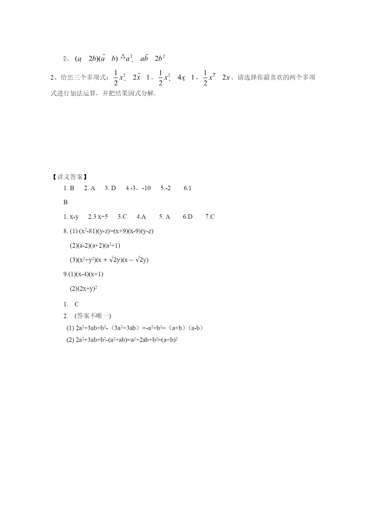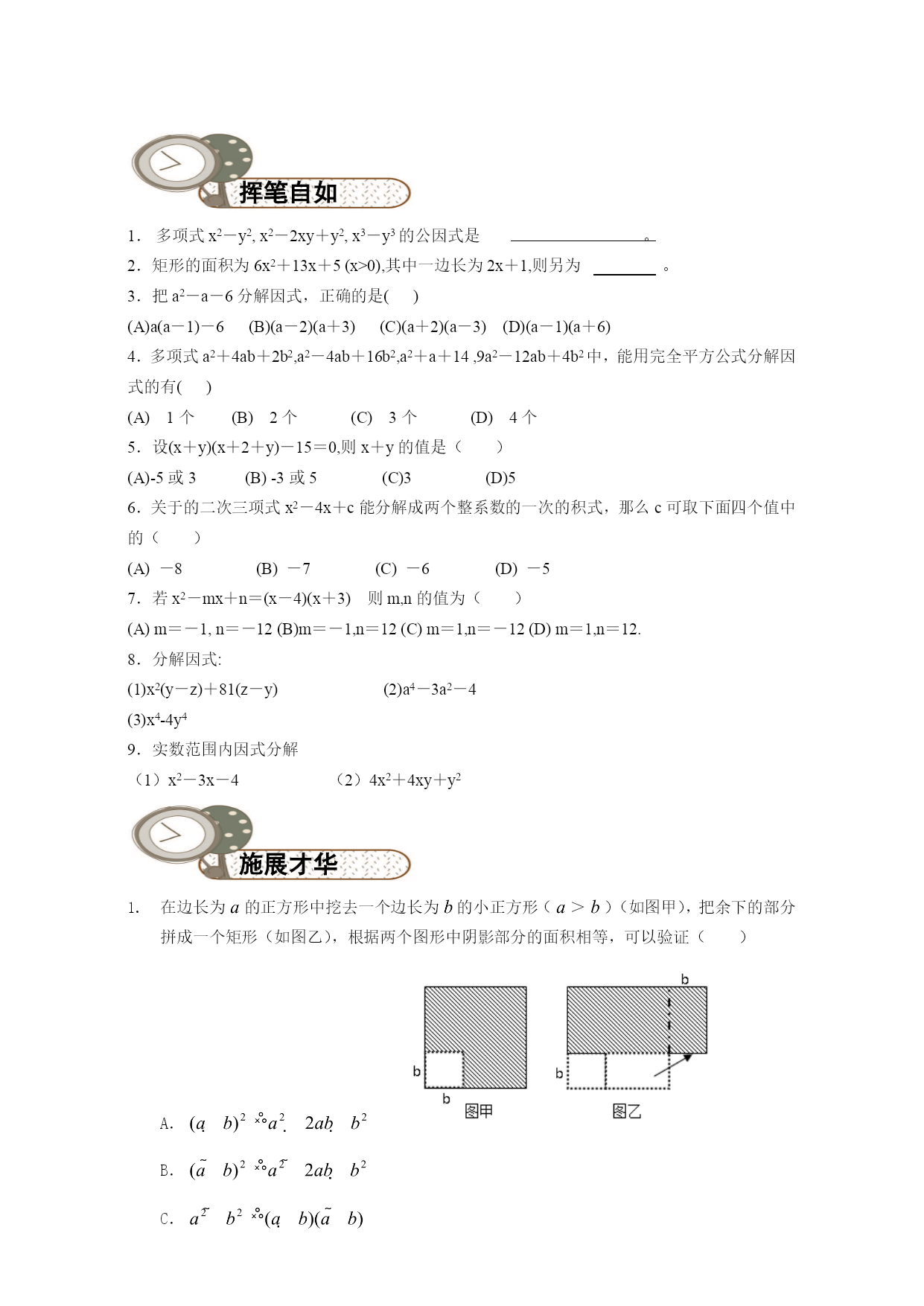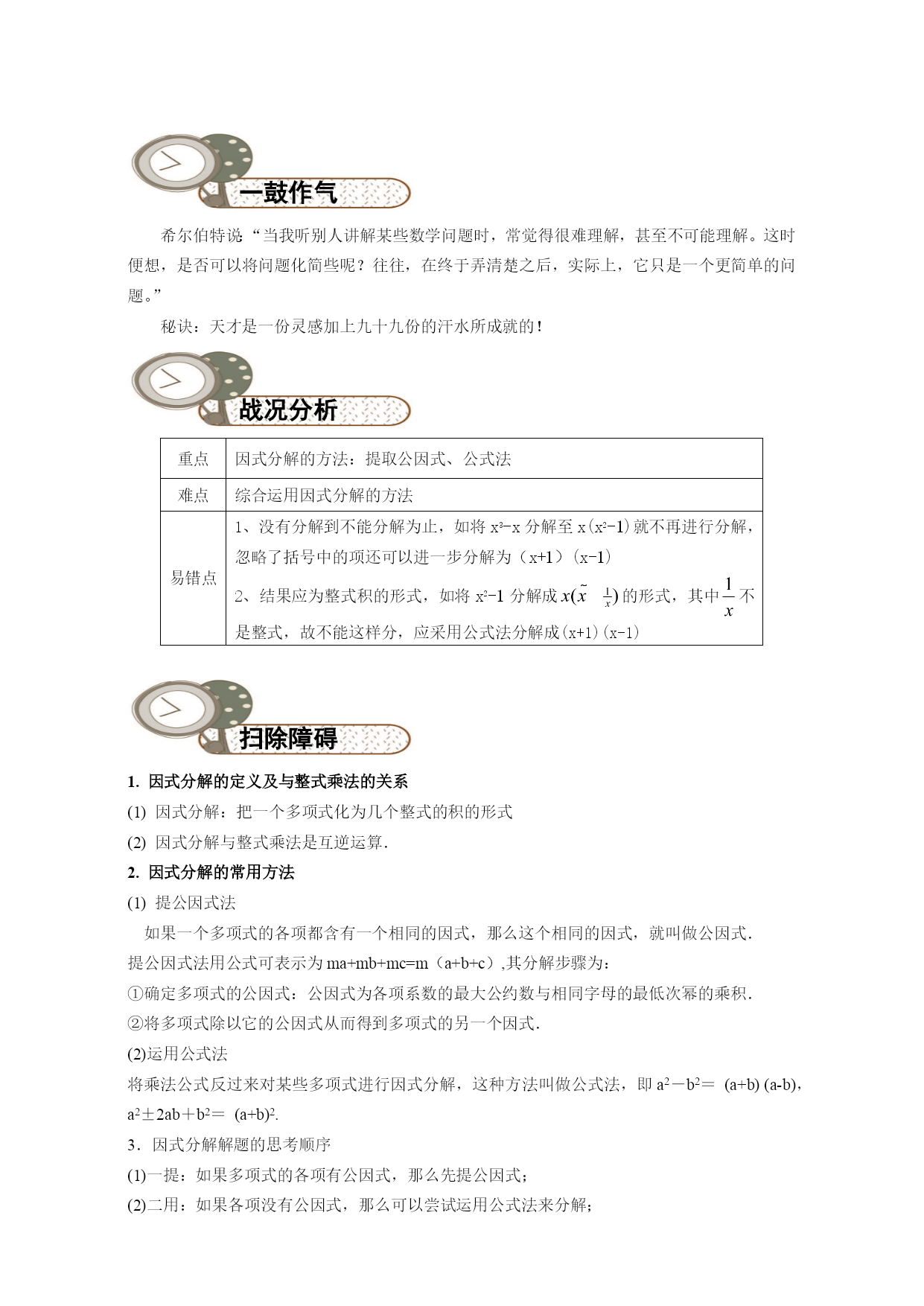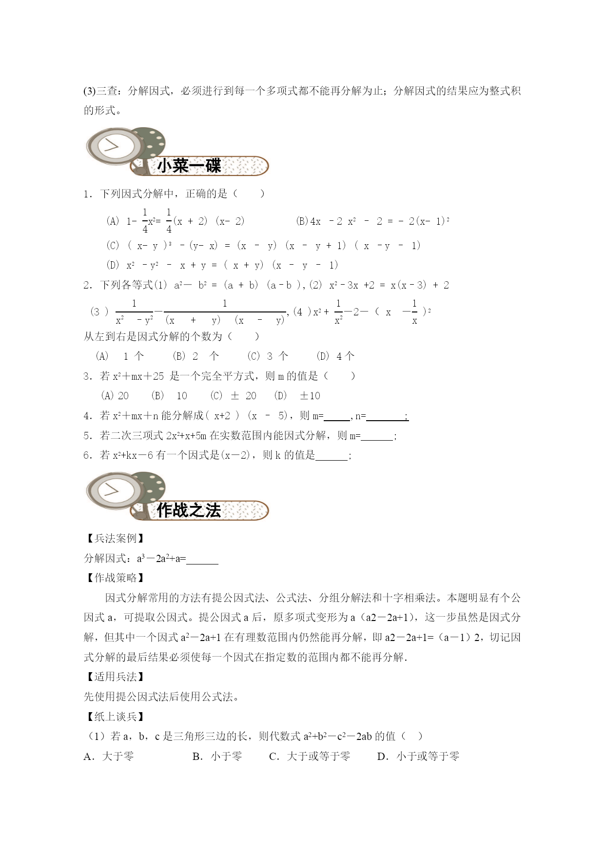 PAGE因式分解两课时(90分钟)学情分析陈**,男,初二上。对数学比较热爱,对于因式分解的各种方法掌握比较好,但是经常忽略因式分解的易错点;对于因式分解的综合应用掌握也不够扎实。应对措施本次课针对因式分解的各种方法来展开,教师除了要指导学生把握基础知识,还要有意识地引导学生观察、归纳,并能灵活地运用因式分解进行实际应用,最终培养学生掌握良好的学习方法,从而达到稳步提高成绩的目标。教学方法练习---归纳—巩固拓展开心一笑一提(公因式)二套(公式)三分组,细看几项不离谱,两项只用平方差,三项十字相乘法,阵法熟练不马虎,四项仔细看清楚,若有三个平方数(项),就用一三来分组,否则二二去分组,五项、六项更多项,二三、三三试分组,以上若都行不通,拆项、添项看清楚。制胜必备1、理解因式分解的概念2、掌握因式分解的基本方法:提取公因式法、公式法等3、能对简单多项式进行因式分解,并结合实际来应用一鼓作气希尔伯特说:“当我听别人讲解某些数学问题时,常觉得很难理解,甚至不可能理解。这时便想,是否可以将问题化简些呢?往往,在终于弄清楚之后,实际上,它只是一个更简单的问题。”秘诀:天才是一份灵感加上九十九份的汗水所成就的!战况分析重点因式分解的方法:提取公因式、公式法难点综合运用因式分解的方法易错点1、没有分解到不能分解为止,如将x3-x分解至x(x2-1)就不再进行分解,忽略了括号中的项还可以进一步分解为(x+1)(x-1)2、结果应为整式积的形式,如将x2-1分解成的形式,其中不是整式,故不能这样分,应采用公式法分解成(x+1)(x-1)扫除障碍1.因式分解的定义及与整式乘法的关系(1)因式分解:把一个多项式化为几个整式的积的形式(2)因式分解与整式乘法是互逆运算.2.因式分解的常用方法(1)提公因式法如果一个多项式的各项都含有一个相同的因式,那么这个相同的因式,就叫做公因式.提公因式法用公式可表示为ma+mb+mc=m(a+b+c),其分解步骤为:①确定多项式的公因式:公因式为各项系数的最大公约数与相同字母的最低次幂的乘积.②将多项式除以它的公因式从而得到多项式的另一个因式.(2)运用公式法将乘法公式反过来对某些多项式进行因式分解,这种方法叫做公式法,即a2-b2=(a+b)(a-b),a2±2ab+b2=(a+b)2.3.因式分解解题的思考顺序(1)一提:如果多项式的各项有公因式,那么先提公因式;(2)二用:如果各项没有公因式,那么可以尝试运用公式法来分解;(3)三查:分解因式,必须进行到每一个多项式都不能再分解为止;分解因式的结果应为整式积的形式。小菜一碟1.下列因式分解中,正确的是()(A)1-EQEQ\F(1,4)x2=EQEQEQ\F(1,4)(x+2)(x-2)(B)4x–2x2–2=-2(x-1)2(C)(x-y)3–(y-x)=(x–y)(x–y+1)(x–y–1)(D)x2–y2–x+y=(x+y)(x–y–1)2.下列各等式(1)a2-b2=(a+b)(a–b),(2)x2–3x+2=x(x–3)+2(3)EQEQ\F(1,x2–y2)EQ-EQ\F(1,(x+y)(x–y)),(4)x2+EQEQ\F(1,x2)-2-(x-EQEQEQ\F(1,x))2从左到右是因式分解的个数为()1个(B)2个(C)3个(D)4个3.若x2+mx+25是一个完全平方式,则m的值是()20(B)10(C)±20(D)±104.若x2+mx+n能分解成(x+2)(x–5),则m=,n=;5.若二次三项式2x2+x+5m在实数范围内能因式分解,则m=;6.若x2+kx-6有一个因式是(x-2),则k的值是;作战之法【兵法案例】分解因式:a3-2a2+a=______【作战策略】因式分解常用的方法有提公因式法、公式法、分组分解法和十字相乘法。本题明显有个公因式a,可提取公因式。提公因式a后,原多项式变形为a(a2-2a+1),这一步虽然是因式分解,但其中一个因式a2-2a+1在有理数范围内仍然能再分解,即a2-2a+1=(a-1)2,切记因式分解的最后结果必须使每一个因式在指定数的范围内都不能再分解.【适用兵法】先使用提公因式法后使用公式法。【纸上谈兵】(1)若a,b,c是三角形三边的长,则代数式a2+b2-c2-2ab的值()A.大于零B.小于零C.大于或等于零D.小于或等于零挥笔自如多项式x2-y2,x2-2xy+y2,x3-y3的公因式是。2.矩形的面积为6x2+13