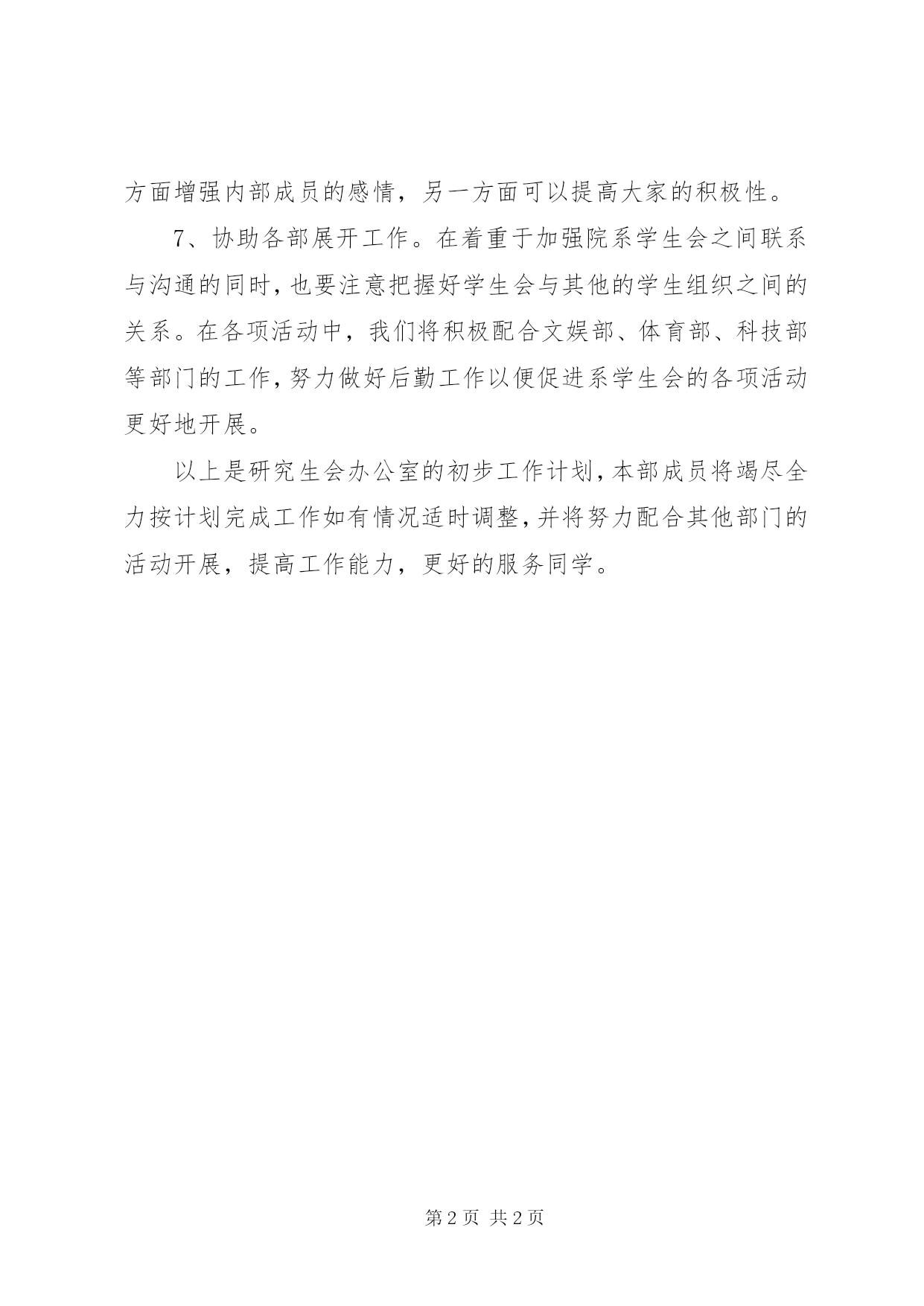 第PAGE\*Arabic\*MERGEFORMAT2页共NUMPAGES\*MERGEFORMAT2页研究生会办公室工作计划金秋将至,我们又迎来了新的一学期,迎接新的挑战。面临繁琐工作,研究生会办公室总结过去经验,展望未来工作,特对2013-2014学年上半学期的工作做了制定与规划。本学期具体计划如下:1、针对本学期各部门的活动安排,负责好文件管理和相关筹备工作。2、信息管理。收集各部门新学期工作计划,交于主席团,审查后存档。我们会做好各部门与主席团的桥梁作用,积极配合主席团的各项工作,努力提高学生会的工作效率。3、对每次例会做好通知、记录,文件传达,并且落实例会的决定,检查催办会议决定的执行情况。及时了解同学们的意见和建议,对合理的意见主动接纳,对不良情况的反映及时进行调查和处理。4、及时申请学生会的办公用品,并且在最短时间内发放到各部。5、完善办公室的各项规章制度。对于日常工作,如会议记录、通知书写、卫生管理、值班、订会等方面继续细致化,细化日常工作,实行个人负责制,任务到人,人人负责,相互协调和配合。6、加强部内成员的相互协作。加强与其他同学的沟通,一方面增强内部成员的感情,另一方面可以提高大家的积极性。7、协助各部展开工作。在着重于加强院系学生会之间联系与沟通的同时,也要注意把握好学生会与其他的学生组织之间的关系。在各项活动中,我们将积极配合文娱部、体育部、科技部等部门的工作,努力做好后勤工作以便促进系学生会的各项活动更好地开展。以上是研究生会办公室的初步工作计划,本部成员将竭尽全力按计划完成工作如有情况适时调整,并将努力配合其他部门的活动开展,提高工作能力,更好的服务同学。