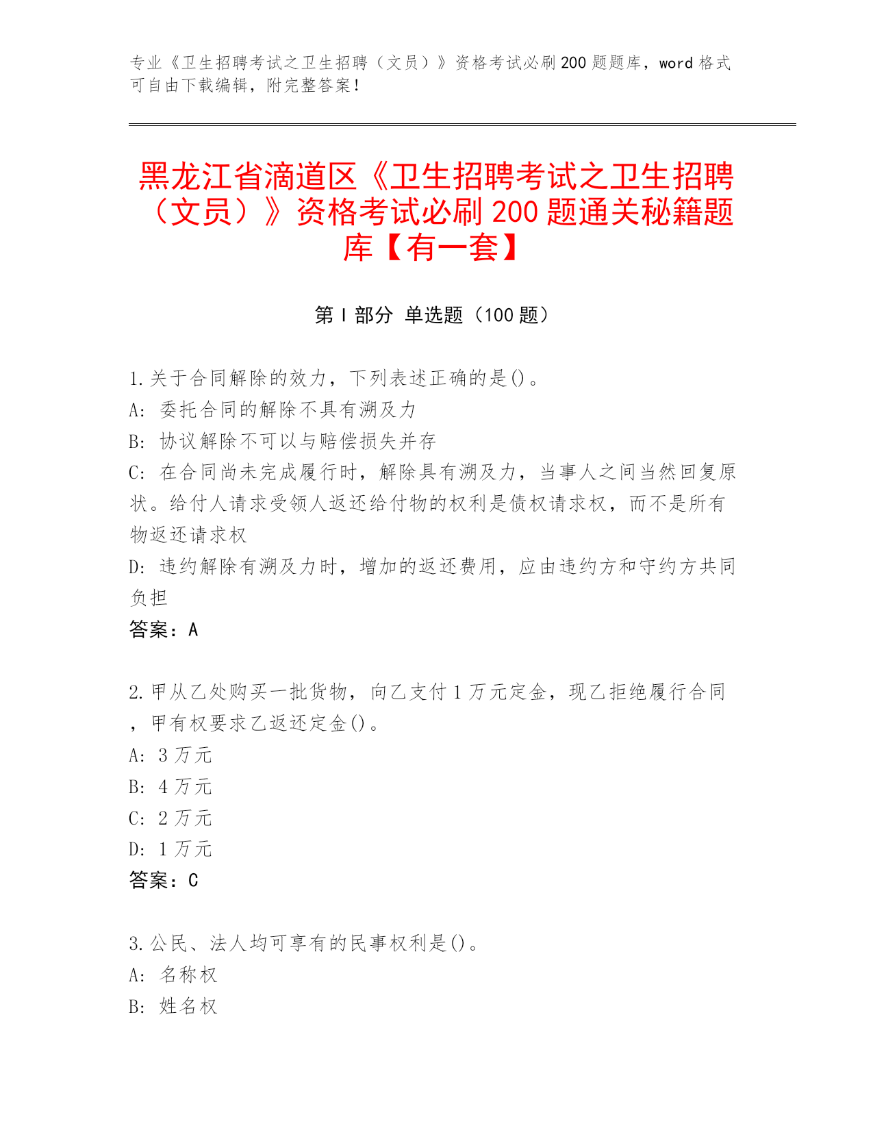黑龙江省滴道区《卫生招聘考试之卫生招聘(文员)》资格考试必刷200题通关秘籍题库【有一套】