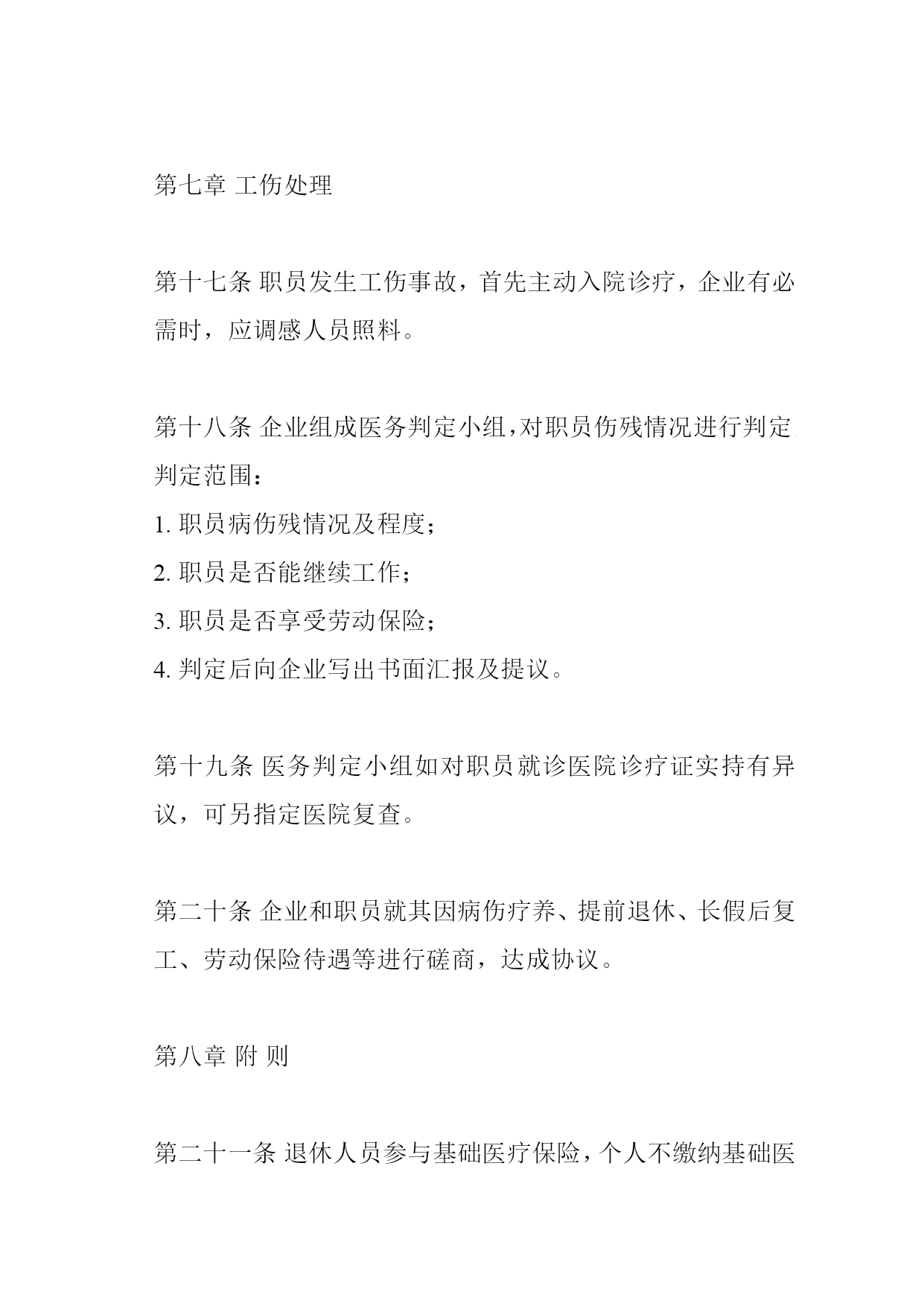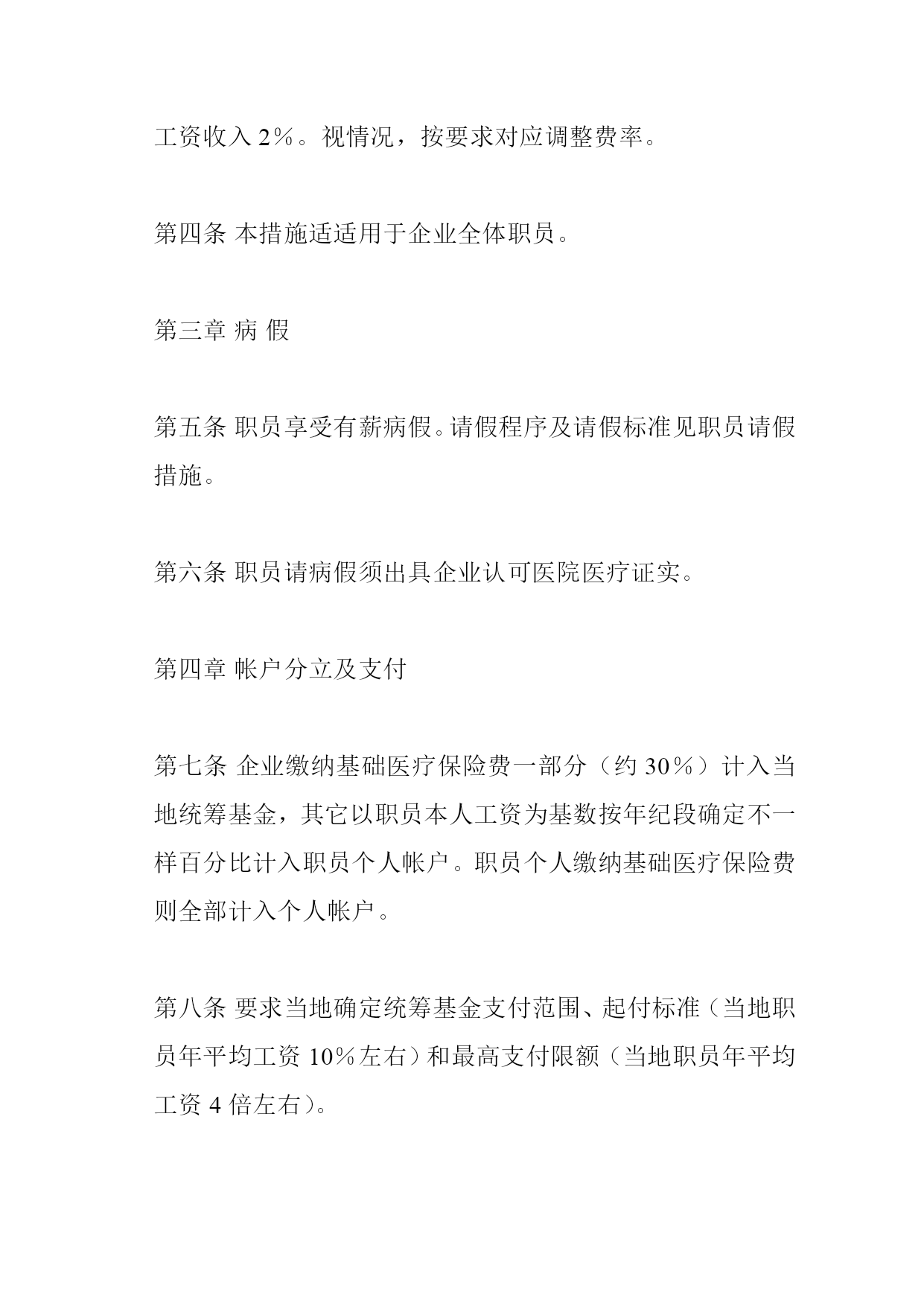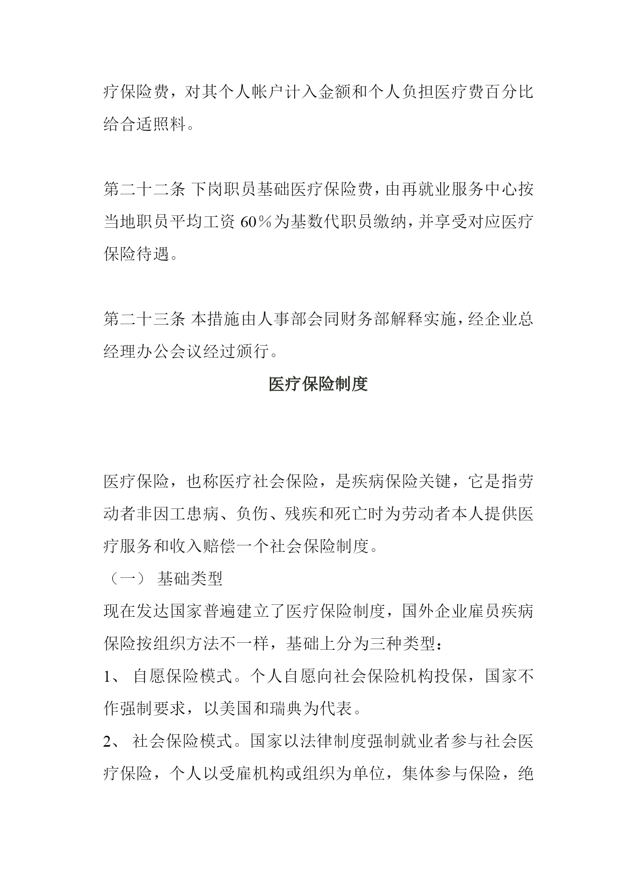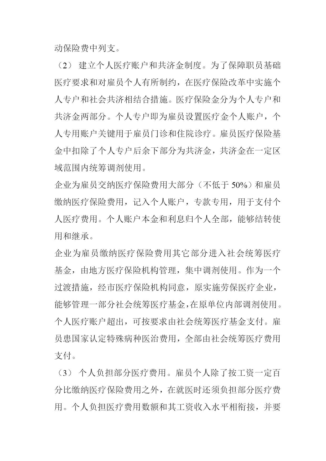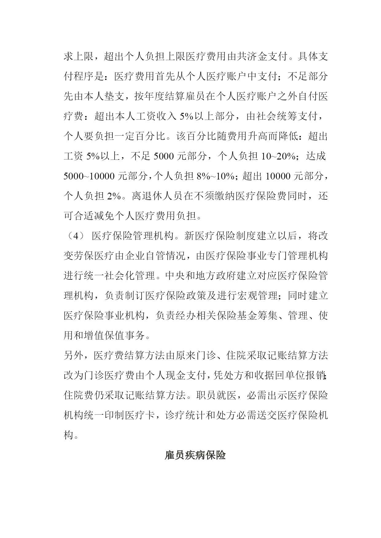 HYPERLINK""\t"_blank"医疗管理措施HYPERLINK""\t"_blank"医疗保险制度中国医疗保险制度改革雇员疾病保险特约医院医疗贷款措施门诊医药费补助措施职员健康检验措施职员医疗补助要求医疗管理措施第一章总则第一条为适应医疗制度改革,降低企业行政费用,提供合理医疗福利条件,特制订本措施。第二章管理标准和范围第二条企业根据国家城镇职员基础医疗保险制度改革精神,按属地化、社会化标准,参与当地基础医疗保险统筹。第三条基础医疗保险费由企业和职员共同缴纳。其中,企业缴费率控制在职员工资总额6%左右,职员缴费控制在本人工资收入2%。视情况,按要求对应调整费率。第四条本措施适适用于企业全体职员。第三章病假第五条职员享受有薪病假。请假程序及请假标准见职员请假措施。第六条职员请病假须出具企业认可医院医疗证实。第四章帐户分立及支付第七条企业缴纳基础医疗保险费一部分(约30%)计入当地统筹基金,其它以职员本人工资为基数按年纪段确定不一样百分比计入职员个人帐户。职员个人缴纳基础医疗保险费则全部计入个人帐户。第八条要求当地确定统筹基金支付范围、起付标准(当地职员年平均工资10%左右)和最高支付限额(当地职员年平均工资4倍左右)。统筹基金起付标准以下医疗费由个人帐户支付,不足部分由个人自付。起付标准以上、最高支付限额以下医疗费,关键从统筹基金中支付,职员个人也应负担一定百分比。第九条超出最高支付限额以上医疗费,不由统筹基金支付,企业可参与企业补充医疗保险或商业医疗保险处理。补充医疗保险在工资总额4%以内部分,从职员福利费中列支。福利费不足列支部分经财政部门核准后列入成本。第五章医疗费报销范围第十条企业应根据当地社会医疗保险部门公布就医和购药清单确定可报销或不可报销范围。企业定时向职员公布。第十一条通常而言,企业暂确定以下标准:1.下列费用属报销范围:药品费、住院费、理疗费、注射费、手术费、检验费、X光透射费、照片费、计划生育费、接生费(独生)、针灸费、敷料费、住院煎药费、危重输血费、企业体检费。2.下列费用不属报销范围:挂号费,出诊费,门诊煎药费,押瓶费,装配假眼、牙齿、假肢、皮钢背甲、腰围、眼镜、胃托、鞋垫、拐杖、助听器,割狐臭,矫形,整容,证书费,配药用肉、鸡、酒、蛋、蜂蜜、桂圆等,取暖费,陪侍费,转院费,特护费,娩期婴儿护理费,环卫防疫设备费,医学研究费,和违法乱纪造成伤害、酗酒、自杀发生抢救住院费,体检性质X光透视、照片,通常报考学校、出国、进修、婚前检验费用。第六章医疗程序第十二条职员须到企业指定或认可医院就诊。第十三条依据医生诊疗证实,决定病假、住院、转院等,并立即向人事部通报。第十四条病愈或长病者中填报医疗费报销单,经人事、财务部审查、审核,报总经理同意。第十五条病假期职员应和其主管保持联络,使企业了解其健康情况。第十六条病愈后交付医院证实,回本部门安排继续工作。第七章工伤处理第十七条职员发生工伤事故,首先主动入院诊疗,企业有必需时,应调感人员照料。第十八条企业组成医务判定小组,对职员伤残情况进行判定,判定范围:1.职员病伤残情况及程度;2.职员是否能继续工作;3.职员是否享受劳动保险;4.判定后向企业写出书面汇报及提议。第十九条医务判定小组如对职员就诊医院诊疗证实持有异议,可另指定医院复查。第二十条企业和职员就其因病伤疗养、提前退休、长假后复工、劳动保险待遇等进行磋商,达成协议。第八章附则第二十一条退休人员参与基础医疗保险,个人不缴纳基础医疗保险费,对其个人帐户计入金额和个人负担医疗费百分比给合适照料。第二十二条下岗职员基础医疗保险费,由再就业服务中心按当地职员平均工资60%为基数代职员缴纳,并享受对应医疗保险待遇。第二十三条本措施由人事部会同财务部解释实施,经企业总经理办公会议经过颁行。医疗保险制度医疗保险,也称医疗社会保险,是疾病保险关键,它是指劳动者非因工患病、负伤、残疾和死亡时为劳动者本人提供医疗服务和收入赔偿一个社会保险制度。(一)基础类型现在发达国家普遍建立了医疗保险制度,国外企业雇员疾病保险按组织方法不一样,基础上分为三种类型:1、自愿保险模式。个人自愿向社会保险机构投保,国家不作强制要求,以美国和瑞典为代表。2、社会保险模式。国家以法律制度强制就业者参与社会医疗保险,个人以受雇机构或组织为单位,集体参与保险,绝大多数国家实施这一个医疗保险模式。3、全方面保险模式。国家强制全体社会组员参与社会医疗保险,以英国和欧洲部分福利国家为代表。多数国家医疗保险由国家举行或委托其它代理机构,不以营利为目标。医疗保险费用起源由保险性质决定,社会福利性强政府投入比重大,集体福利性强企业缴费比重大,不然,则个人缴费比重大。比如,在英国国民保健服务费用中,国家负担88%;部分国家