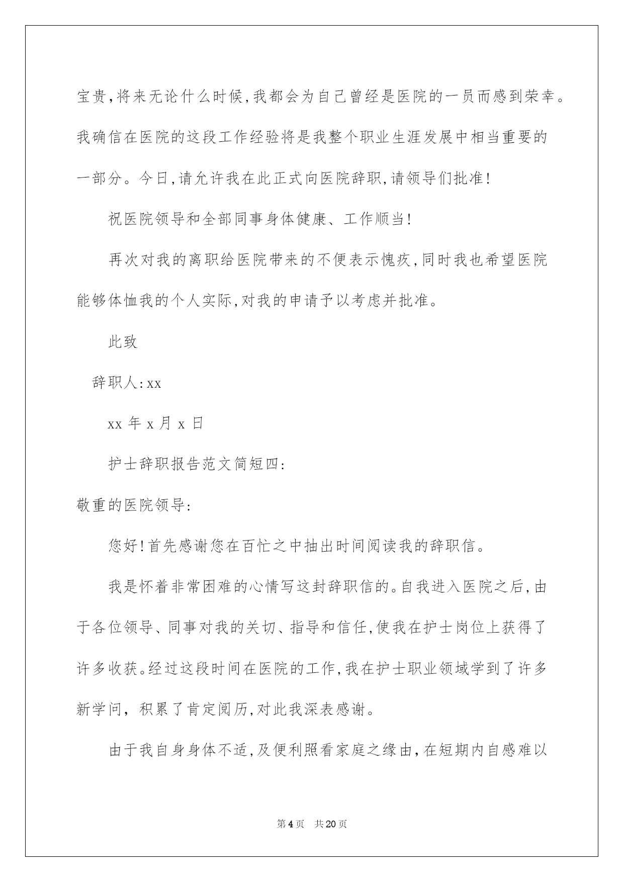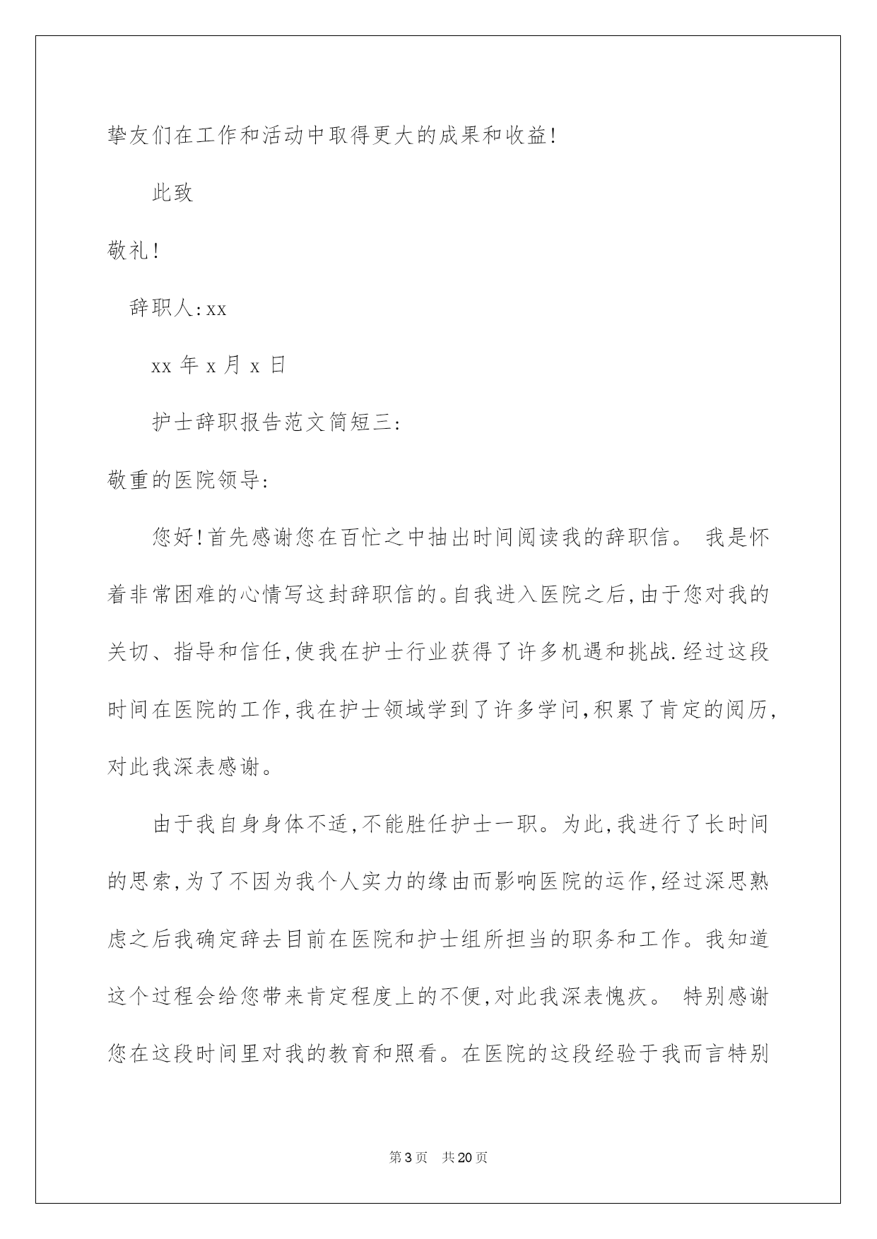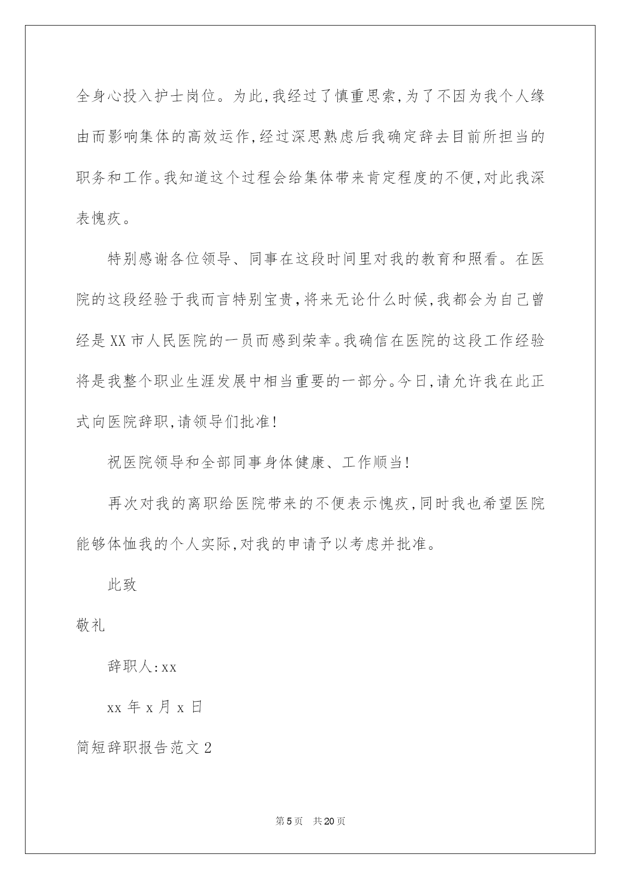 第PAGE\*Arabic\*MERGEFORMAT20页共NUMPAGES\*Arabic\*MERGEFORMAT20页第PAGE\*MERGEFORMAT20页共NUMPAGES\*MERGEFORMAT20页第PAGE\*MERGEFORMAT20页共NUMPAGES\*MERGEFORMAT20页第PAGE\*MERGEFORMAT20页共NUMPAGES\*MERGEFORMAT20页第PAGE\*MERGEFORMAT20页共NUMPAGES\*MERGEFORMAT20页第PAGE\*MERGEFORMAT20页共NUMPAGES\*MERGEFORMAT20页第PAGE\*MERGEFORMAT20页共NUMPAGES\*MERGEFORMAT20页第PAGE\*MERGEFORMAT20页共NUMPAGES\*MERGEFORMAT20页第PAGE\*MERGEFORMAT20页共NUMPAGES\*MERGEFORMAT20页第PAGE\*MERGEFORMAT20页共NUMPAGES\*MERGEFORMAT20页第PAGE\*MERGEFORMAT20页共NUMPAGES\*MERGEFORMAT20页2022简短辞职报告简短辞职报告范文进入一家公司一段时间后,有时会因为一些缘由离开岗位,这也意味着,须要写辞职报告了。辞职报告怎么写才合适呢?下面是我收集整理的简短辞职报告范文,希望能够帮助到大家。简短辞职报告范文1敬重的领导:您好!首先感谢您在百忙中抽出时间阅读我的辞职信。我是怀着非常的心情写这封辞职信的。自我进入医院之后,由于您对我的关切、指导和信任,使我在护士行业获得了许多机遇和挑战。经过这段时间在医院的工作,我在护士领域学到了许多学问,积累了肯定的阅历,对此我深表感谢。我已打算好离职,并且做好工作交接,以削减因我的离职而给医院带来的不便。特别感谢您在这段时间里对我的教育和照看。在医院的这段经验于我而言特别宝贵。将来无论什么时候,我都会为自己曾经是医院的一员而感到荣幸。我确信在医院的这段工作经验将是我整个职业生涯发展中重要的一部分。再次对我的离职给医院带来的不便表示愧疚,对我的申请予以考虑并批准。祝医院领导和所以同事身体健康、工作顺当!此致敬礼辞职人:xxxx年x月x日护士辞职报告范文简短二:敬重的医院领导:在递交这份辞职申请时,我的心情非常沉重。现在医院的发展须要大家全力以赴,现在由于我的一些个人缘由的影响,无法为公司做出相应的贡献。因此恳求允许离开。当前医院正处于繁忙的阶段,同事都是斗志昂扬,壮志满怀,而我在这时候却因个人缘由无法为医院分忧,实在是深感歉意。我希望医院领导在百忙之中抽出时间商议一下工作交接问题。本人在20xx年x月xx日申请离职,希望能得到医院领导的准许!感谢诸位在我在医院期间赐予我的信任和支持,并祝全部同事和挚友们在工作和活动中取得更大的成果和收益!此致敬礼!辞职人:xxxx年x月x日护士辞职报告范文简短三:敬重的医院领导:您好!首先感谢您在百忙之中抽出时间阅读我的辞职信。我是怀着非常困难的心情写这封辞职信的。自我进入医院之后,由于您对我的关切、指导和信任,使我在护士行业获得了许多机遇和挑战.经过这段时间在医院的工作,我在护士领域学到了许多学问,积累了肯定的阅历,对此我深表感谢。由于我自身身体不适,不能胜任护士一职。为此,我进行了长时间的思索,为了不因为我个人实力的缘由而影响医院的运作,经过深思熟虑之后我确定辞去目前在医院和护士组所担当的职务和工作。我知道这个过程会给您带来肯定程度上的不便,对此我深表愧疚。特别感谢您在这段时间里对我的教育和照看。在医院的这段经验于我而言特别宝贵,将来无论什么时候,我都会为自己曾经是医院的一员而感到荣幸。我确信在医院的这段工作经验将是我整个职业生涯发展中相当重要的一部分。今日,请允许我在此正式向医院辞职,请领导们批准!祝医院领导和全部同事身体健康、工作顺当!再次对我的离职给医院带来的不便表示愧疚,同时我也希望医院能够体恤我的个人实际,对我的申请予以考虑并批准。此致辞职人:xxxx年x月x日护士辞职报告范文简短四:敬重的医院领导:您好!首先感谢您在百忙之中抽出时间阅读我的辞职信。我是怀着非常困难的心情写这封辞职信的。自我进入医院之后,由于各位领导、同事对我的关切、指导和信任,使我在护士岗位上获得了许多收获。经过这段时间在医院的工作,我在护士职业领域学到了许多新学问,积累了肯定阅历,对此我深表感谢。由于我自身身体不适,及便利照看家庭之缘由,在短期内自感难以全身心投入护士岗位。为此,我经过了慎重