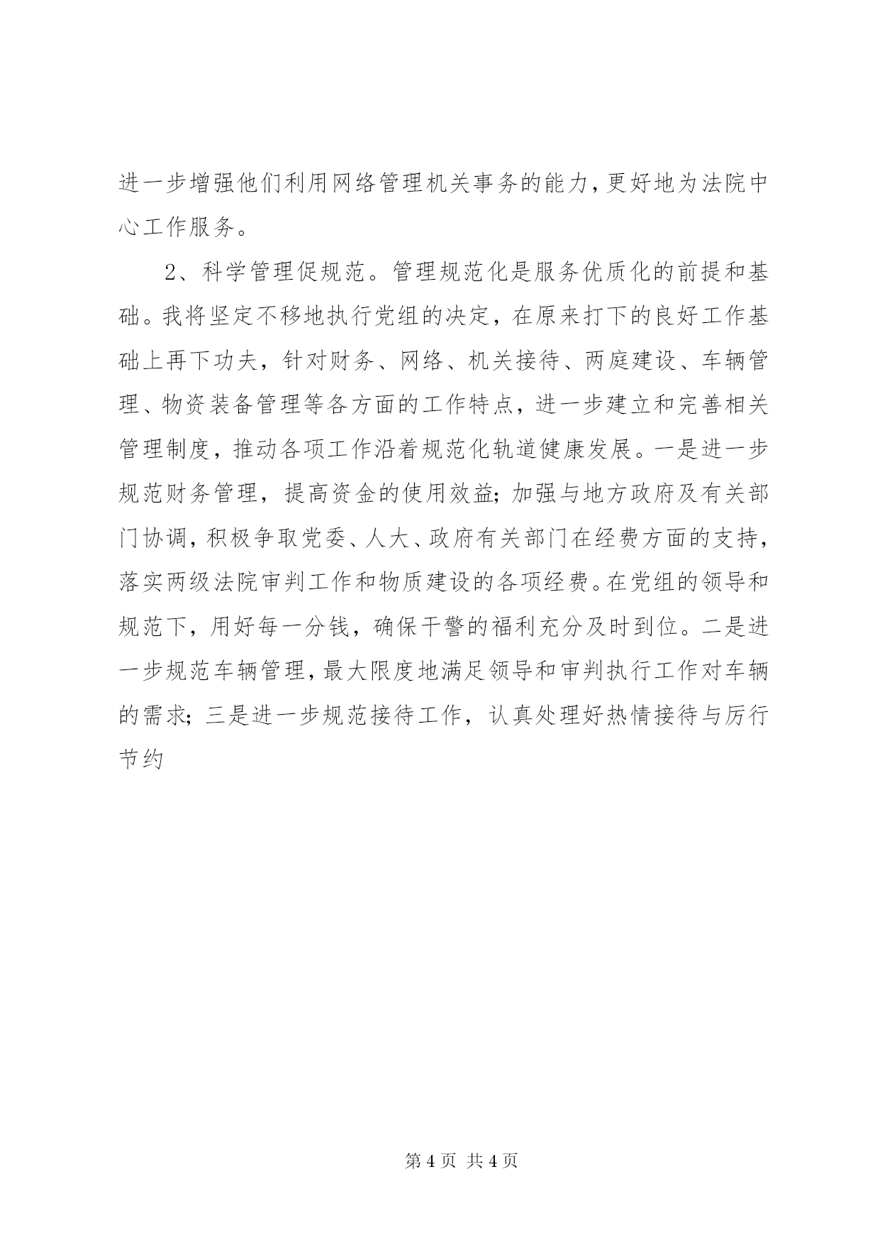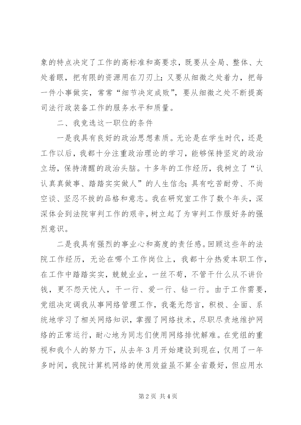 第PAGE\*Arabic\*MERGEFORMAT4页共NUMPAGES\*MERGEFORMAT4页竞聘司法行政处长演讲材料文章标题:竞聘司法行政处长演讲材料尊敬的各位领导、各位同事。大家好。院党组决定对部分中层领导职位实行竞争上岗,这是法院干部人事制度改革的一项重大举措,我十分珍视这次机会,并以报名参加竞争的实际行动来拥护党组决定。同时,也感谢各位同事、朋友的鼓励和支持,使我有信心在参与中检验自己的能力、水平,激励自己更加奋发努力做好工作。我这次竞选的职位是司法行政装备管理处处长。我的演讲主要有以下三点:一是我对司法行政装备管理工作的认识;二是我竞选这一职位所特有的条件;三是工作目标和措施。一、我对法院司法行政装备管理工作的认识司法行政装备管理工作的目的就是为审判工作服务,具体来讲就是“四个服务”,全心全意为基层法院服务,为审判业务服务,为领导决策服务,为机关工作人员服务。要搞好司法行政工作必须履行好六大职责,一是履行财务管理职责,为法院工作作好经费保障;二是履行物质装备管理职责,为审判工作提供技术手段;三是履行物业管理职责,为审判工作营造良好环境;四是履行机关接待职责,做到热情接待与节约开支相结合;五是履行机关后勤事务管理职责;六是履行指导基层法院人民法庭和审判庭建设及其他相关工作。司法行政装备工作的服务方向、服务对象的特点决定了工作的高标准和高要求,既要从全局、整体、大处着眼,把有限的资源用在刀刃上;又要从细微之处着力,把每一件小事做实,常常“细节决定成败”,要从细微之处不断提高司法行政装备工作的服务水平和质量。二、我竞选这一职位的条件一是我具有良好的政治思想素质。无论是在学生时代,还是工作以后,我都十分注重政治理论的学习,能够保持坚定的政治立场,保持清醒的政治头脑。十多年的工作经历,我树立了“认认真真做事、踏踏实实做人”的人生信念;具有吃苦耐劳、不尚空谈、坚忍不拔的品格和意志。我在研究室工作了数个年头,深深体会到法院审判工作的艰辛,树立起了为审判工作服好务的强烈意识。二是我具有强烈的事业心和高度的责任感。回顾这些年的法院工作经历,无论在哪个工作岗位上,我都十分热爱本职工作,在工作中踏踏实实,兢兢业业,一丝不苟,不管干什么从不讲价钱,更不怨天忧人,干一行、爱一行、钻一行。由于工作需要,党组决定调我从事网络管理工作,我毫无怨言,积极、全面、系统地学习了相关网络知识,掌握了网络技术,尽职尽责地维护网络的正常运行,耐心地为同志们使用网络排忧解难。在党组的重视和我个人的努力下,从去年3月开始建设到现在,仅用了一年多时间,我院计算机网络的使用效益虽不算全省最好,但应用水平也还是名列前茅,去年获得了省法院的法院信息化建设先进单位。三是我具有搞好司法行政工作所需的合理知识结构。首先,我具有较为坚实的法律专业知识,对法院的审判业务较为熟悉,就审判工作对司法行政工作的要求有较深刻的认识;其次,网络管理工作经历,使我对如何利用现代技术提高法院工作的科技含量,提高司法行政管理的质量和效率有较为全面的把握,能为司法行政工作的现代化提供较好的技术支撑。局域网管理、设备维护、网站管理等工作目前我已胜任。网络功能的进一步开发,还任重道远,但只要有领导的重视,有全院干警的支持,我有决心、有信心,可以把工作做得更出色。三、我的工作目标和措施我们的司法行政装备管理工作相比全国法院系统还处于一个比较落后的位置。只有加快步伐,才能赶上先进法院。我如果能通过竞争上岗,将从以下六个方面入手抓司法行政工作:1、加强学习强素质。俗话道“业精于勤毁于随”。我将持之以恒、坚持不懈地抓好学习,坚持用科学的理论武装头脑,用专业知识的积累增强能力,不断提高自己的政治素质和业务素质。同时,认真履行一名中层机构负责人带队伍的政治责任,以多种有效的形式组织开展各种学习教育活动,最主要的是发挥我自己具有较强的计算机操作技能的优势,加强对同志们的辅导和培训,进一步增强他们利用网络管理机关事务的能力,更好地为法院中心工作服务。2、科学管理促规范。管理规范化是服务优质化的前提和基础。我将坚定不移地执行党组的决定,在原来打下的良好工作基础上再下功夫,针对财务、网络、机关接待、两庭建设、车辆管理、物资装备管理等各方面的工作特点,进一步建立和完善相关管理制度,推动各项工作沿着规范化轨道健康发展。一是进一步规范财务管理,提高资金的使用效益;加强与地方政府及有关部门协调,积极争取党委、人大、政府有关部门在经费方面的支持,落实两级法院审判工作和物质建设的各项经费。在党组的领导和规范下,用好每一分钱,确保干警的福利充分及时到位。二是进一步规范车辆管理,最大限度地满足领导和审判执行工作对车辆的需求;三是进一步规范接待工作,认真处理好热情接待与厉行节约