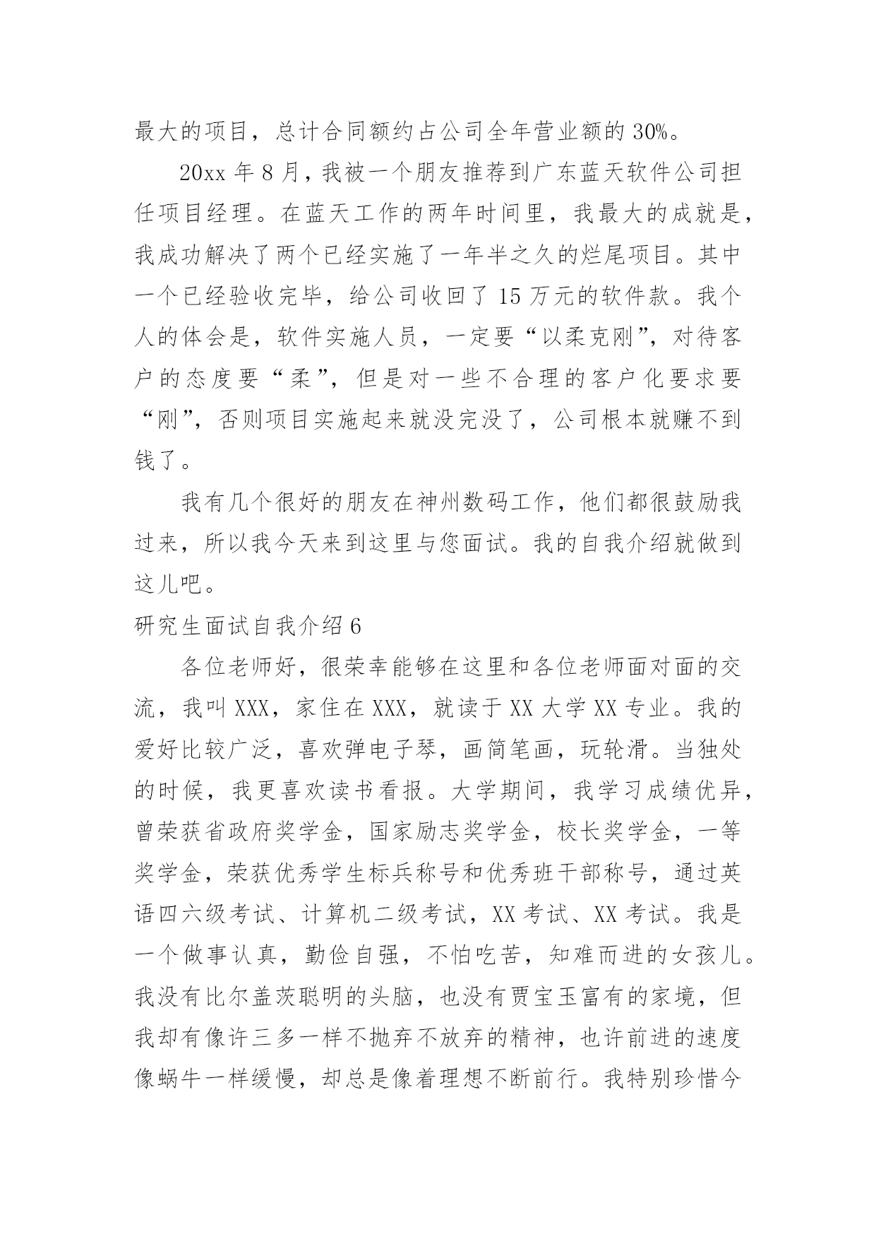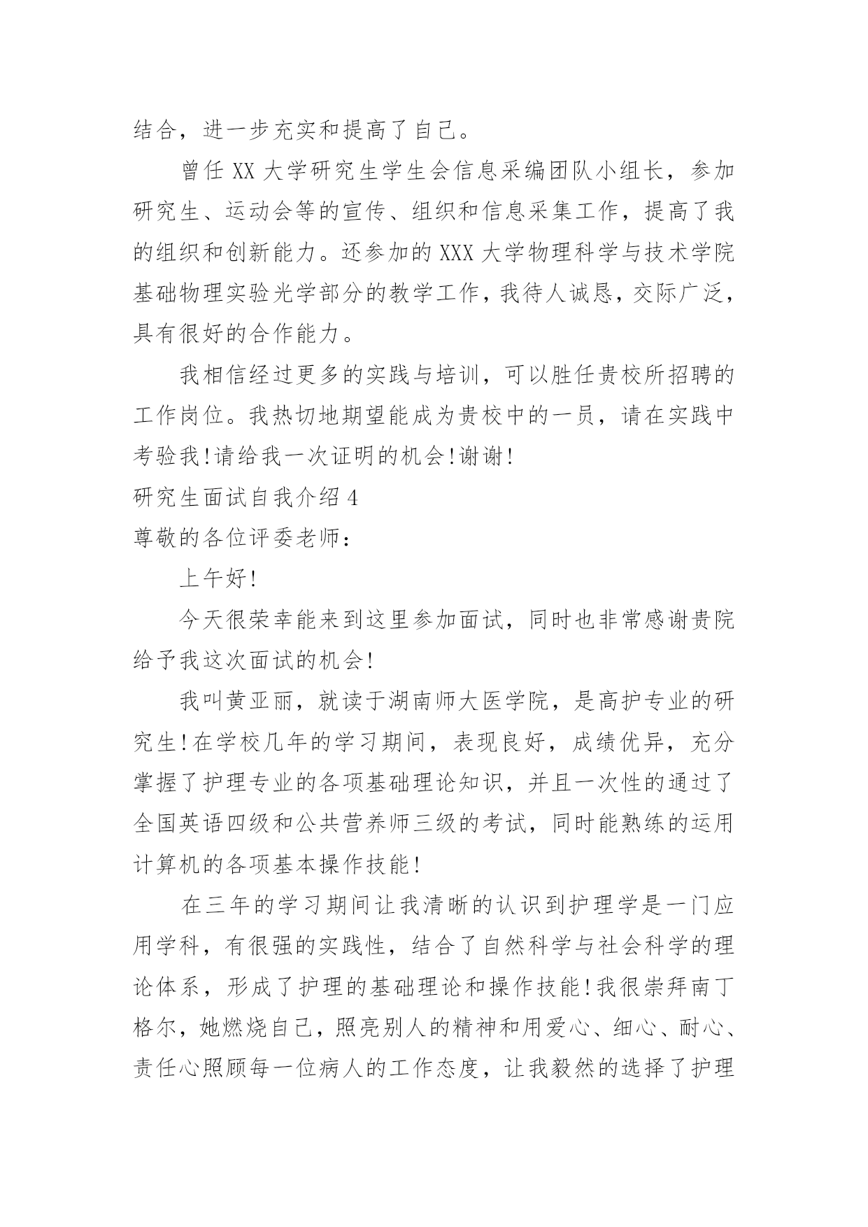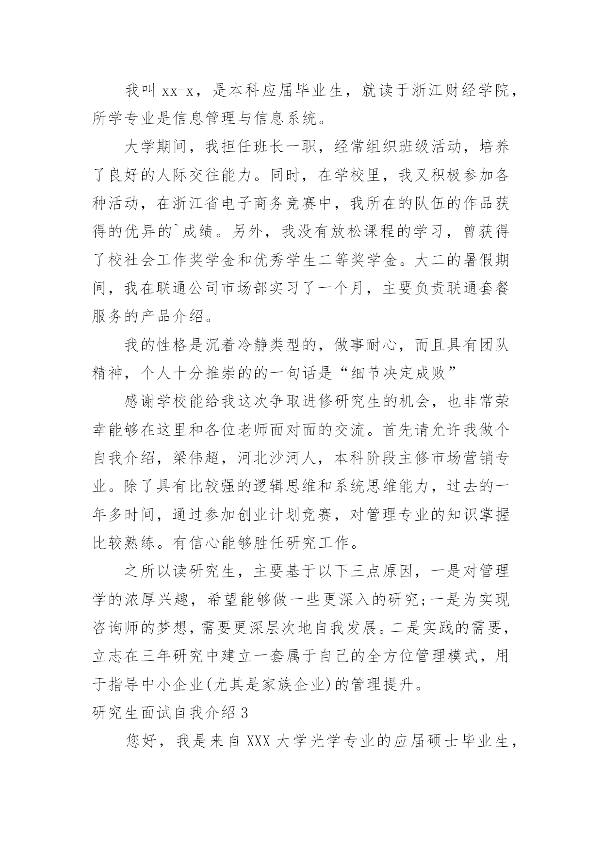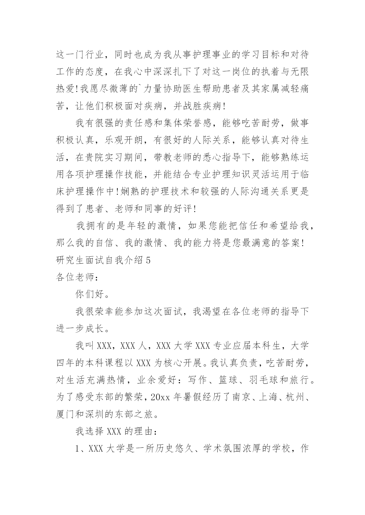 研究生面试自我介绍研究生面试自我介绍【热门】当进入一个陌生环境,我们通常会被要求作自我介绍,通过自我介绍可以得到他人的认可。现在你是否对自我介绍一筹莫展呢?下面是小编收集整理的研究生面试自我介绍,仅供参考,大家一起来看看吧。研究生面试自我介绍1本科期间,系统地学习了专业的相关知识,从基础理论的、到实用性较强的、等。课余时间经常到图书馆查阅资料的经历,对专业情有独钟,因此放弃了保研并毅然报考了大学学院专业。今年以总分分(政治,英语,专业课1,专业课2)的考研成绩进入了复试。希望通过研究生期间专业系统地学习,用自己所学的知识去解决实际问题,并希望在自己所选择的研究方向做出好成绩。由于对学的热爱,还选修了、等课程。各种实验和实习,培养了动手能力和分析问题的能力;在大时,参与了哪个级别(国家级/省级/校级)科创项目;即将在大四期间完成实验并撰写毕业论文。四年的'本科学习不仅是知识的积累,也是一种学习方法的揣摩以及思路的探索。研究生面试自我介绍2我叫xx-x,是本科应届毕业生,就读于浙江财经学院,所学专业是信息管理与信息系统。大学期间,我担任班长一职,经常组织班级活动,培养了良好的人际交往能力。同时,在学校里,我又积极参加各种活动,在浙江省电子商务竞赛中,我所在的队伍的作品获得的优异的`成绩。另外,我没有放松课程的学习,曾获得了校社会工作奖学金和优秀学生二等奖学金。大二的暑假期间,我在联通公司市场部实习了一个月,主要负责联通套餐服务的产品介绍。我的性格是沉着冷静类型的,做事耐心,而且具有团队精神,个人十分推崇的的一句话是“细节决定成败”感谢学校能给我这次争取进修研究生的机会,也非常荣幸能够在这里和各位老师面对面的交流。首先请允许我做个自我介绍,梁伟超,河北沙河人,本科阶段主修市场营销专业。除了具有比较强的逻辑思维和系统思维能力,过去的一年多时间,通过参加创业计划竞赛,对管理专业的知识掌握比较熟练。有信心能够胜任研究工作。之所以读研究生,主要基于以下三点原因,一是对管理学的浓厚兴趣,希望能够做一些更深入的研究;一是为实现咨询师的梦想,需要更深层次地自我发展。二是实践的需要,立志在三年研究中建立一套属于自己的全方位管理模式,用于指导中小企业(尤其是家族企业)的管理提升。研究生面试自我介绍3您好,我是来自XXX大学光学专业的应届硕士毕业生,师从XXX大学光学专业XXX教授。我想申请的职位是贵校的物理教师。我相信在XX大学XXX校训的培养下,我有能力接受任何挑战。自入大学以来,我一直重视自身能力和素质的综合培养,不断学习新知识积极参加各种社会实践活动锻炼自己。在本科及研究生的七年时间内,持之以恒地努力,在学习、工作等方面取得了一定的成绩,各方面能力也有了很大的提高。本科期间我认真、扎实的的学习和掌握了基础的专业知识,系统地掌握了物理学方面的相关的理论知识,熟练使用Windows10操作系统和办公软件,掌握Word、Powerpoint、Excel、C++等,熟悉Photoshop以及一些常用软件,同时,我利用课余时间广泛地涉猎了大量书籍,不但充实了自己,也培养了自己多方面的技能。更重要的`是,严谨的学风和端正的学习态度塑造了我朴实、稳重、创新的性格特点。本科毕业后我曾在x教育中心任教,从事高一物理教学工作,这是一所正规的辅导学校,在这一年当中我受益颇多,具备了一名教师应有的素质,有一定的授课经验和学生管理能力,我相信这将在我以后的教师工作中起积极的作用,也使我更有信心能够胜任教师这个岗位。研究生阶段,我依然努力学习学科基础知识,积极对课题进行研究和实践,学习与掌握了处理的相关知识、激光雷达系统的原理,以及应用小波工具箱和小波程序处理等技术,并有望在激光雷达处理理论及实验研究上取得突破性进展。并利用实验室的条件积极从事实验研究工作,实验与理论相结合,进一步充实和提高了自己。曾任XX大学研究生学生会信息采编团队小组长,参加研究生、运动会等的宣传、组织和信息采集工作,提高了我的组织和创新能力。还参加的XXX大学物理科学与技术学院基础物理实验光学部分的教学工作,我待人诚恳,交际广泛,具有很好的合作能力。我相信经过更多的实践与培训,可以胜任贵校所招聘的工作岗位。我热切地期望能成为贵校中的一员,请在实践中考验我!请给我一次证明的机会!谢谢!研究生面试自我介绍4尊敬的各位评委老师:上午好!今天很荣幸能来到这里参加面试,同时也非常感谢贵院给予我这次面试的机会!我叫黄亚丽,就读于湖南师大医学院,是高护专业的研究生!在学校几年的学习期间,表现良好,成绩优异,充分掌握了护理专业的各项基础理论知识,并且一次性的通过了全国英语四级和公共营养师三级的考试,同时能熟练的运用计算机的各项基本操作技能!在三年的学习期间让我清晰的认识到护理学是一门应用学科,有很强的实践性,结