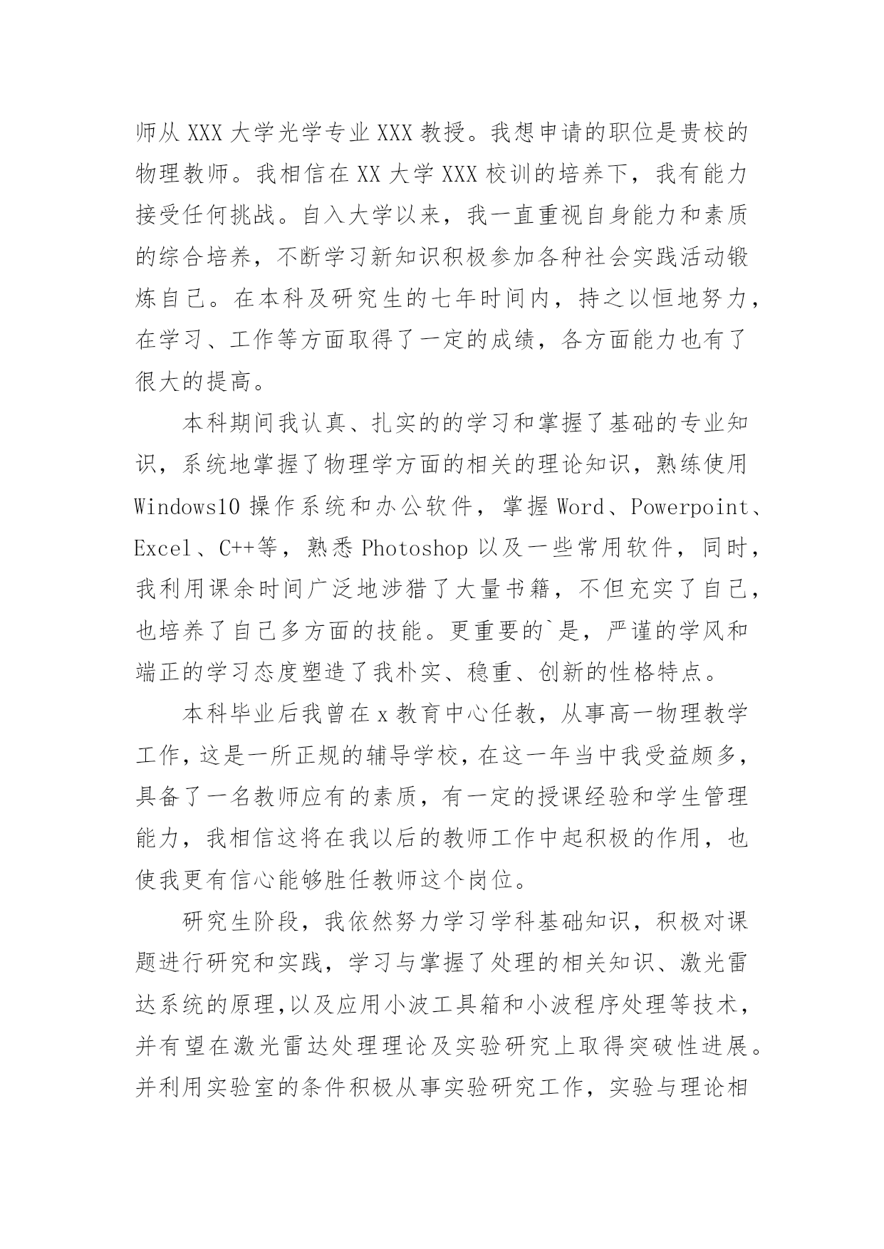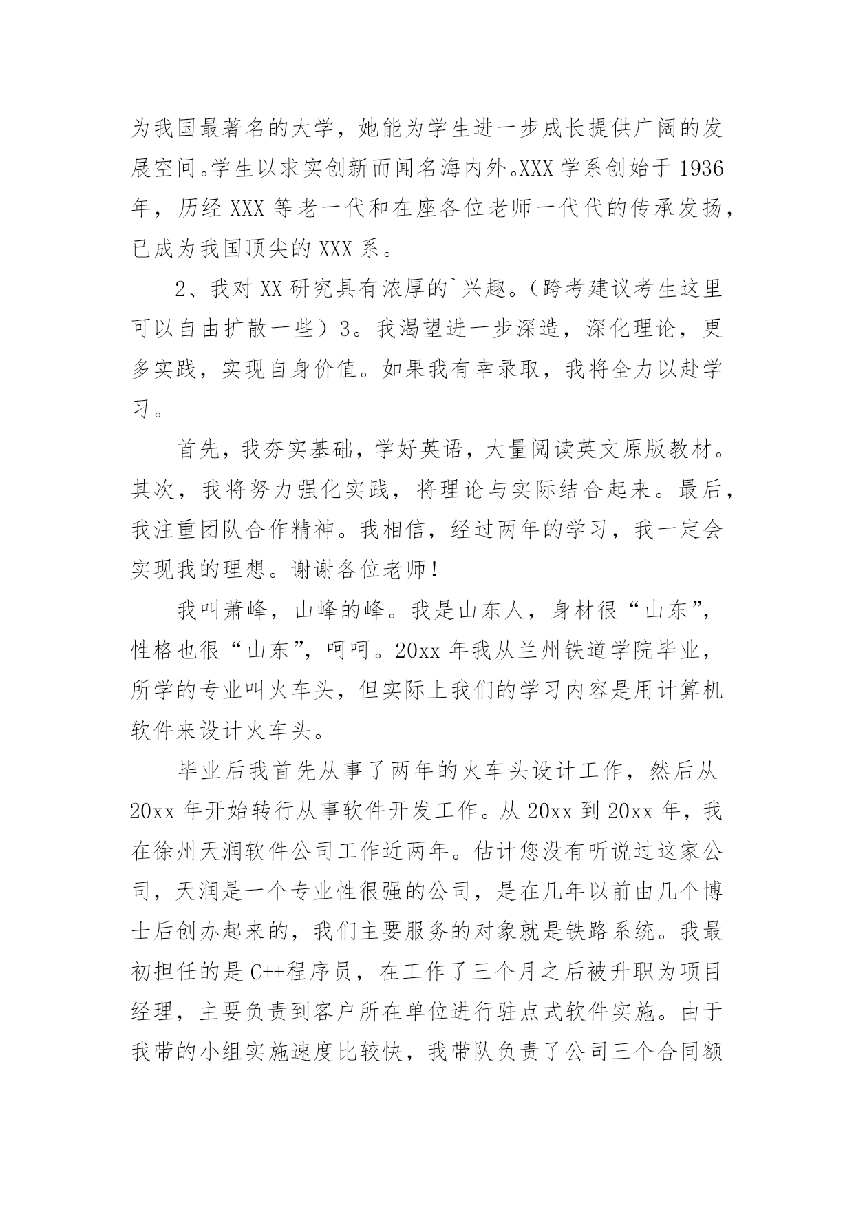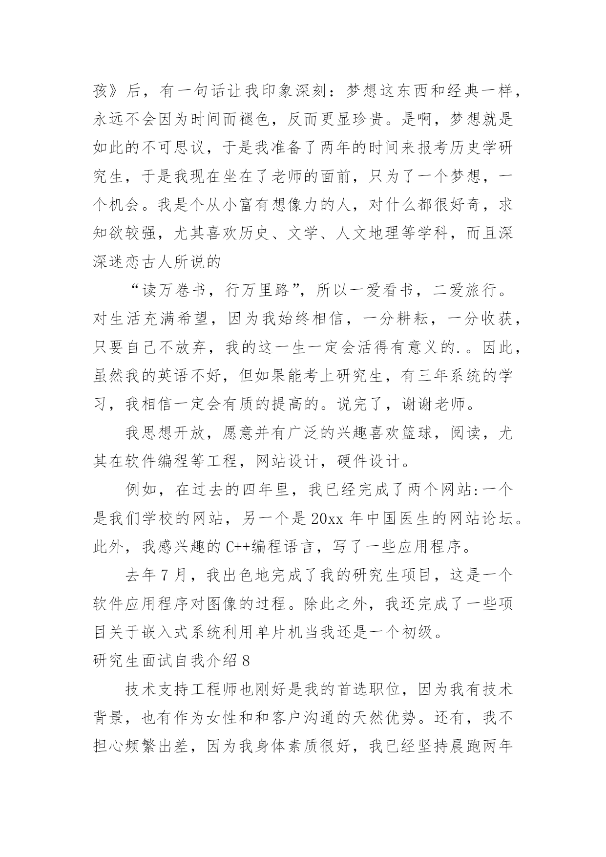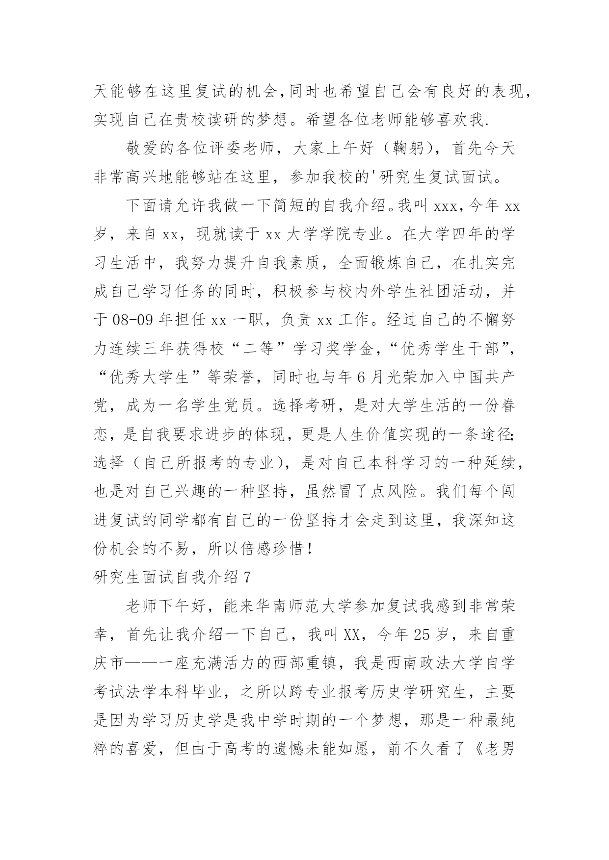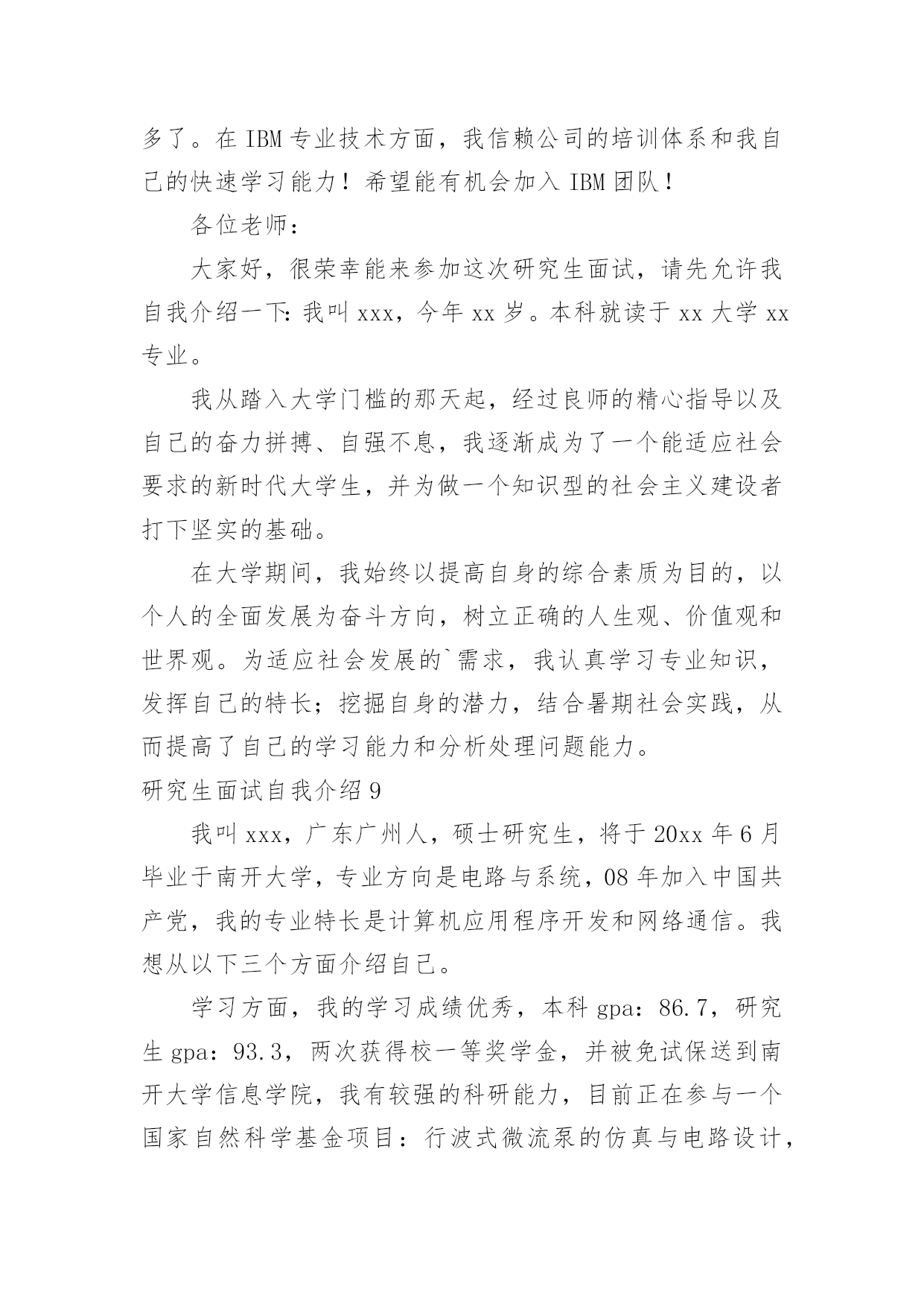 研究生面试自我介绍研究生面试自我介绍【热门】当进入一个陌生环境,我们通常会被要求作自我介绍,通过自我介绍可以得到他人的认可。现在你是否对自我介绍一筹莫展呢?下面是小编收集整理的研究生面试自我介绍,仅供参考,大家一起来看看吧。研究生面试自我介绍1本科期间,系统地学习了专业的相关知识,从基础理论的、到实用性较强的、等。课余时间经常到图书馆查阅资料的经历,对专业情有独钟,因此放弃了保研并毅然报考了大学学院专业。今年以总分分(政治,英语,专业课1,专业课2)的考研成绩进入了复试。希望通过研究生期间专业系统地学习,用自己所学的知识去解决实际问题,并希望在自己所选择的研究方向做出好成绩。由于对学的热爱,还选修了、等课程。各种实验和实习,培养了动手能力和分析问题的能力;在大时,参与了哪个级别(国家级/省级/校级)科创项目;即将在大四期间完成实验并撰写毕业论文。四年的'本科学习不仅是知识的积累,也是一种学习方法的揣摩以及思路的探索。研究生面试自我介绍2我叫xx-x,是本科应届毕业生,就读于浙江财经学院,所学专业是信息管理与信息系统。大学期间,我担任班长一职,经常组织班级活动,培养了良好的人际交往能力。同时,在学校里,我又积极参加各种活动,在浙江省电子商务竞赛中,我所在的队伍的作品获得的优异的`成绩。另外,我没有放松课程的学习,曾获得了校社会工作奖学金和优秀学生二等奖学金。大二的暑假期间,我在联通公司市场部实习了一个月,主要负责联通套餐服务的产品介绍。我的性格是沉着冷静类型的,做事耐心,而且具有团队精神,个人十分推崇的的一句话是“细节决定成败”感谢学校能给我这次争取进修研究生的机会,也非常荣幸能够在这里和各位老师面对面的交流。首先请允许我做个自我介绍,梁伟超,河北沙河人,本科阶段主修市场营销专业。除了具有比较强的逻辑思维和系统思维能力,过去的一年多时间,通过参加创业计划竞赛,对管理专业的知识掌握比较熟练。有信心能够胜任研究工作。之所以读研究生,主要基于以下三点原因,一是对管理学的浓厚兴趣,希望能够做一些更深入的研究;一是为实现咨询师的梦想,需要更深层次地自我发展。二是实践的需要,立志在三年研究中建立一套属于自己的全方位管理模式,用于指导中小企业(尤其是家族企业)的管理提升。研究生面试自我介绍3您好,我是来自XXX大学光学专业的应届硕士毕业生,师从XXX大学光学专业XXX教授。我想申请的职位是贵校的物理教师。我相信在XX大学XXX校训的培养下,我有能力接受任何挑战。自入大学以来,我一直重视自身能力和素质的综合培养,不断学习新知识积极参加各种社会实践活动锻炼自己。在本科及研究生的七年时间内,持之以恒地努力,在学习、工作等方面取得了一定的成绩,各方面能力也有了很大的提高。本科期间我认真、扎实的的学习和掌握了基础的专业知识,系统地掌握了物理学方面的相关的理论知识,熟练使用Windows10操作系统和办公软件,掌握Word、Powerpoint、Excel、C++等,熟悉Photoshop以及一些常用软件,同时,我利用课余时间广泛地涉猎了大量书籍,不但充实了自己,也培养了自己多方面的技能。更重要的`是,严谨的学风和端正的学习态度塑造了我朴实、稳重、创新的性格特点。本科毕业后我曾在x教育中心任教,从事高一物理教学工作,这是一所正规的辅导学校,在这一年当中我受益颇多,具备了一名教师应有的素质,有一定的授课经验和学生管理能力,我相信这将在我以后的教师工作中起积极的作用,也使我更有信心能够胜任教师这个岗位。研究生阶段,我依然努力学习学科基础知识,积极对课题进行研究和实践,学习与掌握了处理的相关知识、激光雷达系统的原理,以及应用小波工具箱和小波程序处理等技术,并有望在激光雷达处理理论及实验研究上取得突破性进展。并利用实验室的条件积极从事实验研究工作,实验与理论相结合,进一步充实和提高了自己。曾任XX大学研究生学生会信息采编团队小组长,参加研究生、运动会等的宣传、组织和信息采集工作,提高了我的组织和创新能力。还参加的XXX大学物理科学与技术学院基础物理实验光学部分的教学工作,我待人诚恳,交际广泛,具有很好的合作能力。我相信经过更多的实践与培训,可以胜任贵校所招聘的工作岗位。我热切地期望能成为贵校中的一员,请在实践中考验我!请给我一次证明的机会!谢谢!研究生面试自我介绍4尊敬的各位评委老师:上午好!今天很荣幸能来到这里参加面试,同时也非常感谢贵院给予我这次面试的机会!我叫黄亚丽,就读于湖南师大医学院,是高护专业的研究生!在学校几年的学习期间,表现良好,成绩优异,充分掌握了护理专业的各项基础理论知识,并且一次性的通过了全国英语四级和公共营养师三级的考试,同时能熟练的运用计算机的各项基本操作技能!在三年的学习期间让我清晰的认识到护理学是一门应用学科,有很强的实践性,结