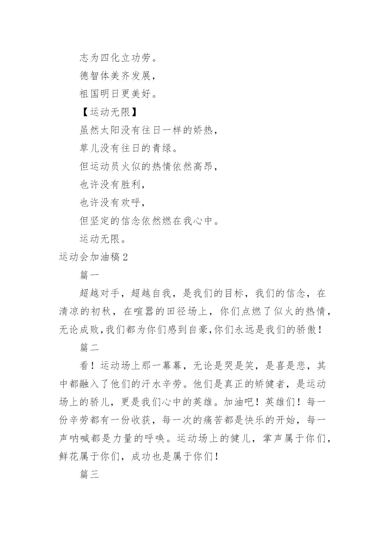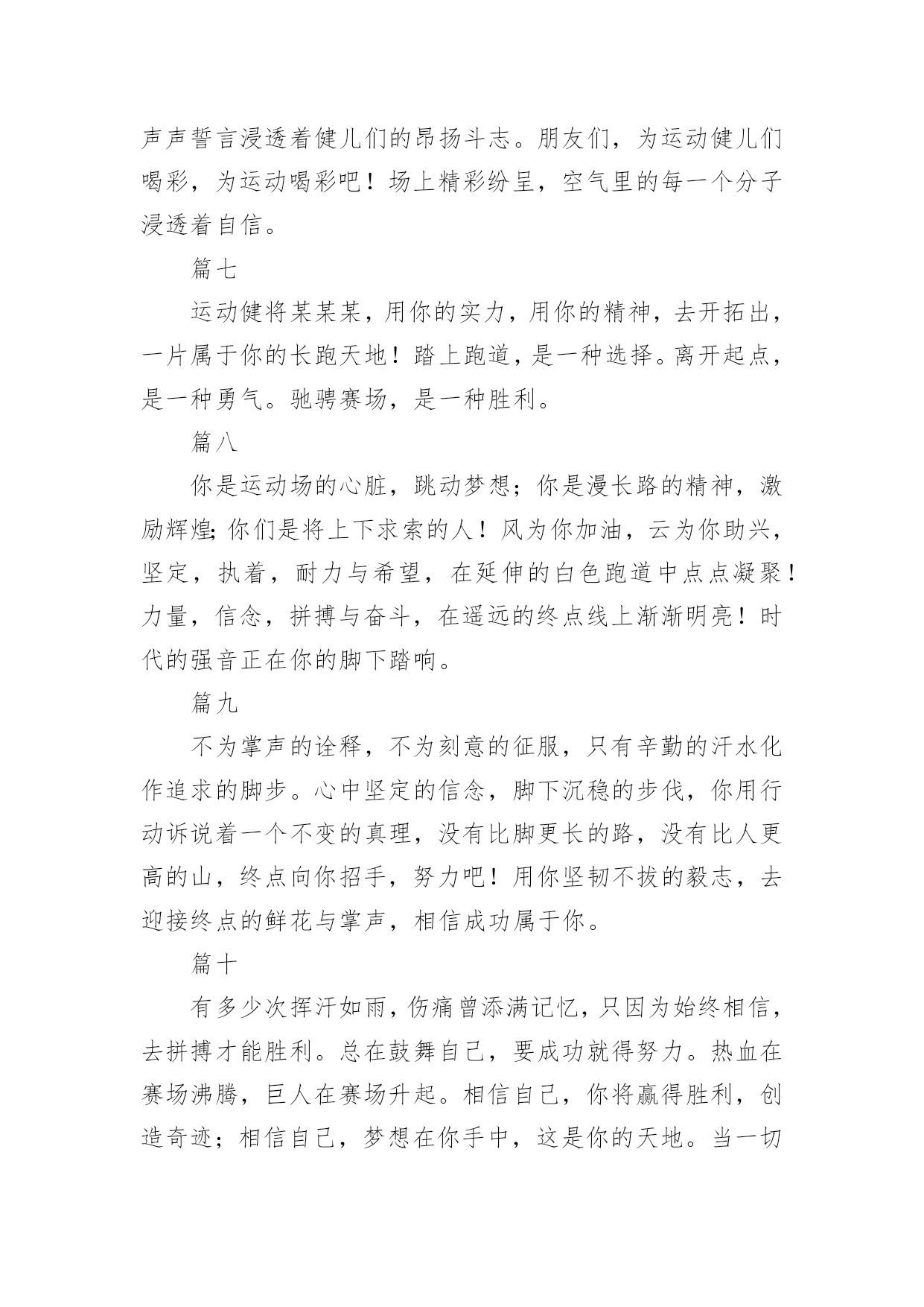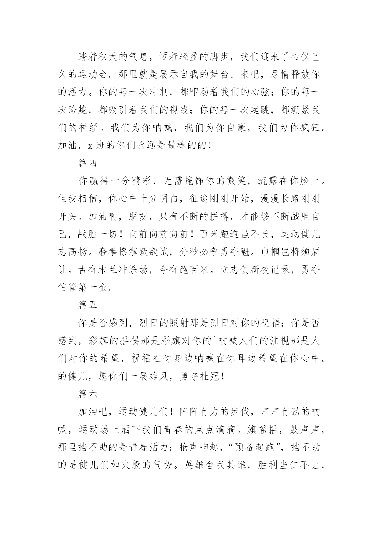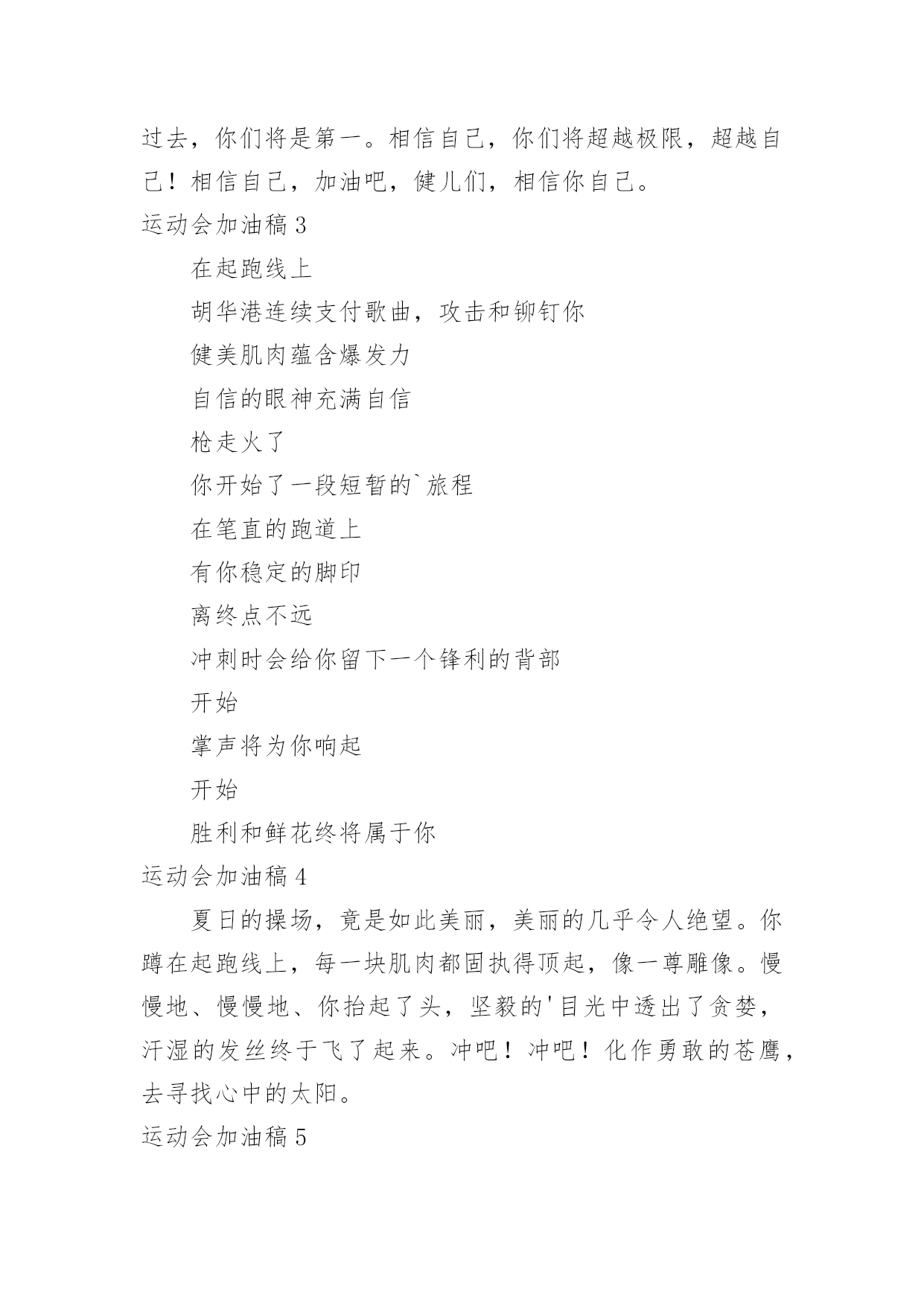 运动会加油稿运动会加油稿在发展不断提速的社会中,越来越多人会去使用加油稿,借助加油稿可以激励他人的士气。还是对加油稿一筹莫展吗?以下是小编为大家整理的运动会加油稿,仅供参考,希望能够帮助到大家。运动会加油稿1【致100米短跑运动员】你——一颗耀眼的流星划过尘土扬起的跑道急快仿佛风暴!潮湿的衬衫潮湿的眼角——-我们大声的呼号赢得最后的骄傲!【致1500米运动员】你是否感到,烈日的照射那是烈日对你的祝福你是否感到,彩旗的摇摆那是彩旗对你的呐喊人们的'注视那是人们对你的希望祝福在你身边呐喊在你耳边希望在你心中【失败的心声】悄悄的,我退居一旁避开所有的掌声和目光远离胜利者的灿烂和辉煌如果说生命也是一场竞争我参与也曾把竞争的滋味品尝【起点之美】在红与白相交织的起点浮动着紧张的空气起点之美在于鱼翔浅底的静默起点之美在于瞬间爆发的激情【运动无限】虽然太阳没有往日一样的娇热,草儿没有往日的青绿。但运动员火似的热情依然高昂,也许没有胜利,也许没有欢呼,但坚定的信念依然燃在我心中。运动无限。【如歌的校园】当小号吹醒黎明,校园揉着惺松的眼睛,赛场上的呐喊声声,如一多多美丽的蝴蝶,轻轻碰落在花坛草尖上。每天的赛事很精彩,一只只雄鹰,在碧空翱翔,我们,为你加油!【我们】我们是朝阳,充满希望。我们是春天,散发芬芳。我们热爱生命,因为以后的路还很长。我们热爱运动,因为我们要通过运动散发活力。我们比泉水还清,我们比猛虎更有力。我们,我们【零星一点白】在绿草,红色跑道间零星一点白,那是最骄傲最让人激动的点————领奖台,国旗也微笑俯视一切水天,草地间零星一点白这是最耀眼最有生命力的点瞬间的闪烁让人有些嫉妒【誓言】曾惊秋肃临天下,敢遣春温梦翱翔。秋雨哀怨挥手去,金风萧瑟志激昂。百年梦圆不眠夜,化作赛场斗志扬。五环旗下誓言在,更高更快更顽强。【致跑步运动员】起点上你摩拳擦掌跑道上你奋力争强终点线上你青春飞扬领奖台上我们为你鼓掌努力吧体育健儿更高更快更强!【百米】一生的奋斗影缩成百米眼中只有终点身是一把弓紧的弦朝着目标一枚离弦的箭【跳高】轻轻一跃把身体交给浮云四米长的足竿载决着微笑和泪水标枪冲掷飞出的不仅仅是标枪还有渴望【致运动会】秋季气爽彩旗飘,运动健儿逞英豪。千呼万喊齐加油,场上场下都骄傲。今日练出好身体,志为四化立功劳。德智体美齐发展,祖国明日更美好。【运动无限】虽然太阳没有往日一样的娇热,草儿没有往日的青绿。但运动员火似的热情依然高昂,也许没有胜利,也许没有欢呼,但坚定的信念依然燃在我心中。运动无限。运动会加油稿2篇一超越对手,超越自我,是我们的目标,我们的信念,在清凉的初秋,在喧嚣的田径场上,你们点燃了似火的热情,无论成败,我们都为你们感到自豪,你们永远是我们的骄傲!篇二看!运动场上那一幕幕,无论是哭是笑,是喜是悲,其中都融入了他们的汗水辛劳。他们是真正的矫健者,是运动场上的骄儿,更是我们心中的英雄。加油吧!英雄们!每一份辛劳都有一份收获,每一次的痛苦都是快乐的开始,每一声呐喊都是力量的呼唤。运动场上的健儿,掌声属于你们,鲜花属于你们,成功也是属于你们!篇三踏着秋天的气息,迈着轻盈的脚步,我们迎来了心仪已久的运动会。那里就是展示自我的舞台。来吧,尽情释放你的活力。你的每一次冲刺,都叩动着我们的心弦;你的每一次跨越,都吸引着我们的视线;你的每一次起跳,都绷紧我们的神经。我们为你呐喊,我们为你自豪,我们为你疯狂。加油,x班的你们永远是最棒的的!篇四你赢得十分精彩,无需掩饰你的微笑,流露在你脸上。但我相信,你心中十分明白,征途刚刚开始,漫漫长路刚刚开头。加油啊,朋友,只有不断的拼搏,才能够不断战胜自己,战胜一切!向前向前向前!百米跑道虽不长,运动健儿志高扬。磨拳擦掌跃欲试,分秒必争勇夺魁。巾帼岂将须眉让。古有木兰冲杀场,今有跑百米。立志创新校记录,勇夺信管第一金。篇五你是否感到,烈日的照射那是烈日对你的祝福;你是否感到,彩旗的摇摆那是彩旗对你的`呐喊人们的注视那是人们对你的希望,祝福在你身边呐喊在你耳边希望在你心中。的健儿,愿你们一展雄风,勇夺桂冠!篇六加油吧,运动健儿们!阵阵有力的步伐,声声有劲的呐喊,运动场上洒下我们青春的点点滴滴。旗摇摇,鼓声声,那里挡不助的是青春活力;枪声响起,“预备起跑”,挡不助的是健儿们如火般的气势。英雄舍我其谁,胜利当仁不让,声声誓言浸透着健儿们的昂扬斗志。朋友们,为运动健儿们喝彩,为运动喝彩吧!场上精彩纷呈,空气里的每一个分子浸透着自信。篇七运动健将某某某,用你的实力,用你的精神,去开拓出,一片属于你的长跑天地!踏上跑道,是一种选择。离开起点,是一种勇气。驰骋赛场,是一种胜利。篇八你是运动场的心脏,跳动梦想;你是漫长路的精神,激励辉煌;你们是将上下求索的人!风为你加油,云为你助兴,坚定,执着,耐力与希望,在延伸的白色跑道中点点