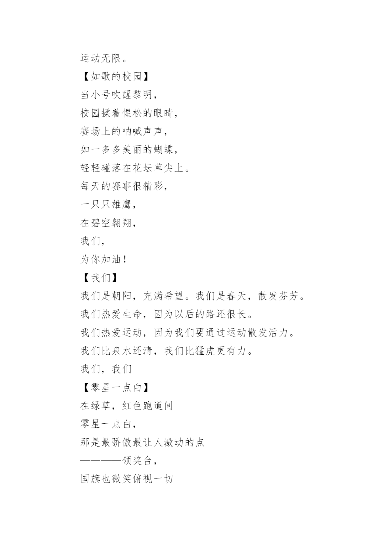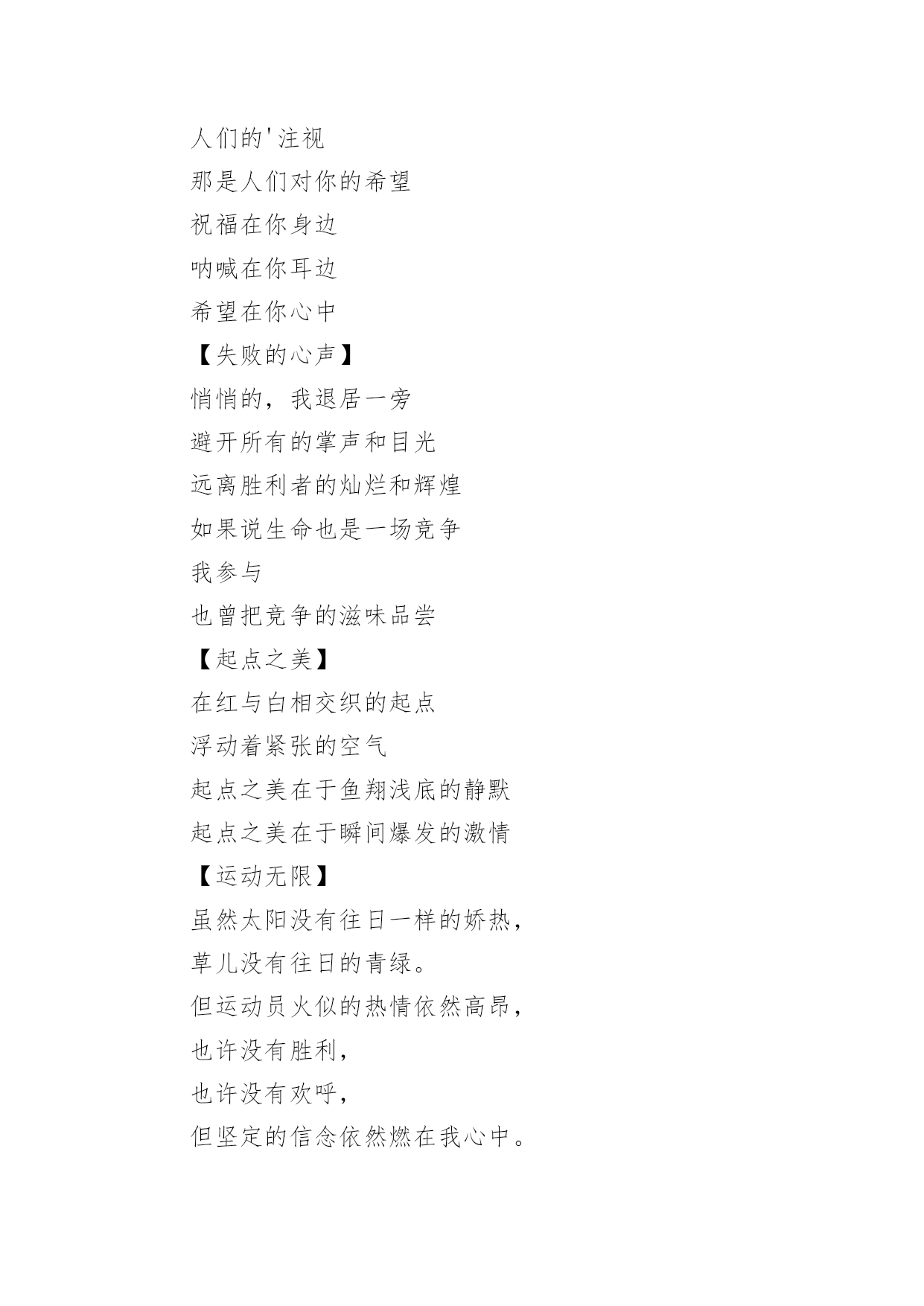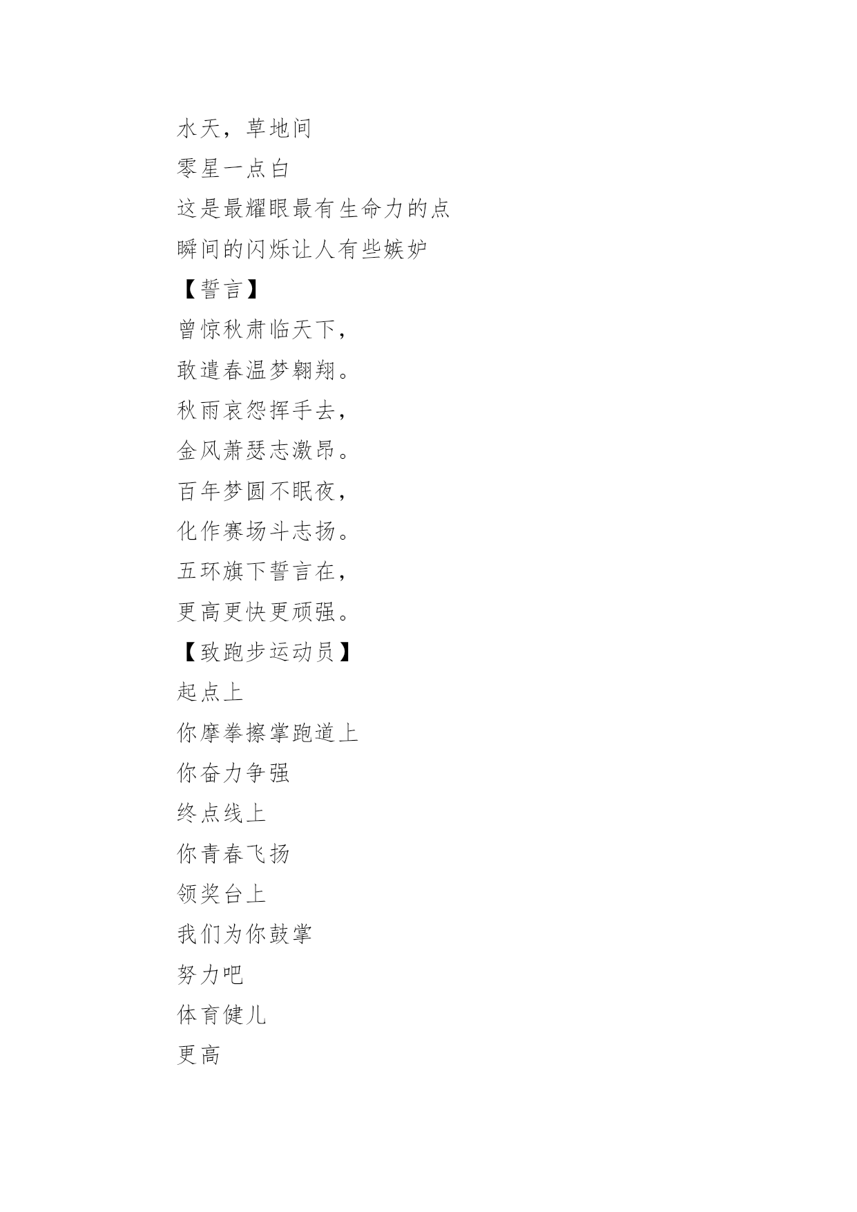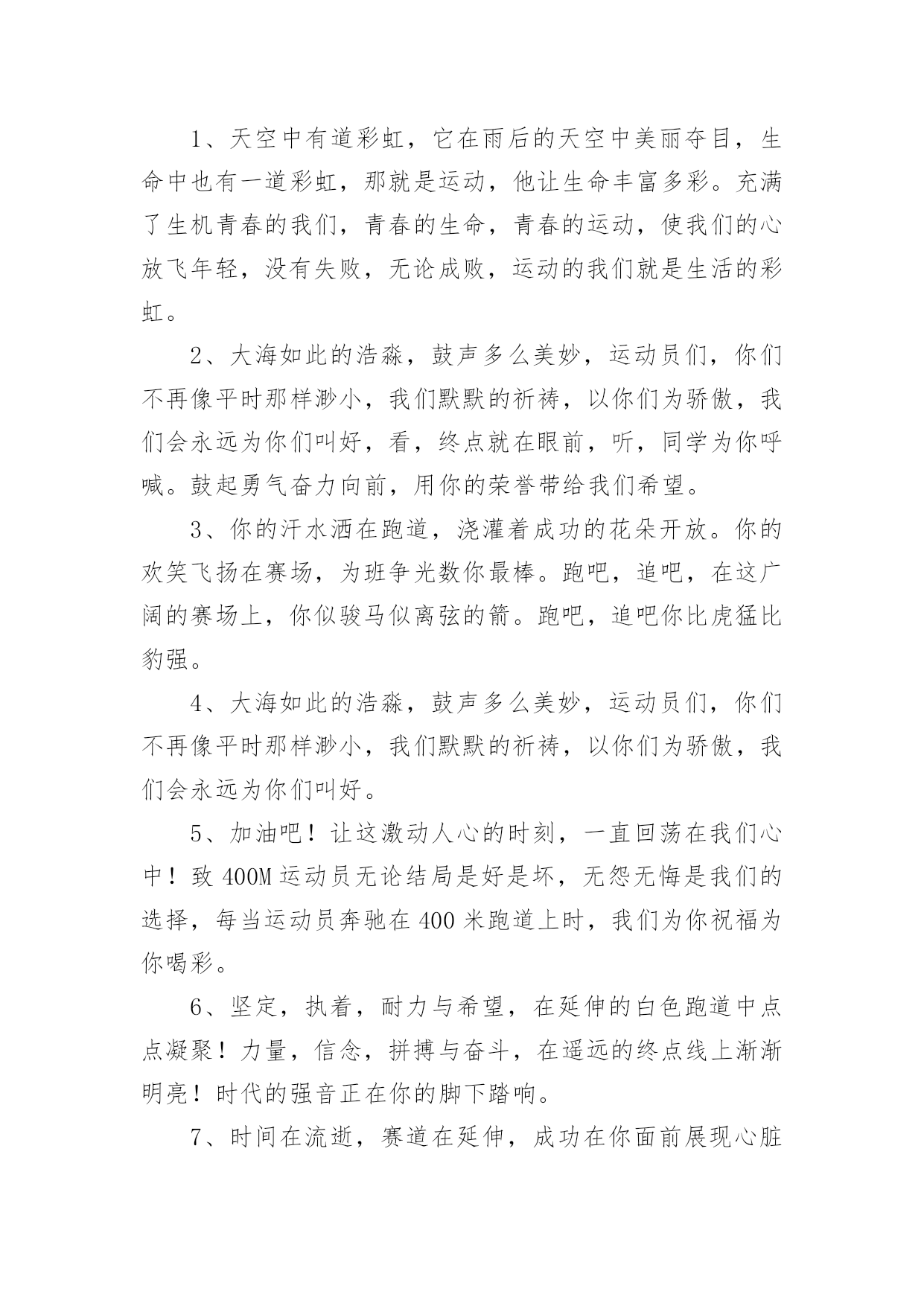 运动会加油稿运动会加油稿在发展不断提速的社会中,越来越多人会去使用加油稿,借助加油稿可以激励他人的士气。还是对加油稿一筹莫展吗?以下是小编为大家整理的运动会加油稿,仅供参考,希望能够帮助到大家。运动会加油稿1【致100米短跑运动员】你——一颗耀眼的流星划过尘土扬起的跑道急快仿佛风暴!潮湿的衬衫潮湿的眼角——-我们大声的呼号赢得最后的骄傲!【致1500米运动员】你是否感到,烈日的照射那是烈日对你的祝福你是否感到,彩旗的摇摆那是彩旗对你的呐喊人们的'注视那是人们对你的希望祝福在你身边呐喊在你耳边希望在你心中【失败的心声】悄悄的,我退居一旁避开所有的掌声和目光远离胜利者的灿烂和辉煌如果说生命也是一场竞争我参与也曾把竞争的滋味品尝【起点之美】在红与白相交织的起点浮动着紧张的空气起点之美在于鱼翔浅底的静默起点之美在于瞬间爆发的激情【运动无限】虽然太阳没有往日一样的娇热,草儿没有往日的青绿。但运动员火似的热情依然高昂,也许没有胜利,也许没有欢呼,但坚定的信念依然燃在我心中。运动无限。【如歌的校园】当小号吹醒黎明,校园揉着惺松的眼睛,赛场上的呐喊声声,如一多多美丽的蝴蝶,轻轻碰落在花坛草尖上。每天的赛事很精彩,一只只雄鹰,在碧空翱翔,我们,为你加油!【我们】我们是朝阳,充满希望。我们是春天,散发芬芳。我们热爱生命,因为以后的路还很长。我们热爱运动,因为我们要通过运动散发活力。我们比泉水还清,我们比猛虎更有力。我们,我们【零星一点白】在绿草,红色跑道间零星一点白,那是最骄傲最让人激动的点————领奖台,国旗也微笑俯视一切水天,草地间零星一点白这是最耀眼最有生命力的点瞬间的闪烁让人有些嫉妒【誓言】曾惊秋肃临天下,敢遣春温梦翱翔。秋雨哀怨挥手去,金风萧瑟志激昂。百年梦圆不眠夜,化作赛场斗志扬。五环旗下誓言在,更高更快更顽强。【致跑步运动员】起点上你摩拳擦掌跑道上你奋力争强终点线上你青春飞扬领奖台上我们为你鼓掌努力吧体育健儿更高更快更强!【百米】一生的奋斗影缩成百米眼中只有终点身是一把弓紧的弦朝着目标一枚离弦的箭【跳高】轻轻一跃把身体交给浮云四米长的足竿载决着微笑和泪水标枪冲掷飞出的不仅仅是标枪还有渴望【致运动会】秋季气爽彩旗飘,运动健儿逞英豪。千呼万喊齐加油,场上场下都骄傲。今日练出好身体,志为四化立功劳。德智体美齐发展,祖国明日更美好。【运动无限】虽然太阳没有往日一样的娇热,草儿没有往日的青绿。但运动员火似的热情依然高昂,也许没有胜利,也许没有欢呼,但坚定的信念依然燃在我心中。运动无限。运动会加油稿2篇一超越对手,超越自我,是我们的目标,我们的信念,在清凉的初秋,在喧嚣的田径场上,你们点燃了似火的热情,无论成败,我们都为你们感到自豪,你们永远是我们的骄傲!篇二看!运动场上那一幕幕,无论是哭是笑,是喜是悲,其中都融入了他们的汗水辛劳。他们是真正的矫健者,是运动场上的骄儿,更是我们心中的英雄。加油吧!英雄们!每一份辛劳都有一份收获,每一次的痛苦都是快乐的开始,每一声呐喊都是力量的呼唤。运动场上的健儿,掌声属于你们,鲜花属于你们,成功也是属于你们!篇三踏着秋天的气息,迈着轻盈的脚步,我们迎来了心仪已久的运动会。那里就是展示自我的舞台。来吧,尽情释放你的活力。你的每一次冲刺,都叩动着我们的心弦;你的每一次跨越,都吸引着我们的视线;你的每一次起跳,都绷紧我们的神经。我们为你呐喊,我们为你自豪,我们为你疯狂。加油,x班的你们永远是最棒的的!篇四你赢得十分精彩,无需掩饰你的微笑,流露在你脸上。但我相信,你心中十分明白,征途刚刚开始,漫漫长路刚刚开头。加油啊,朋友,只有不断的拼搏,才能够不断战胜自己,战胜一切!向前向前向前!百米跑道虽不长,运动健儿志高扬。磨拳擦掌跃欲试,分秒必争勇夺魁。巾帼岂将须眉让。古有木兰冲杀场,今有跑百米。立志创新校记录,勇夺信管第一金。篇五你是否感到,烈日的照射那是烈日对你的祝福;你是否感到,彩旗的摇摆那是彩旗对你的`呐喊人们的注视那是人们对你的希望,祝福在你身边呐喊在你耳边希望在你心中。的健儿,愿你们一展雄风,勇夺桂冠!篇六加油吧,运动健儿们!阵阵有力的步伐,声声有劲的呐喊,运动场上洒下我们青春的点点滴滴。旗摇摇,鼓声声,那里挡不助的是青春活力;枪声响起,“预备起跑”,挡不助的是健儿们如火般的气势。英雄舍我其谁,胜利当仁不让,声声誓言浸透着健儿们的昂扬斗志。朋友们,为运动健儿们喝彩,为运动喝彩吧!场上精彩纷呈,空气里的每一个分子浸透着自信。篇七运动健将某某某,用你的实力,用你的精神,去开拓出,一片属于你的长跑天地!踏上跑道,是一种选择。离开起点,是一种勇气。驰骋赛场,是一种胜利。篇八你是运动场的心脏,跳动梦想;你是漫长路的精神,激励辉煌;你们是将上下求索的人!风为你加油,云为你助兴,坚定,执着,耐力与希望,在延伸的白色跑道中点点