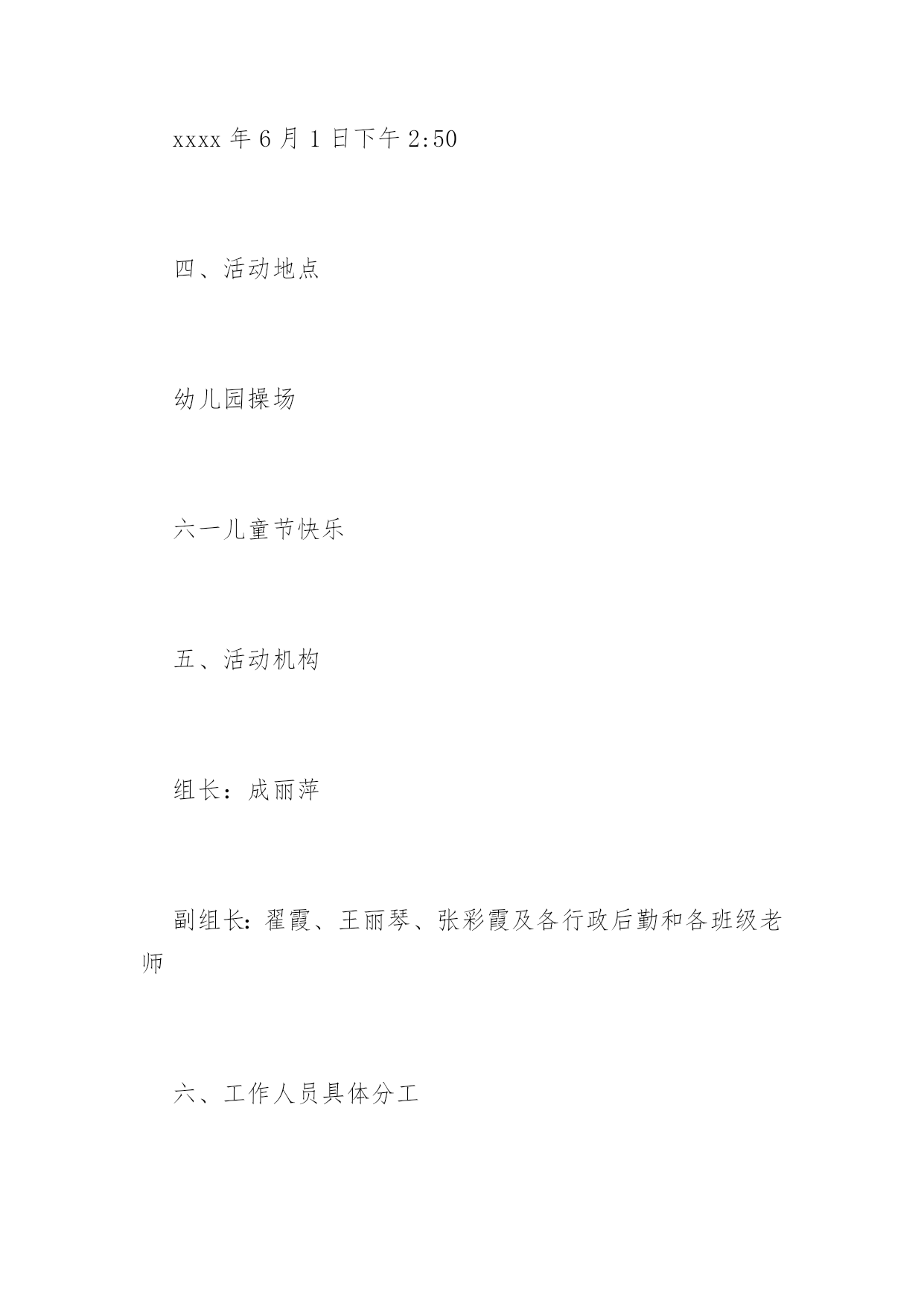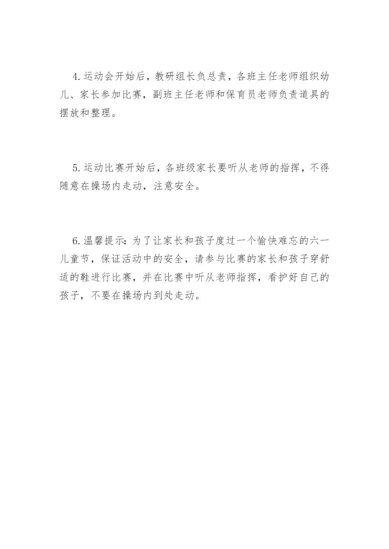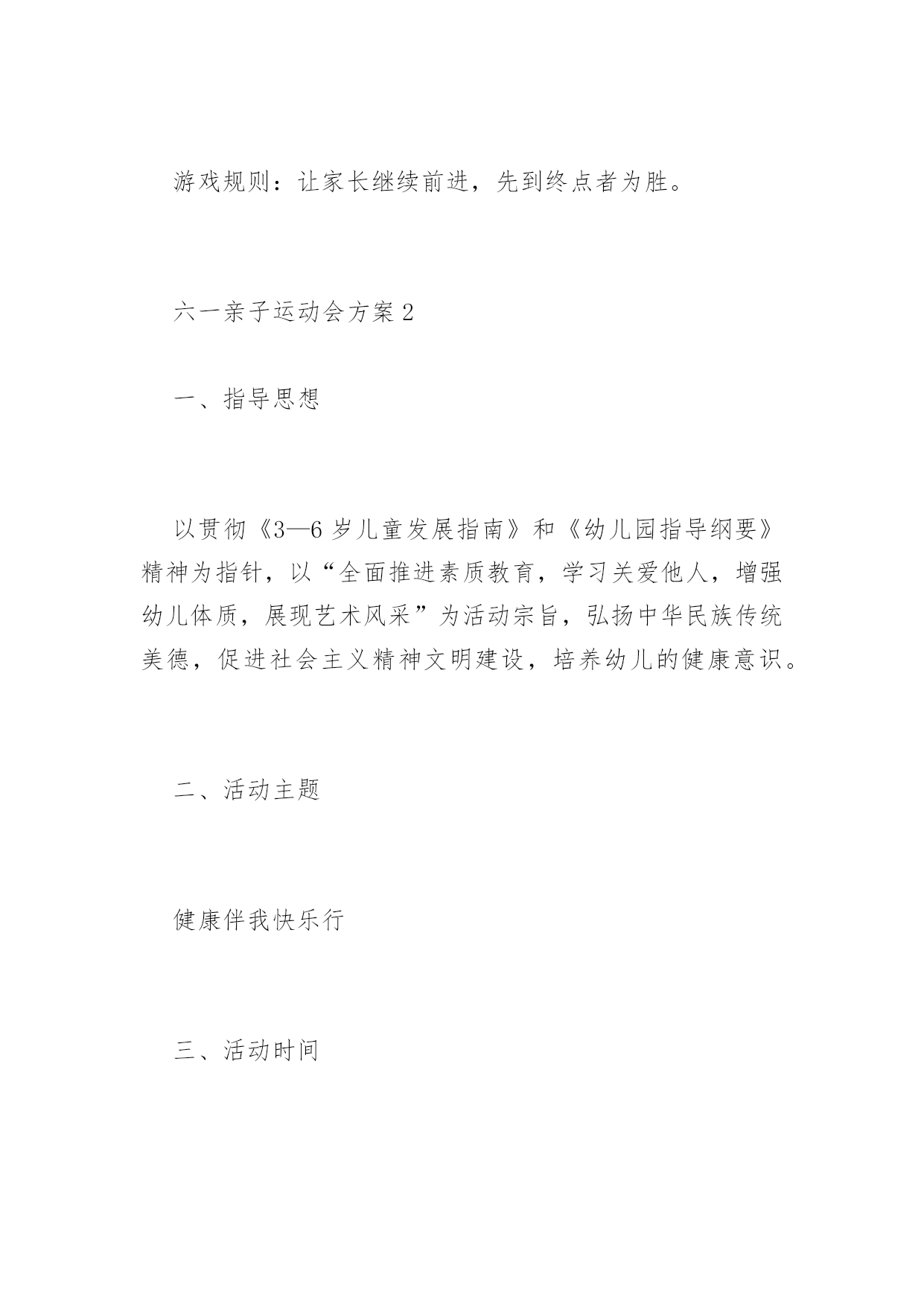 六一亲子运动会方案六一亲子运动会方案1活动目的:使幼儿通过参加亲子活动,进一步感受到“六一”儿童节的快乐,感受到幼儿园生活的快乐,感受到父母对自己的爱。活动形式:全园幼儿亲子活动。请每个幼儿和家长均可参与。在老师指导下进行比赛。按照年龄段进行分组比赛,最后决出第一名、第二名、第三名并颁发奖品。游戏活动:企鹅运蛋游戏准备:沙包、小桶游戏过程:游戏开始前,幼儿站在场地的起点,爸爸(或妈妈)站在场地中间,比赛开始,幼儿用大腿内侧夹住一只沙包学企鹅的'样子,从起点走到场地的中间,把沙包放入小桶内,然后跑回起点运蛋(沙包)。这时,爸爸(或妈妈)可从小桶内把蛋(沙包)拿出,也用大腿内侧夹住向前走到终点后,把蛋(沙包)放入终点的桶内,再跑回场地中间去运第二个蛋,在规定时间内看哪个家庭运的蛋最多为胜利。游戏规则:若中途沙包掉到地上,可捡起重新夹住前行;不准用手拿着沙包前行,夹好后再前行。游戏活动:夏日采莲忙游戏准备:绿色小毯子游戏过程:幼儿手持两块地毯,从起点出发,到指定地点给爸爸(或妈妈)放好,家长向前走时每只脚必须踩在地毯上,由幼儿将家长走过后的地毯依次轮流向前搬运,让家长继续前进,家长先到终点者为胜。游戏规则:让家长继续前进,先到终点者为胜。六一亲子运动会方案2一、指导思想以贯彻《3—6岁儿童发展指南》和《幼儿园指导纲要》精神为指针,以“全面推进素质教育,学习关爱他人,增强幼儿体质,展现艺术风采”为活动宗旨,弘扬中华民族传统美德,促进社会主义精神文明建设,培养幼儿的健康意识。二、活动主题健康伴我快乐行三、活动时间xxxx年6月1日下午2:50四、活动地点幼儿园操场六一儿童节快乐五、活动机构组长:成丽萍副组长:翟霞、王丽琴、张彩霞及各行政后勤和各班级老师六、工作人员具体分工1.场地布置:唐俊峰、潘卫东、郑铁龙、于占宽(负责背景幕布、条幅的悬挂);张彩霞、秦霞、翟霞(负责主席台的布置)2.运动会跑道布置:唐俊峰、秦霞、刘艳、其木格3.音响设备:杨文凯4.音乐准备:石迎红5.主持:解倩6.运动会总指挥:翟霞7.运动会裁判人员及奖品发放:李淼、刘玲梅、秦霞、赵美荣、刘瑞娥、王燕、张咏梅及食堂工作人员8.运动会安保工作:郑铁龙、潘卫东、于占宽、塔玉萌、斯庆巴特尔、常松、其木格9.国旗护卫:邬景怡、潘沫含(大四班幼儿)张靖媱、杨梓婕、李欣羽、雷书闻(大三班幼儿)七、活动要求1.要求各班级按指定位置后场,听从总指挥准时入场。2.各班级服装统一,手持班级标志,精神抖擞进入会场。3.各班级家长按时到达指定位置就坐,保持会场秩序和卫生。4.运动会开始后,教研组长负总责,各班主任老师组织幼儿、家长参加比赛,副班主任老师和保育员老师负责道具的摆放和整理。5.运动比赛开始后,各班级家长要听从老师的指挥,不得随意在操场内走动,注意安全。6.温馨提示:为了让家长和孩子度过一个愉快难忘的六一儿童节,保证活动中的安全,请参与比赛的家长和孩子穿舒适的鞋进行比赛,并在比赛中听从老师指挥,看护好自己的孩子,不要在操场内到处走动。