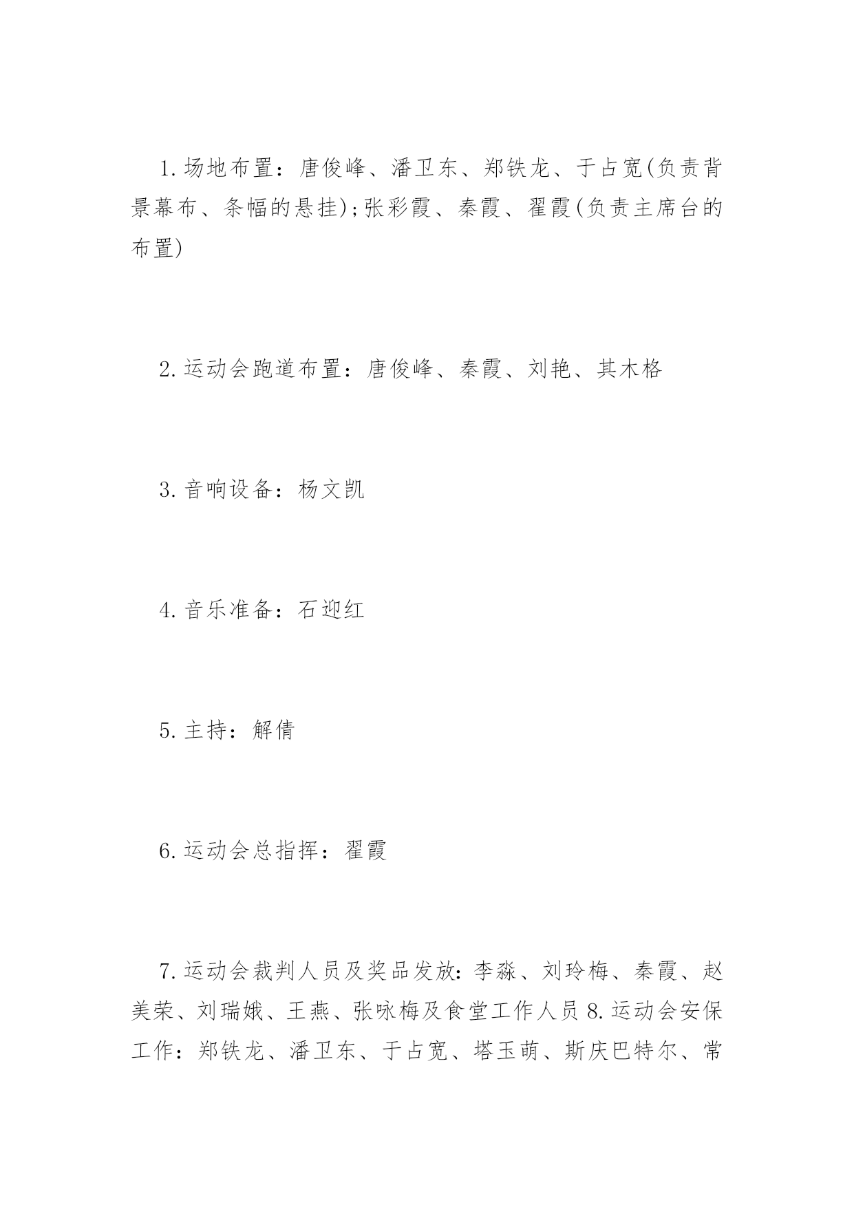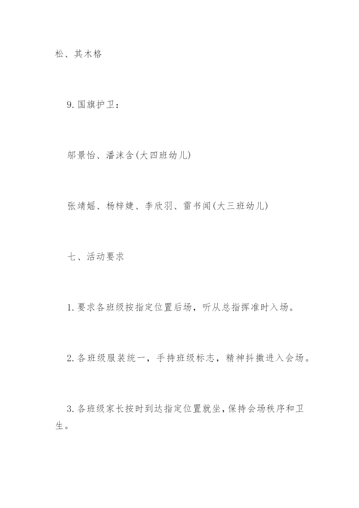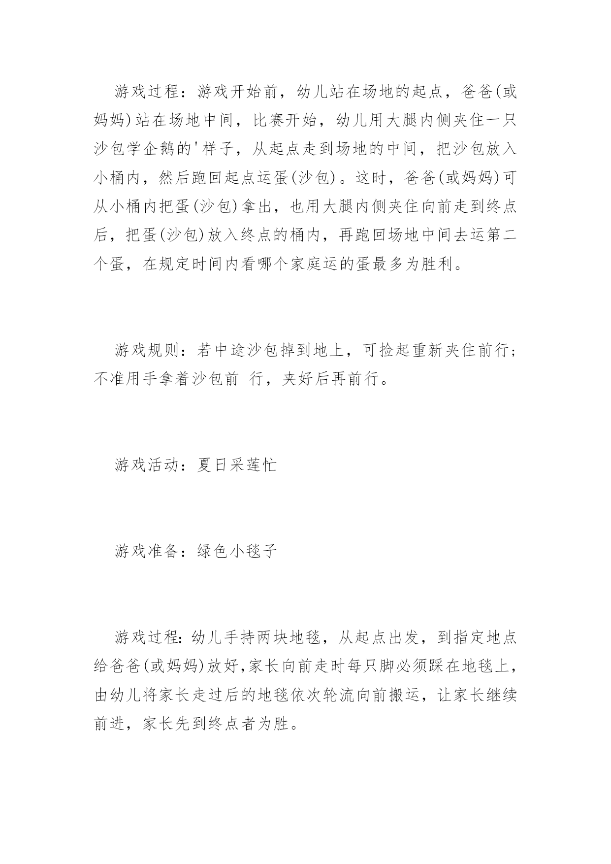 六一亲子运动会方案六一亲子运动会方案1活动目的:使幼儿通过参加亲子活动,进一步感受到“六一”儿童节的快乐,感受到幼儿园生活的快乐,感受到父母对自己的爱。活动形式:全园幼儿亲子活动。请每个幼儿和家长均可参与。在老师指导下进行比赛。按照年龄段进行分组比赛,最后决出第一名、第二名、第三名并颁发奖品。游戏活动:企鹅运蛋游戏准备:沙包、小桶游戏过程:游戏开始前,幼儿站在场地的起点,爸爸(或妈妈)站在场地中间,比赛开始,幼儿用大腿内侧夹住一只沙包学企鹅的'样子,从起点走到场地的中间,把沙包放入小桶内,然后跑回起点运蛋(沙包)。这时,爸爸(或妈妈)可从小桶内把蛋(沙包)拿出,也用大腿内侧夹住向前走到终点后,把蛋(沙包)放入终点的桶内,再跑回场地中间去运第二个蛋,在规定时间内看哪个家庭运的蛋最多为胜利。游戏规则:若中途沙包掉到地上,可捡起重新夹住前行;不准用手拿着沙包前行,夹好后再前行。游戏活动:夏日采莲忙游戏准备:绿色小毯子游戏过程:幼儿手持两块地毯,从起点出发,到指定地点给爸爸(或妈妈)放好,家长向前走时每只脚必须踩在地毯上,由幼儿将家长走过后的地毯依次轮流向前搬运,让家长继续前进,家长先到终点者为胜。游戏规则:让家长继续前进,先到终点者为胜。六一亲子运动会方案2一、指导思想以贯彻《3—6岁儿童发展指南》和《幼儿园指导纲要》精神为指针,以“全面推进素质教育,学习关爱他人,增强幼儿体质,展现艺术风采”为活动宗旨,弘扬中华民族传统美德,促进社会主义精神文明建设,培养幼儿的健康意识。二、活动主题健康伴我快乐行三、活动时间xxxx年6月1日下午2:50四、活动地点幼儿园操场六一儿童节快乐五、活动机构组长:成丽萍副组长:翟霞、王丽琴、张彩霞及各行政后勤和各班级老师六、工作人员具体分工1.场地布置:唐俊峰、潘卫东、郑铁龙、于占宽(负责背景幕布、条幅的悬挂);张彩霞、秦霞、翟霞(负责主席台的布置)2.运动会跑道布置:唐俊峰、秦霞、刘艳、其木格3.音响设备:杨文凯4.音乐准备:石迎红5.主持:解倩6.运动会总指挥:翟霞7.运动会裁判人员及奖品发放:李淼、刘玲梅、秦霞、赵美荣、刘瑞娥、王燕、张咏梅及食堂工作人员8.运动会安保工作:郑铁龙、潘卫东、于占宽、塔玉萌、斯庆巴特尔、常松、其木格9.国旗护卫:邬景怡、潘沫含(大四班幼儿)张靖媱、杨梓婕、李欣羽、雷书闻(大三班幼儿)七、活动要求1.要求各班级按指定位置后场,听从总指挥准时入场。2.各班级服装统一,手持班级标志,精神抖擞进入会场。3.各班级家长按时到达指定位置就坐,保持会场秩序和卫生。4.运动会开始后,教研组长负总责,各班主任老师组织幼儿、家长参加比赛,副班主任老师和保育员老师负责道具的摆放和整理。5.运动比赛开始后,各班级家长要听从老师的指挥,不得随意在操场内走动,注意安全。6.温馨提示:为了让家长和孩子度过一个愉快难忘的六一儿童节,保证活动中的安全,请参与比赛的家长和孩子穿舒适的鞋进行比赛,并在比赛中听从老师指挥,看护好自己的孩子,不要在操场内到处走动。