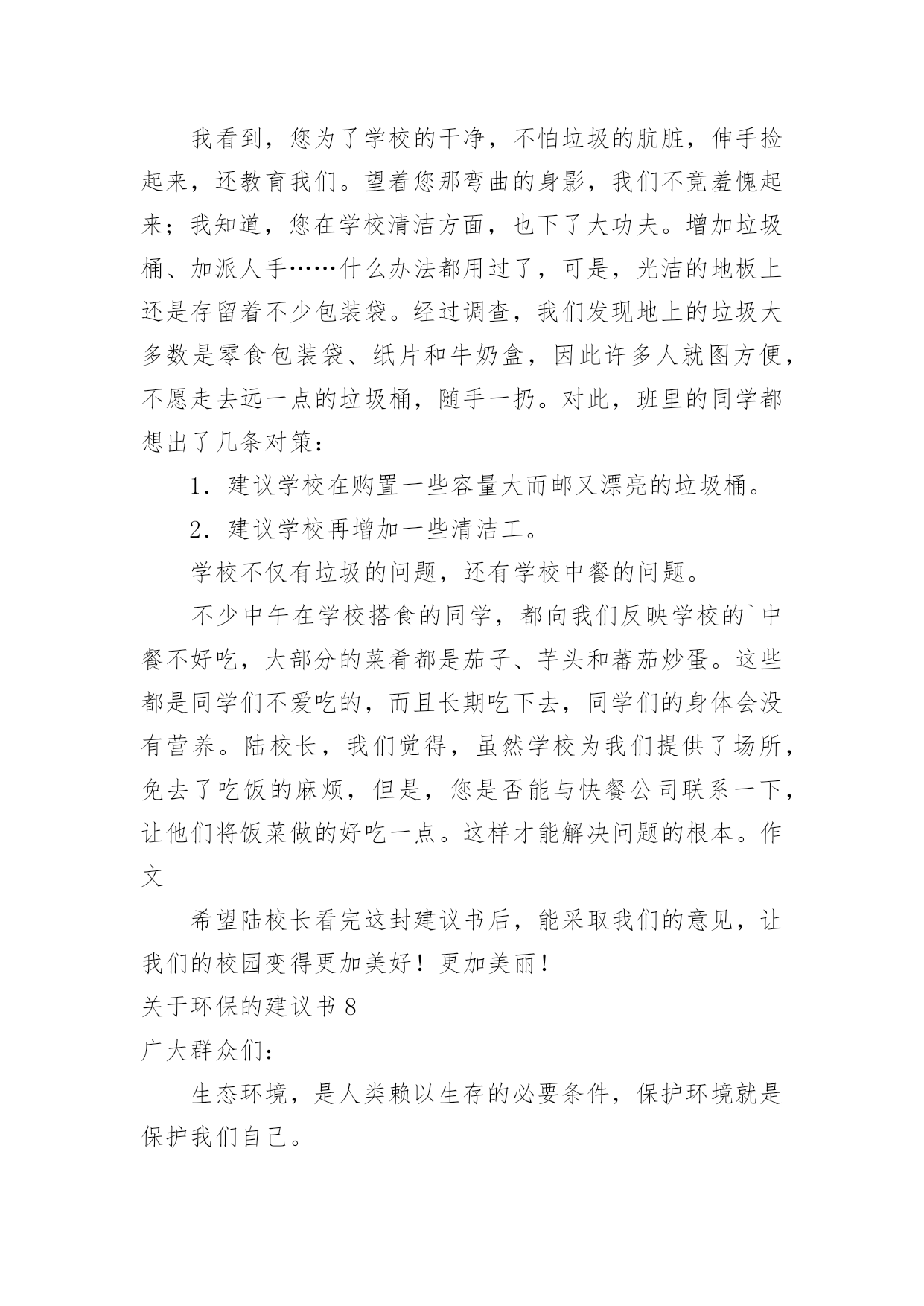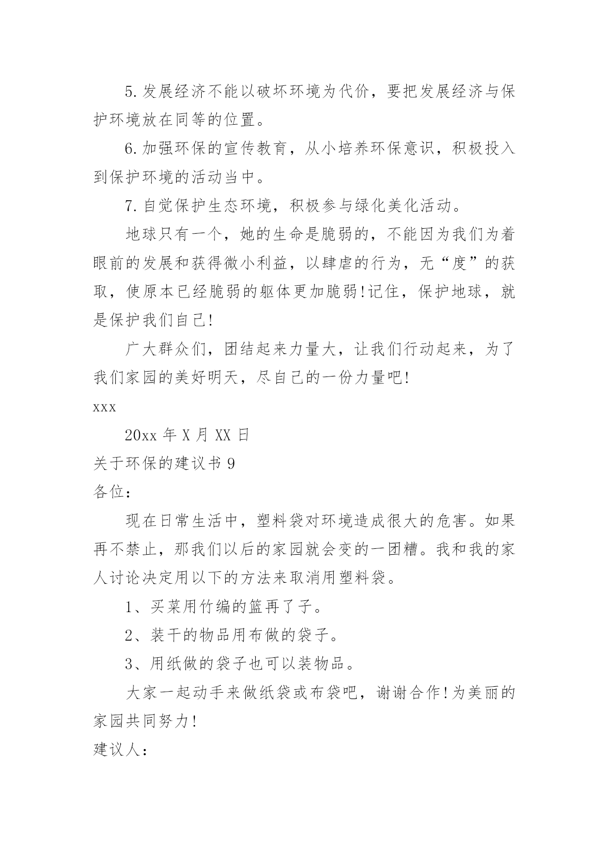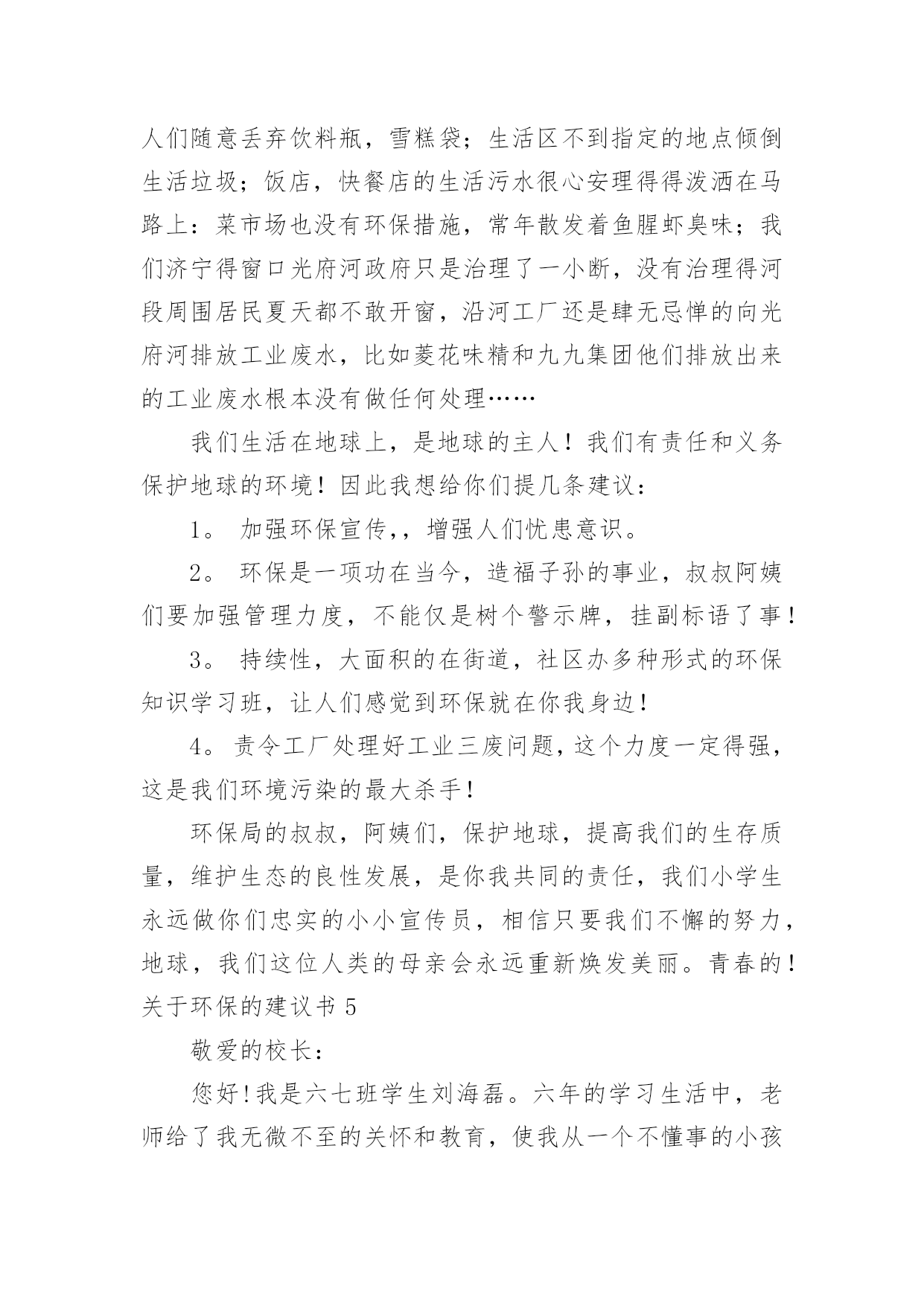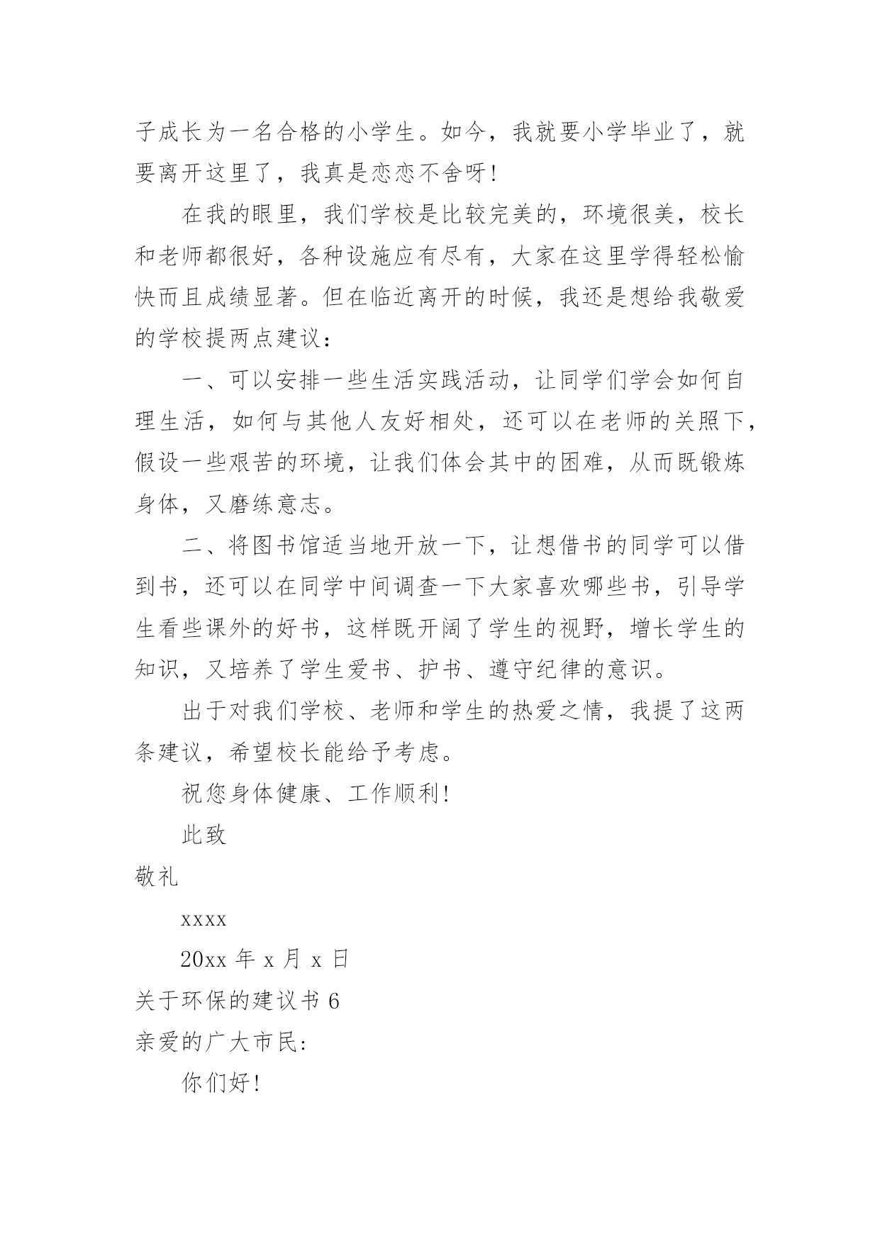 环保的建议书关于环保的建议书【精】随着社会不断地进步,越来越多地方需要用到建议书,当建议书是面对群体时,可以宣传、鼓动对方去开展某项工作或进行某种活动,具有一定的号召性。那么,怎么去写建议书呢?下面是小编精心整理的关于环保的建议书,希望对大家有所帮助。关于环保的建议书1尊敬的环保局局长你好:我们的中国母亲已经成为“东方巨人”真正的国富民强。可对于城市的环境建设尤其是垃圾的处理还不妥当。垃圾的处理通常是用土填埋,可垃圾十分难以自然降解,聚乙烯制成的塑料,随手丢弃的玻璃,百万年,千万年以后,它还是它,不会分解也不会消失。即便是我们常用的纸,也需要3—4个月才能自然降解。单是北京就有几百处垃圾填埋点,我们雄伟壮观的天安门,经常被漫漫黄沙无情的拍打,真叫人心痛。而这一切都是因为我们过度填埋垃圾造成的,难道我们就不能把垃圾变费为宝吗?据统计全国每年固体废物造成的经济损失,以及可利用而未充分利用的废物资源价值约达300亿人民币。其实可循环利用的东西有很多,比如200个易拉罐就可以制造一辆自行车,把全国丢掉的钢铁合起来竟能造百架波音客机。而这些“垃圾”已经被我们没入到了黄土中,谁能无动于衷呢?我建议大家不仅要妥善处理好垃圾,更要学会变废为宝。例如:北京奥运会就用塑料制作了可穿的T恤,平均只用5个可降解塑料瓶就能做一件漂亮的T恤。我建议以下几点:1、多举行一些大型公益的环保活动。2、垃圾分类,不填埋,用垃圾焚烧来发电,回收再利用。3、想通过广播、电视等公共媒体进行环保宣传。4、号召人们少用一次性东西,用环保购物袋。最后,我希望您能采纳我的意见。此致敬礼!20xx年11月1日六年级:**关于环保的建议书2广大的群众们:有句话叫做:“拯救地球就是拯救未来。”这句话是XX年世界环保日的主题。人类的生活需要水资源,森林资源、生物资源、大气资源,本来是可以不断再生的,长期给人类做贡献的。可是,由于人类的随意破坏自然资源,不顾后果的滥用化学品,不但使这些资源不能再生,还造成了一系列的生态灾难。所以,现在我向大家提出以下要求:1、节约用水。如:洗米的水可以用来洗菜,洗衣后的水可以用来冲厕所,吸收可以把水龙头调到适中等等。2、节约纸张。如:废弃的纸张可以一页一页搜集起来做小本子。剩下没用完的本子可以用来做草稿本等。大家一定要记住:纸是用树木做的,假如全国每人一星期浪费35张纸,全国那么多人,那一年得浪费多少张纸呀!得砍多少棵树呀!为了让我们的大树伯伯不再受折磨,请珍惜纸张吧。3、请大家尽量不吃对人类有益的动物,好吗?不知道为什么,现在草丛里的青蛙已经越来越少了,它们是在“睡觉”吗?不!其实它们与其说是在“睡觉”,不如说是被人类吃掉了。所以,请大家爱护动物、不吃对人类有益的动物。4、少用塑料袋。塑料袋的危害是多么的厉害,你知道吗?它把空气给污染了,它在水里阻止着水的流动,在土里阻止植物吸收水分,而且它还严重的占用土地,我们人类对它完全没有办法,烧了它,还会污染空气。埋了它,还会占用土地。所以请少用、尽量不用塑料袋。虽然我国从整体上来看经济比以前有了很大的进展,人们的生活也富裕了很多,但生活中我们还是应该提倡节约、提倡环保。所以希望大家能够做到以上这几点,这只是一个六年级小学生小小的心愿而已!一位爱环保的小学生X年X月X日关于环保的建议书3临湘市政府:地球是我们的家,同时也是我们的母亲,地球无偿的供给我们各种资源,而我们却在为一些蝇头小利不顾后果的肆意去破坏她。正如《只有一个地球》这篇课文说的,我们不能指望破坏了地球移居到别的星球上去,地球如果灭亡了,那么降临到地球上的命运终究也会降临到人类身上。所以,我们亡羊补牢,为时不晚,保护我们的地球,爱护环境,望做到以下几点:1、珍惜现在的每一口空气,把工厂带来的污染尽量减少,要制止乱砍乱伐森林的行为,要少破坏大自然;2、不要滥用各种资源,如煤,矿,木,水……如果这些资源被无止境的开采,当没有资源时,就不能生存了。3、水是生命之源,但它又太少了,用洗菜的水可以洗碗,用洗衣服的水冲马桶。虽然我们一两个人改变不了地球的命运,但是要全国人民都从身边的小事做起,保护地球,地球就能炫出青春的笑脸。关于环保的建议书4环保局的叔叔阿姨们:你们好!我是一名小学生,我和我的小伙伴们都渴望在一个美丽洁净的环境中生活·学习·玩耍。可是现实的环境,还有人们的环保意识都有很多不尽人意的地方。如:新世纪广场上人们随意丢弃饮料瓶,雪糕袋;生活区不到指定的地点倾倒生活垃圾;饭店,快餐店的生活污水很心安理得得泼洒在马路上:菜市场也没有环保措施,常年散发着鱼腥虾臭味;我们济宁得窗口光府河政府只是治理了一小断,没有治理得河段周围居民夏天都不敢开窗,沿河工厂还是肆无忌惮的向光府河排放工业废水,比如菱花味精和九九集团他们排放出来的工业废水根本没有做任何处理…