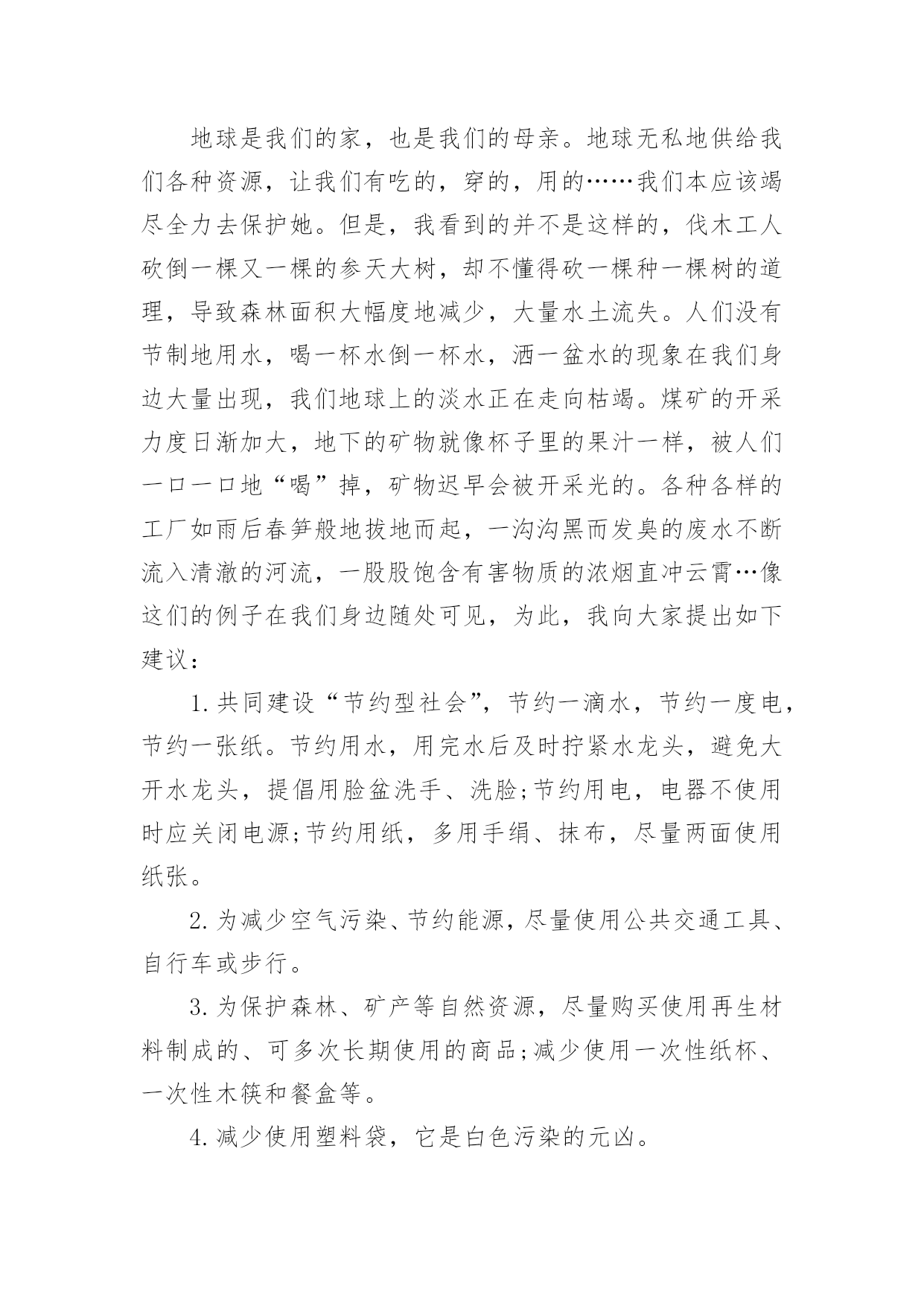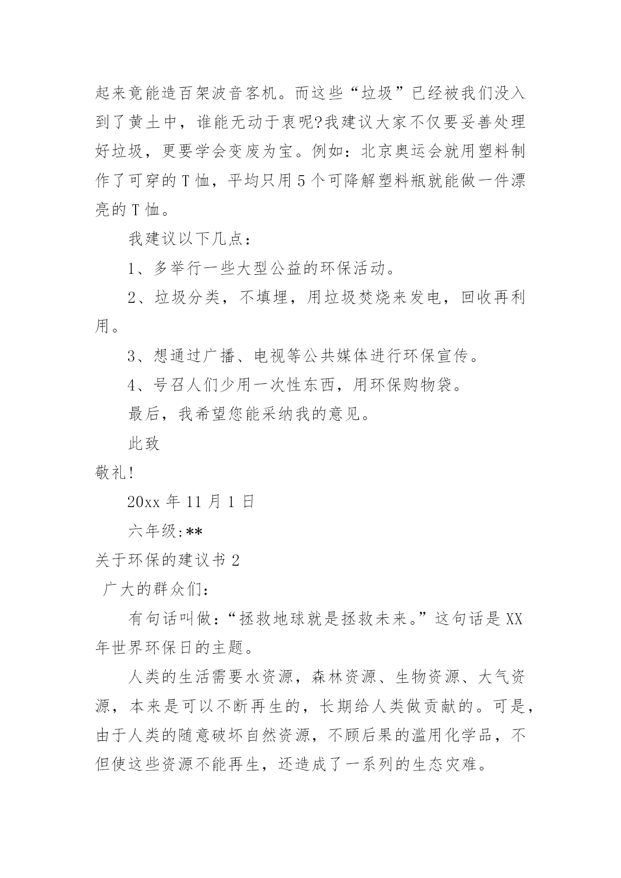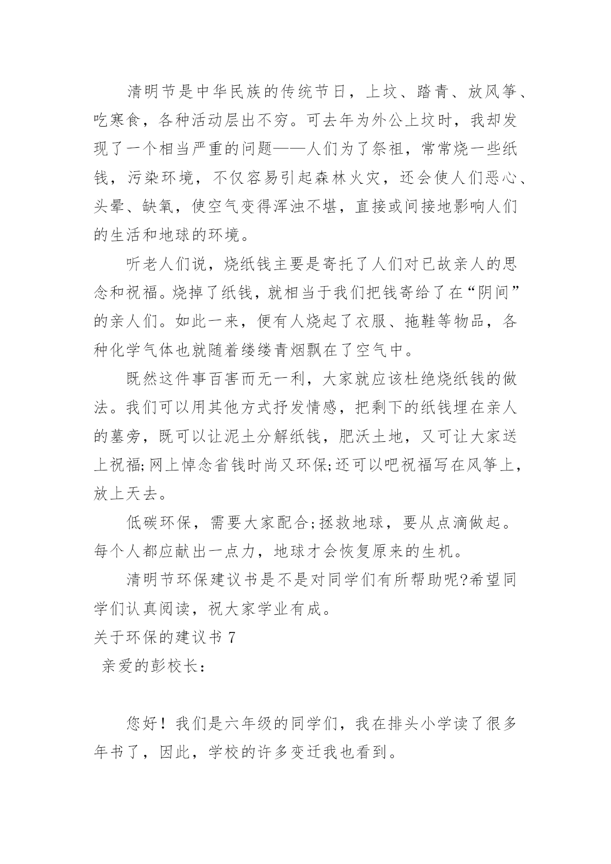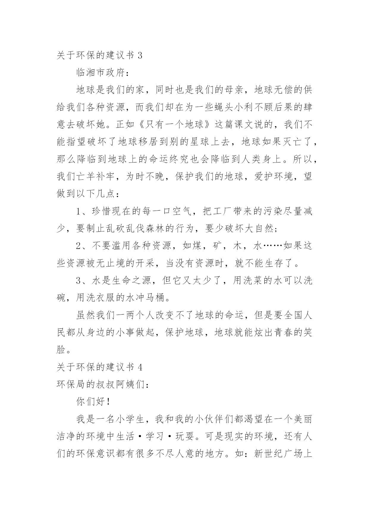 环保的建议书关于环保的建议书【精】随着社会不断地进步,越来越多地方需要用到建议书,当建议书是面对群体时,可以宣传、鼓动对方去开展某项工作或进行某种活动,具有一定的号召性。那么,怎么去写建议书呢?下面是小编精心整理的关于环保的建议书,希望对大家有所帮助。关于环保的建议书1尊敬的环保局局长你好:我们的中国母亲已经成为“东方巨人”真正的国富民强。可对于城市的环境建设尤其是垃圾的处理还不妥当。垃圾的处理通常是用土填埋,可垃圾十分难以自然降解,聚乙烯制成的塑料,随手丢弃的玻璃,百万年,千万年以后,它还是它,不会分解也不会消失。即便是我们常用的纸,也需要3—4个月才能自然降解。单是北京就有几百处垃圾填埋点,我们雄伟壮观的天安门,经常被漫漫黄沙无情的拍打,真叫人心痛。而这一切都是因为我们过度填埋垃圾造成的,难道我们就不能把垃圾变费为宝吗?据统计全国每年固体废物造成的经济损失,以及可利用而未充分利用的废物资源价值约达300亿人民币。其实可循环利用的东西有很多,比如200个易拉罐就可以制造一辆自行车,把全国丢掉的钢铁合起来竟能造百架波音客机。而这些“垃圾”已经被我们没入到了黄土中,谁能无动于衷呢?我建议大家不仅要妥善处理好垃圾,更要学会变废为宝。例如:北京奥运会就用塑料制作了可穿的T恤,平均只用5个可降解塑料瓶就能做一件漂亮的T恤。我建议以下几点:1、多举行一些大型公益的环保活动。2、垃圾分类,不填埋,用垃圾焚烧来发电,回收再利用。3、想通过广播、电视等公共媒体进行环保宣传。4、号召人们少用一次性东西,用环保购物袋。最后,我希望您能采纳我的意见。此致敬礼!20xx年11月1日六年级:**关于环保的建议书2广大的群众们:有句话叫做:“拯救地球就是拯救未来。”这句话是XX年世界环保日的主题。人类的生活需要水资源,森林资源、生物资源、大气资源,本来是可以不断再生的,长期给人类做贡献的。可是,由于人类的随意破坏自然资源,不顾后果的滥用化学品,不但使这些资源不能再生,还造成了一系列的生态灾难。所以,现在我向大家提出以下要求:1、节约用水。如:洗米的水可以用来洗菜,洗衣后的水可以用来冲厕所,吸收可以把水龙头调到适中等等。2、节约纸张。如:废弃的纸张可以一页一页搜集起来做小本子。剩下没用完的本子可以用来做草稿本等。大家一定要记住:纸是用树木做的,假如全国每人一星期浪费35张纸,全国那么多人,那一年得浪费多少张纸呀!得砍多少棵树呀!为了让我们的大树伯伯不再受折磨,请珍惜纸张吧。3、请大家尽量不吃对人类有益的动物,好吗?不知道为什么,现在草丛里的青蛙已经越来越少了,它们是在“睡觉”吗?不!其实它们与其说是在“睡觉”,不如说是被人类吃掉了。所以,请大家爱护动物、不吃对人类有益的动物。4、少用塑料袋。塑料袋的危害是多么的厉害,你知道吗?它把空气给污染了,它在水里阻止着水的流动,在土里阻止植物吸收水分,而且它还严重的占用土地,我们人类对它完全没有办法,烧了它,还会污染空气。埋了它,还会占用土地。所以请少用、尽量不用塑料袋。虽然我国从整体上来看经济比以前有了很大的进展,人们的生活也富裕了很多,但生活中我们还是应该提倡节约、提倡环保。所以希望大家能够做到以上这几点,这只是一个六年级小学生小小的心愿而已!一位爱环保的小学生X年X月X日关于环保的建议书3临湘市政府:地球是我们的家,同时也是我们的母亲,地球无偿的供给我们各种资源,而我们却在为一些蝇头小利不顾后果的肆意去破坏她。正如《只有一个地球》这篇课文说的,我们不能指望破坏了地球移居到别的星球上去,地球如果灭亡了,那么降临到地球上的命运终究也会降临到人类身上。所以,我们亡羊补牢,为时不晚,保护我们的地球,爱护环境,望做到以下几点:1、珍惜现在的每一口空气,把工厂带来的污染尽量减少,要制止乱砍乱伐森林的行为,要少破坏大自然;2、不要滥用各种资源,如煤,矿,木,水……如果这些资源被无止境的开采,当没有资源时,就不能生存了。3、水是生命之源,但它又太少了,用洗菜的水可以洗碗,用洗衣服的水冲马桶。虽然我们一两个人改变不了地球的命运,但是要全国人民都从身边的小事做起,保护地球,地球就能炫出青春的笑脸。关于环保的建议书4环保局的叔叔阿姨们:你们好!我是一名小学生,我和我的小伙伴们都渴望在一个美丽洁净的环境中生活·学习·玩耍。可是现实的环境,还有人们的环保意识都有很多不尽人意的地方。如:新世纪广场上人们随意丢弃饮料瓶,雪糕袋;生活区不到指定的地点倾倒生活垃圾;饭店,快餐店的生活污水很心安理得得泼洒在马路上:菜市场也没有环保措施,常年散发着鱼腥虾臭味;我们济宁得窗口光府河政府只是治理了一小断,没有治理得河段周围居民夏天都不敢开窗,沿河工厂还是肆无忌惮的向光府河排放工业废水,比如菱花味精和九九集团他们排放出来的工业废水根本没有做任何处理…