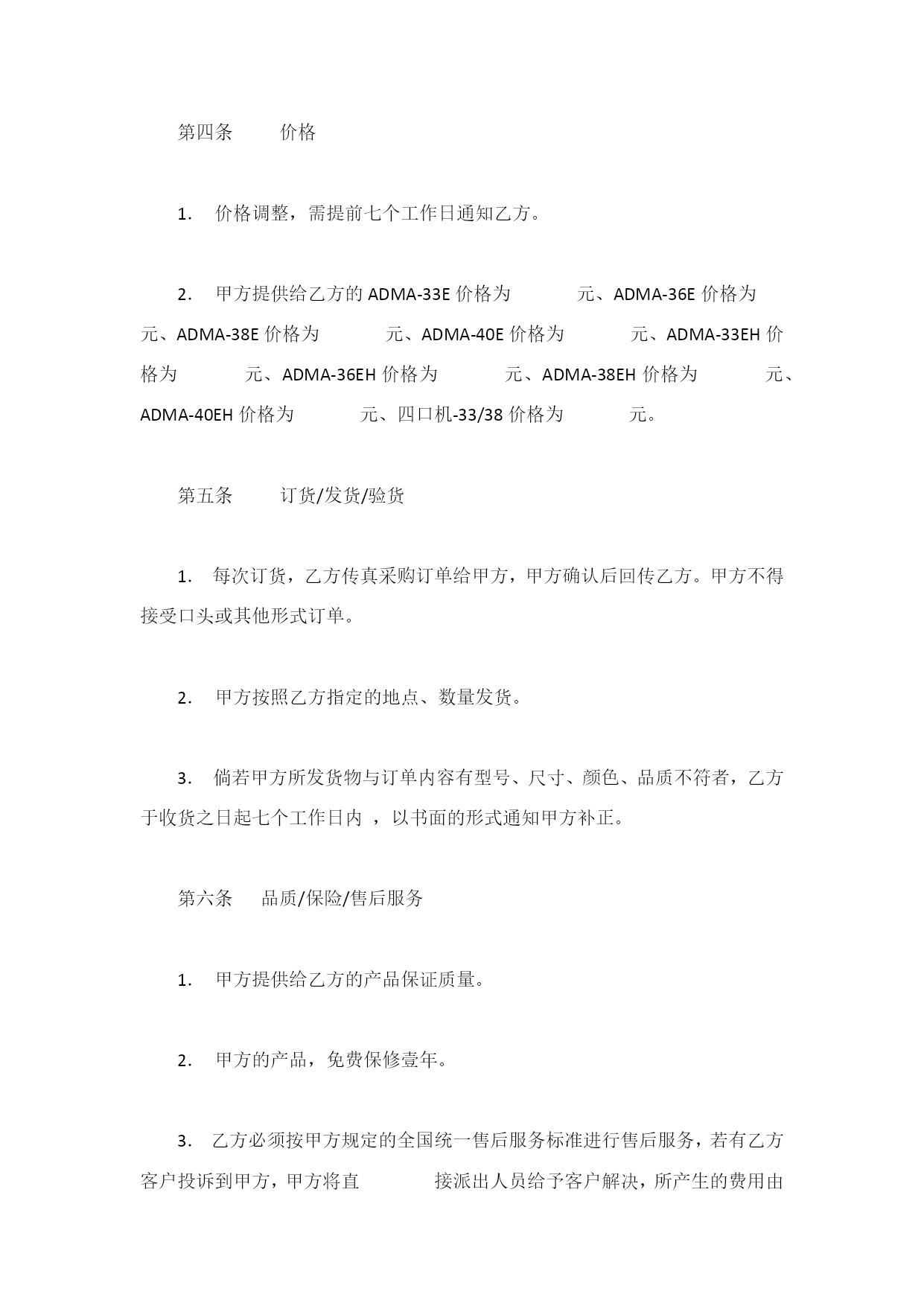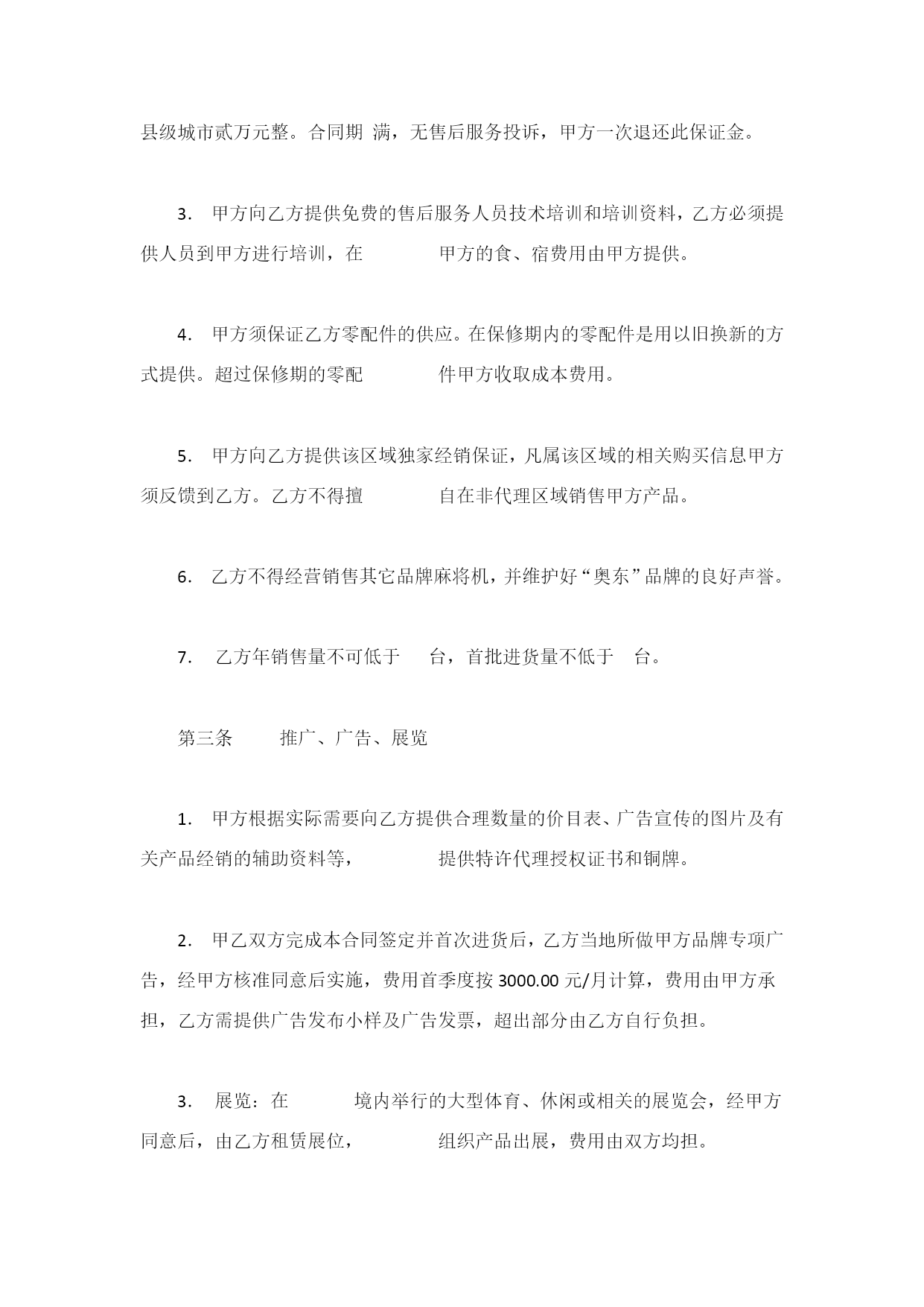 机械销售代理合同甲方:乙方:地址:地址:电话:电话:传真:传真:经甲、乙双方经友好协商,本着互惠互利、共同发展的原则,就以下区域代理销售“奥东”牌pvc地板签订如下协议:第一条定义1.产品:本协议所称产品,由甲方生产的“奥东”全自动麻将机。2.商标:“奥东”3.区域:第二条合作方式及条件1.经销:乙方代理销售甲方“奥东”pvc地板。2.乙方向甲方交纳服务及销售保证金省会城市五万元、市级城市叁万元、县级城市贰万元整。合同期满,无售后服务投诉,甲方一次退还此保证金。3.甲方向乙方提供免费的售后服务人员技术培训和培训资料,乙方必须提供人员到甲方进行培训,在甲方的食、宿费用由甲方提供。4.甲方须保证乙方零配件的供应。在保修期内的零配件是用以旧换新的方式提供。超过保修期的零配件甲方收取成本费用。5.甲方向乙方提供该区域独家经销保证,凡属该区域的相关购买信息甲方须反馈到乙方。乙方不得擅自在非代理区域销售甲方产品。6.乙方不得经营销售其它品牌麻将机,并维护好“奥东”品牌的良好声誉。7.乙方年销售量不可低于台,首批进货量不低于台。第三条推广、广告、展览1.甲方根据实际需要向乙方提供合理数量的价目表、广告宣传的图片及有关产品经销的辅助资料等,提供特许代理授权证书和铜牌。2.甲乙双方完成本合同签定并首次进货后,乙方当地所做甲方品牌专项广告,经甲方核准同意后实施,费用首季度按3000.00元/月计算,费用由甲方承担,乙方需提供广告发布小样及广告发票,超出部分由乙方自行负担。3.展览:在境内举行的大型体育、休闲或相关的展览会,经甲方同意后,由乙方租赁展位,组织产品出展,费用由双方均担。第四条价格1.价格调整,需提前七个工作日通知乙方。2.甲方提供给乙方的ADMA-33E价格为元、ADMA-36E价格为元、ADMA-38E价格为元、ADMA-40E价格为元、ADMA-33EH价格为元、ADMA-36EH价格为元、ADMA-38EH价格为元、ADMA-40EH价格为元、四口机-33/38价格为元。第五条订货/发货/验货1.每次订货,乙方传真采购订单给甲方,甲方确认后回传乙方。甲方不得接受口头或其他形式订单。2.甲方按照乙方指定的地点、数量发货。3.倘若甲方所发货物与订单内容有型号、尺寸、颜色、品质不符者,乙方于收货之日起七个工作日内,以书面的形式通知甲方补正。第六条品质/保险/售后服务1.甲方提供给乙方的产品保证质量。2.甲方的产品,免费保修壹年。3.乙方必须按甲方规定的全国统一售后服务标准进行售后服务,若有乙方客户投诉到甲方,甲方将直接派出人员给予客户解决,所产生的费用由乙方承担,甲方将直接从乙方年终的维保费中扣出。第七条保密1.乙方不得向第三人提及双方合作事宜。2.乙方不得将其所知有关甲方营业方法或其它甲方认为应保密之资讯泄露给第三人。第八条违约责任/终止条款双方在合作期限内如违反以上协议,则应由违约方负担由此引起的一切违约责任,同时另一方有权终止此合同。第九条争议的解决凡有关合约或执行中所发生的一切争议,双方应协商解决,或由双方有管辖权的人民法院处理。第十条协议期限本协议有效期为月,自至止。在合作期限内必须完成台的基本销售量。方可签署正式合作代理销售合同。甲方:苏州市志利地板有限公司乙方:法人代表:董事长法人代表:签约人:签约人:日期:日期: