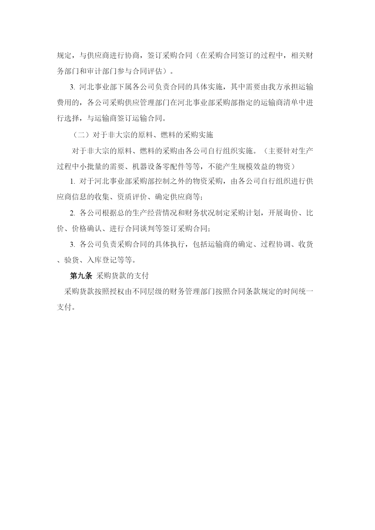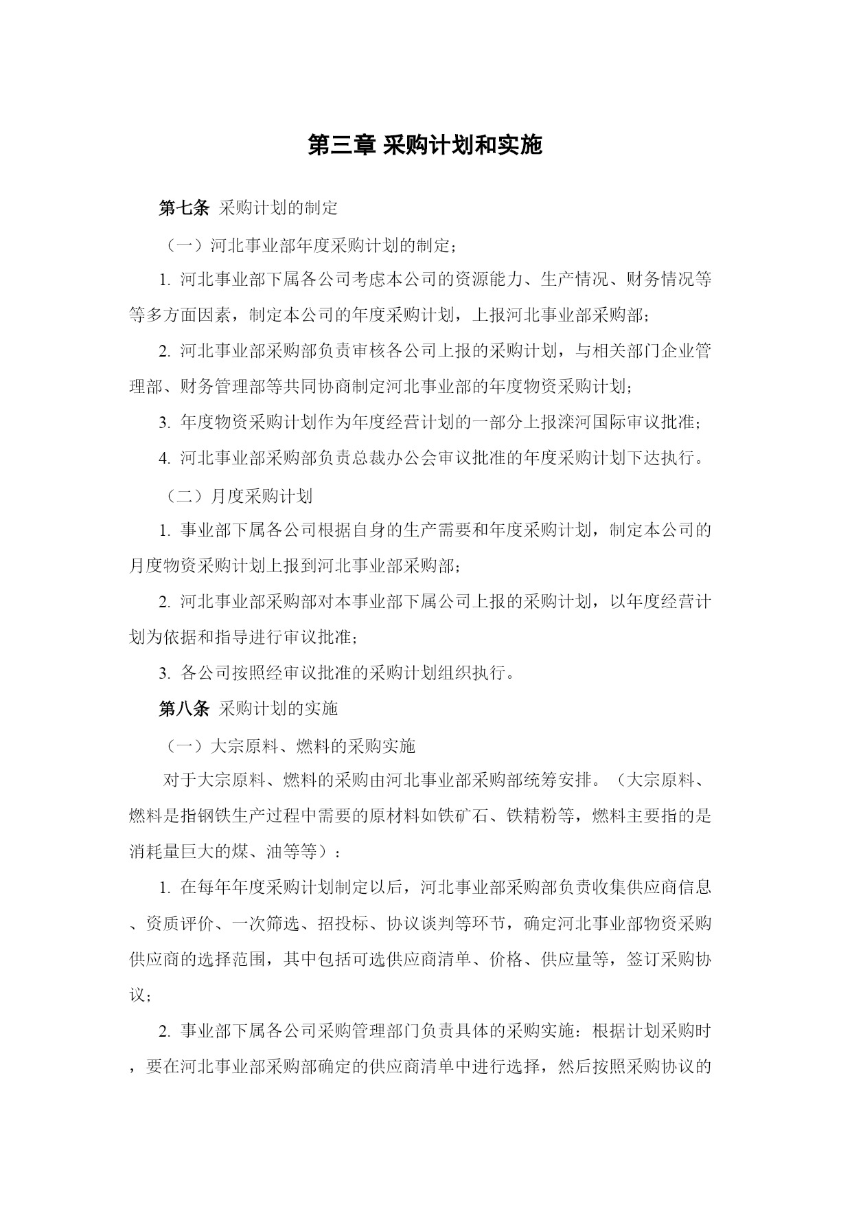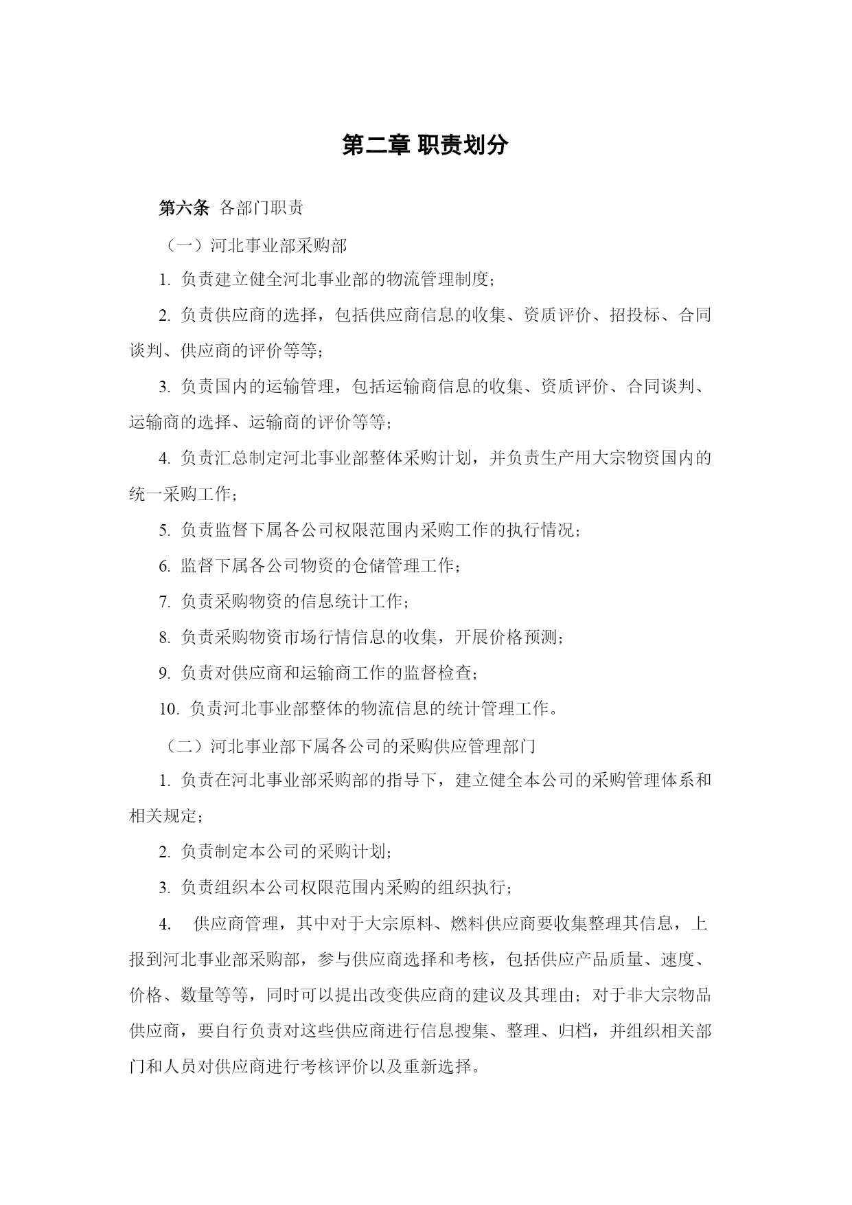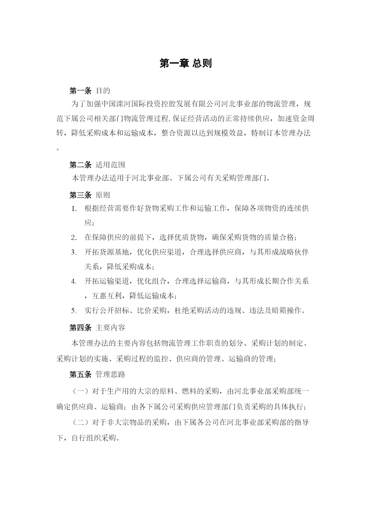 中国滦河国际投资控股公司物流管理办法北大纵横管理咨询公司二○○四年三月目录TOC\o"1-3"\h\z\u第一章总则2第二章职责划分4第三章采购计划和实施6第四章采购监控8第五章供应商管理9第六章运输商管理11第五章附则13第一章总则目的为了加强中国滦河国际投资控股发展有限公司河北事业部的物流管理,规范下属公司相关部门物流管理过程,保证经营活动的正常持续供应,加速资金周转,降低采购成本和运输成本,整合资源以达到规模效益,特制订本管理办法。适用范围本管理办法适用于河北事业部、下属公司有关采购管理部门。原则根据经营需要作好货物采购工作和运输工作,保障各项物资的连续供应;在保障供应的前提下,选择优质货物,确保采购货物的质量合格;开拓货源基地,优化供应渠道,合理选择供应商,与其形成战略伙伴关系,降低采购成本;开拓运输渠道,优化组合,合理选择运输商,与其形成长期合作关系,互惠互利,降低运输成本;实行公开招标、比价采购,杜绝采购活动的违规、违法及暗箱操作。主要内容本管理办法的主要内容包括物流管理工作职责的划分、采购计划的制定、采购计划的实施、采购过程的监控、供应商的管理、运输商的管理;管理思路对于生产用的大宗的原料、燃料的采购,由河北事业部采购部统一确定供应商、运输商;由各下属公司采购供应管理部门负责采购的具体执行;对于非大宗物品的采购,由下属各公司在河北事业部采购部的指导下,自行组织采购。第二章职责划分各部门职责河北事业部采购部负责建立健全河北事业部的物流管理制度;负责供应商的选择,包括供应商信息的收集、资质评价、招投标、合同谈判、供应商的评价等等;负责国内的运输管理,包括运输商信息的收集、资质评价、合同谈判、运输商的选择、运输商的评价等等;负责汇总制定河北事业部整体采购计划,并负责生产用大宗物资国内的统一采购工作;负责监督下属各公司权限范围内采购工作的执行情况;监督下属各公司物资的仓储管理工作;负责采购物资的信息统计工作;负责采购物资市场行情信息的收集,开展价格预测;负责对供应商和运输商工作的监督检查;负责河北事业部整体的物流信息的统计管理工作。河北事业部下属各公司的采购供应管理部门负责在河北事业部采购部的指导下,建立健全本公司的采购管理体系和相关规定;负责制定本公司的采购计划;负责组织本公司权限范围内采购的组织执行;供应商管理,其中对于大宗原料、燃料供应商要收集整理其信息,上报到河北事业部采购部,参与供应商选择和考核,包括供应产品质量、速度、价格、数量等等,同时可以提出改变供应商的建议及其理由;对于非大宗物品供应商,要自行负责对这些供应商进行信息搜集、整理、归档,并组织相关部门和人员对供应商进行考核评价以及重新选择。运输商管理:参与运输商的选择,在河北事业部采购部一经确定了运输商之后,下属各公司要在确定的运输商范围内选择运输商,同时负责对运输商的工作进行监督,记录,参与对运输商的考核评价。与此同时收集运输商的市场信息,提出改换运输商的建议和理由。制定仓储管理条例并执行;负责本公司的物流信息的统计和上报工作。第三章采购计划和实施采购计划的制定河北事业部年度采购计划的制定;河北事业部下属各公司考虑本公司的资源能力、生产情况、财务情况等等多方面因素,制定本公司的年度采购计划,上报河北事业部采购部;河北事业部采购部负责审核各公司上报的采购计划,与相关部门企业管理部、财务管理部等共同协商制定河北事业部的年度物资采购计划;年度物资采购计划作为年度经营计划的一部分上报滦河国际审议批准;河北事业部采购部负责总裁办公会审议批准的年度采购计划下达执行。月度采购计划事业部下属各公司根据自身的生产需要和年度采购计划,制定本公司的月度物资采购计划上报到河北事业部采购部;河北事业部采购部对本事业部下属公司上报的采购计划,以年度经营计划为依据和指导进行审议批准;各公司按照经审议批准的采购计划组织执行。采购计划的实施大宗原料、燃料的采购实施对于大宗原料、燃料的采购由河北事业部采购部统筹安排。(大宗原料、燃料是指钢铁生产过程中需要的原材料如铁矿石、铁精粉等,燃料主要指的是消耗量巨大的煤、油等等):在每年年度采购计划制定以后,河北事业部采购部负责收集供应商信息、资质评价、一次筛选、招投标、协议谈判等环节,确定河北事业部物资采购供应商的选择范围,其中包括可选供应商清单、价格、供应量等,签订采购协议;事业部下属各公司采购管理部门负责具体的采购实施:根据计划采购时,要在河北事业部采购部确定的供应商清单中进行选择,然后按照采购协议的规定,与供应商进行协商,签订采购合同(在采购合同签订的