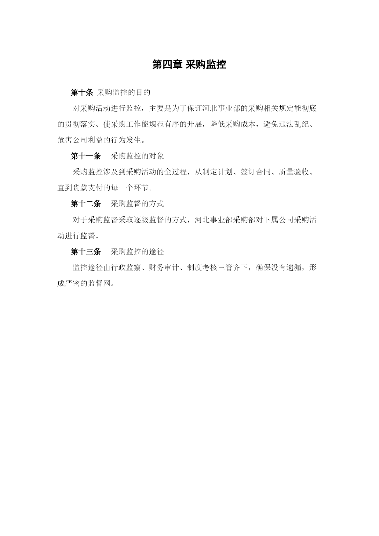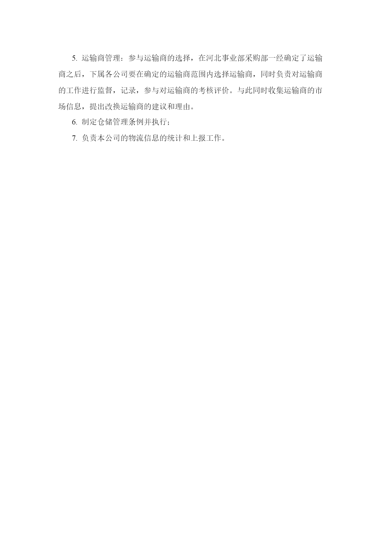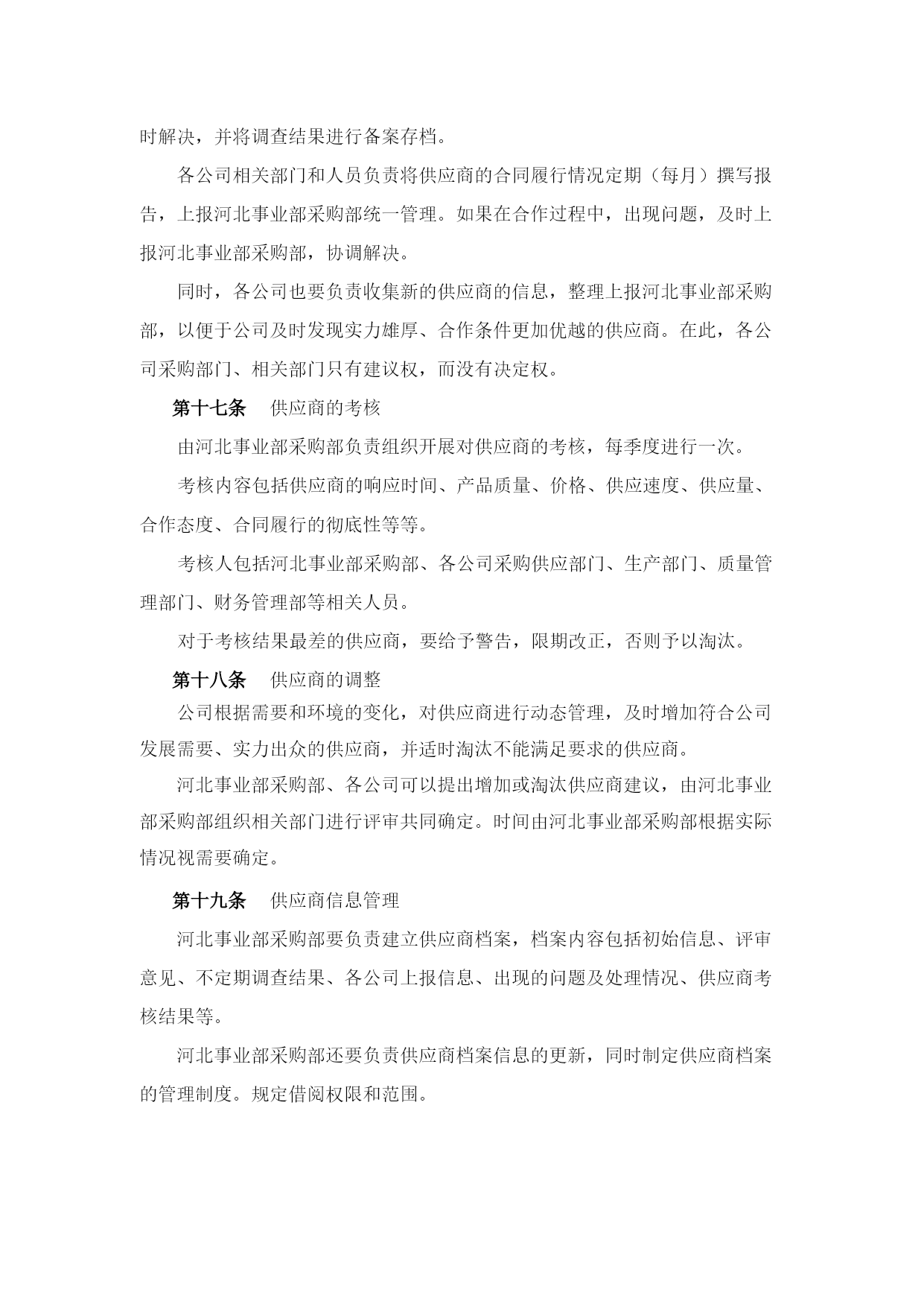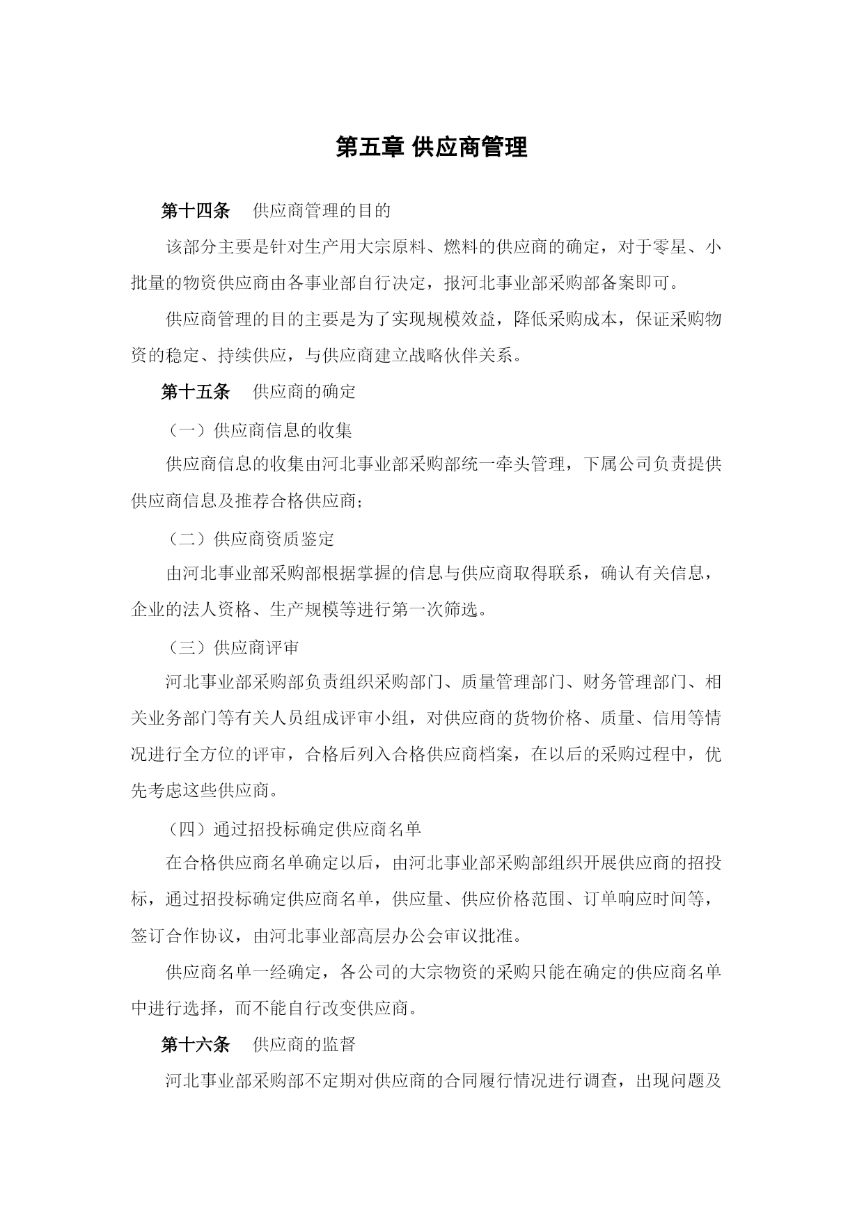 中国滦河国际投资控股公司物流管理办法北大纵横管理咨询公司二○○四年三月目录TOC\o"1-3"\h\z\u第一章总则2第二章职责划分4第三章采购计划和实施6第四章采购监控8第五章供应商管理9第六章运输商管理11第五章附则13第一章总则目的为了加强中国滦河国际投资控股发展有限公司河北事业部的物流管理,规范下属公司相关部门物流管理过程,保证经营活动的正常持续供应,加速资金周转,降低采购成本和运输成本,整合资源以达到规模效益,特制订本管理办法。适用范围本管理办法适用于河北事业部、下属公司有关采购管理部门。原则根据经营需要作好货物采购工作和运输工作,保障各项物资的连续供应;在保障供应的前提下,选择优质货物,确保采购货物的质量合格;开拓货源基地,优化供应渠道,合理选择供应商,与其形成战略伙伴关系,降低采购成本;开拓运输渠道,优化组合,合理选择运输商,与其形成长期合作关系,互惠互利,降低运输成本;实行公开招标、比价采购,杜绝采购活动的违规、违法及暗箱操作。主要内容本管理办法的主要内容包括物流管理工作职责的划分、采购计划的制定、采购计划的实施、采购过程的监控、供应商的管理、运输商的管理;管理思路对于生产用的大宗的原料、燃料的采购,由河北事业部采购部统一确定供应商、运输商;由各下属公司采购供应管理部门负责采购的具体执行;对于非大宗物品的采购,由下属各公司在河北事业部采购部的指导下,自行组织采购。第二章职责划分各部门职责河北事业部采购部负责建立健全河北事业部的物流管理制度;负责供应商的选择,包括供应商信息的收集、资质评价、招投标、合同谈判、供应商的评价等等;负责国内的运输管理,包括运输商信息的收集、资质评价、合同谈判、运输商的选择、运输商的评价等等;负责汇总制定河北事业部整体采购计划,并负责生产用大宗物资国内的统一采购工作;负责监督下属各公司权限范围内采购工作的执行情况;监督下属各公司物资的仓储管理工作;负责采购物资的信息统计工作;负责采购物资市场行情信息的收集,开展价格预测;负责对供应商和运输商工作的监督检查;负责河北事业部整体的物流信息的统计管理工作。河北事业部下属各公司的采购供应管理部门负责在河北事业部采购部的指导下,建立健全本公司的采购管理体系和相关规定;负责制定本公司的采购计划;负责组织本公司权限范围内采购的组织执行;供应商管理,其中对于大宗原料、燃料供应商要收集整理其信息,上报到河北事业部采购部,参与供应商选择和考核,包括供应产品质量、速度、价格、数量等等,同时可以提出改变供应商的建议及其理由;对于非大宗物品供应商,要自行负责对这些供应商进行信息搜集、整理、归档,并组织相关部门和人员对供应商进行考核评价以及重新选择。运输商管理:参与运输商的选择,在河北事业部采购部一经确定了运输商之后,下属各公司要在确定的运输商范围内选择运输商,同时负责对运输商的工作进行监督,记录,参与对运输商的考核评价。与此同时收集运输商的市场信息,提出改换运输商的建议和理由。制定仓储管理条例并执行;负责本公司的物流信息的统计和上报工作。第三章采购计划和实施采购计划的制定河北事业部年度采购计划的制定;河北事业部下属各公司考虑本公司的资源能力、生产情况、财务情况等等多方面因素,制定本公司的年度采购计划,上报河北事业部采购部;河北事业部采购部负责审核各公司上报的采购计划,与相关部门企业管理部、财务管理部等共同协商制定河北事业部的年度物资采购计划;年度物资采购计划作为年度经营计划的一部分上报滦河国际审议批准;河北事业部采购部负责总裁办公会审议批准的年度采购计划下达执行。月度采购计划事业部下属各公司根据自身的生产需要和年度采购计划,制定本公司的月度物资采购计划上报到河北事业部采购部;河北事业部采购部对本事业部下属公司上报的采购计划,以年度经营计划为依据和指导进行审议批准;各公司按照经审议批准的采购计划组织执行。采购计划的实施大宗原料、燃料的采购实施对于大宗原料、燃料的采购由河北事业部采购部统筹安排。(大宗原料、燃料是指钢铁生产过程中需要的原材料如铁矿石、铁精粉等,燃料主要指的是消耗量巨大的煤、油等等):在每年年度采购计划制定以后,河北事业部采购部负责收集供应商信息、资质评价、一次筛选、招投标、协议谈判等环节,确定河北事业部物资采购供应商的选择范围,其中包括可选供应商清单、价格、供应量等,签订采购协议;事业部下属各公司采购管理部门负责具体的采购实施:根据计划采购时,要在河北事业部采购部确定的供应商清单中进行选择,然后按照采购协议的规定,与供应商进行协商,签订采购合同(在采购合同签订的