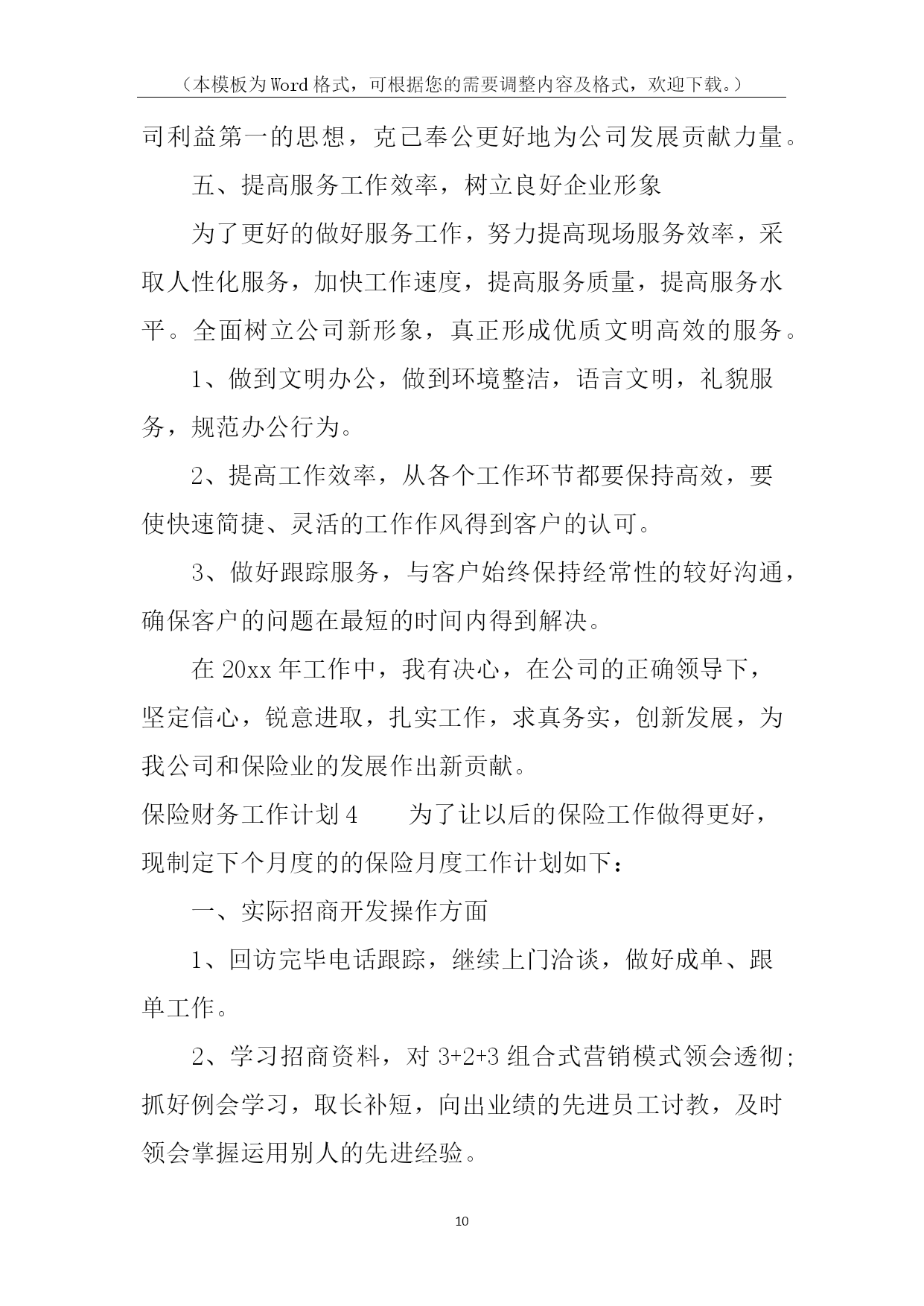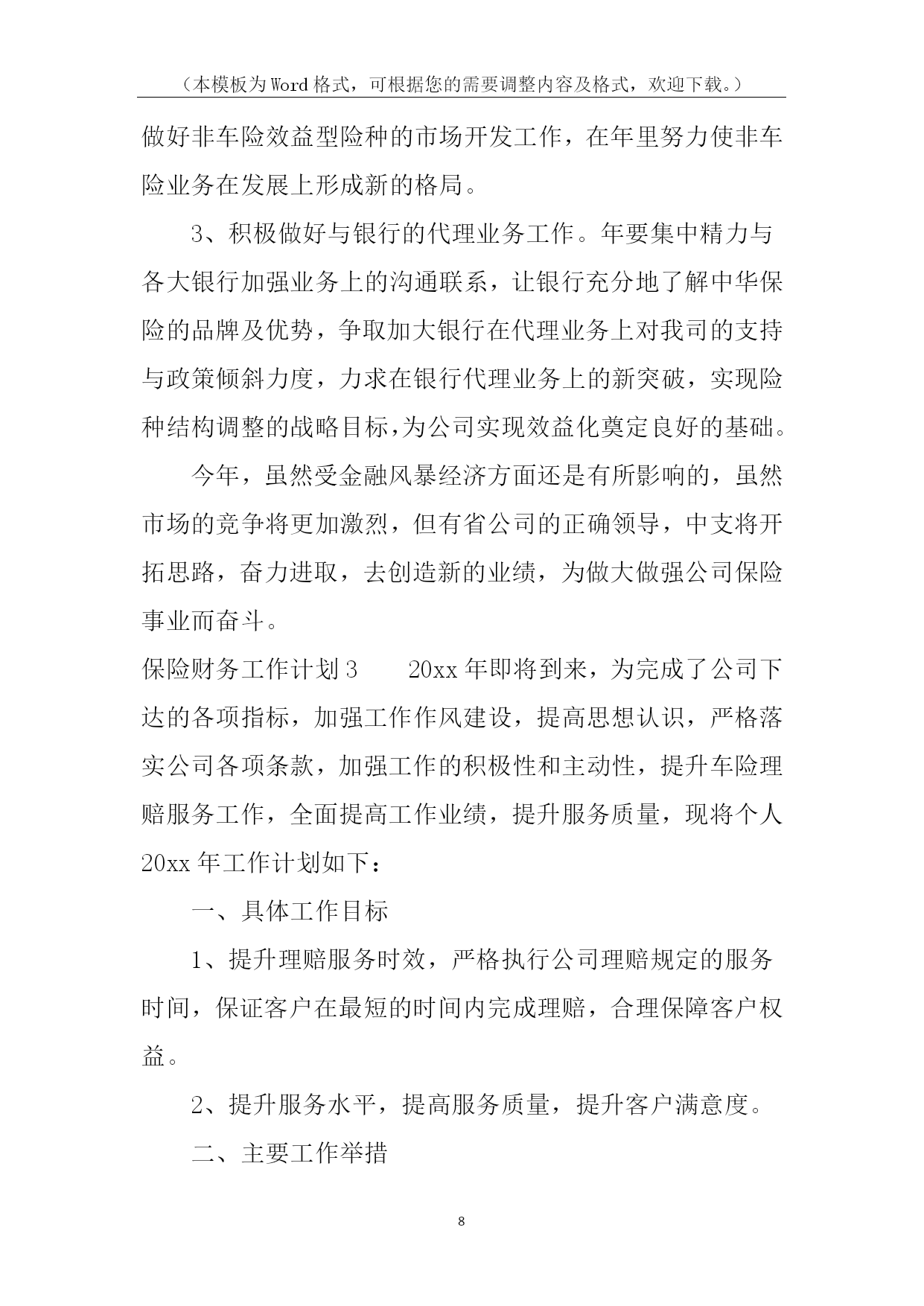 (本模板为Word格式,可根据您的需要调整内容及格式,欢迎下载。)PAGE\*MERGEFORMAT12保险财务工作计划保险财务工作计划1新的一年,我们将按照局下发的“”规划的各项发展要求,结合自身实际,围绕分公司总经理室的具体要求,坚持固强、抓弱、补缺、创新的总体工作思路,在转变思维上做文章,在科学发展上使狠劲,在人才建设上动脑筋,努力完成分公司下达的年度指标,确保支公司的各项建设在原有的良好基础上有新的提升。一、不断转变思维观念,增强发展信心强化危机意识,增强发展的紧迫感。面对竟争激烈的市场环境,公司一大批中支公司、四级机构的崛起对我们的生存空间带来了从未有过的挑战,我们将在支公司广泛开展危机教育,进一步健全支公司内部绩效考试制度,真正把业绩与生存相挂勾,从而限度的调动工作的内在动力。强化创新意识,培树真抓实干的工作作风。在新的一年中,我们将结合公司的实际情况,针对车险规模大,效益基础差的问题,采取业务培训、难题会诊、专家指导、政策引领等有针对性的发展措施来提高效益,保持支公司业务的可持续的跨越式发展。强化换位意识,全面提升支公司的服务形象。保险的竞争已经是服务的竞争,在新的一年里,我们将把服务的观念认真落实到每一笔业务中,细化服务流程,明确服务内容,规范服务质量,通过我们的服务来获得客户的认同,获得品牌的效应,获得市场的机会。二、不断优化经营结构,实现科学发展继续抓好车险业务。车险业务是我们的主打业务。但如何使车险业务降低赔付、产生效益一直是我们亟需突破的瓶颈,在新的一年里,我们将根据对车险业务的统计数据,进一步执行分公司核保的管理规定,保优限劣,达到提高车均保费、减少赔付率,力争车险业务成为有效益的龙头险种。一是要巩固老客户,做好车险的续保工作,充分发挥“全城通赔”的服务优势,力争将续保率维持在%以上,其中长期客户续保率维持在90%以上;车队业务及团车业务维持在%以上;4S店的续保业务维持在%左右。二是要继续以营运车辆为主,使其成为车险发展的主渠道。三是要积极开拓新的车险渠道,我们计划20xx年将拓展个车险渠道。重点拓展非车险市场。一直以来优质的非车险业务其市场竞争非常激烈,公司的电网及投业务,由于公司成立后份额的增加,使我支公司的业务受到了影响,保费规模明显减少。20xx年我们除了要继续争取做好非车险的续保工作以外,还要积极开拓新的非车险增长点,这对我们的经营核算和控制风险具有重要的作用。我们计划重点发展“信用险+车险”的联动业务,积极争取信用险的保费规模,力争在非车险业务续保的基础上,使非车险保费规模上个新的台阶,确保保费规模比20xx年上涨%以上。大力深化人身险业务。从20xx年的经营情况来分析,我们的人身险业务还没有快速发展,但是在今年年末我们已经作了有效和积极的准备,力争在20xx年促进人身险业务快速发展。我们计划运用营业车辆的承保特色,做好“车+人”保险。并以分散型的人身险业务整合成渠道发展,争取有稳定的保费来源。三、不断强化队伍建设,夯实发展根基努力提升支公司班子成员驾御全局的管理能力。认真研究和分析市场,掌握宏观和微观的`政策,对公司经营方向做出正确的判断和决策。严格坚持会议制度、学习制度、调研制度,班子成员既做决策者,也做实践者,同时严格执行分公司的要求正规各项费用管理,提高各种资源的利用率,在公司的经营管理中既提高效能又提高效率。努力提升管理人员发现问题解决问题的能力。根据万总在十月份司务会会议中提出的要“崇尚一个精神,强化二个意识,提升三个能力”的要求,我们将把管理人员能力素质的提高做为新年度工作的重中之重,坚持以会代训的方法提高管理层的理论素养,利用结对承包的形式提高管理者的实践能力,发挥考核载体的作用增强管理人员工作的责任意识。通过一级抓一线,达到一级带着一级干,一级干给一级看的效果,从而促进整个支公司的良性发展。努力提升支公司人员的整体战斗力。把培养和引进人才作为公司发展的根本大计来抓,为公司持续健康发展提供强大动力。今年,我们将继续保持队伍的持续稳定,并把新鲜血液的引进作为一种常态的工作来抓。目前我们正在跟位优质展业人员进行洽谈沟通,一旦条件成熟我们将立即引进。同时我们将加大业务培训力度,除了参加分公司组织的各项培训,我们还将根据分公司各业务部门的要求,有针对性的进行业务培训,主要是政策宣导,展业技巧等方面,不断提高全体员工对公司发展要求的理解能力和执行能力,使全体员工把公司的发展要求和自身的利益结合在一起。四、不断规范法规意识,加大风险防范用文件防范风险。继续贯彻落实号文件精神。号文件是公司健康发展的指导性文件,我们要继续深入学习,认真贯彻落实,坚持把合规贯穿于经营管理的全过程,做到主动合规,自觉合规,始终紧绷“合规经营”这根弦。用制度堵塞漏洞。进一步探索建立控制承保风